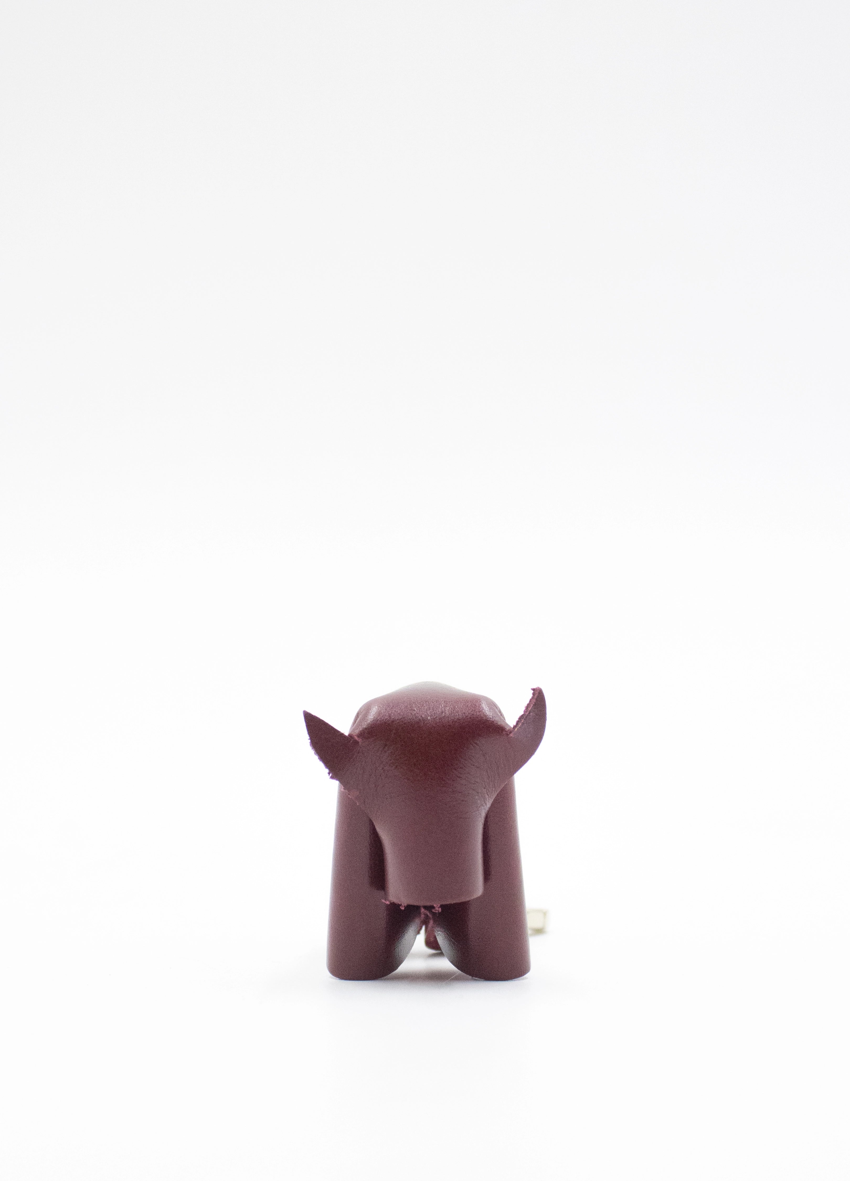 Con un diseño mini y simbólico. Está fabricado en piel Roja y tiene la forma abstracta de un toro con cuernos, lo que le da un toque juguetón y fuerte.