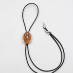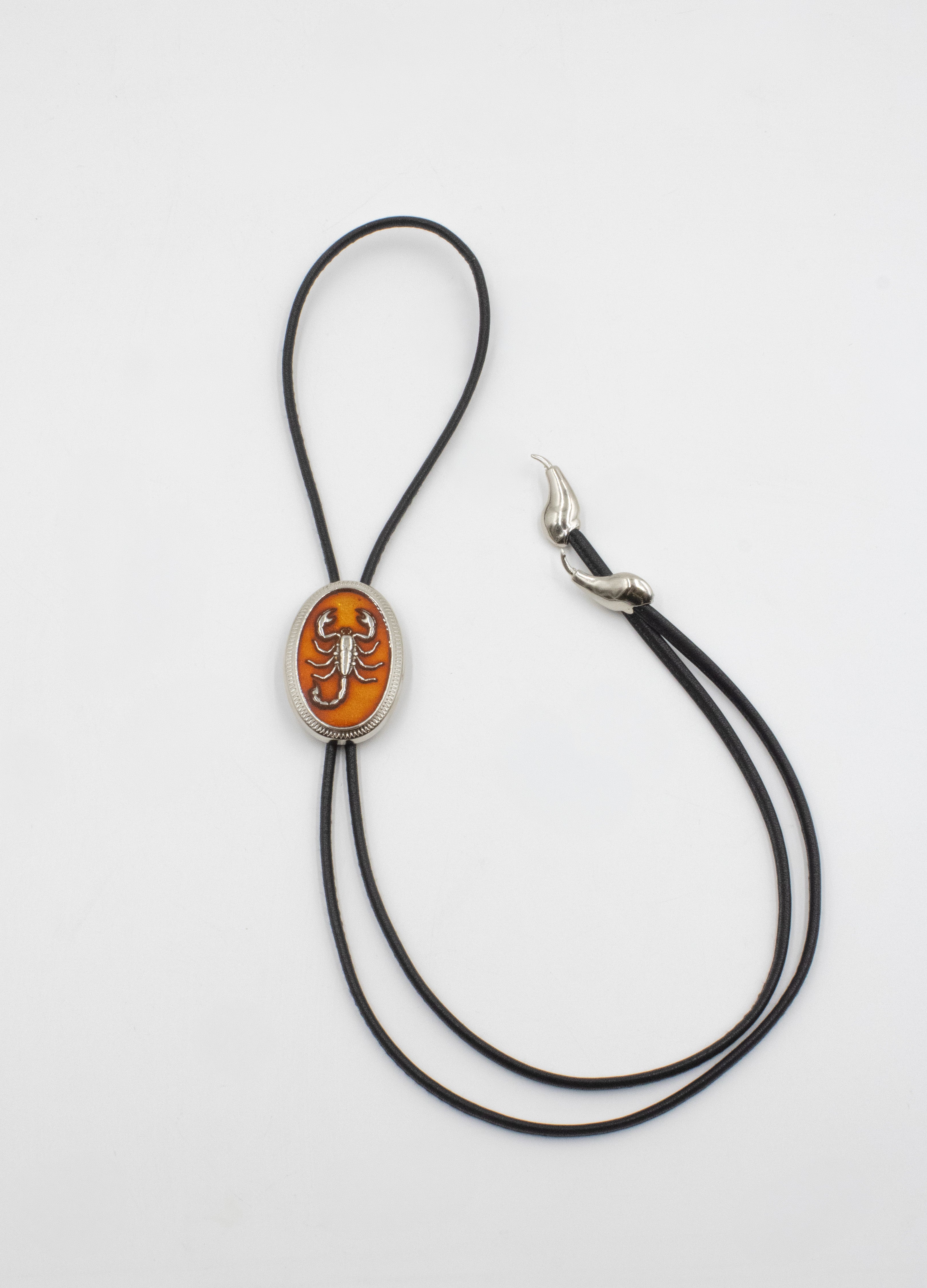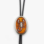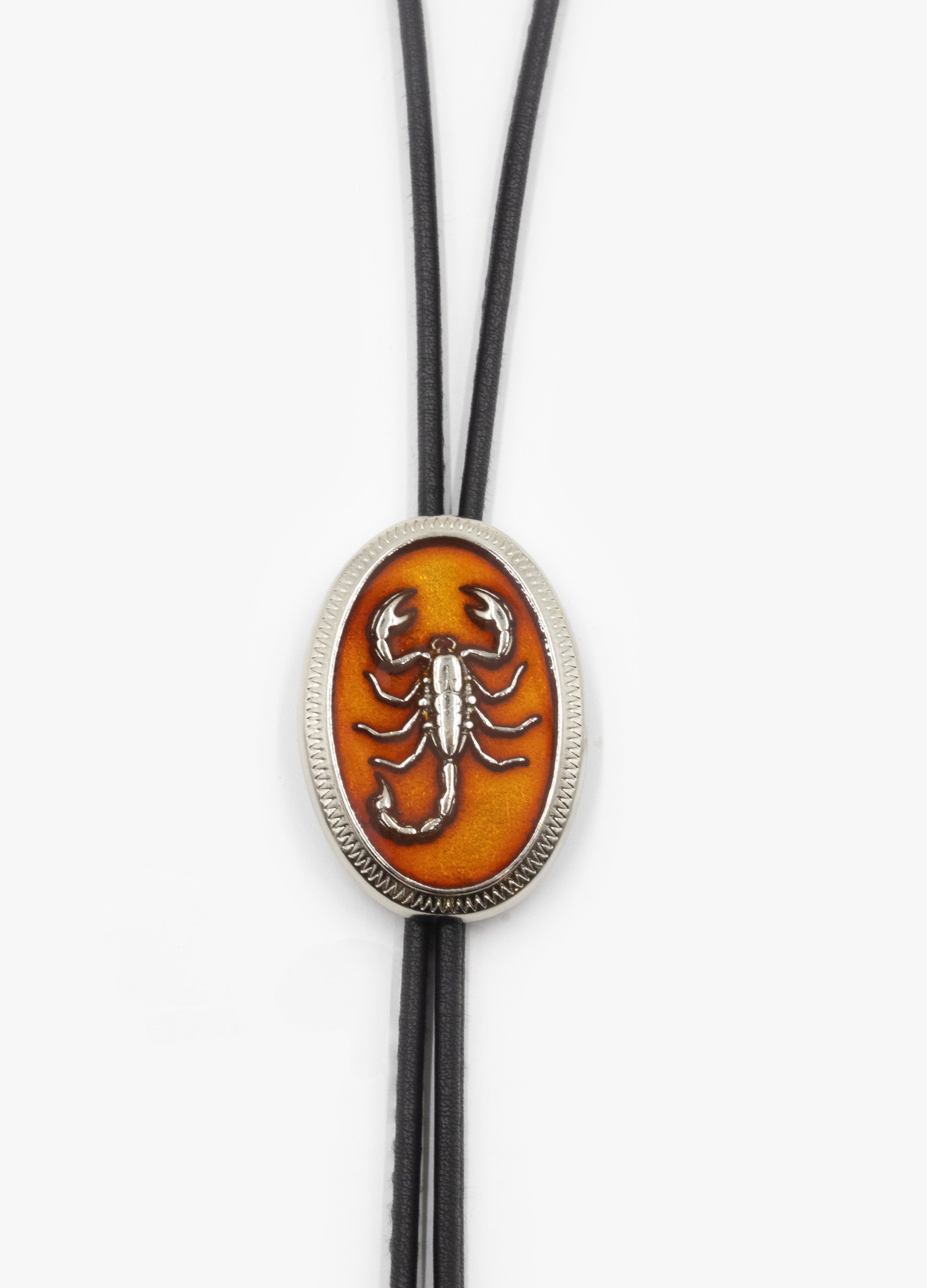 Su pieza central es un medallón ovalado con un escorpión en relieve, resaltado sobre una base en tonos ámbar que evoca el sol del desierto, y montado sobre un cordón de piel negra de alta calidad.