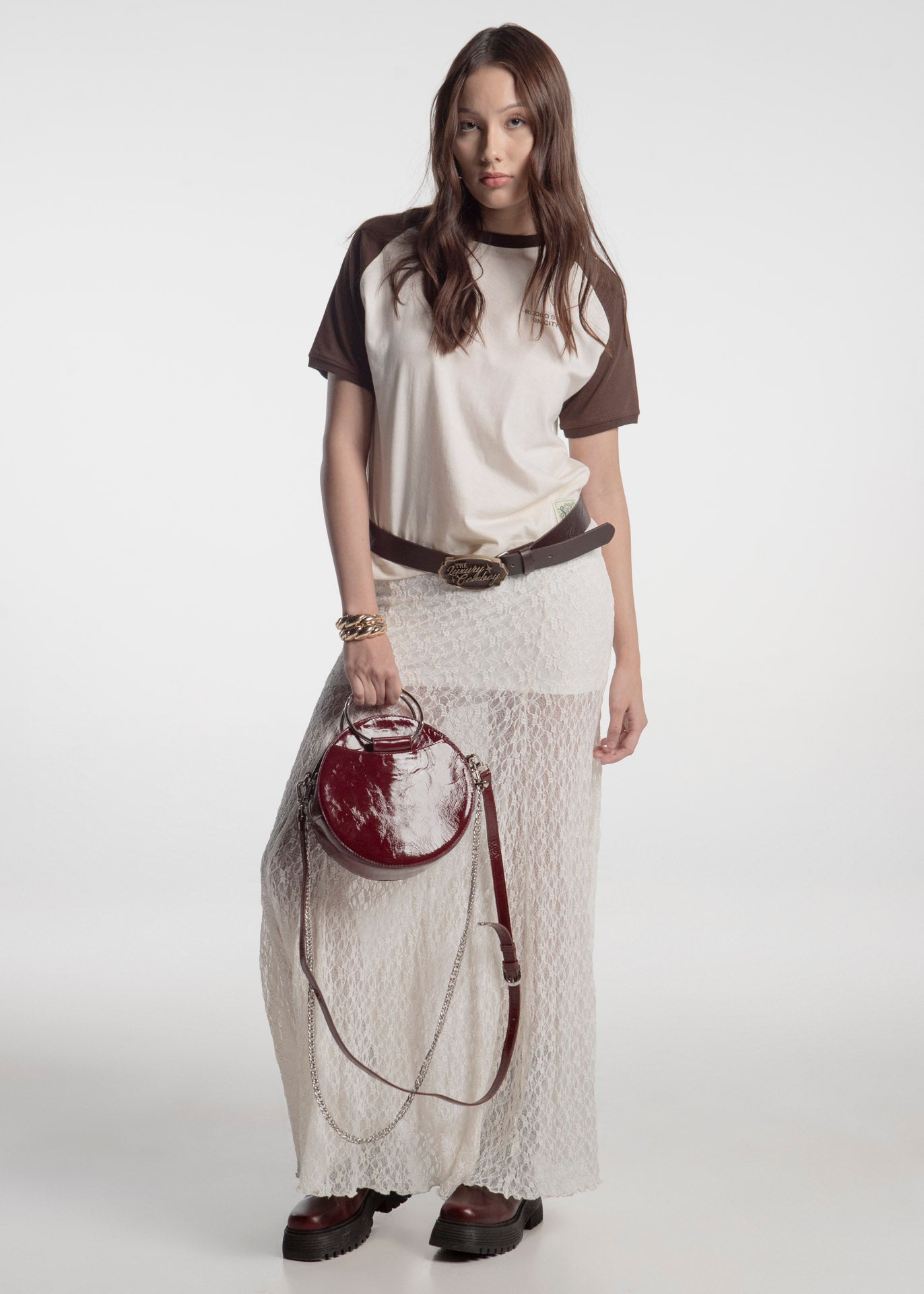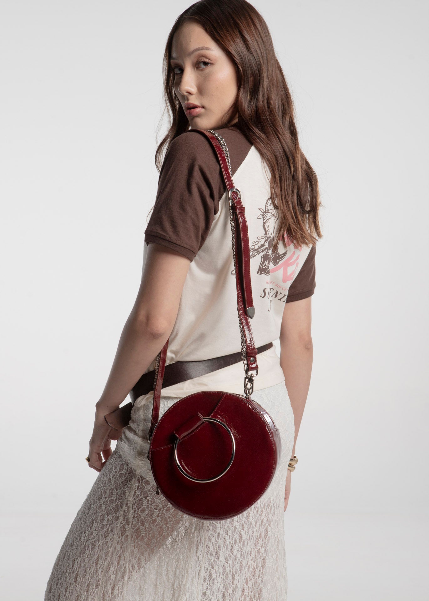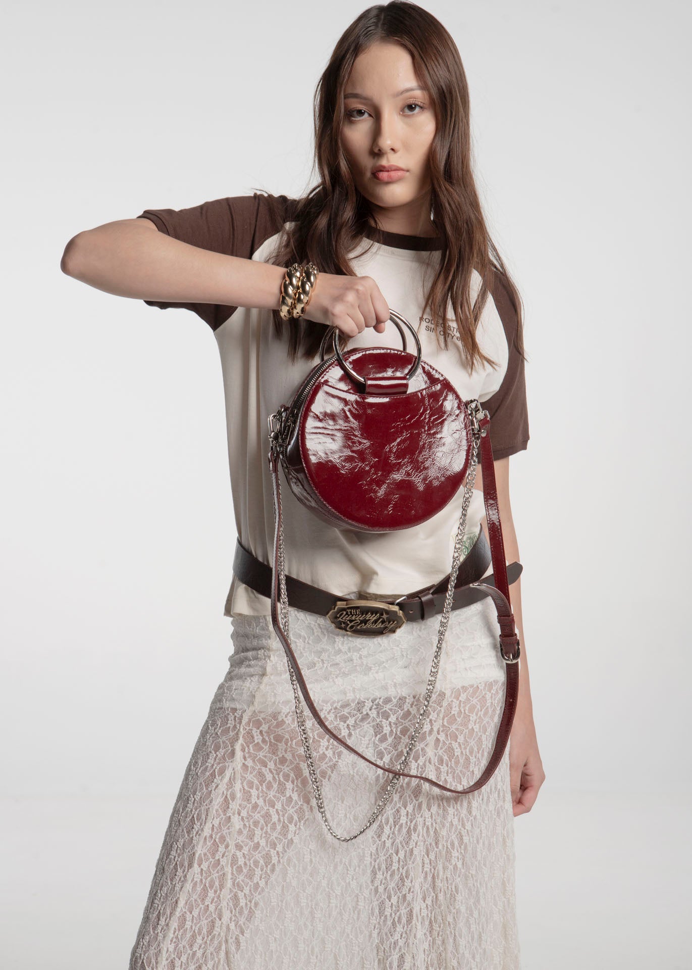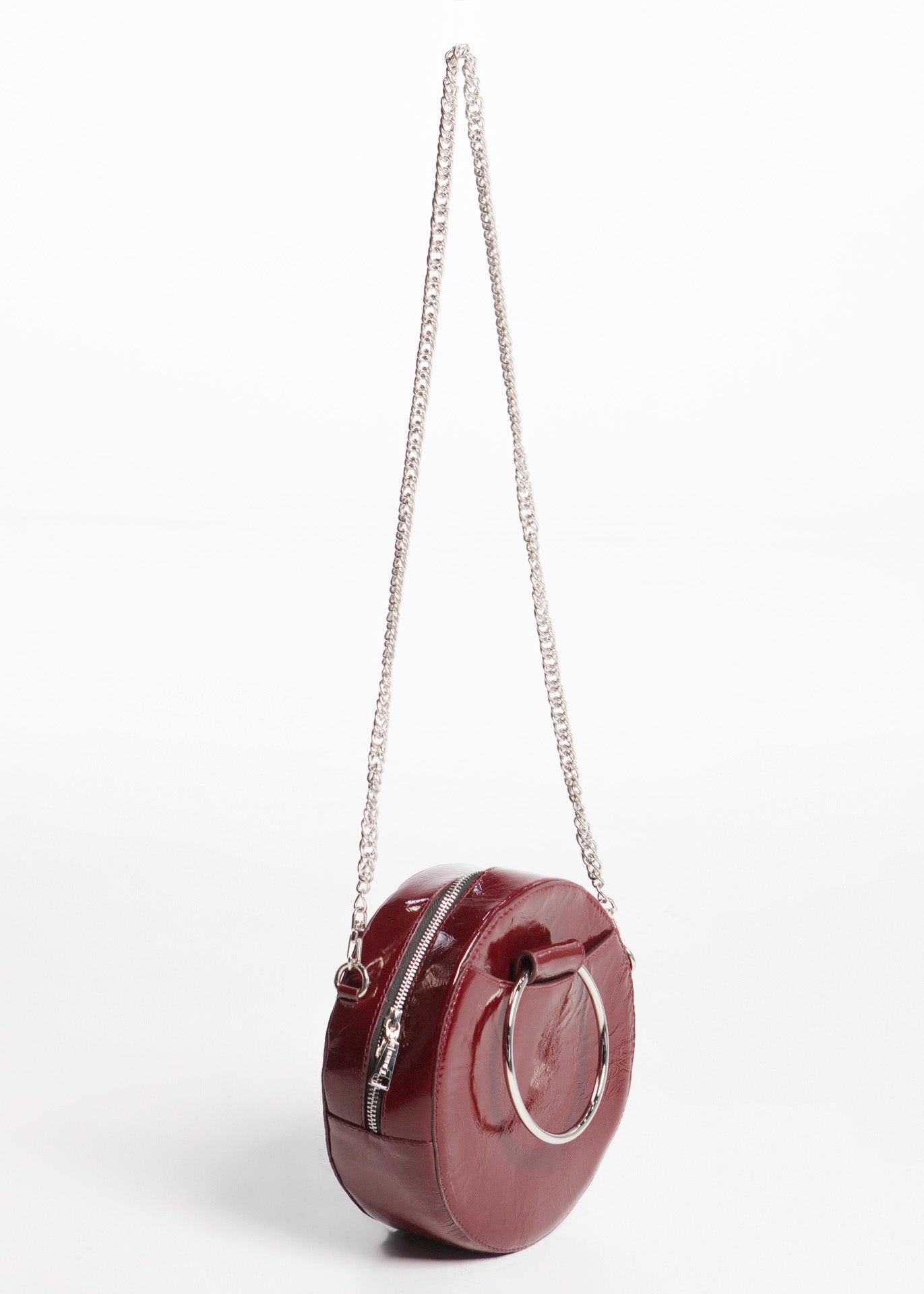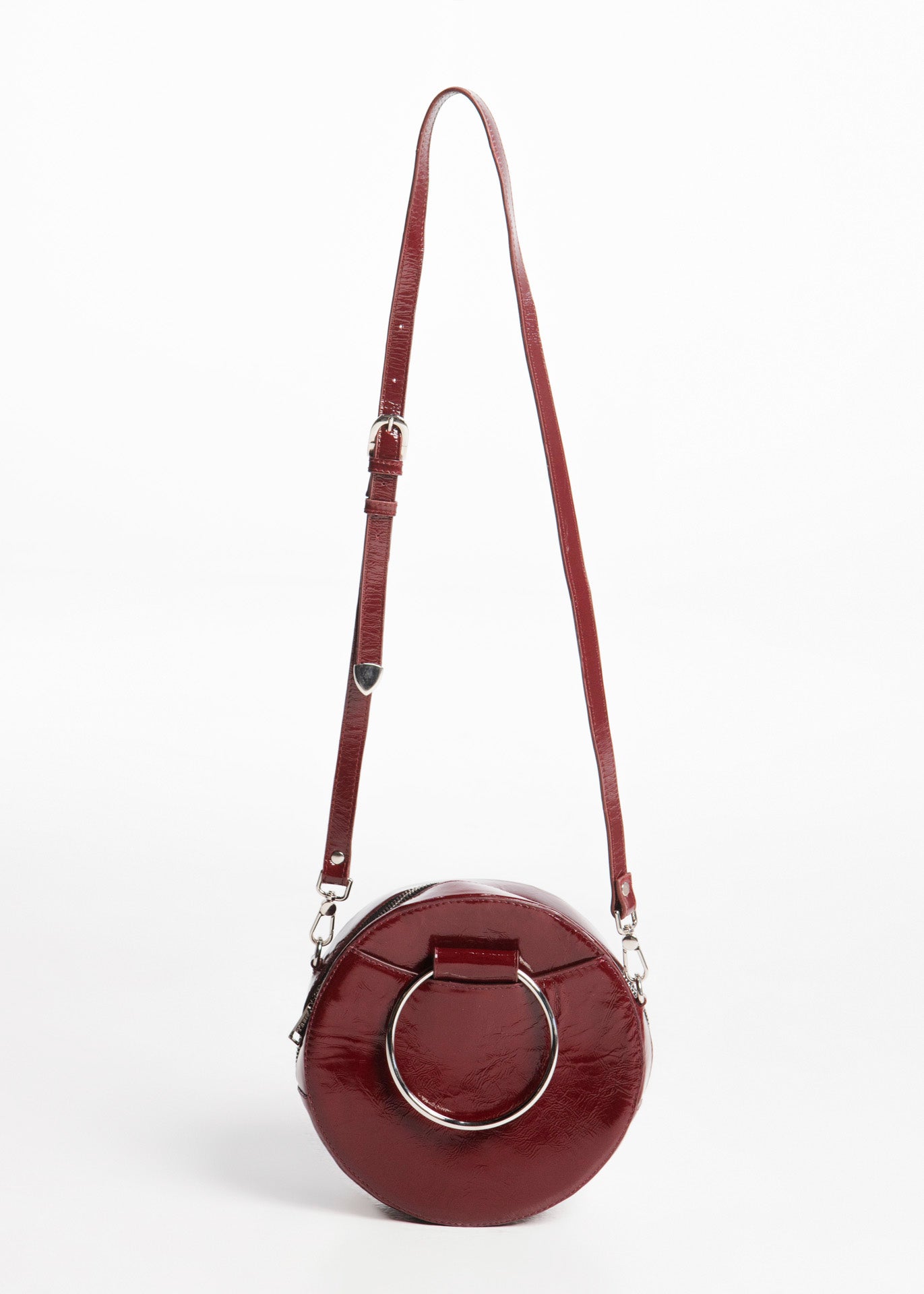 Bolso redondo color rojo fabricado en piel de acabado brillante con argollas laterales.