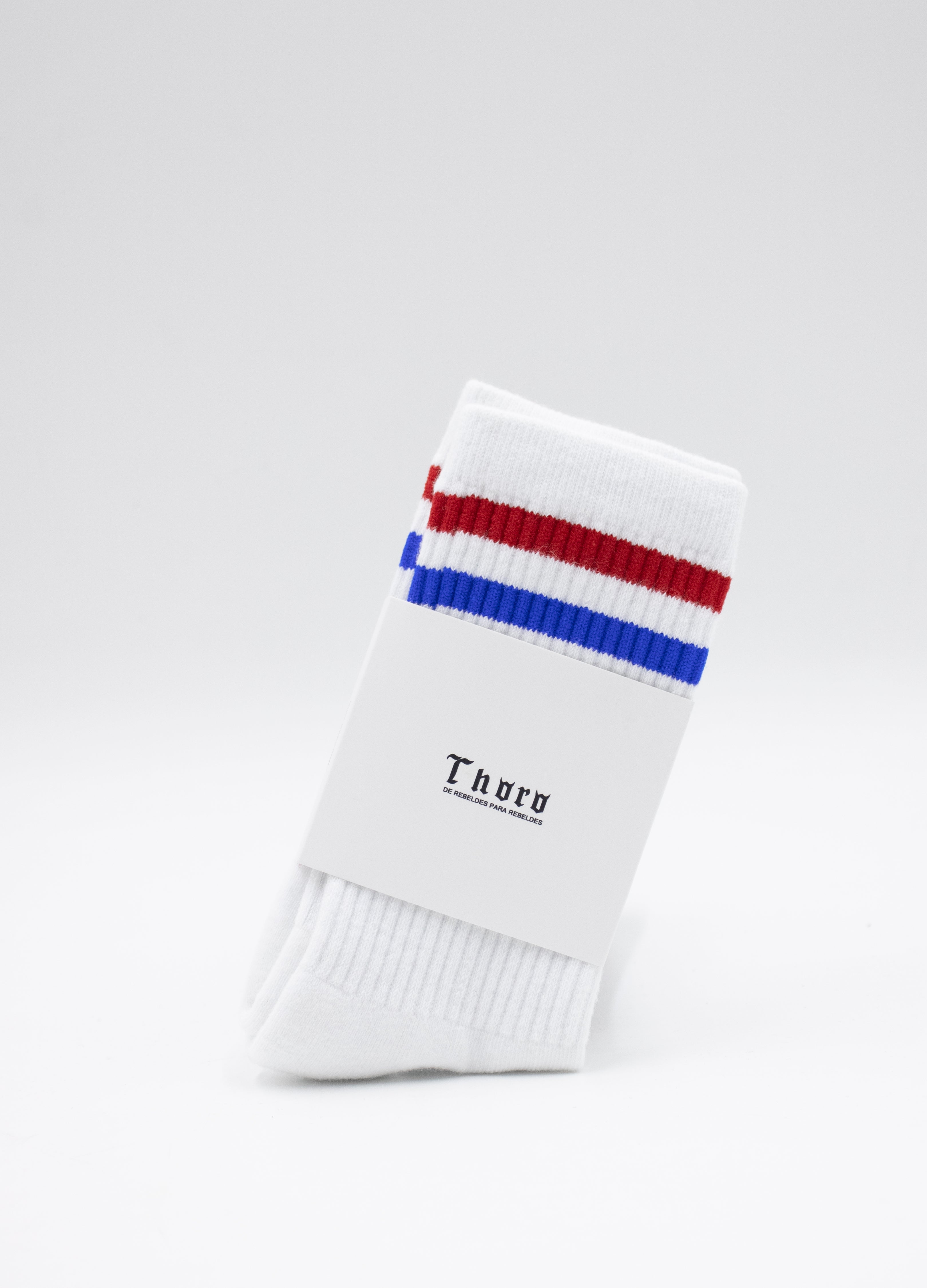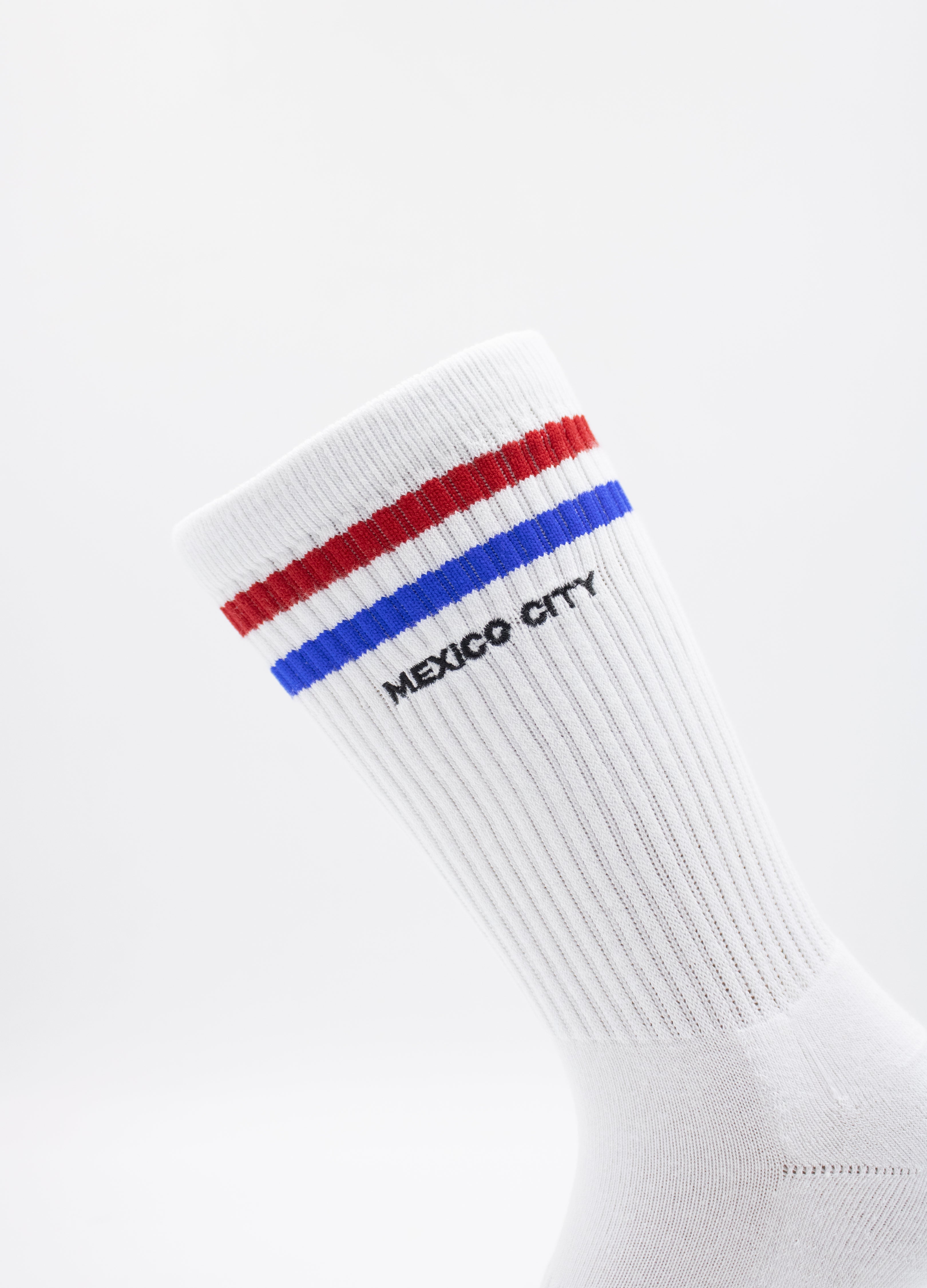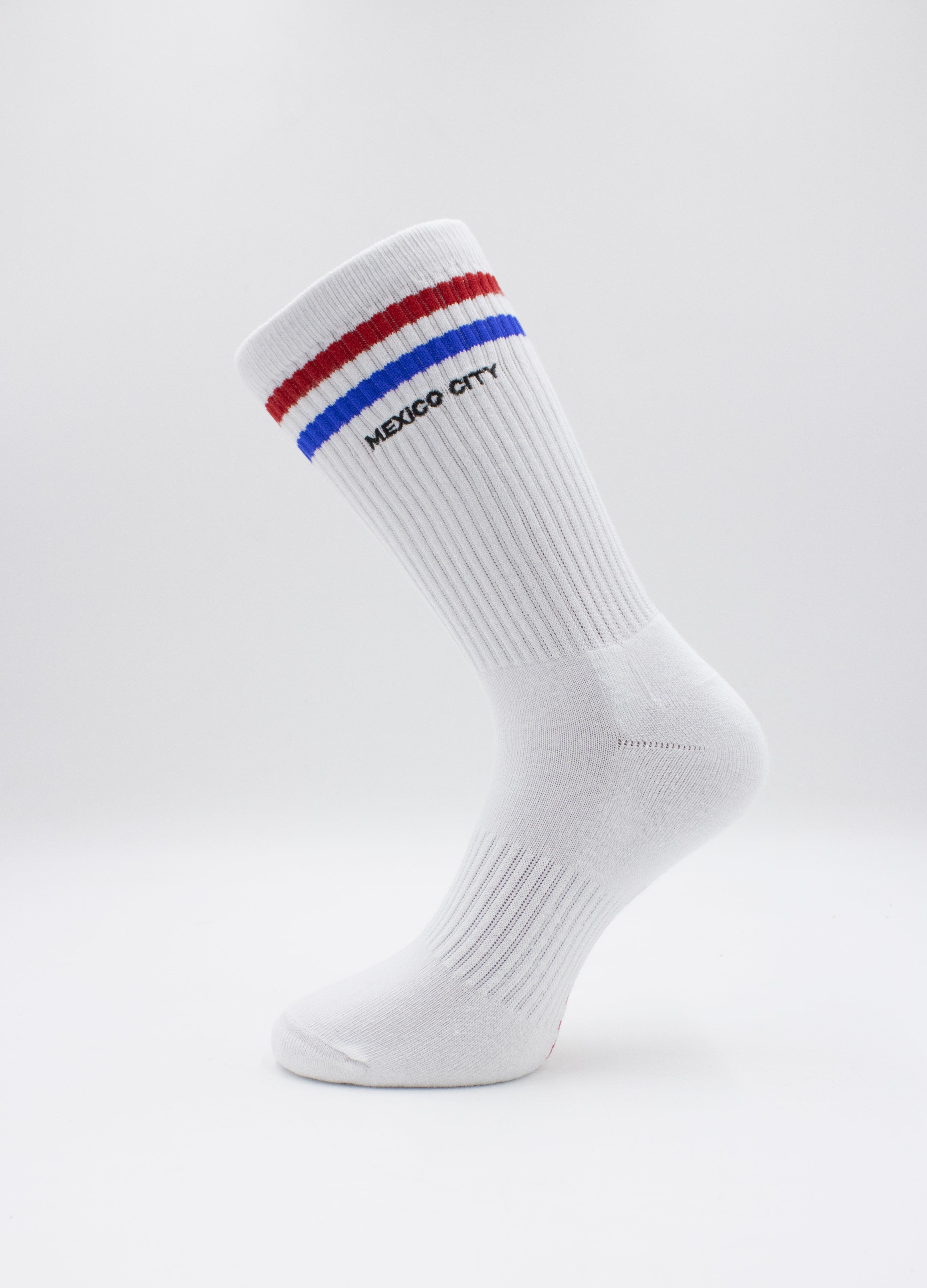 Calceta fabricada en algodón premium, en color blanco con líneas rojas y azules, y bordado de "Mexico City".