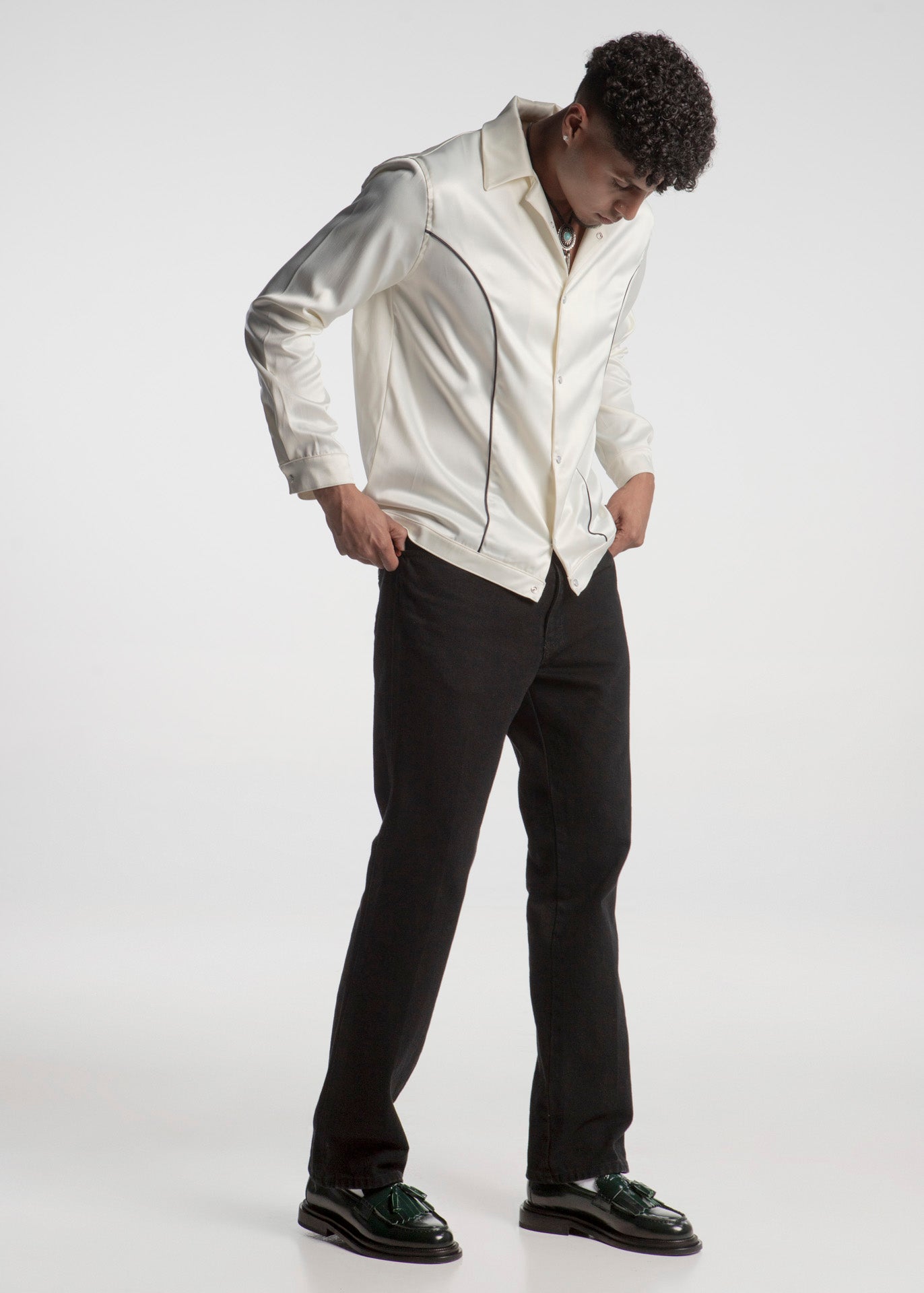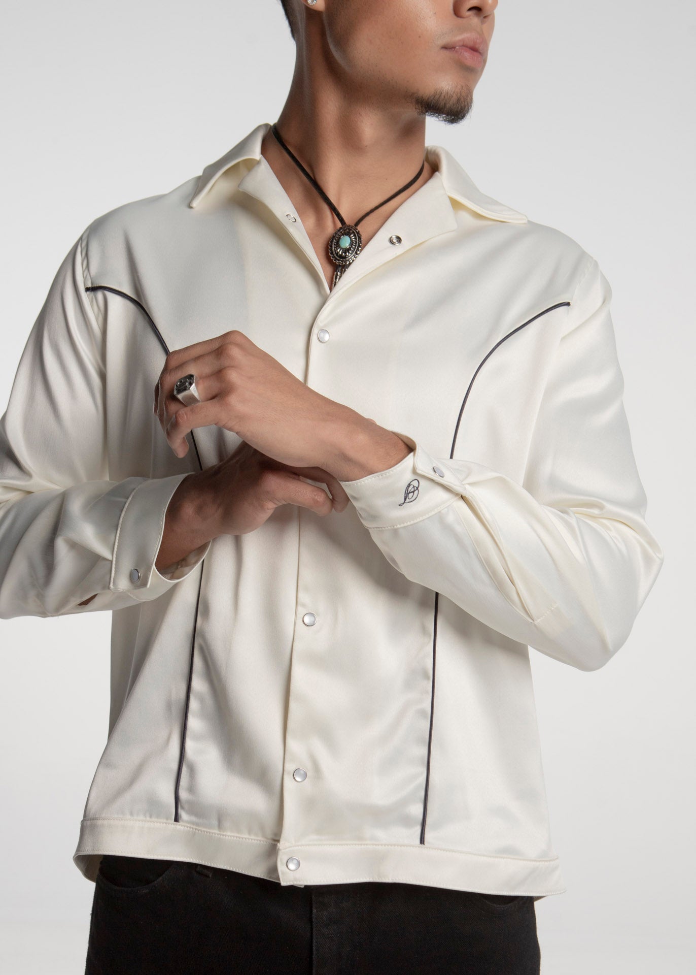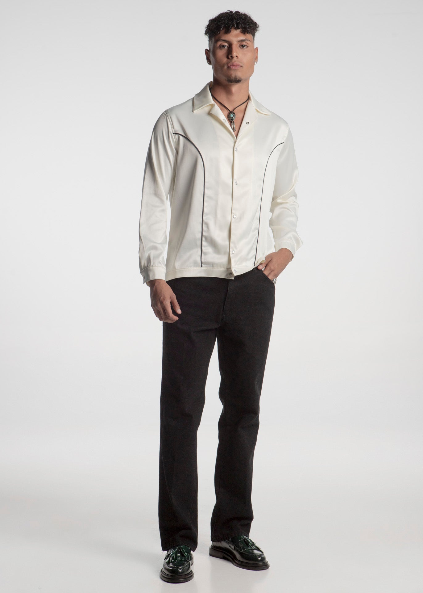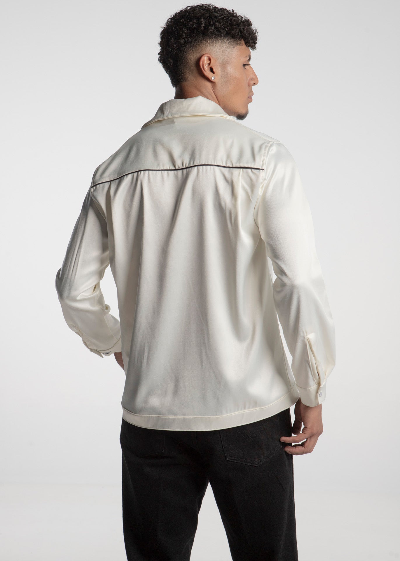 Camiseta fabricada en tela tipo seda color hueso con ribetes vaqueros en color negro, botones a presión estilo perla.