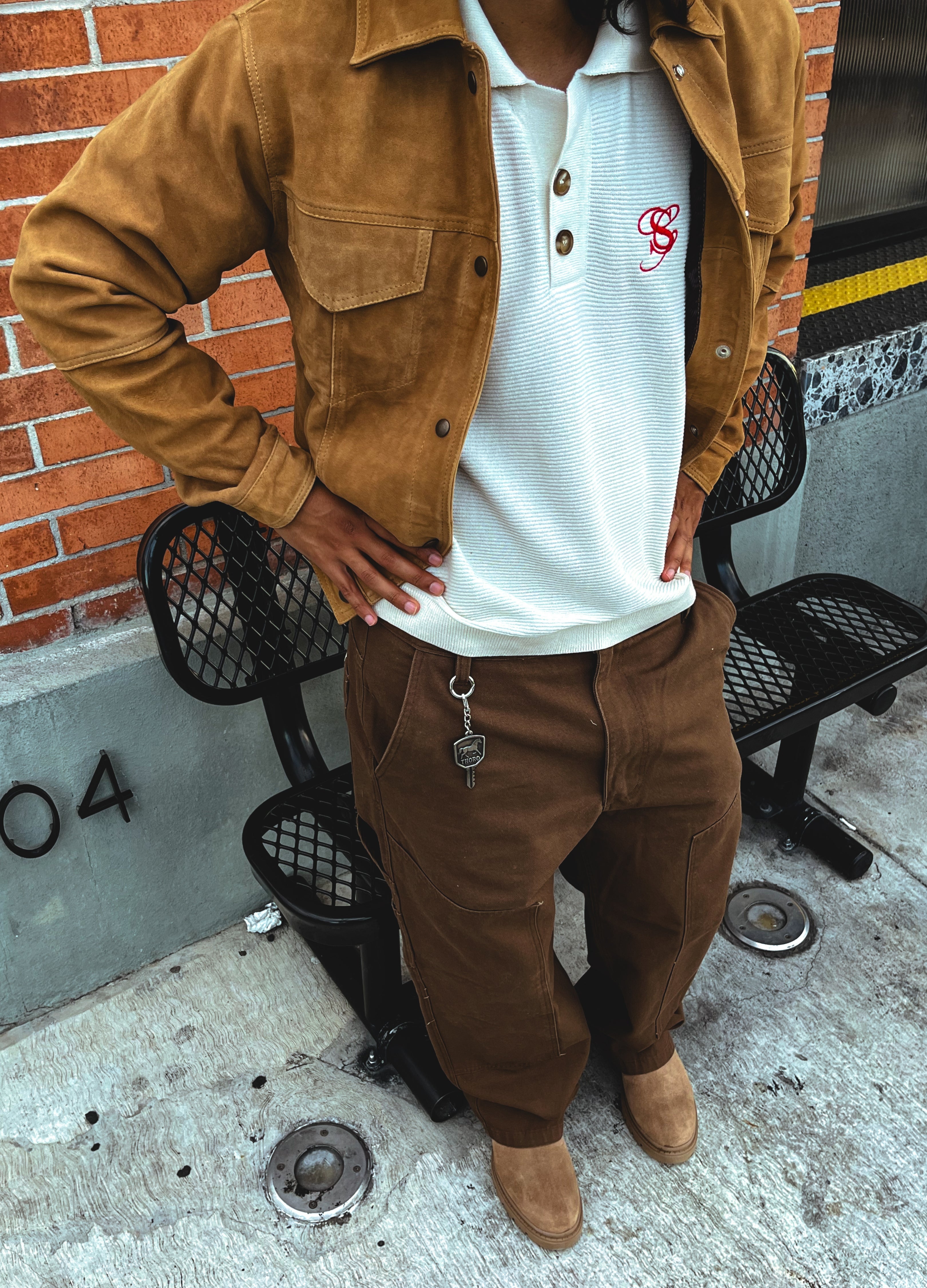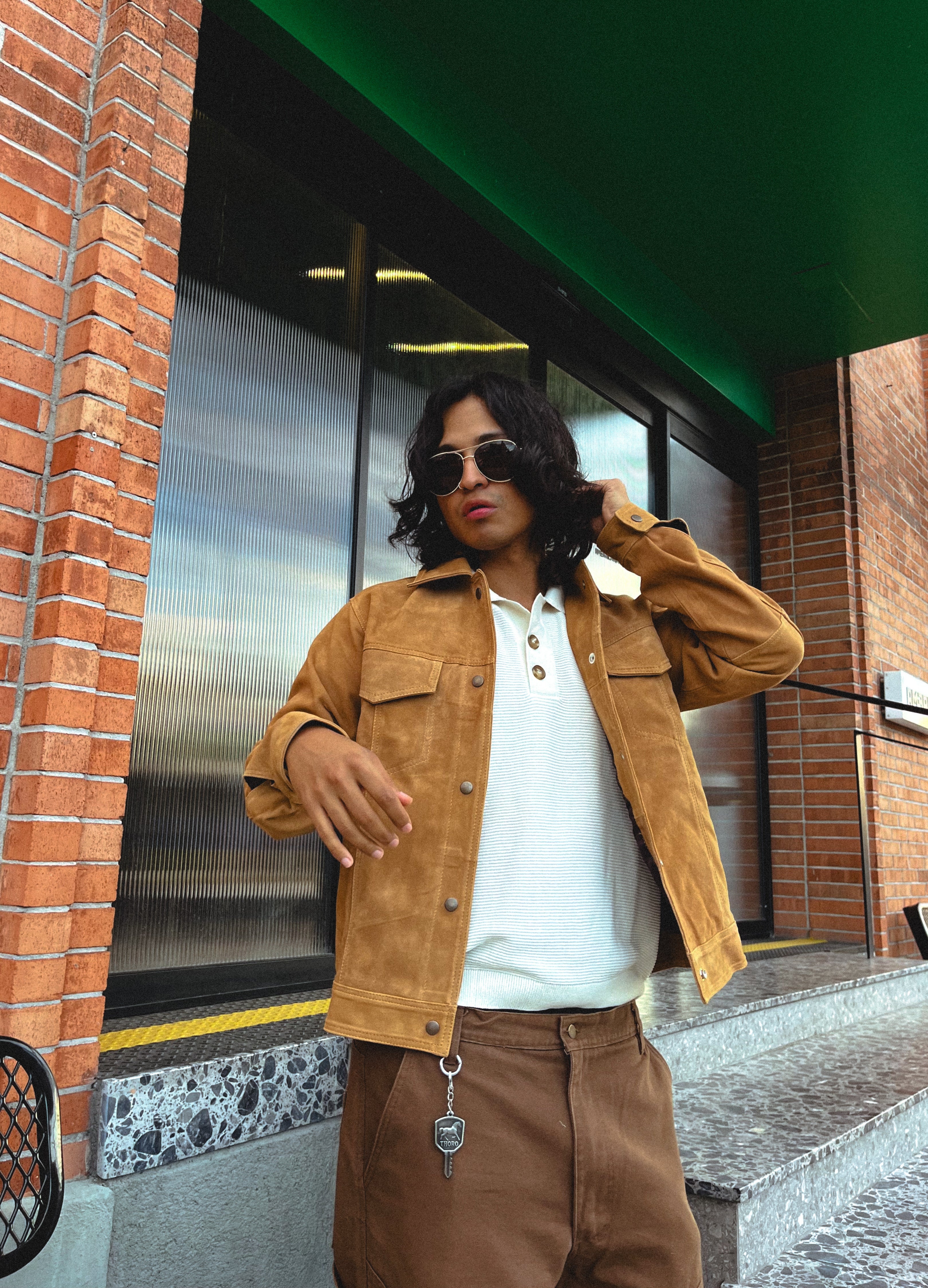 La Camisola Sierra es una prenda atemporal que ofrece un look western y robusto. Está confeccionada en piel gamuzade un profundo color café caramelo que le da una textura rica y una gran versatilidad. Su diseño tipo trucker es de corte clásico, con dos bolsillos de solapa en el pecho y paneles cosidos en los codos.