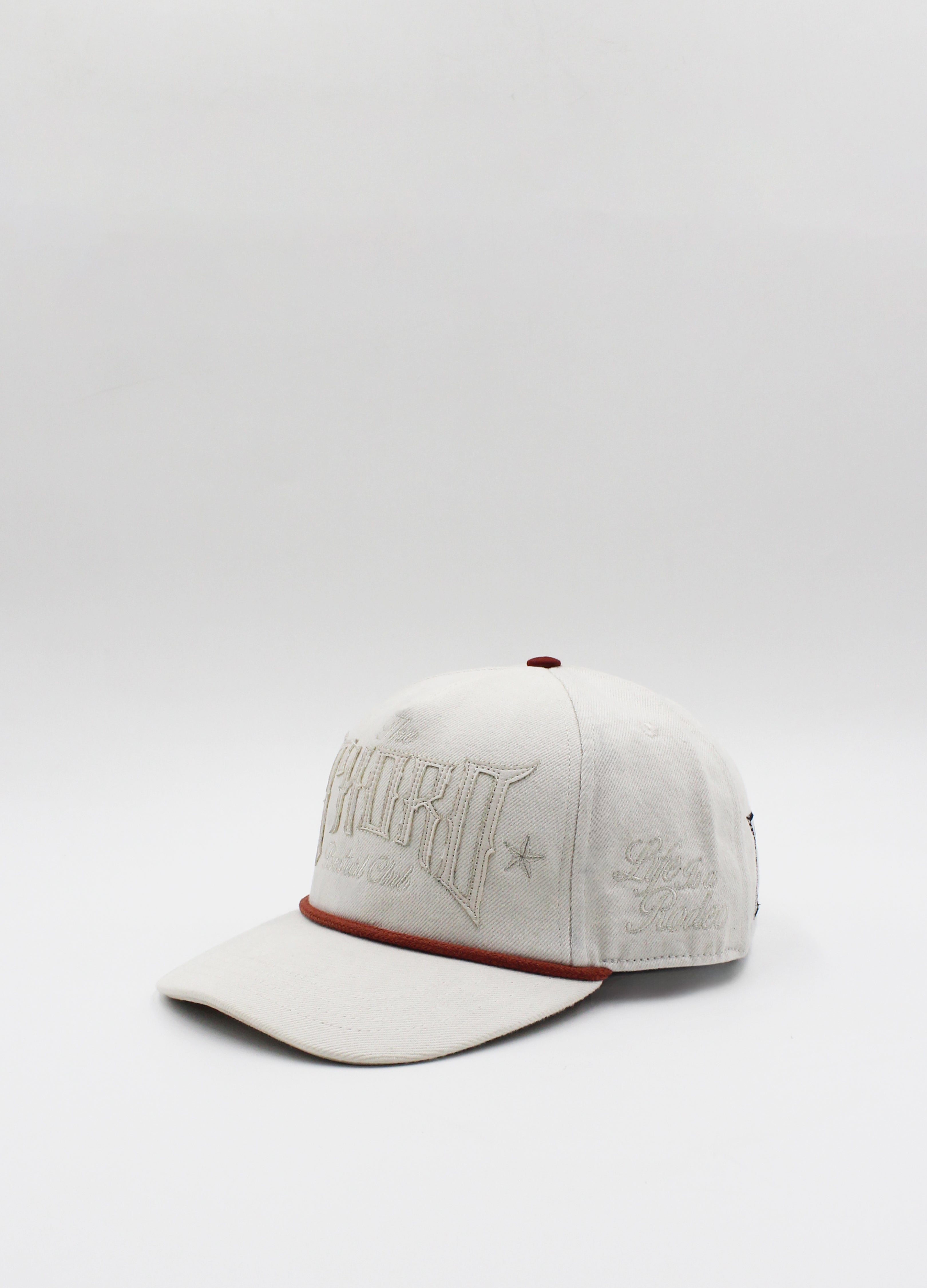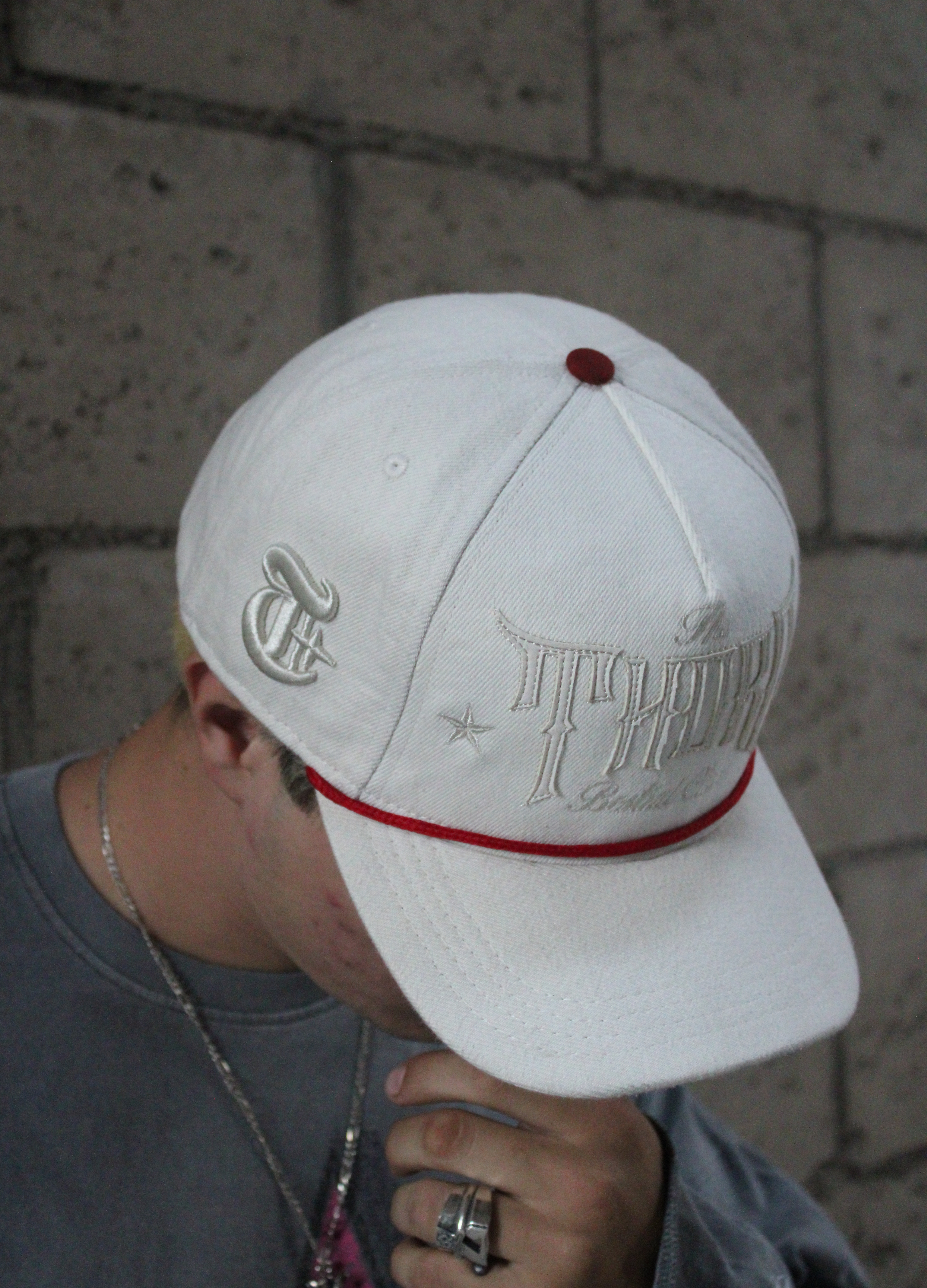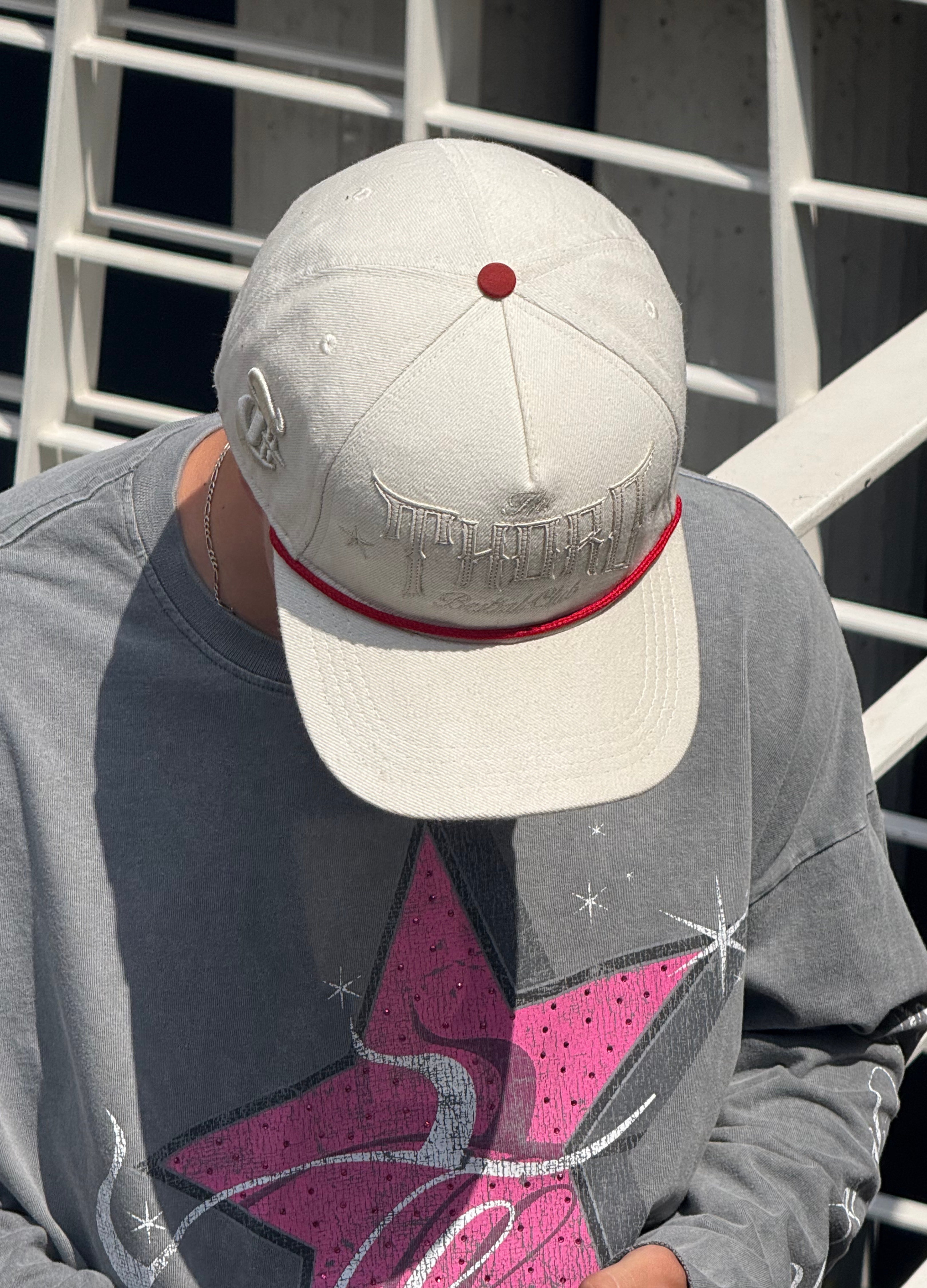 La Gorra Bestial Club es un accesorio esencial con un diseño que resalta la identidad de la marca. Confeccionada en un tejido color beige claro, destaca por el bordado del logo THORO en una tipografía elaborada y el nombre "Bestial Club" debajo. La gorra incluye un cordón marrón rojo que recorre la visera y un botón en contraste en la parte superior.
