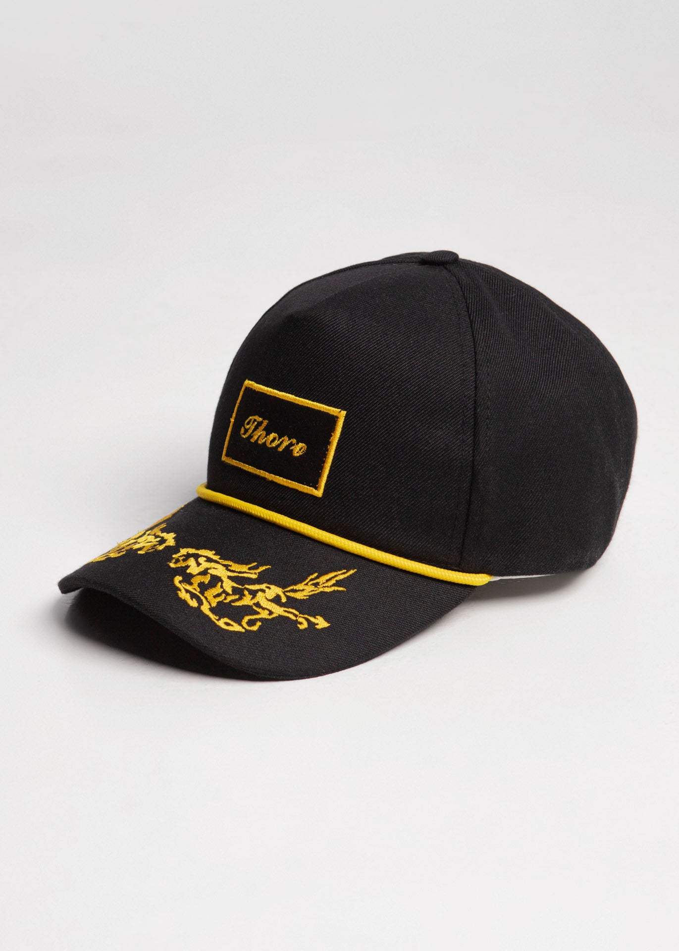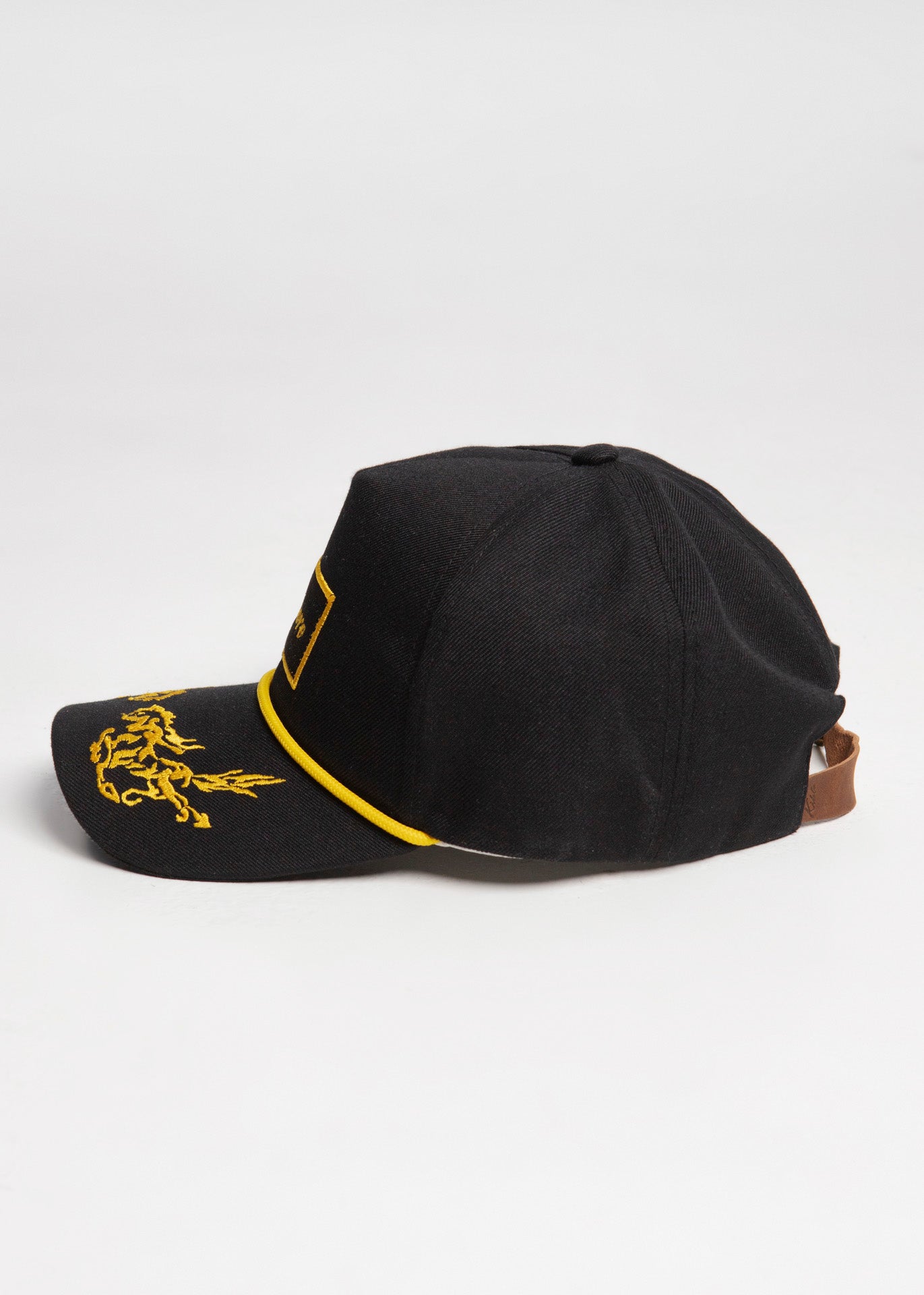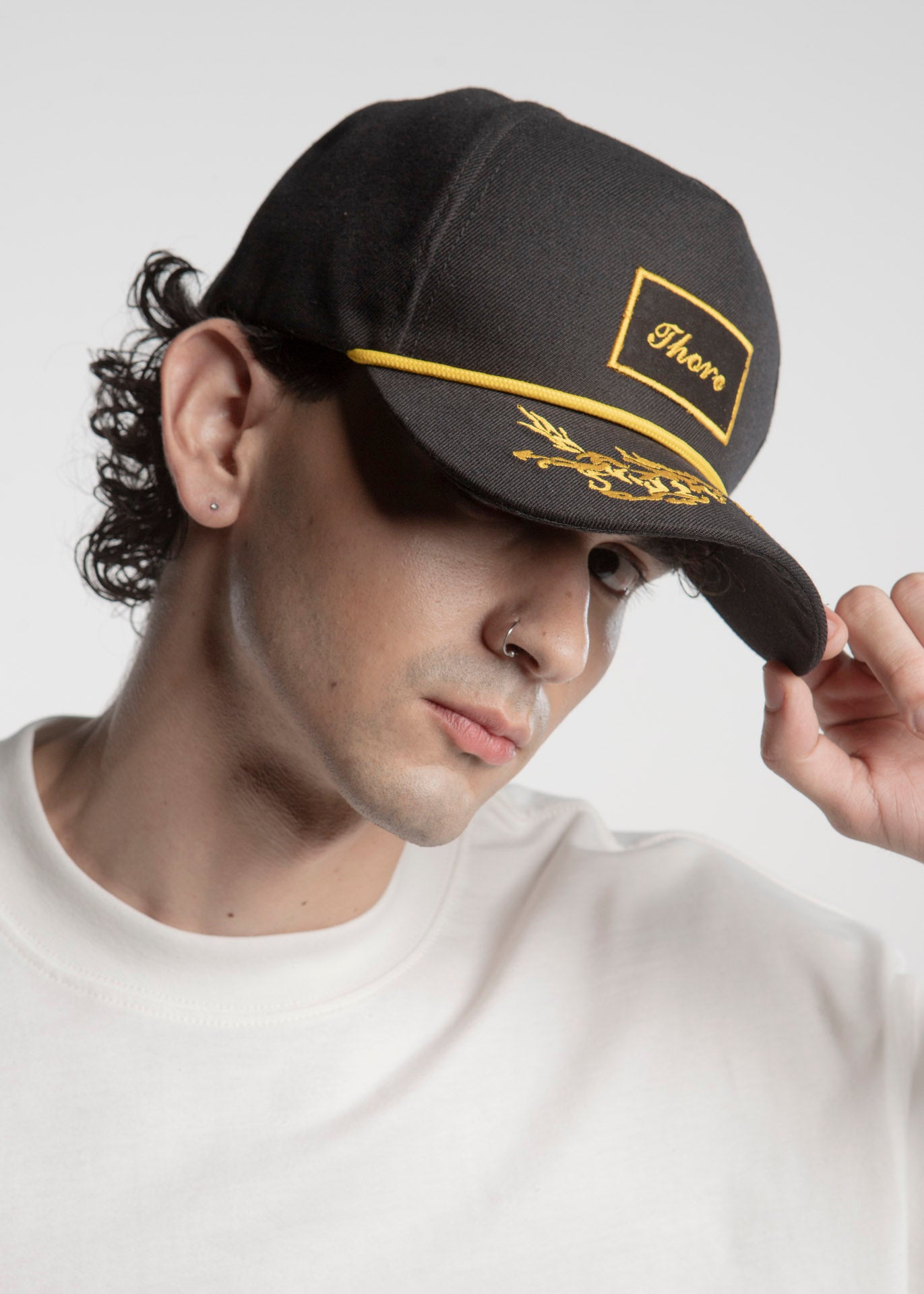 Gorra ajustable fabricada en loneta color negro con bordados en color dorado en parte frontal y visera.