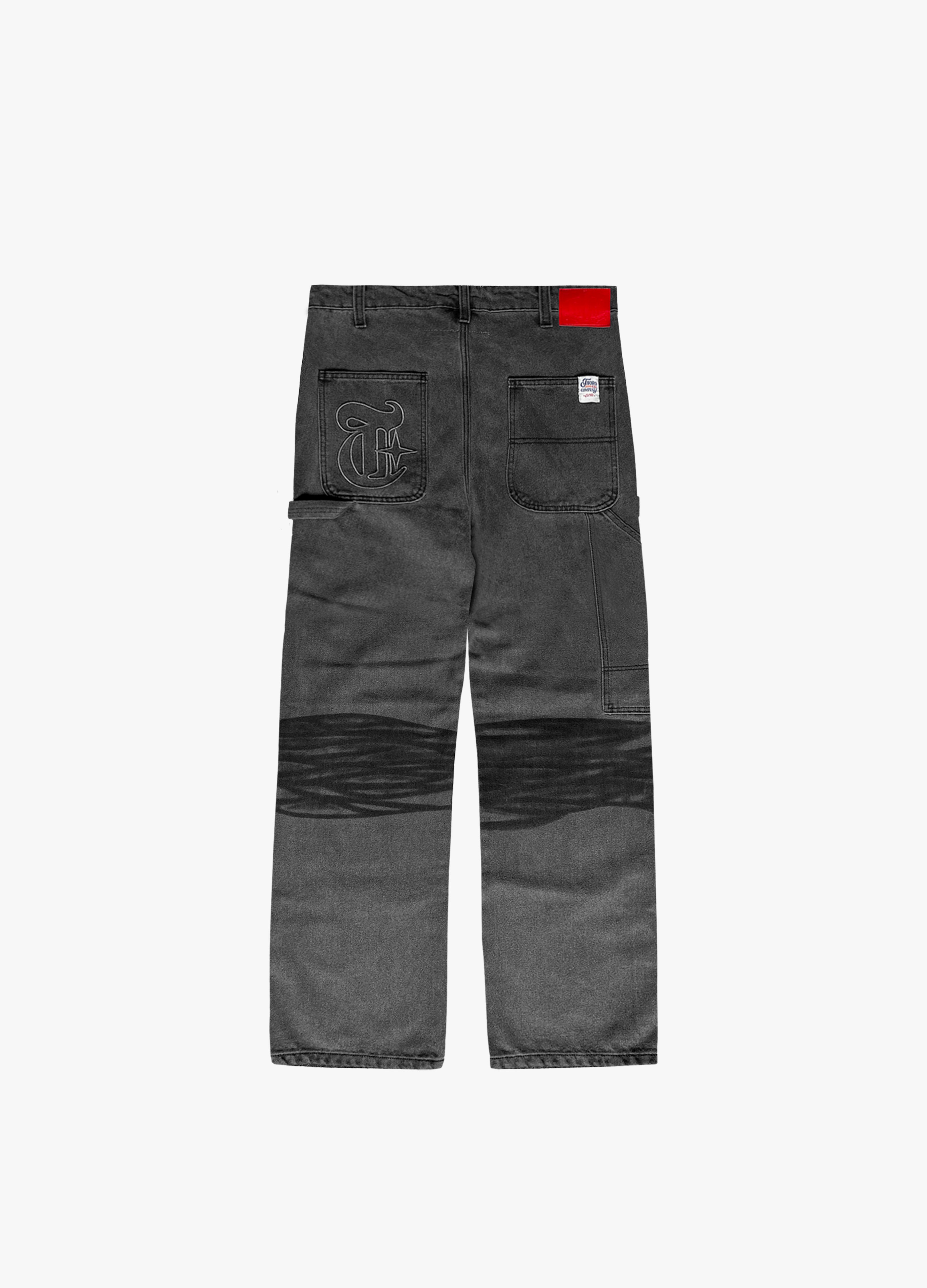 El Pantalón Carpintero Thoro combina la estética worker con el branding de la marca. Está confeccionado en denim negro con un acabado lavado a la piedra que le da un look desgastado y de gran carácter. Su diseño carpintero presenta paneles frontales, bajos y costuras sin rematar, además del gran logo THORO estampado en el centro.