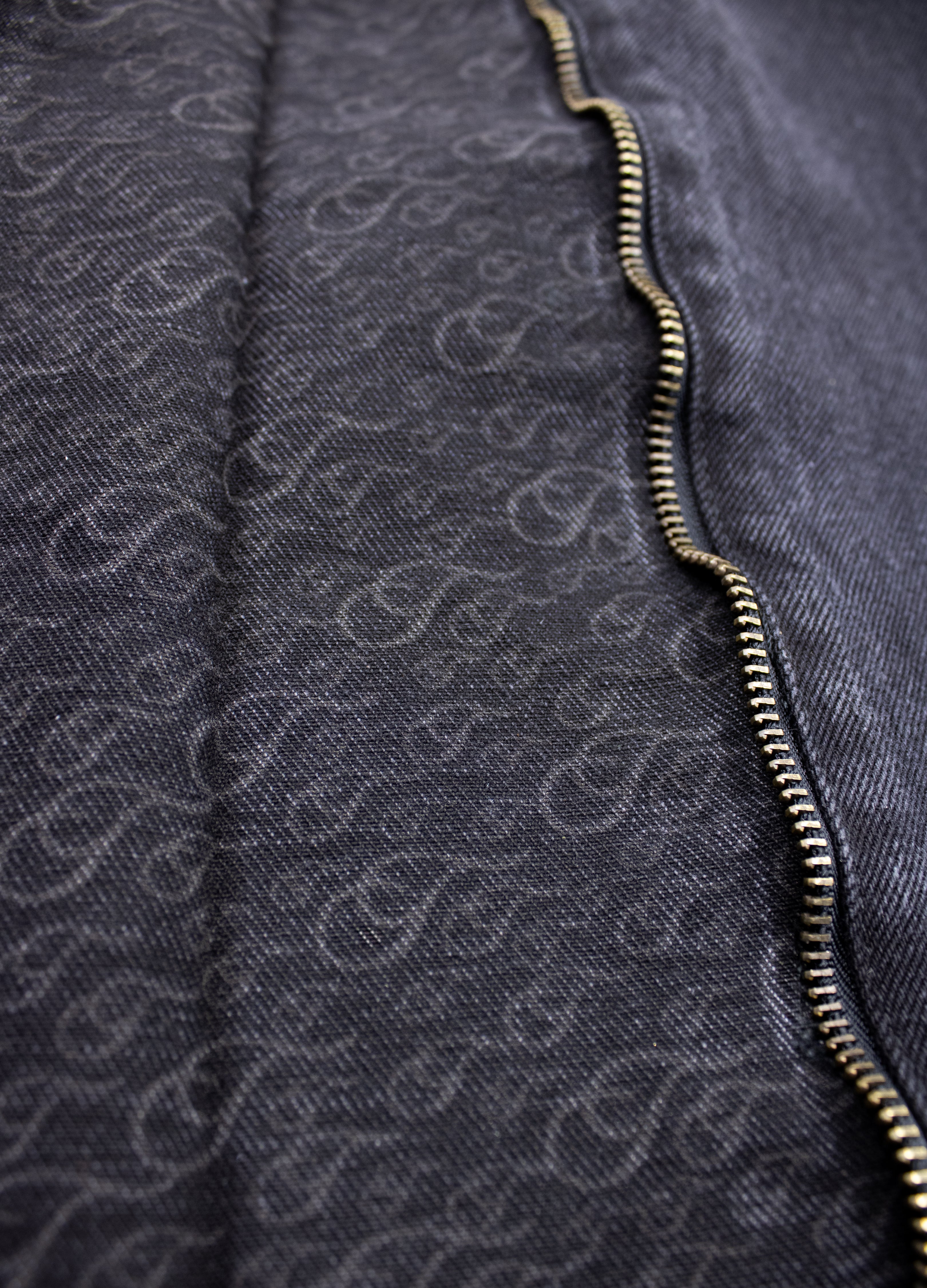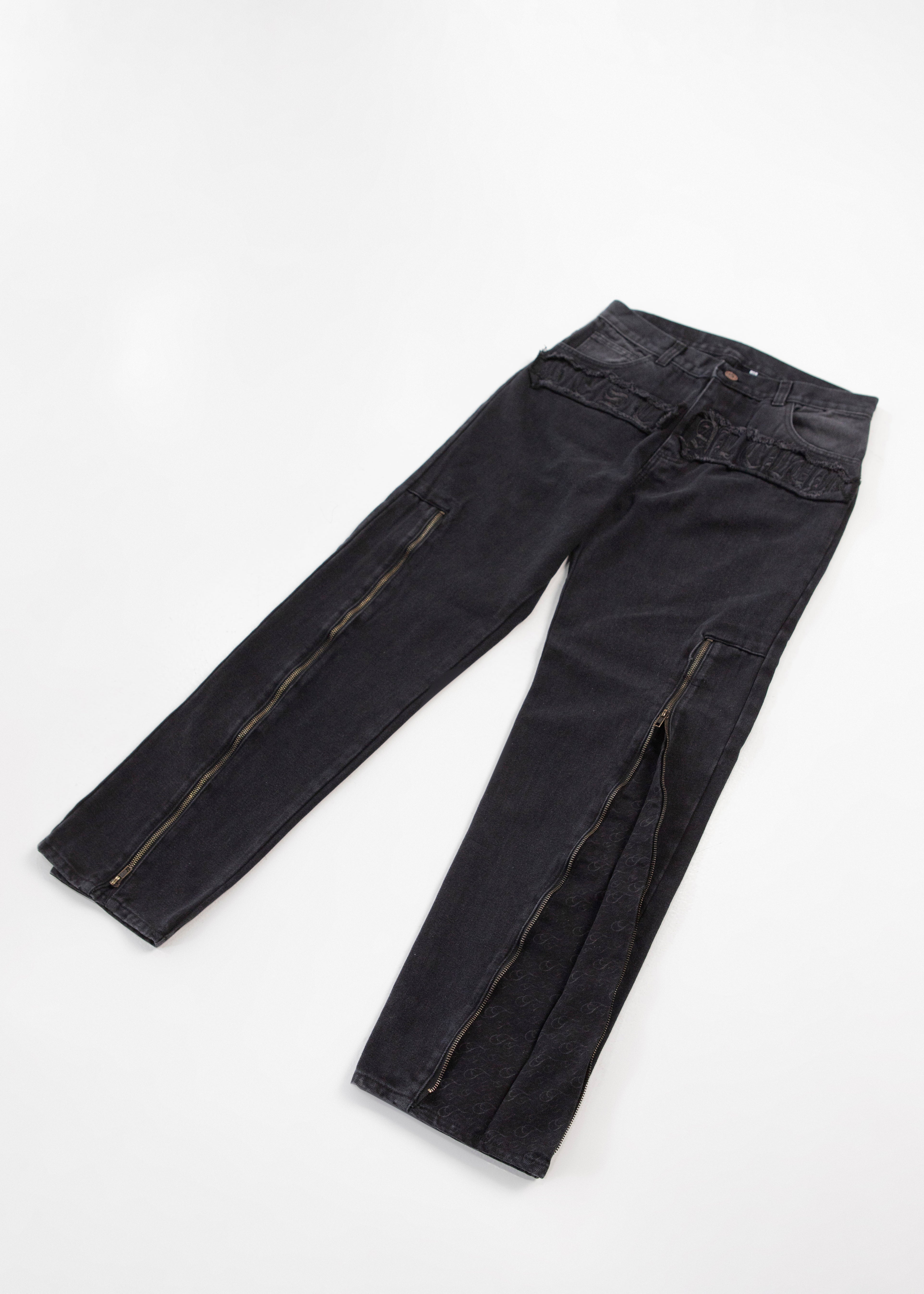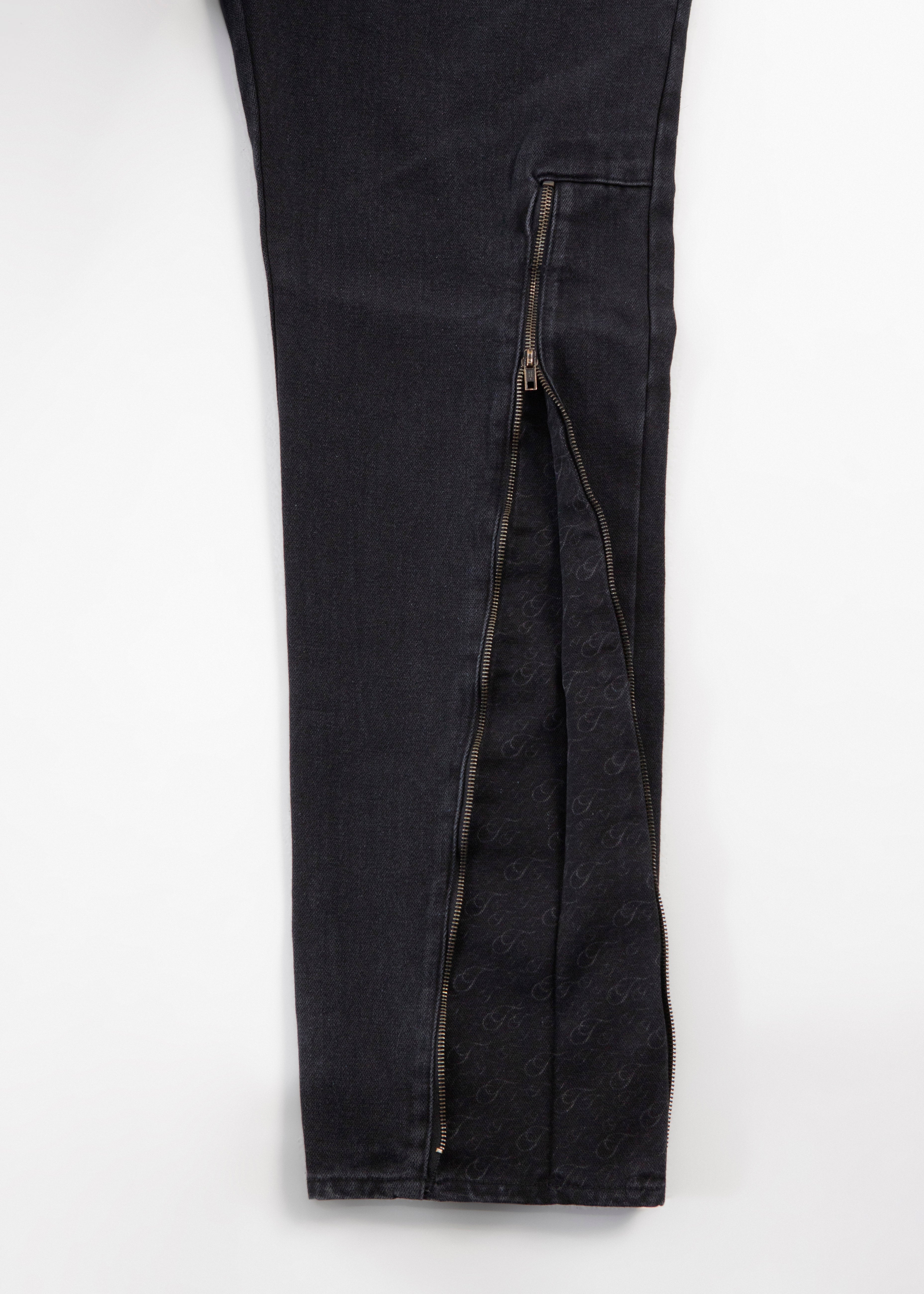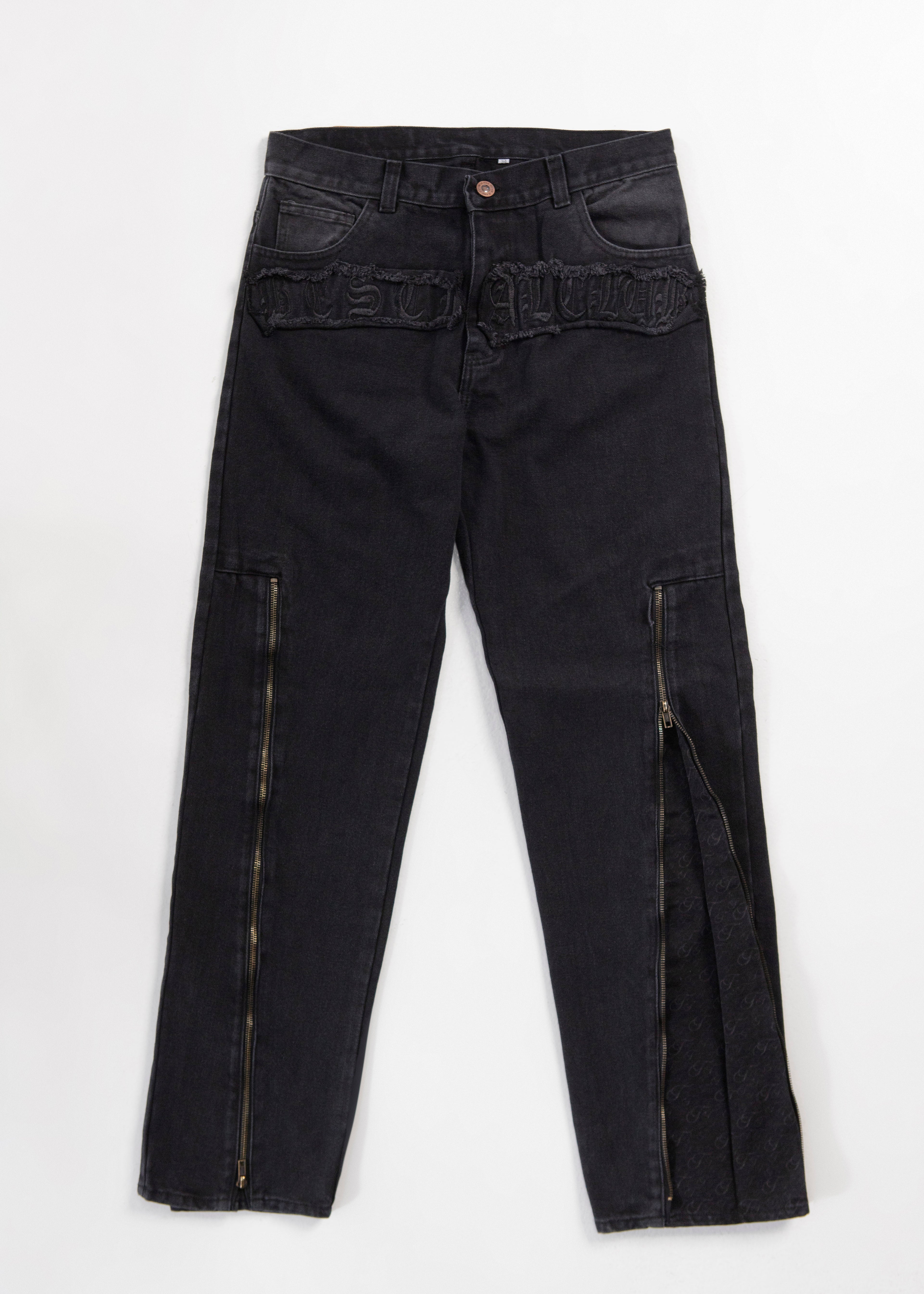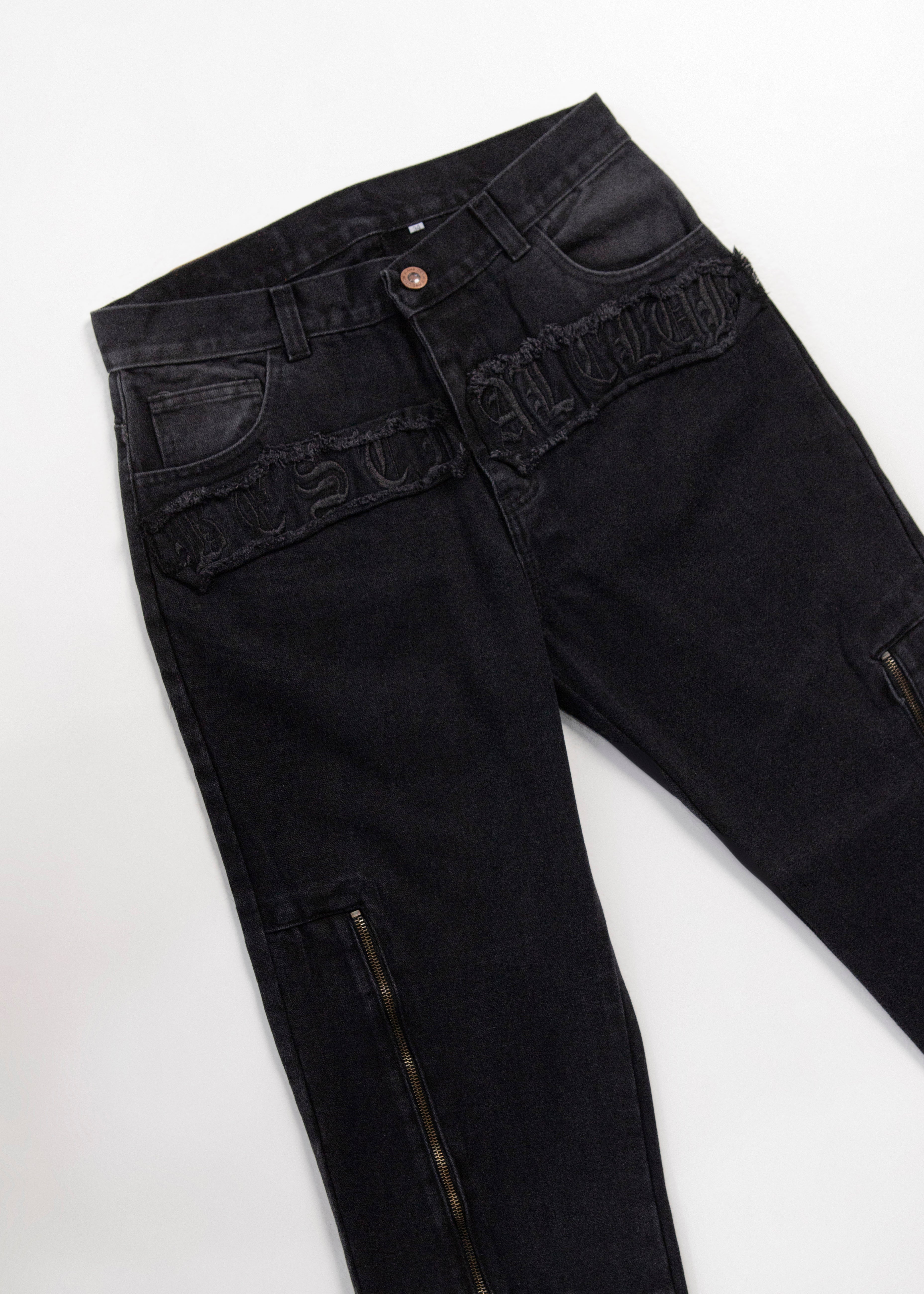 Pantalón fabricado 100% en mezclilla color negro con cierres en la parte inferior para hacerlo un pantalón más recto cuando están cerrados o uno más acampanado cuando está abierto, en la parte que sale al abrirlo, tiene un patrón de letras T, grabado a laser y con el frente el diseño bordado sobre un corte desgastado, la leyenda "Bestial Club" en letras góticas.