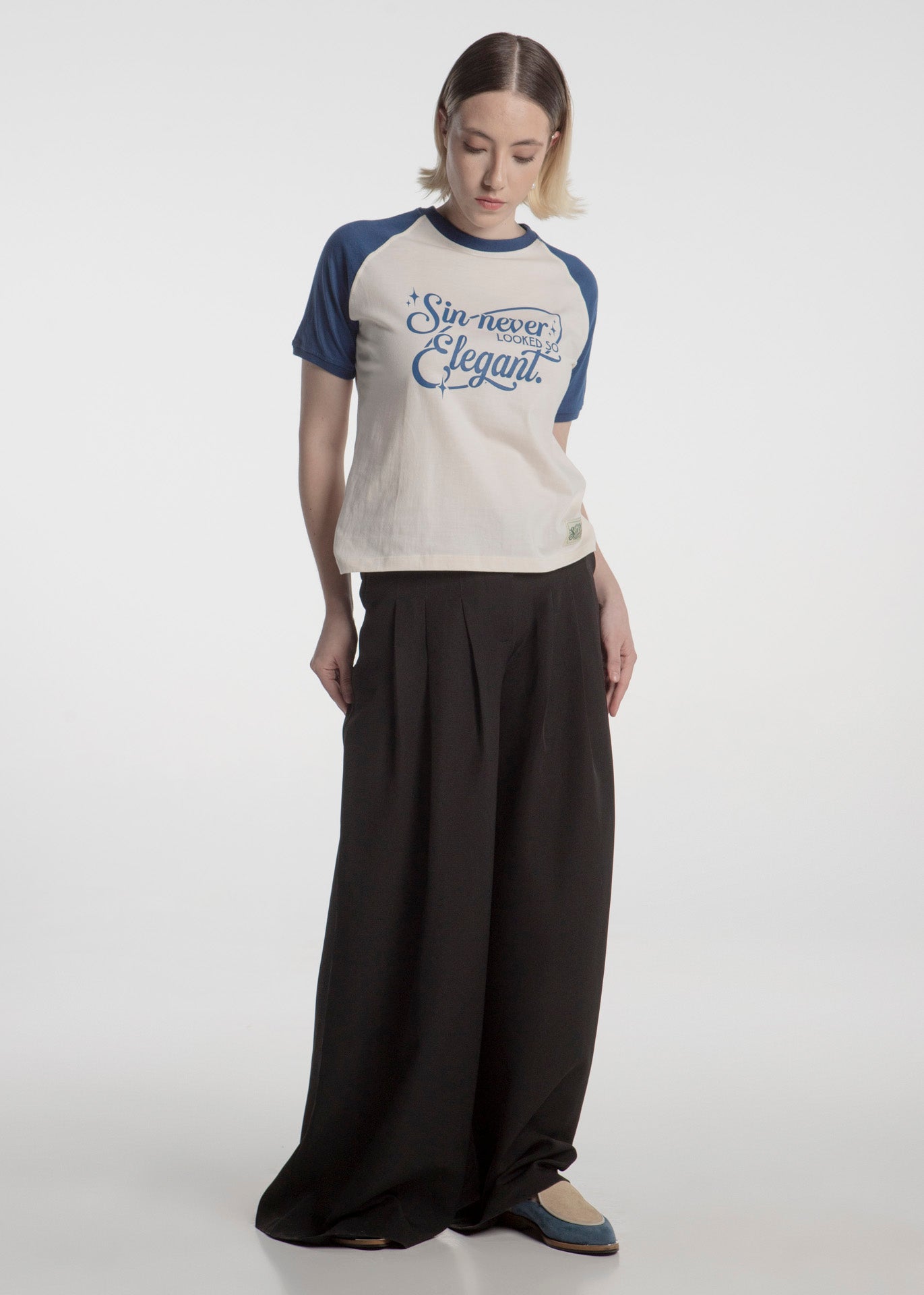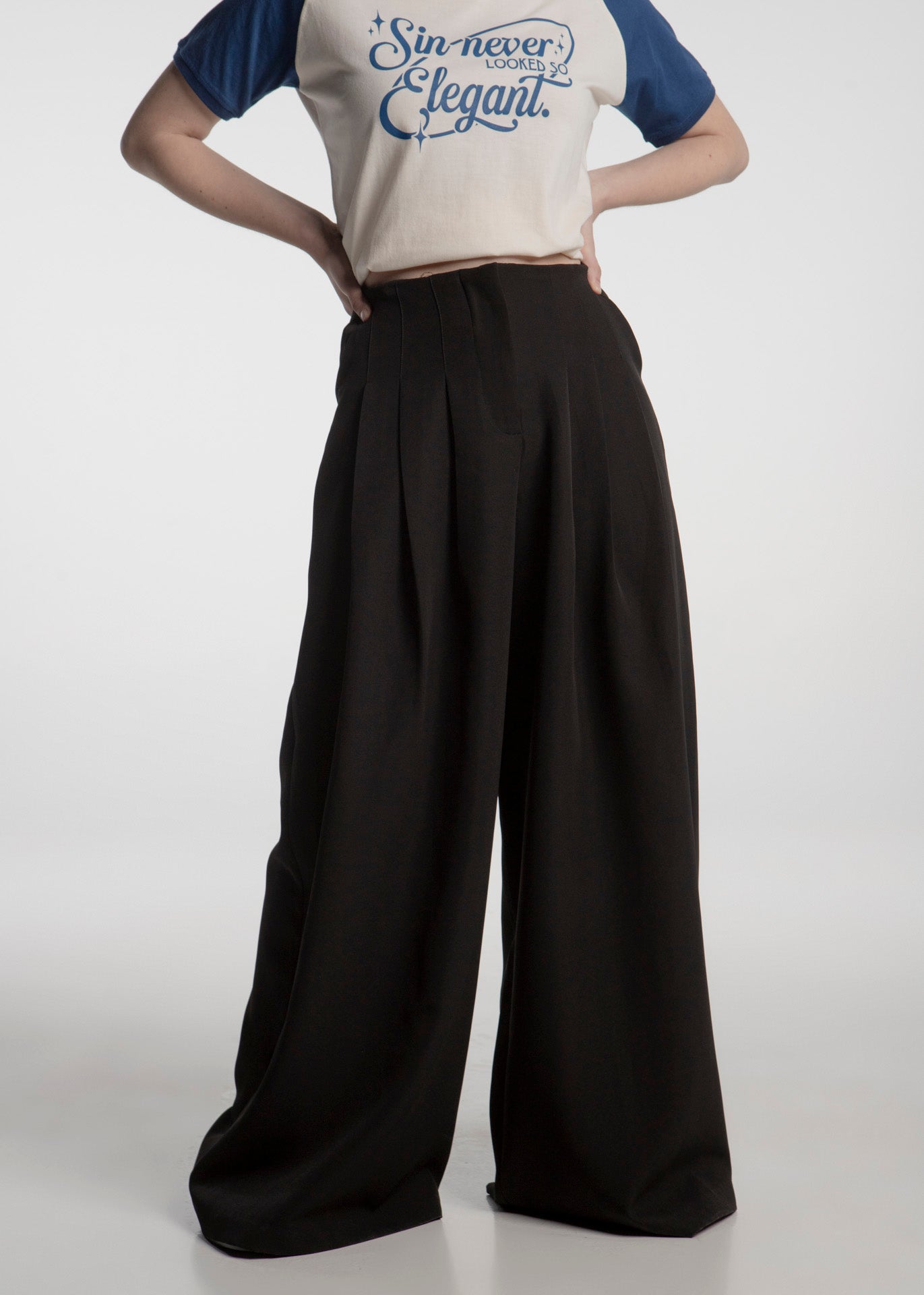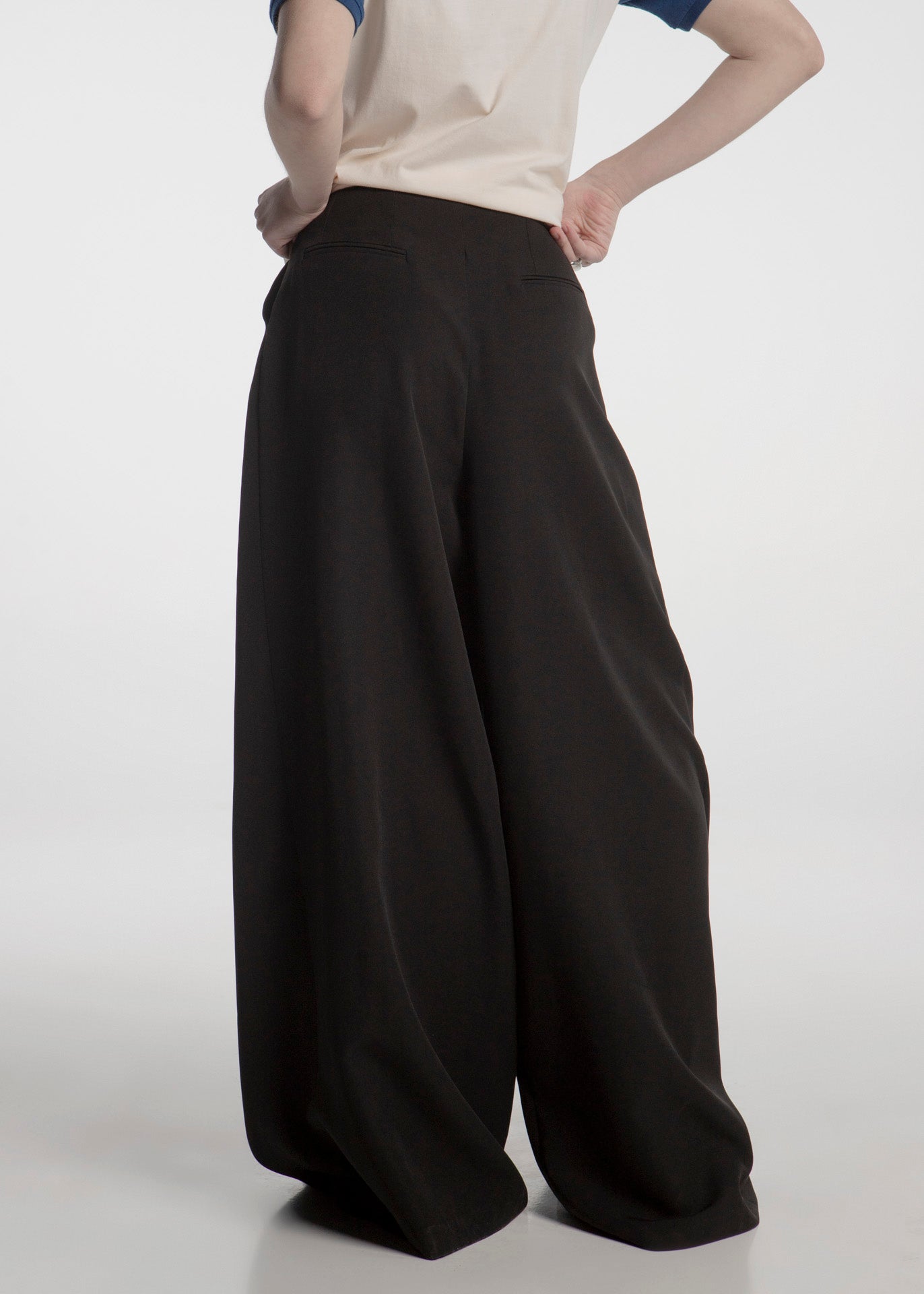 Pantalón de vestir en corte wide leg fabricado en tela negra con pinzas que dan un toque suelto y elegante.