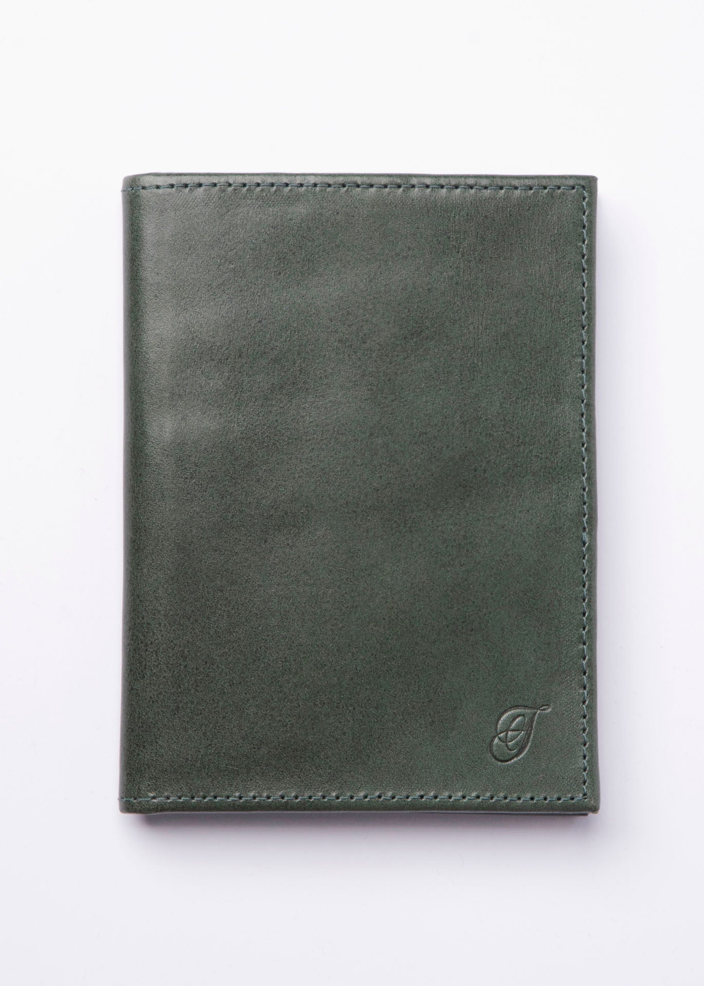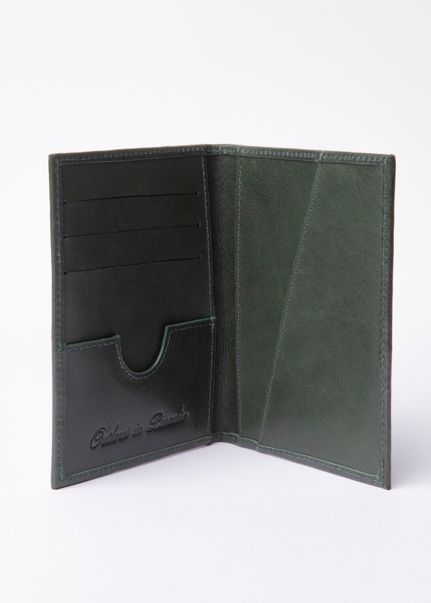 Portapasaporte fabricado en piel color verde con varios compartimientos para distintos documentos