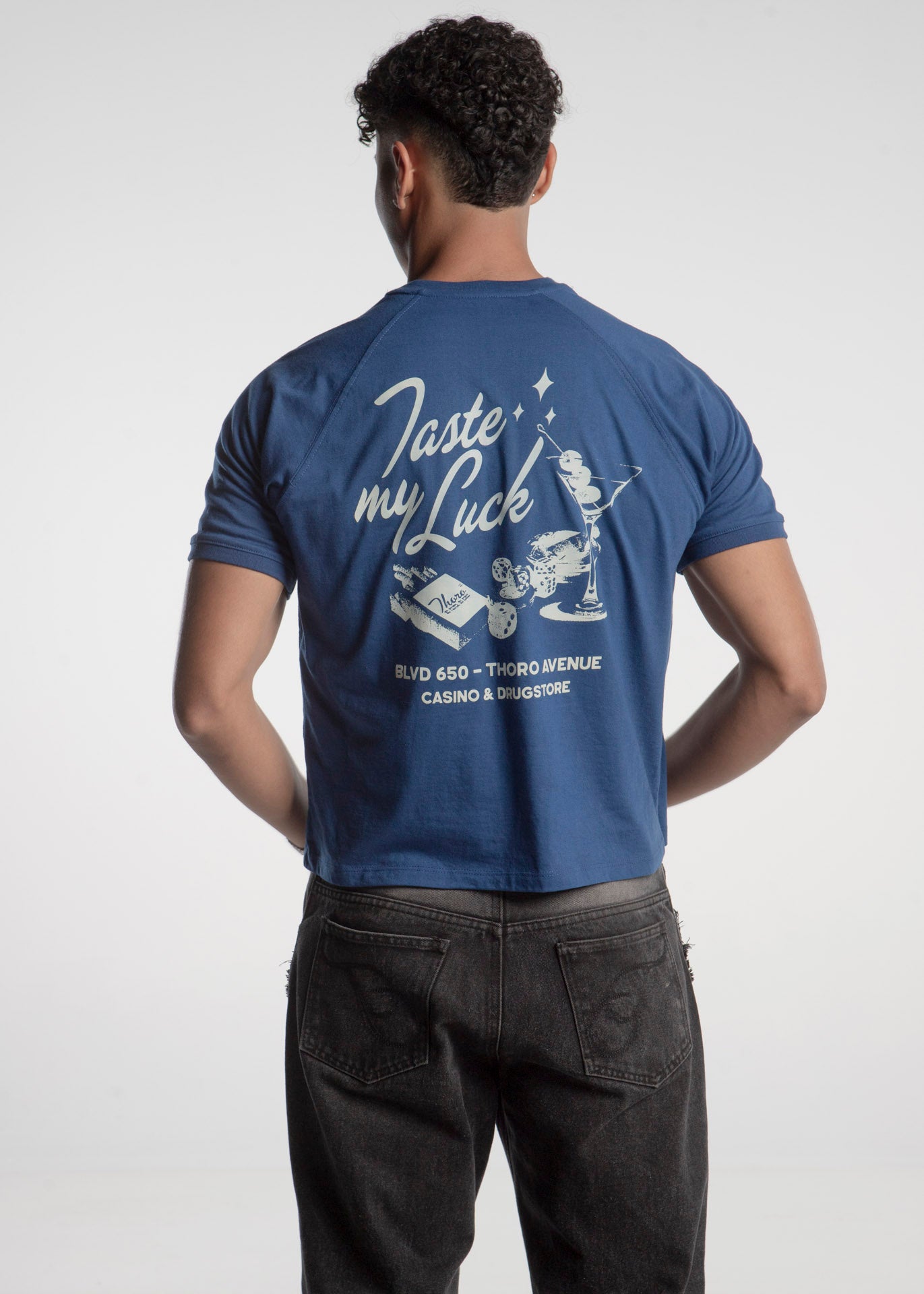 Playera tipo Rangla azul marino, fabricada en algodón con corte slim con diseño en el frente a un costado y full print en la espalda con la leyenda "Taste My Luck"