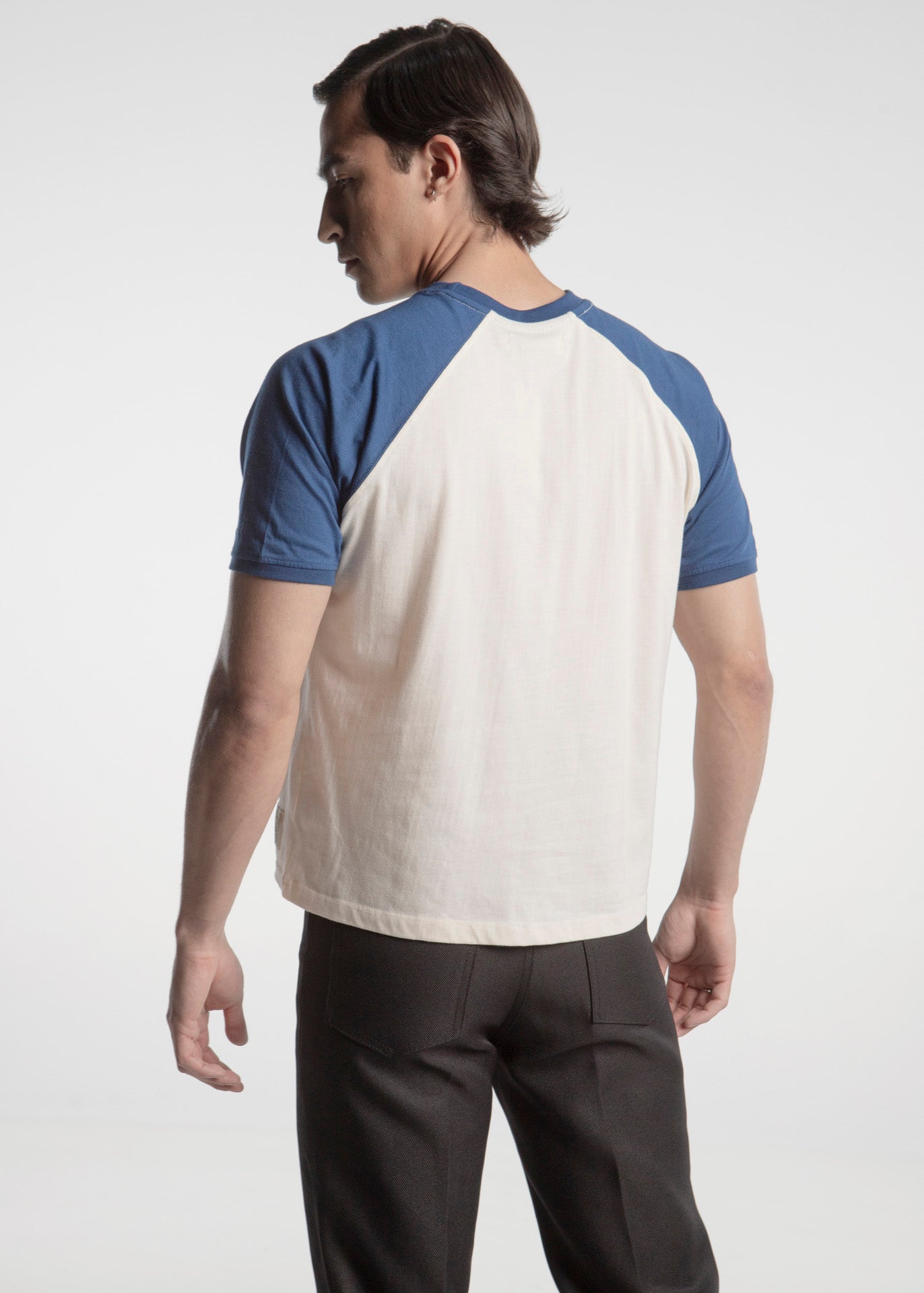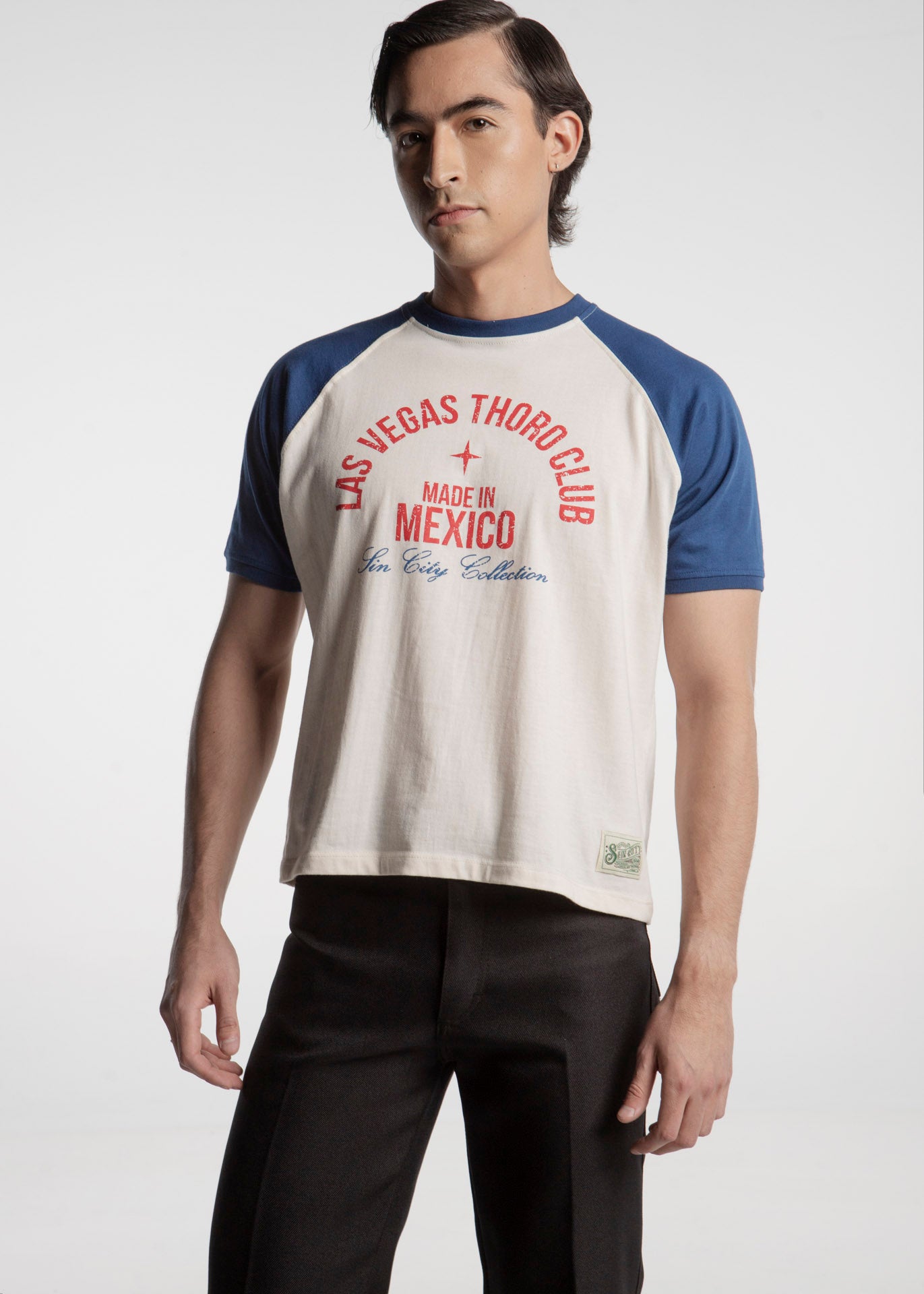 Playera tipo Rangla beige con vivos azules en cuello, hombros y mangas fabricada en algodón con corte slim con diseño en serigrafía con la leyenda en color rojo "Las Vegas Thoro Club / Made in Mexico"