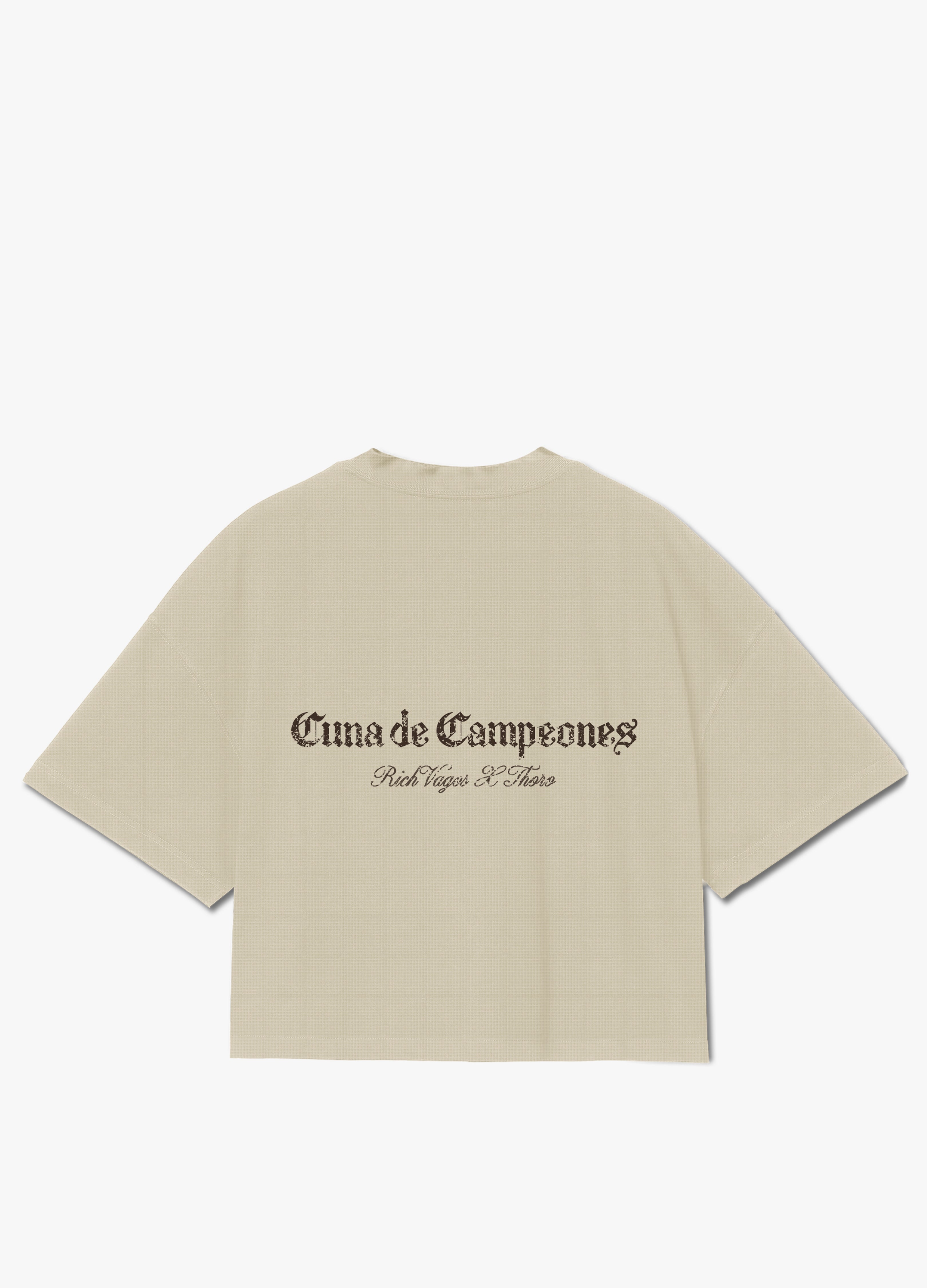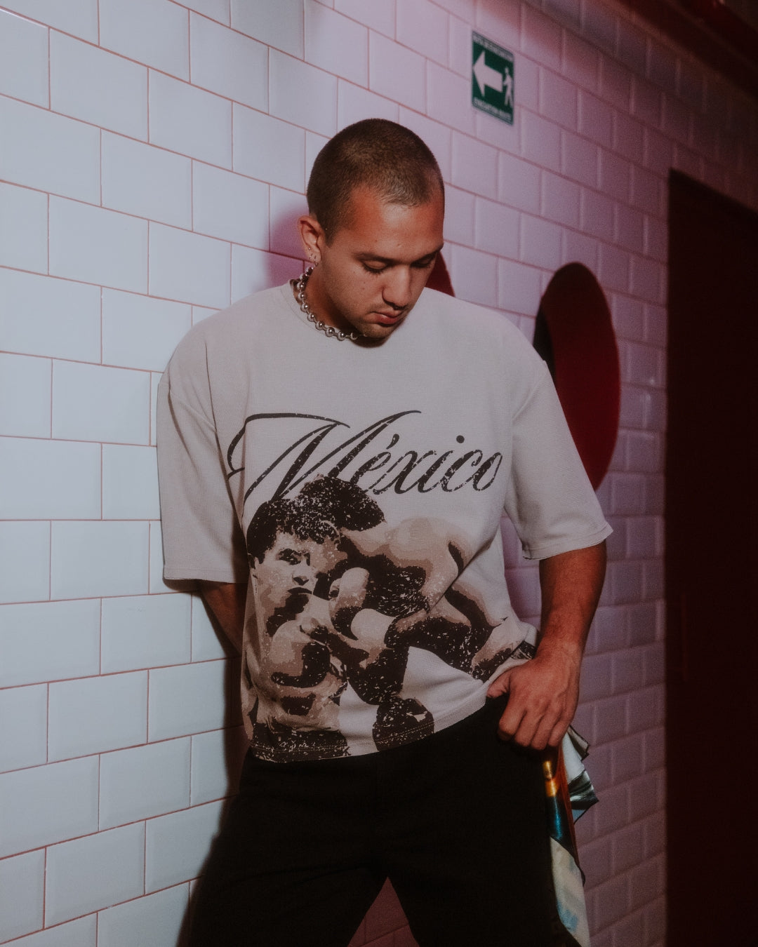 La camiseta Cuna de Campeones rinde homenaje a la grandeza del boxeo mexicano. Su diseño central presenta una ilustración de estilo vintage de la icónica pelea entre Julio César Chávez y Meldrick Taylor. Confeccionada en un tejido de color beige neutro, la camiseta tiene un fit holgado y cómodo, ideal para un look relajado. Es una pieza de colección que celebra la historia del deporte con un estilo gráfico fuerte y atemporal.