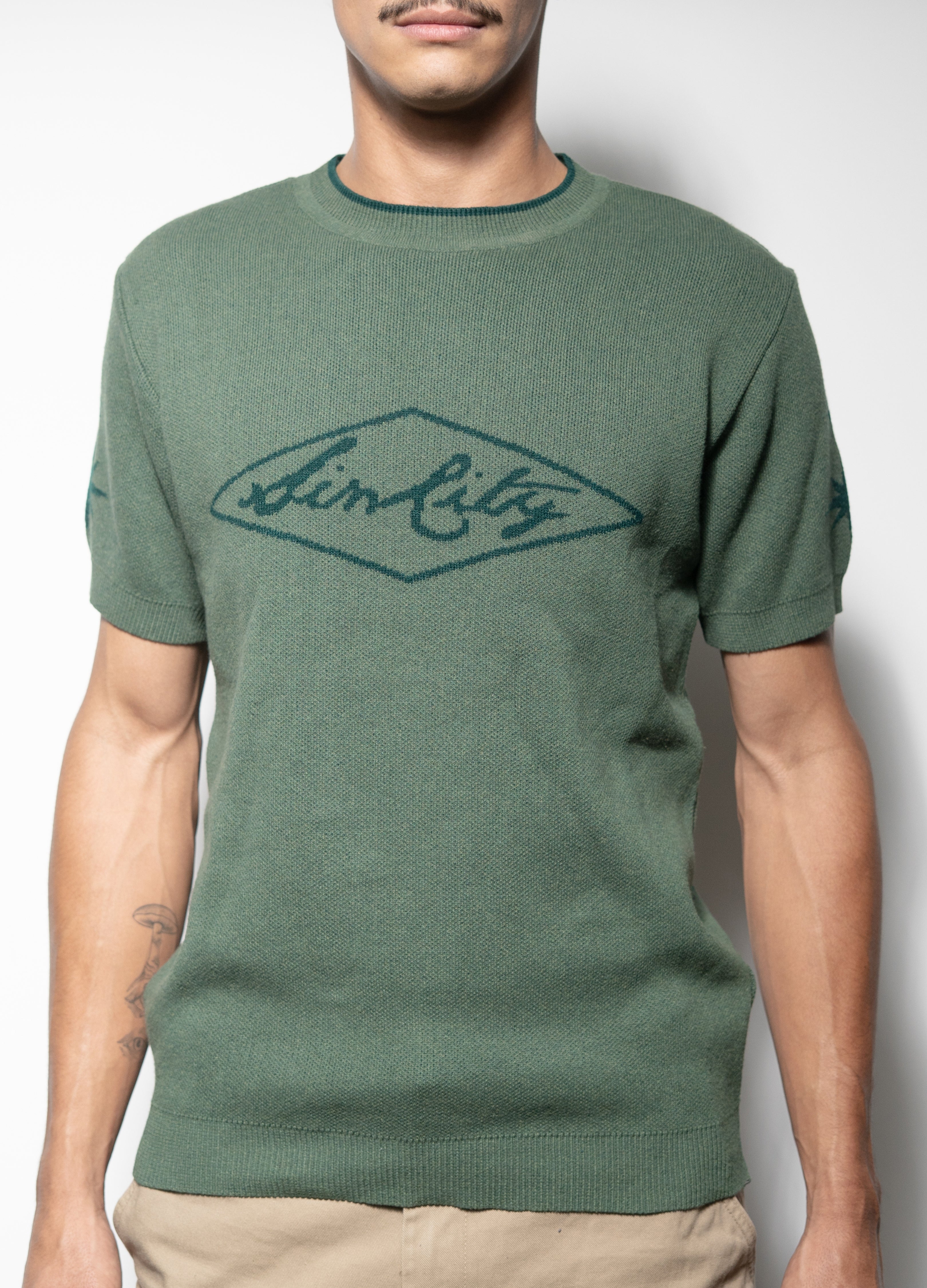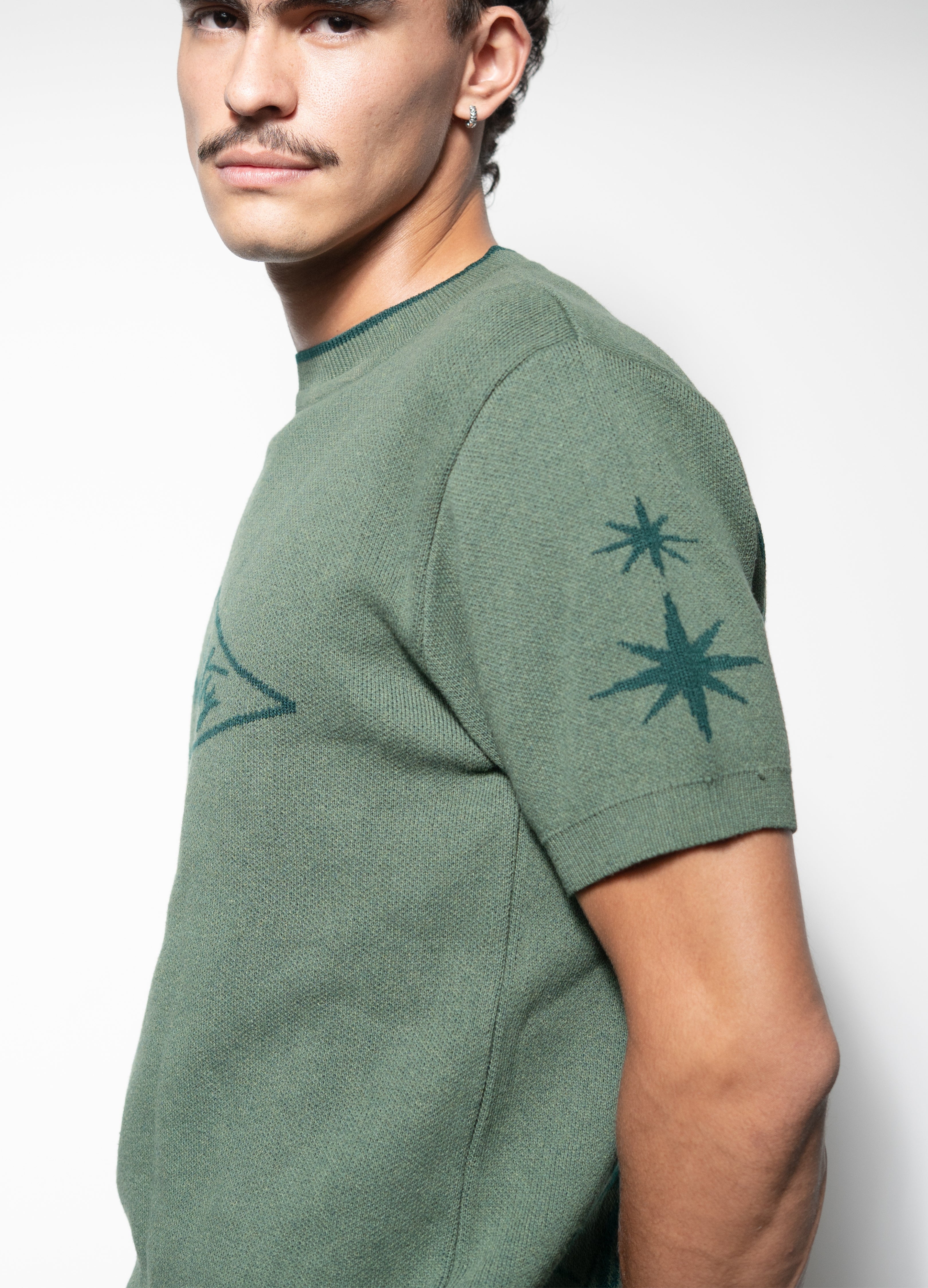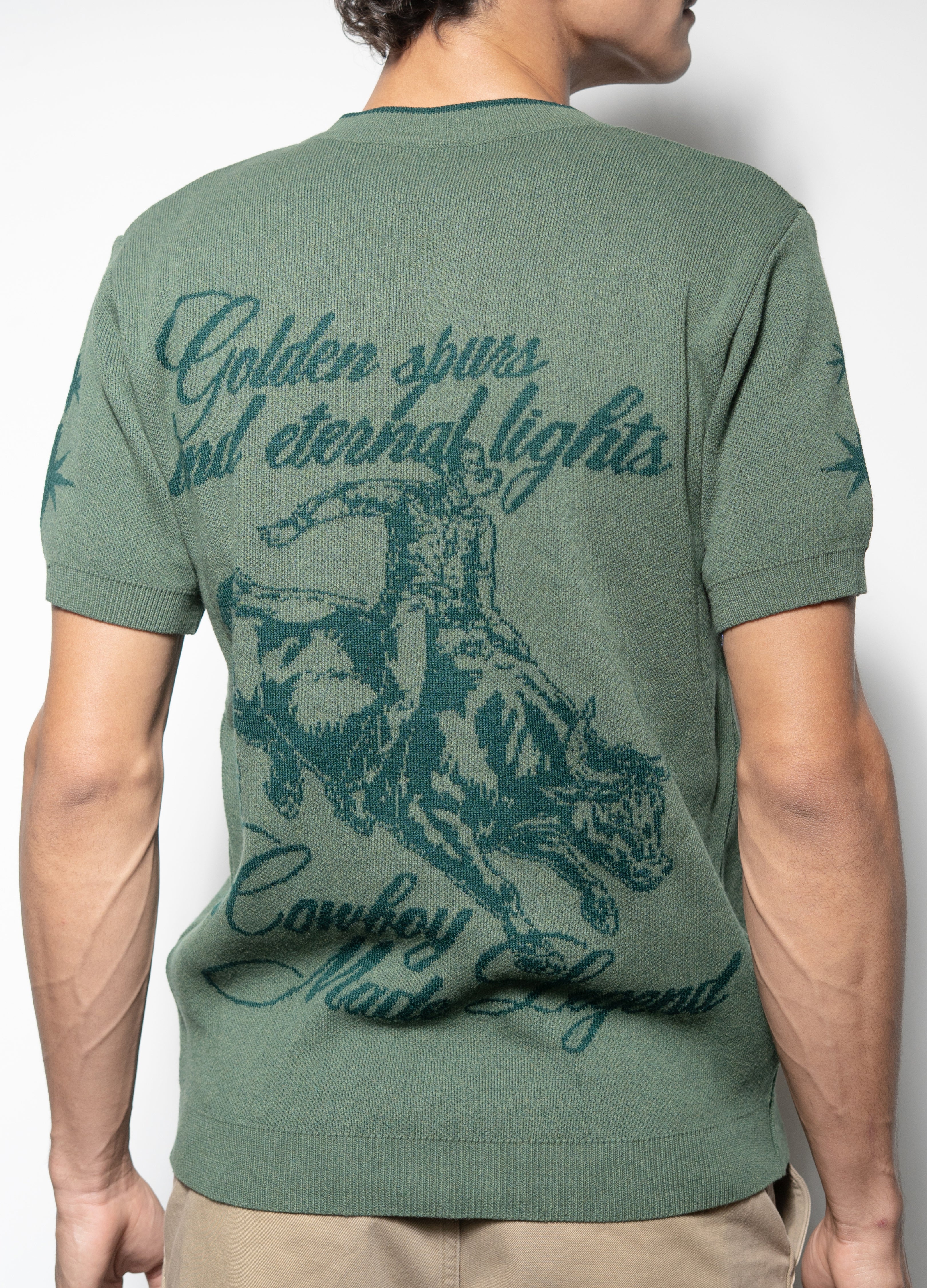 Playera estilo suéter tejido de lana en color verde con estampados.