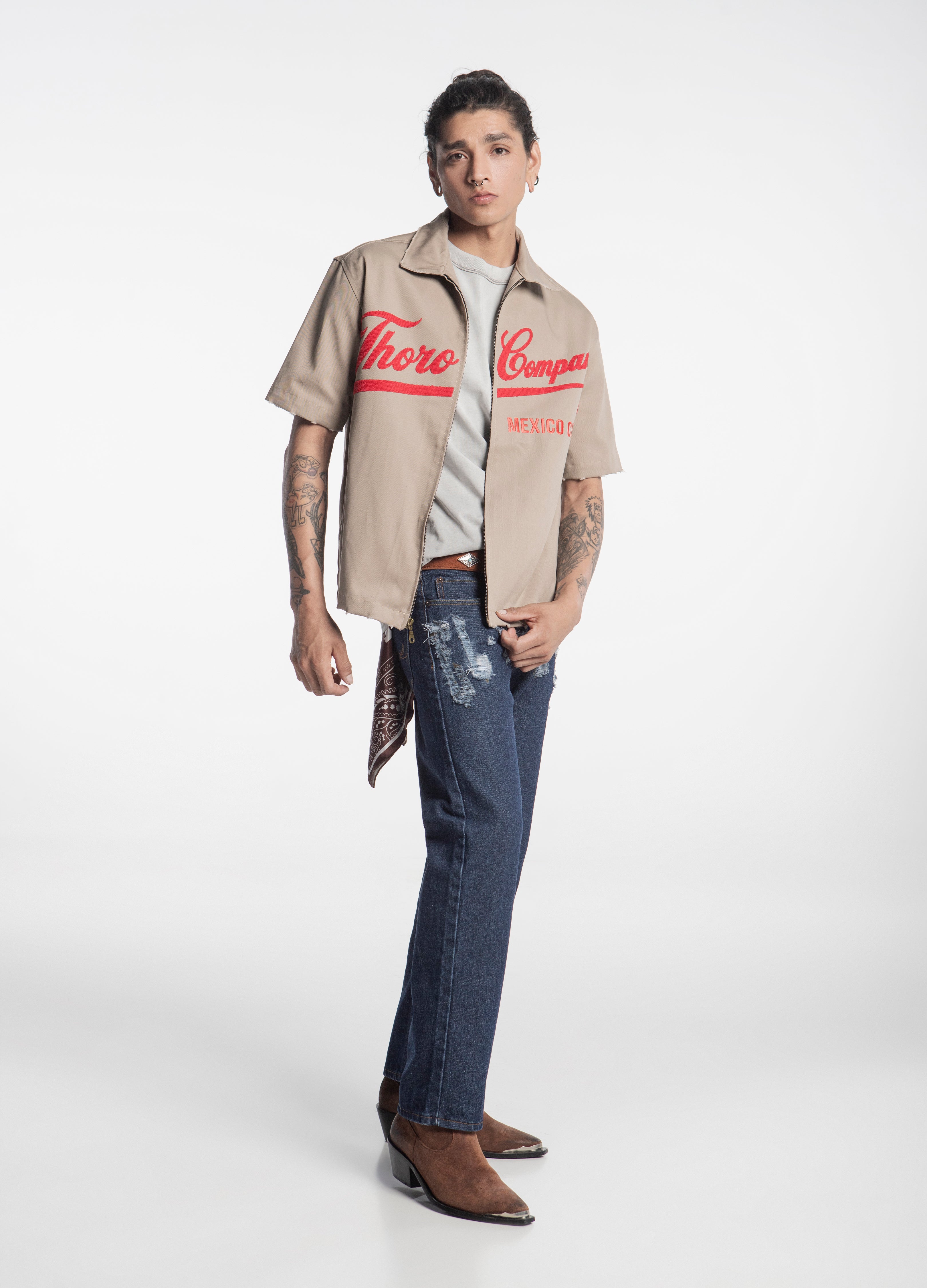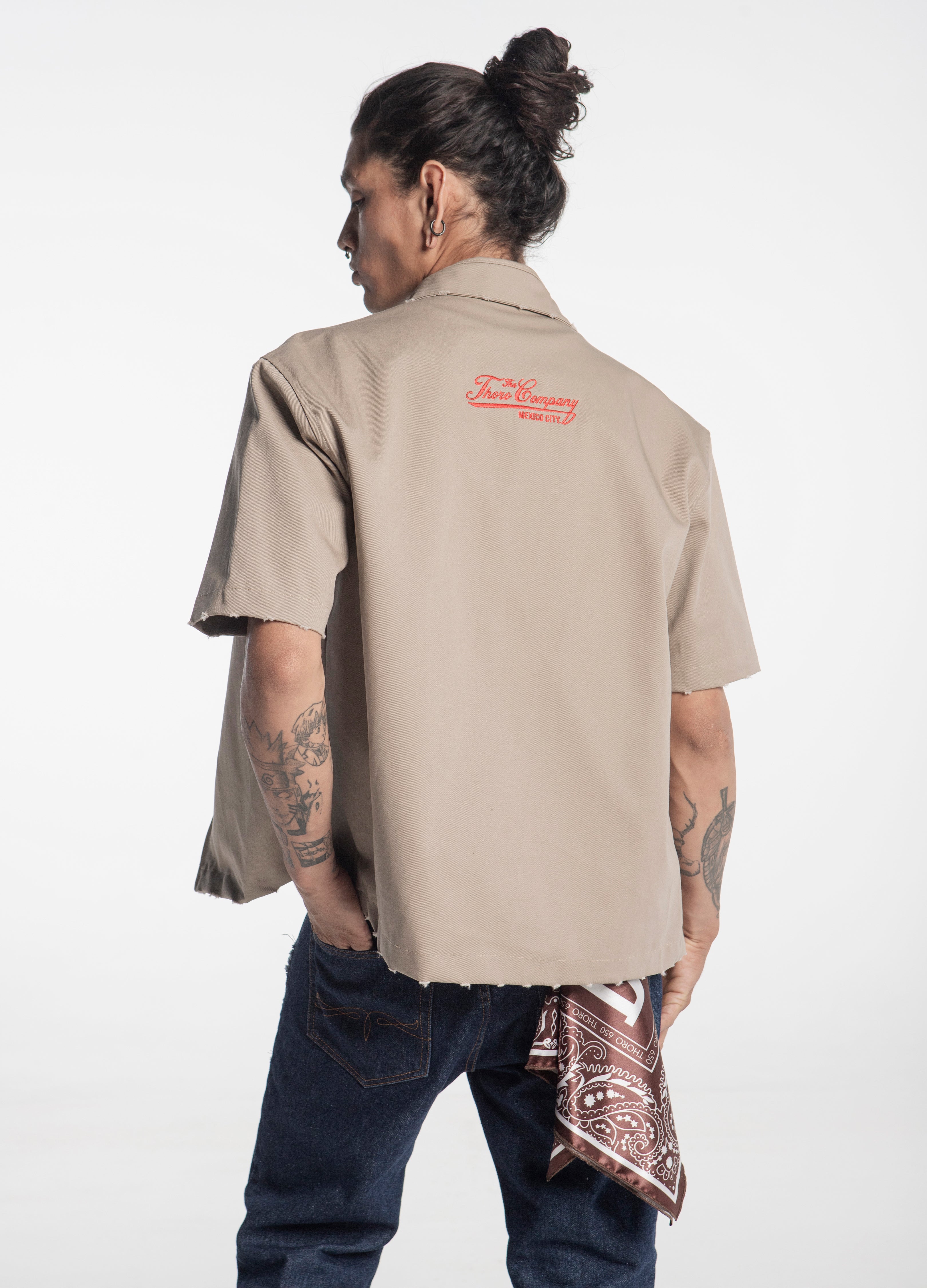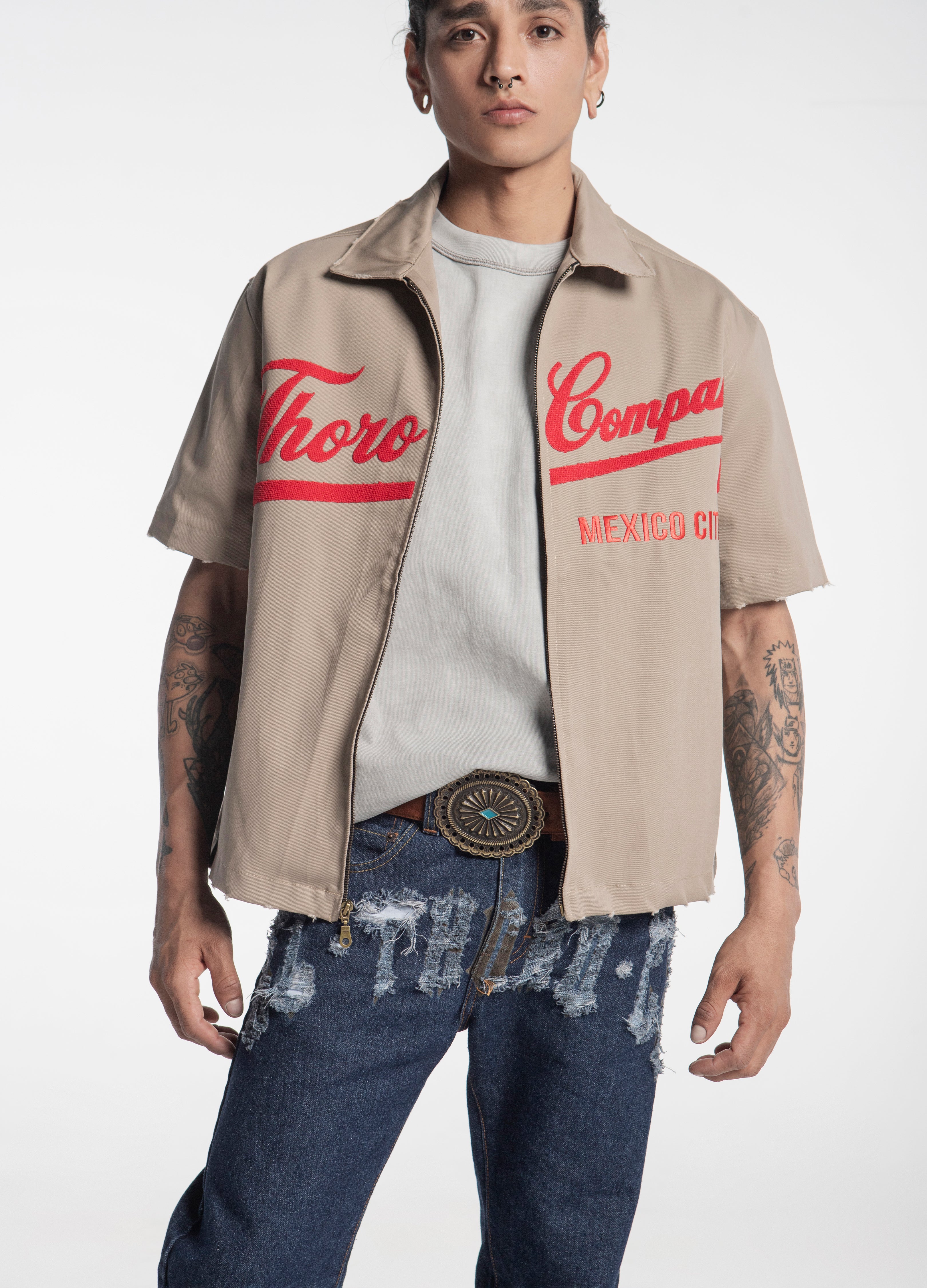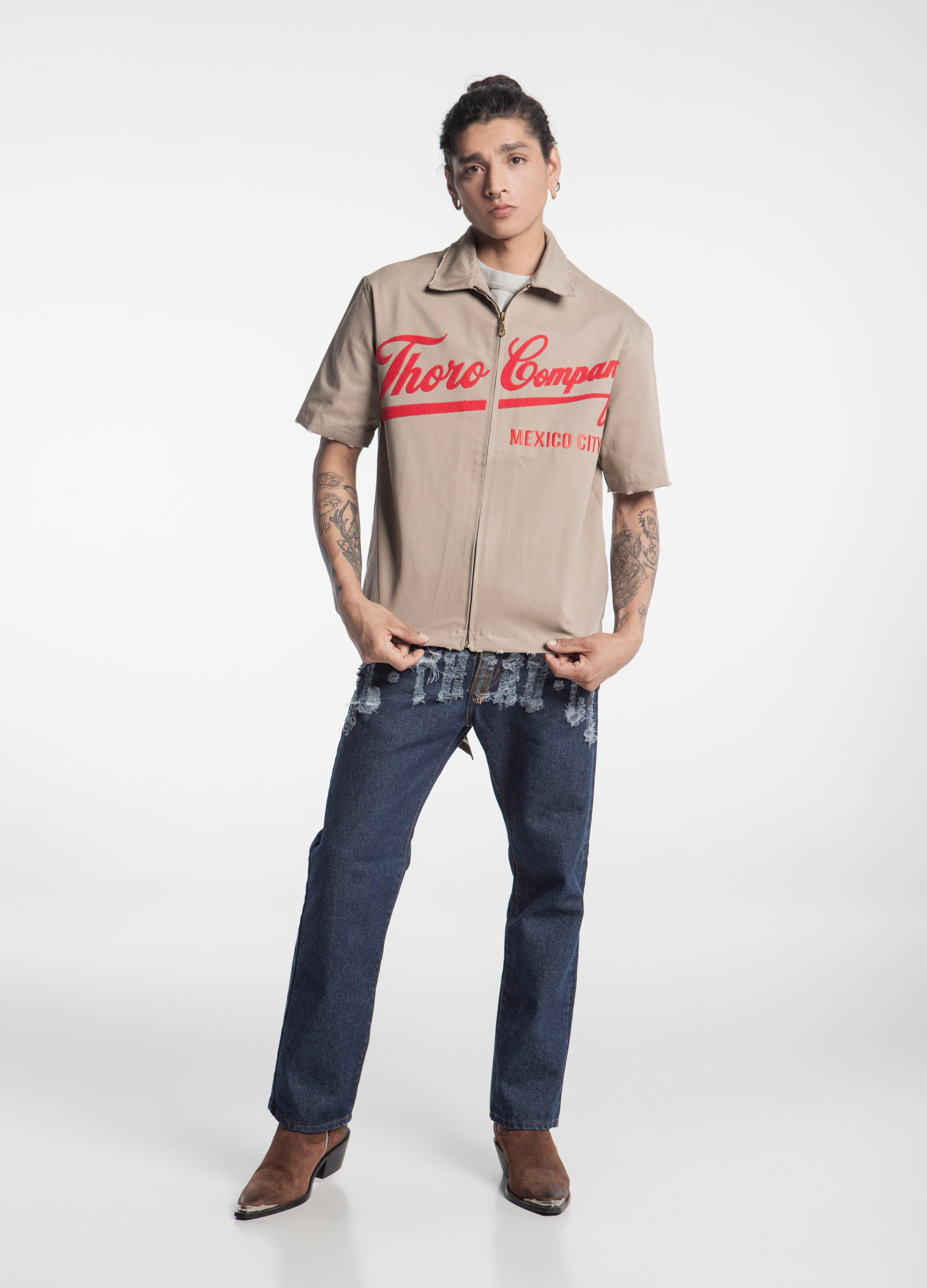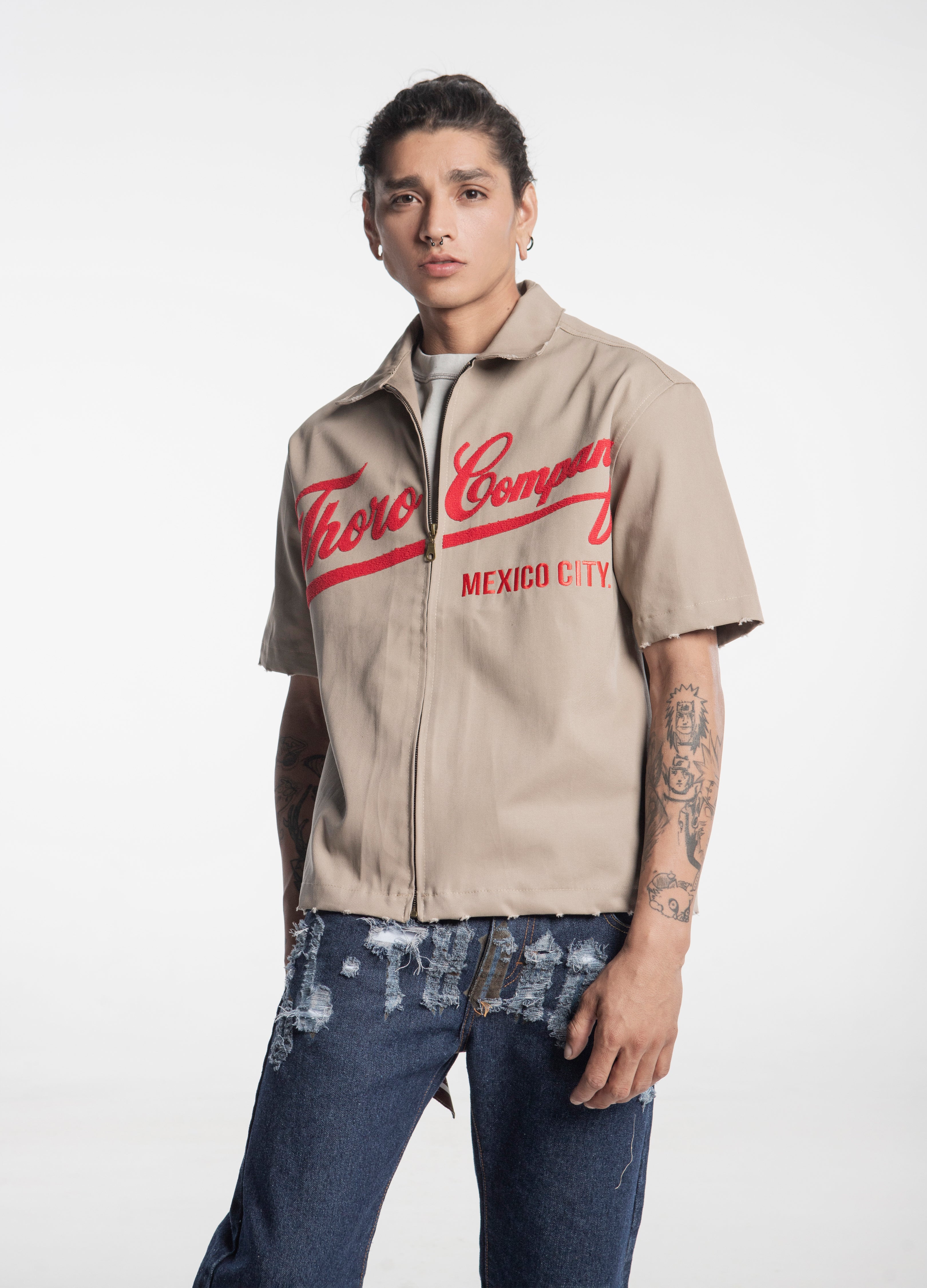 Sobrecamisa color beige de cierre, corte boxy, con diseño en manuscrito retro "Thoro Company" en el frente en color rojo en acabado de toalla y en espalda bordado.