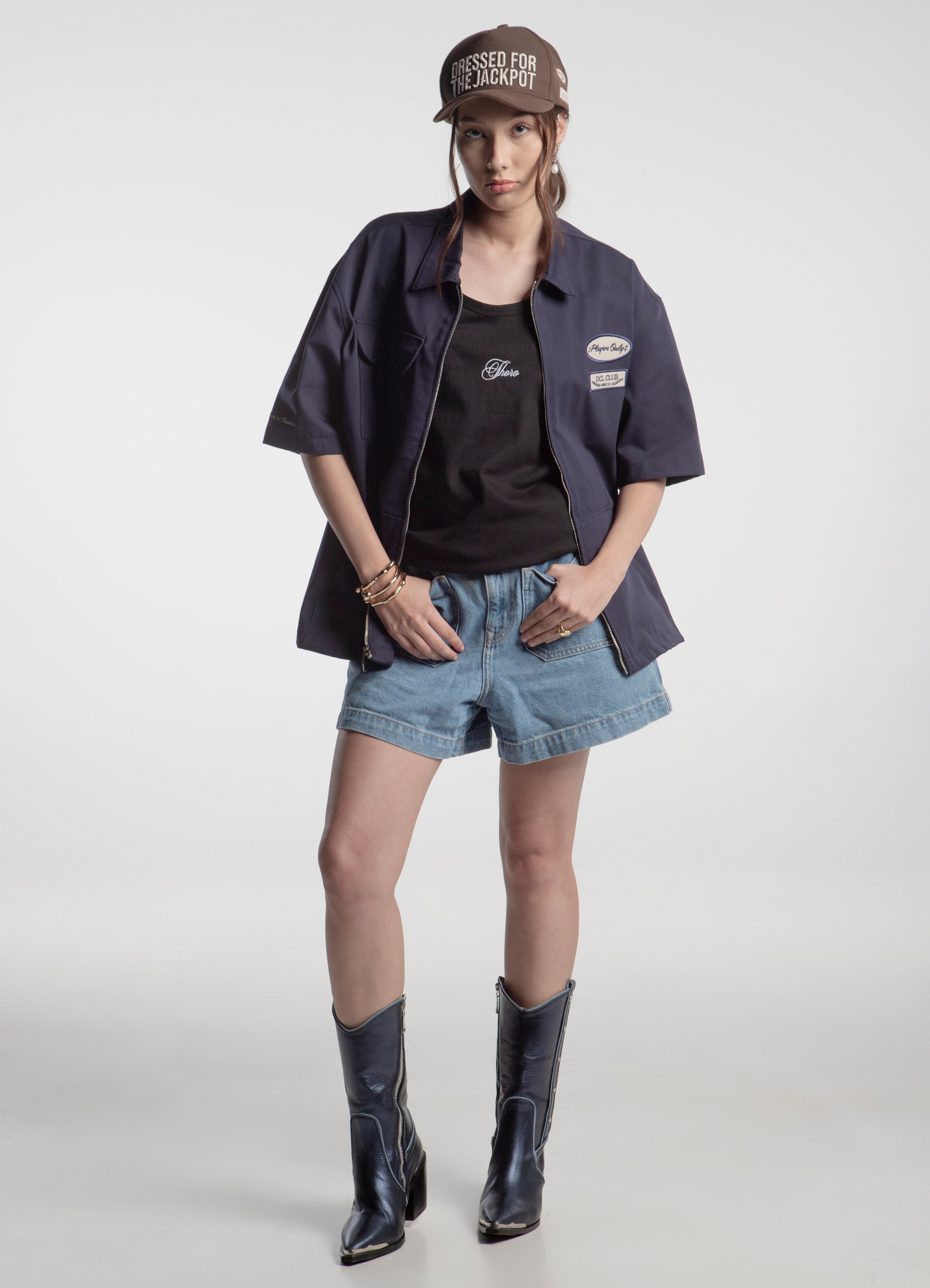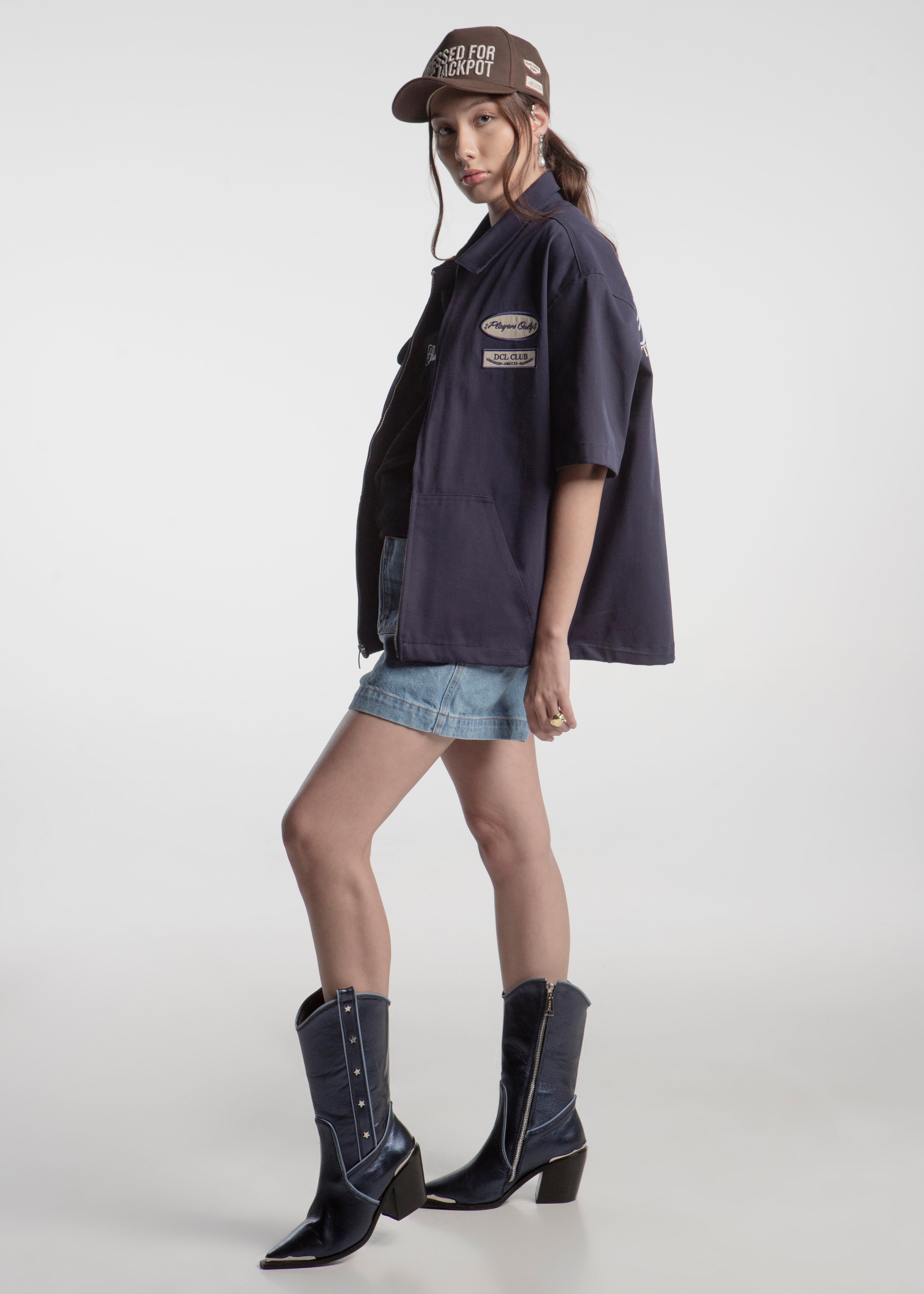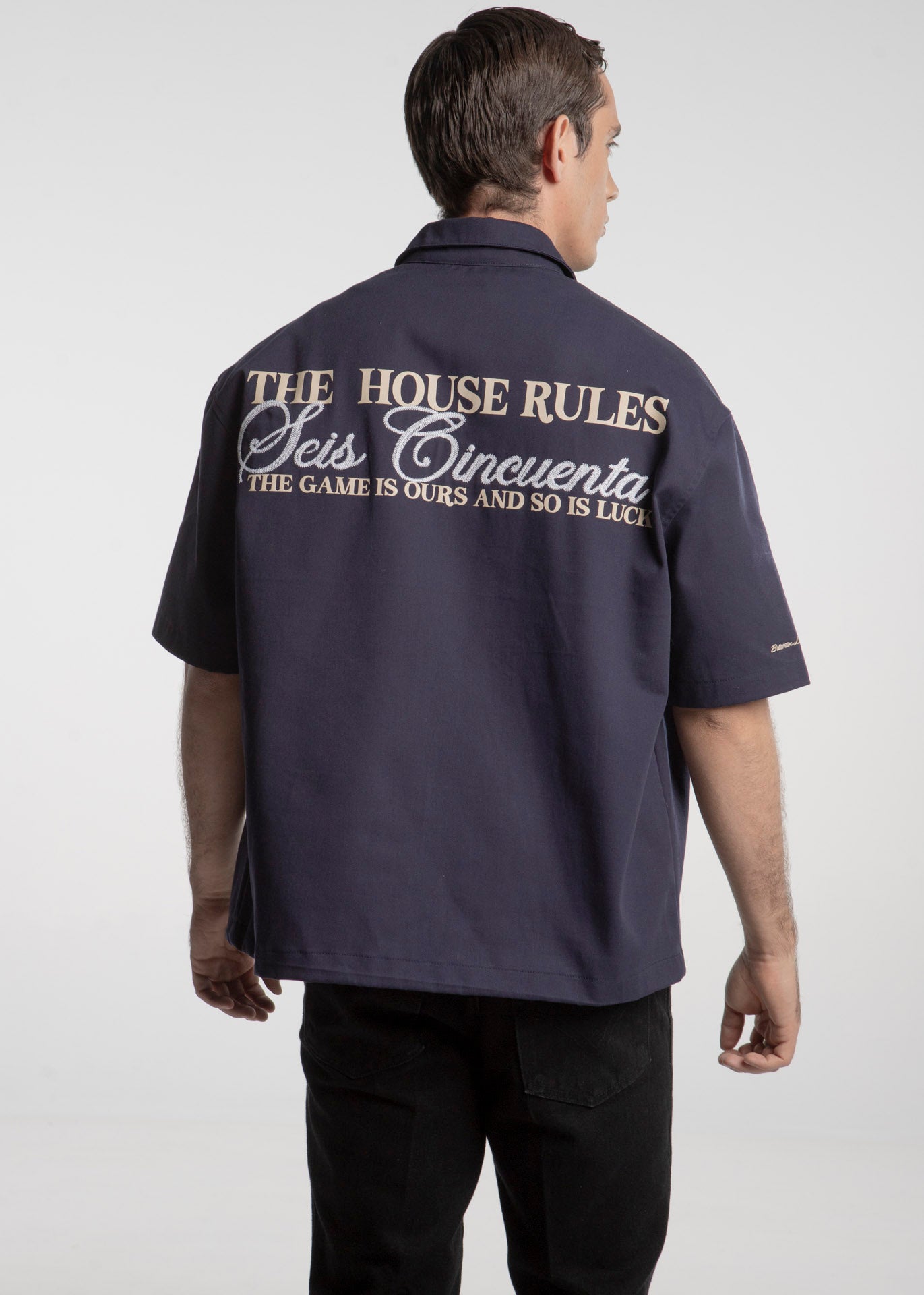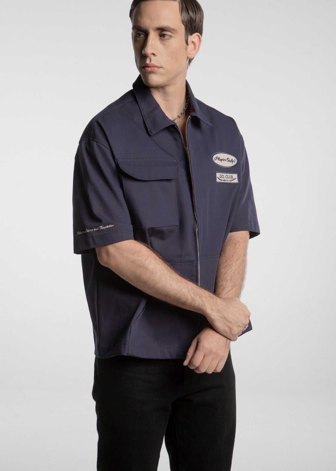 Sobrecamisa confeccionad en tela color azul marino con bordados en color beige y blanco.