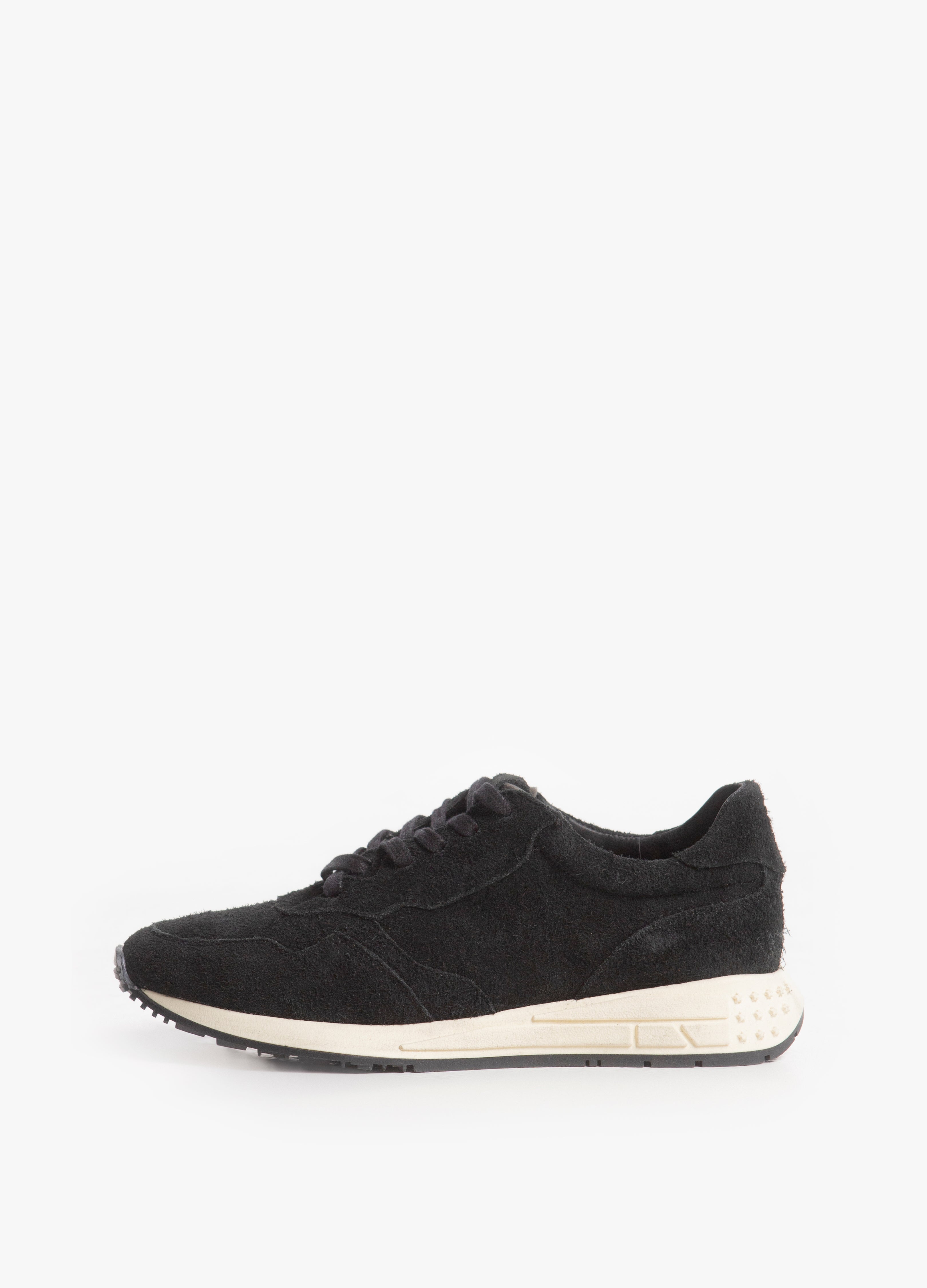 Sneakers estilo runners fabricados en piel de res acabado gamuza con suela blanca y dos pares de agujetas (beige y negras) para intercambiar.