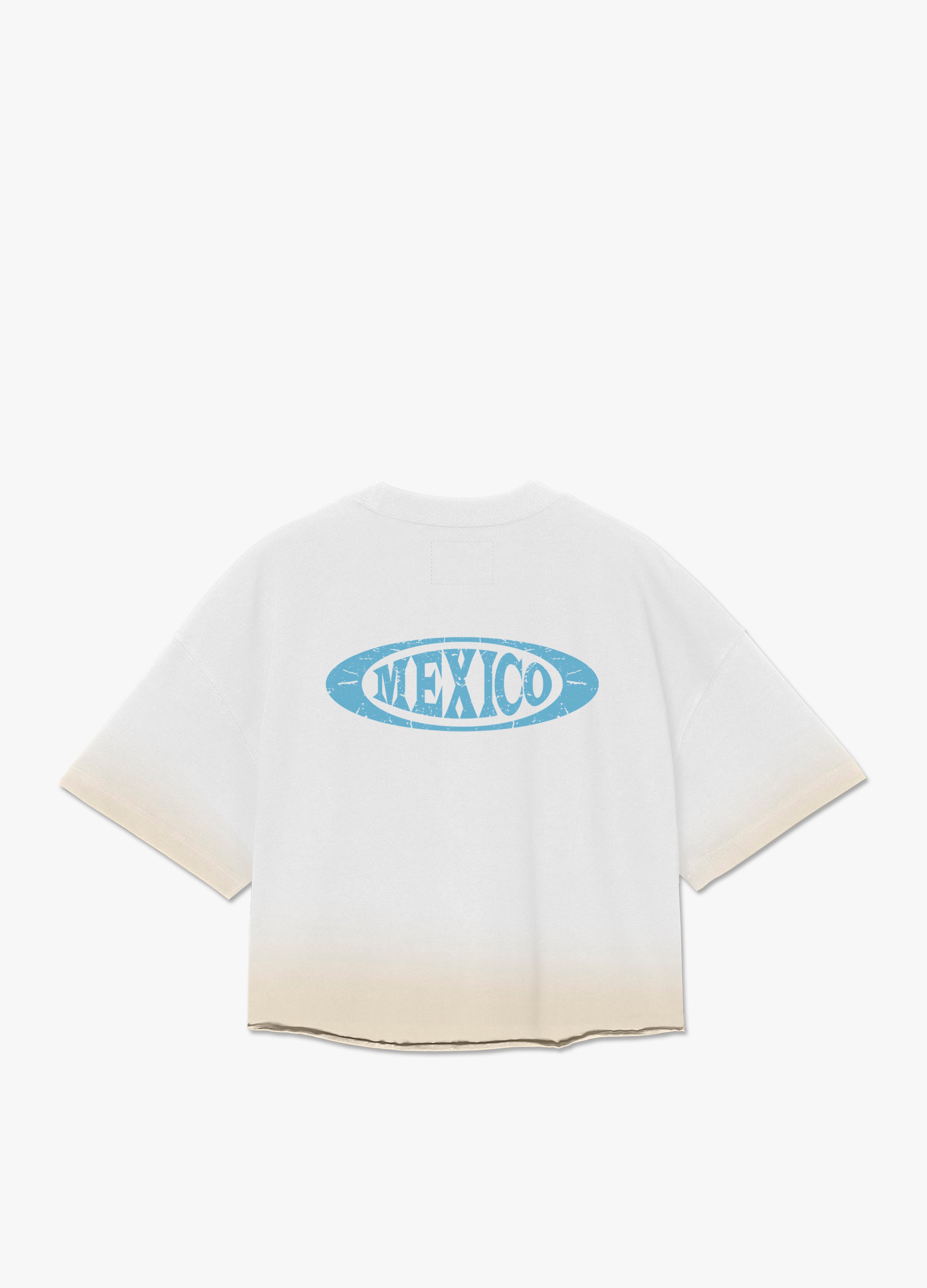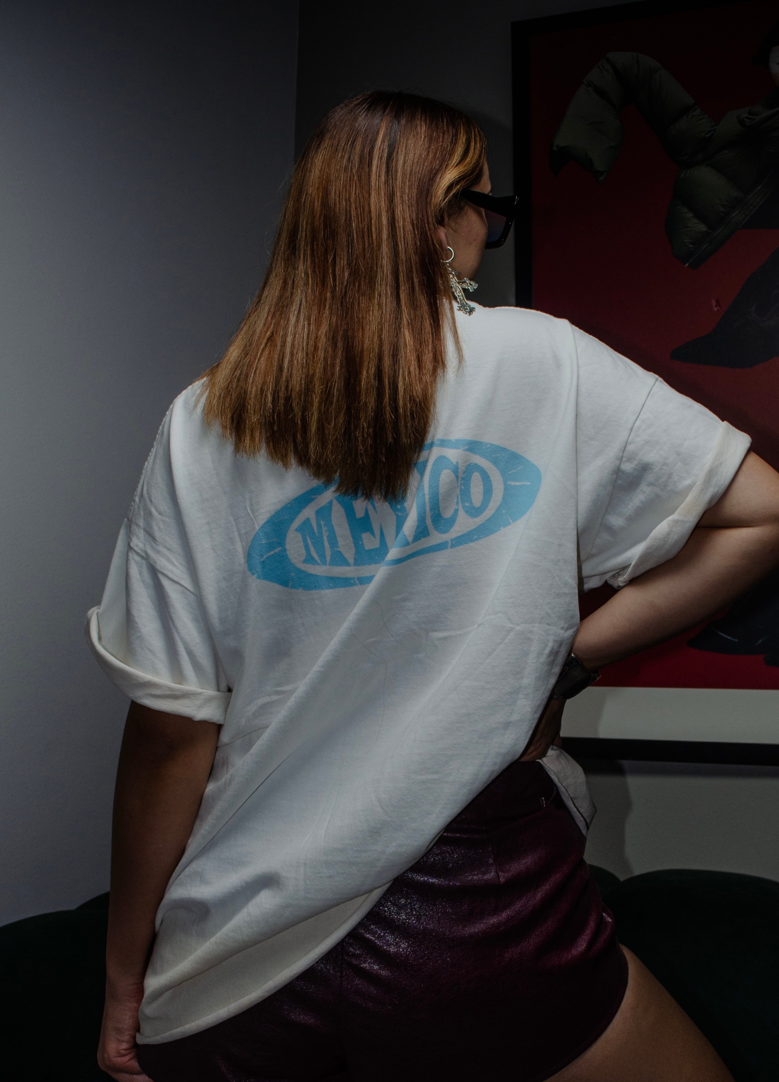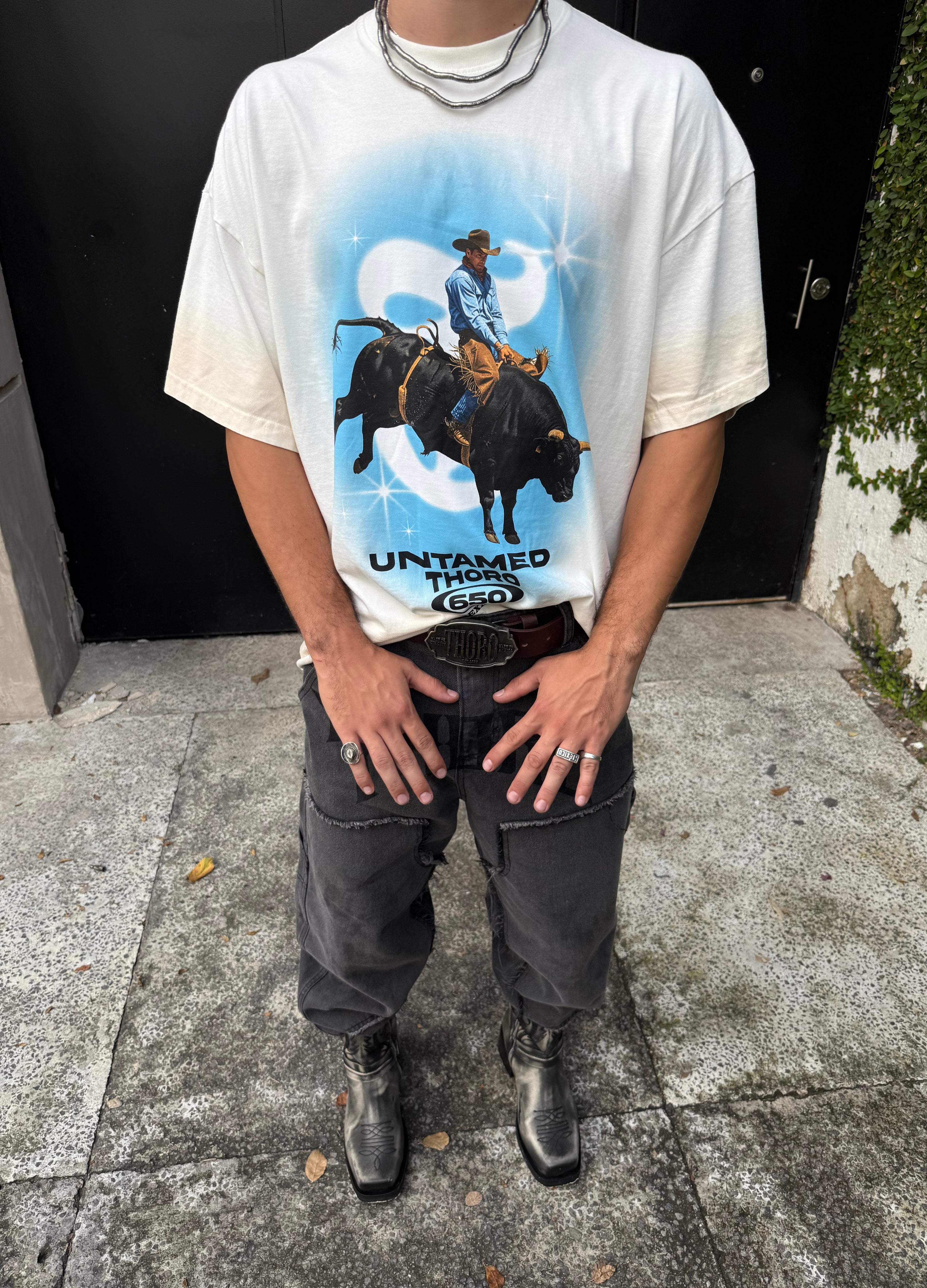 Este modelo Untamed es una camiseta de corte holgado y estilo gráfico con referencias a la doma. El tejido blanco presenta un sutil efecto desgastado en el bajo. Su diseño central destaca por el gráfico vívido de un jinete sobre un toro. El reverso lleva el print "MEXICO" enmarcado en un óvalo de inspiración vintage.