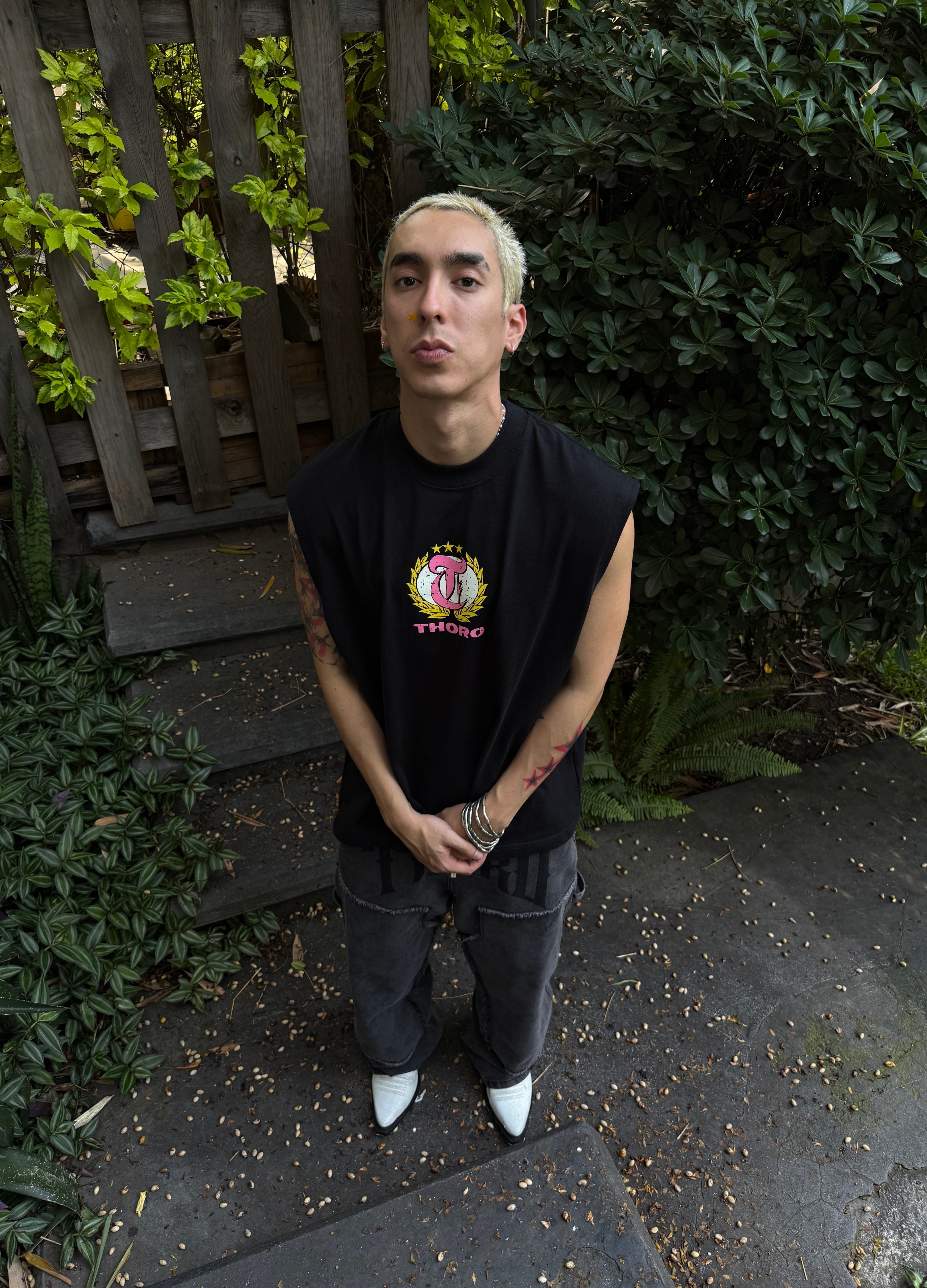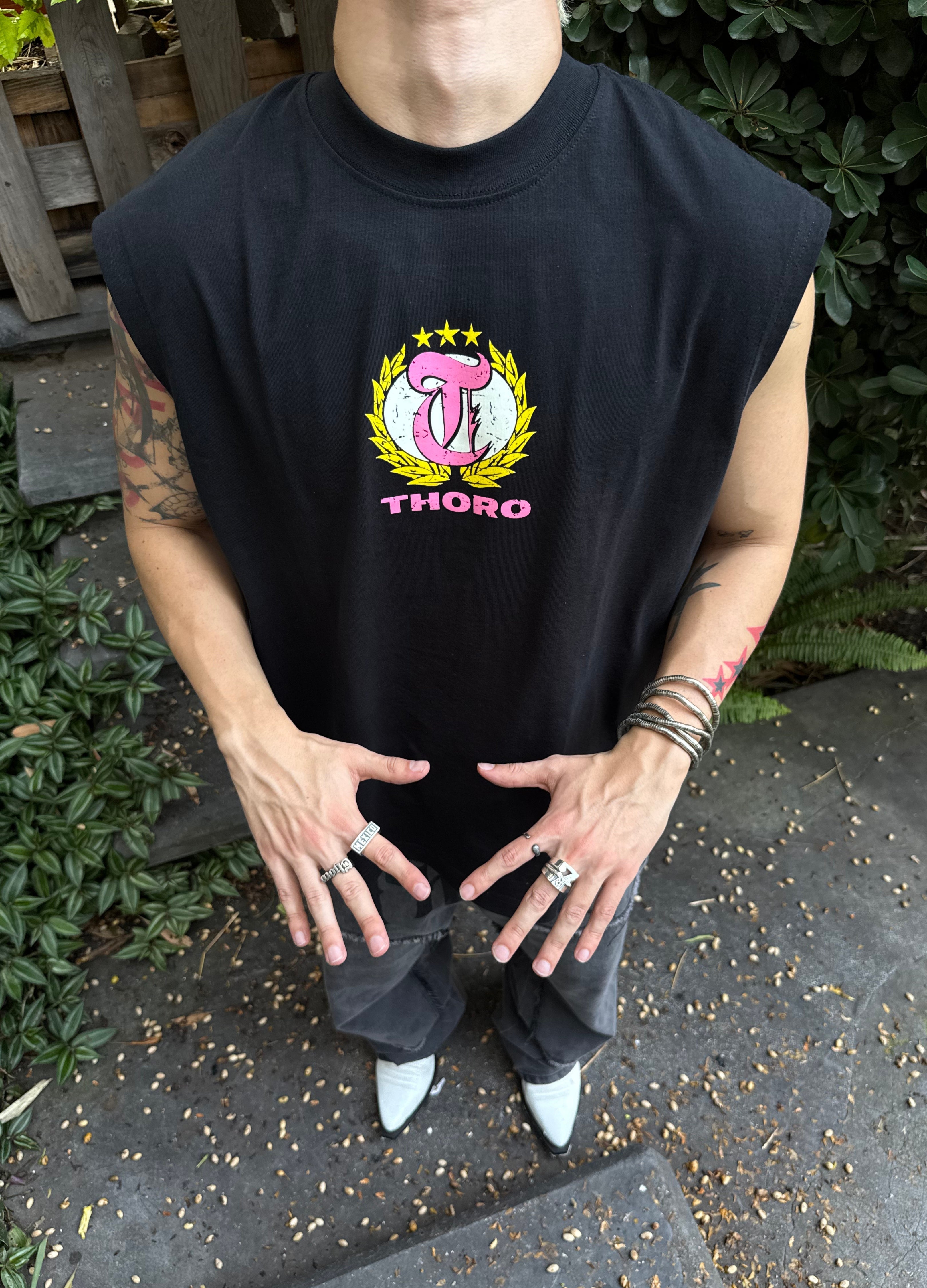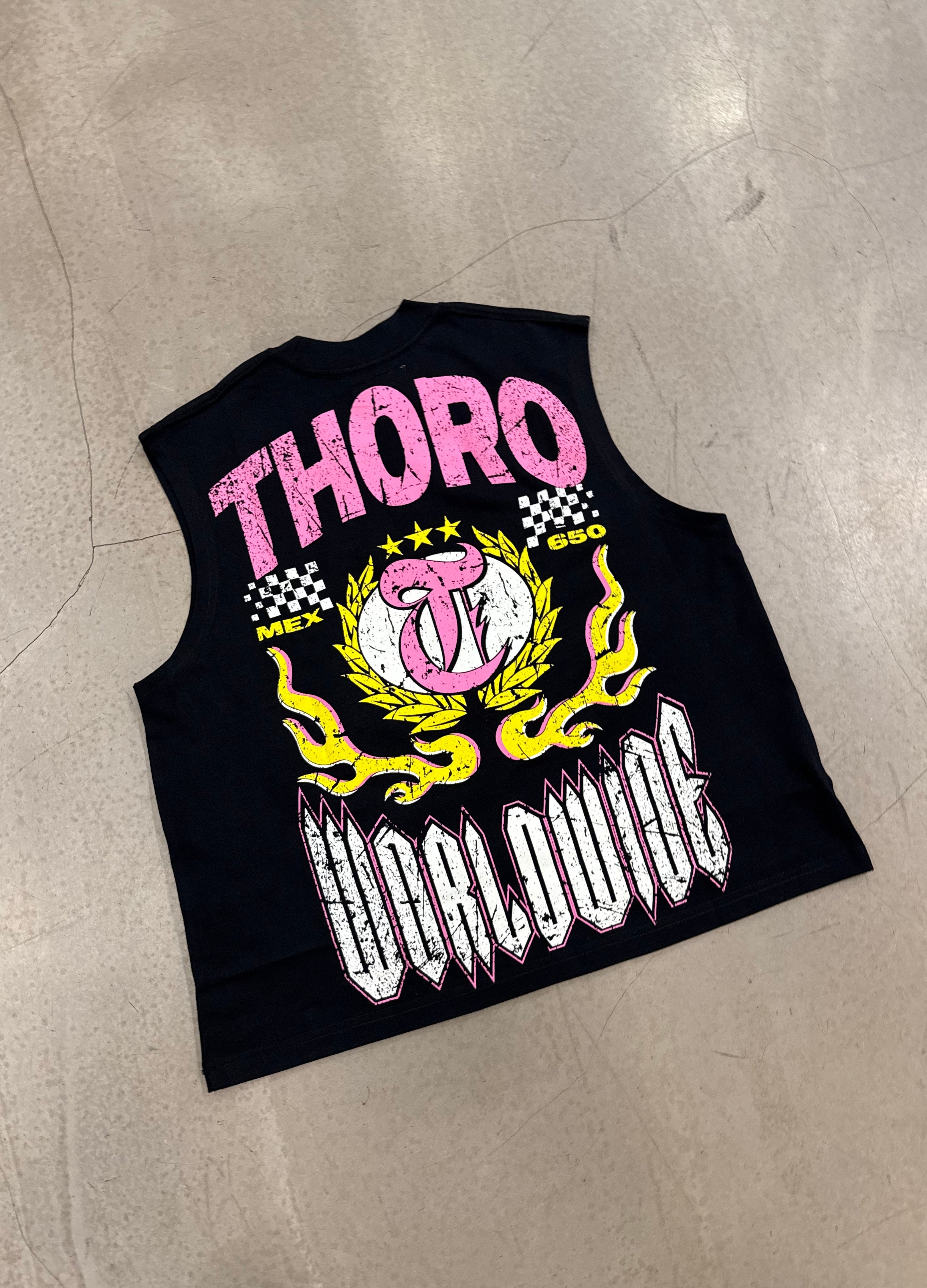 La playera Worldwide es una prenda oversize que celebra la marca con una estética vintage de carreras y rock. Confeccionada en tejido negro, destaca por el gran gráfico trasero con el logo THORO en rosa y la palabra "WORLDWIDE" en fuente desgastada, enmarcado por flamas y laureles. El pecho lleva un gráfico más pequeño que mantiene el mismo emblema.