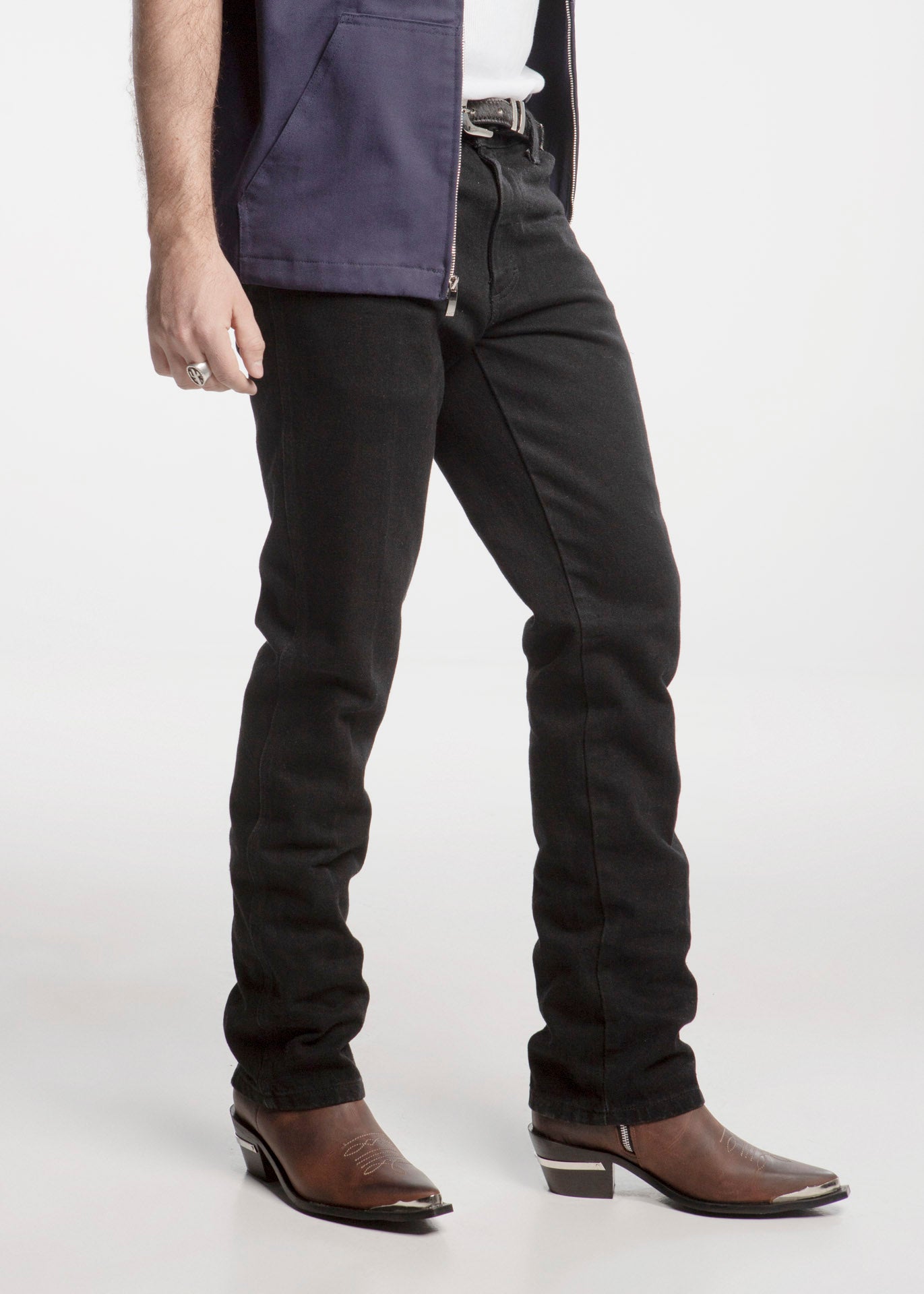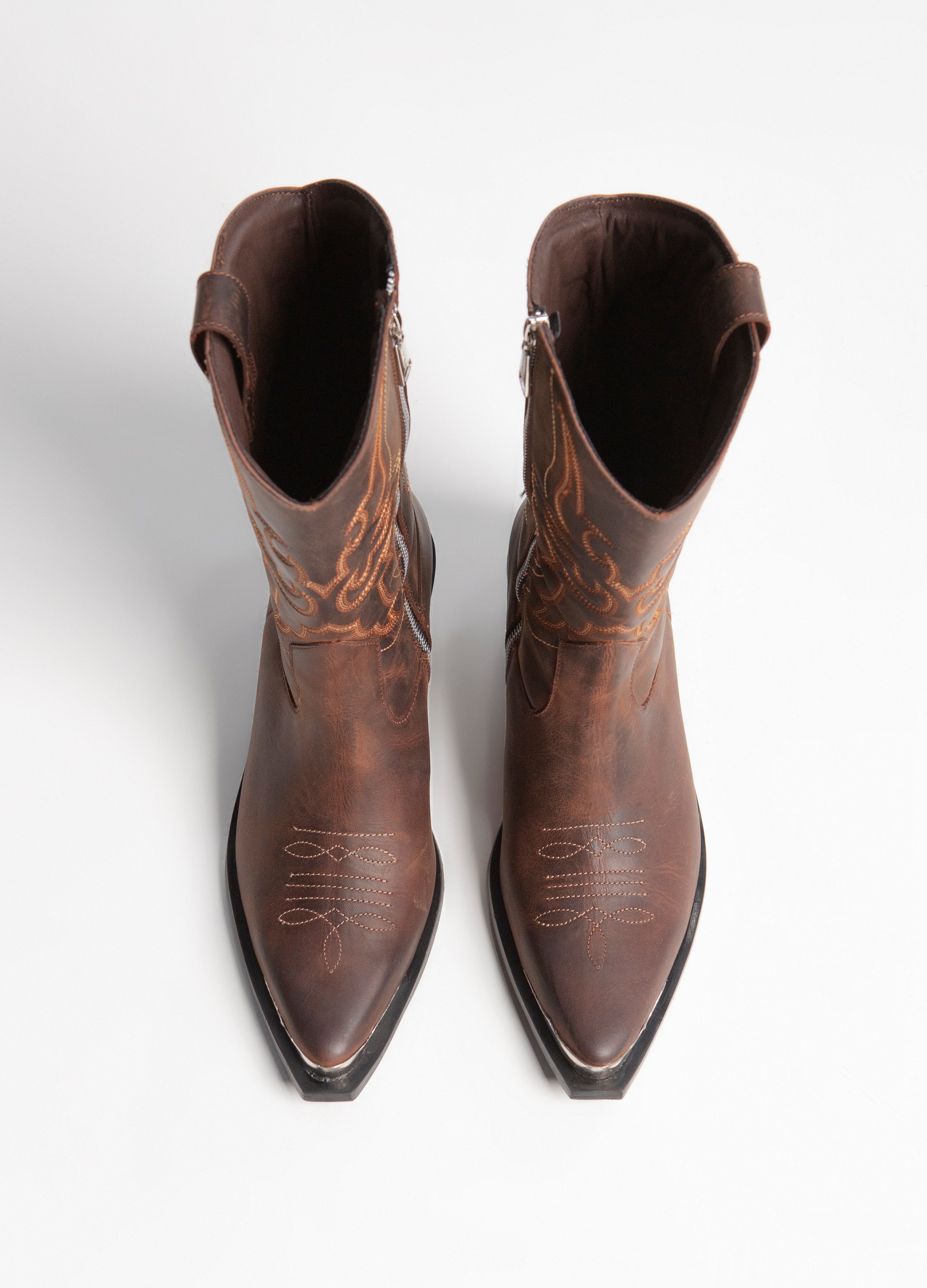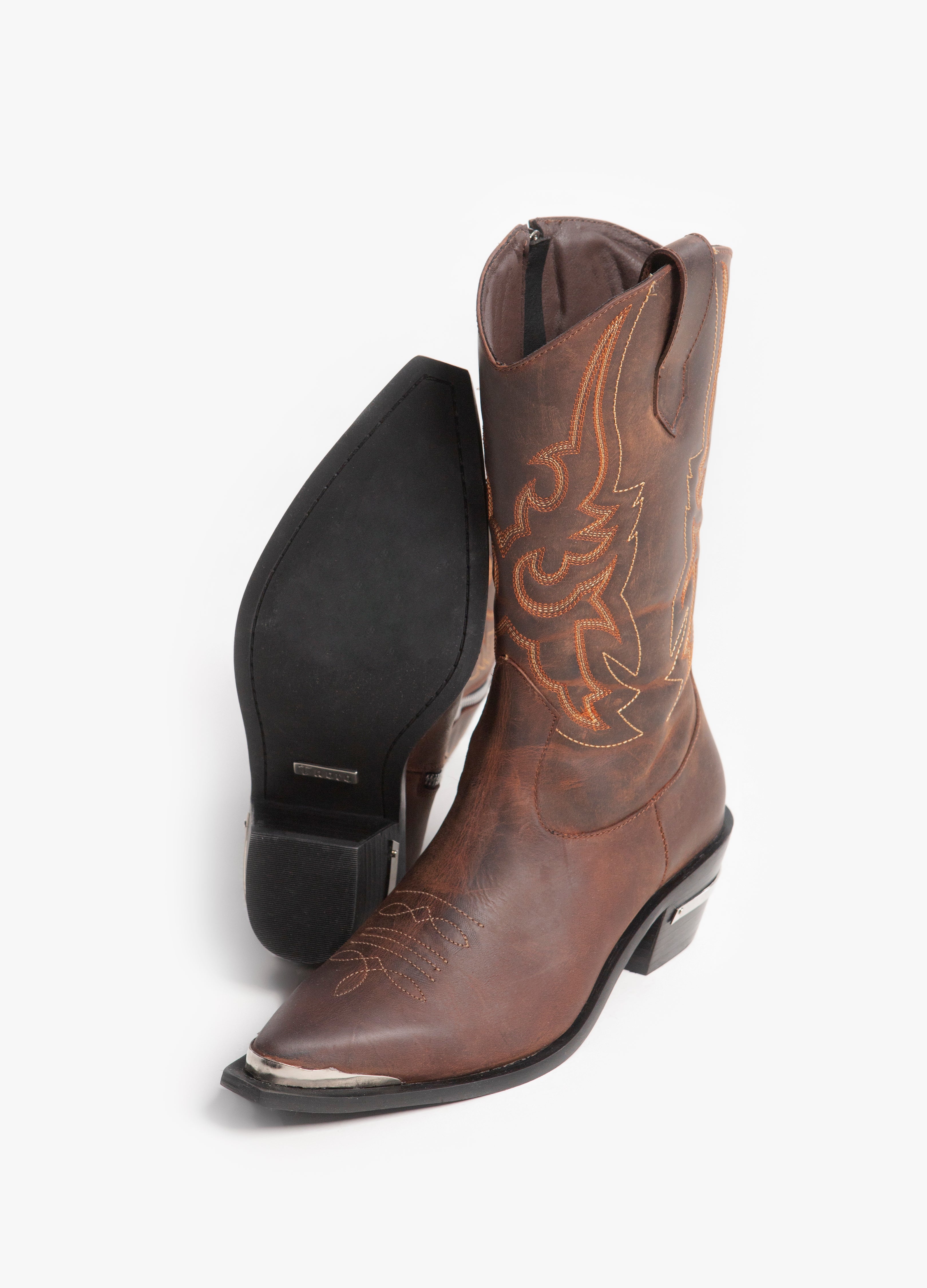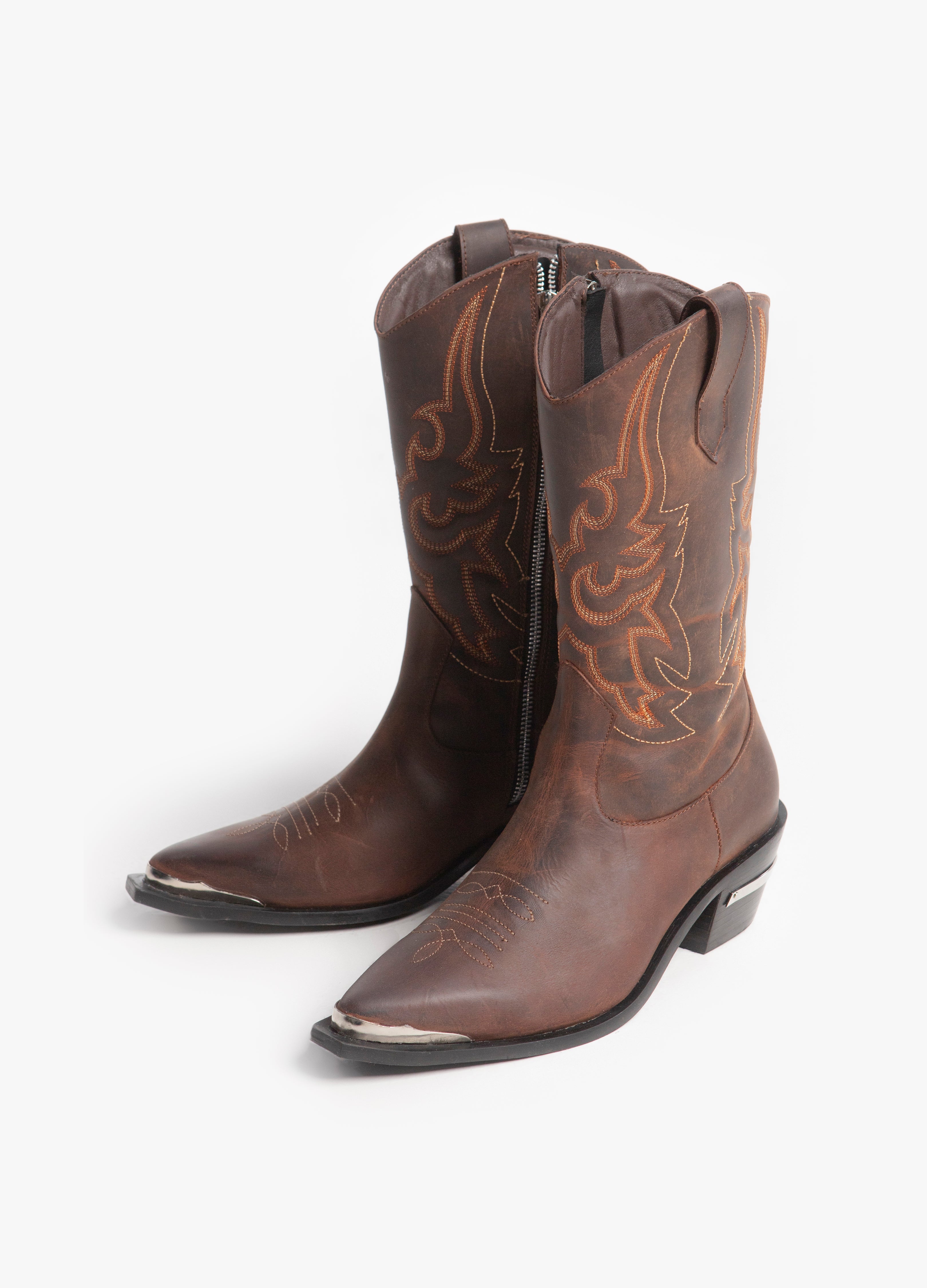 Bota vaquera de tubo alto bordado en piel de res marrón, con cierre lateral plateado, tacón cubano y placas metálicas en tacón y punta