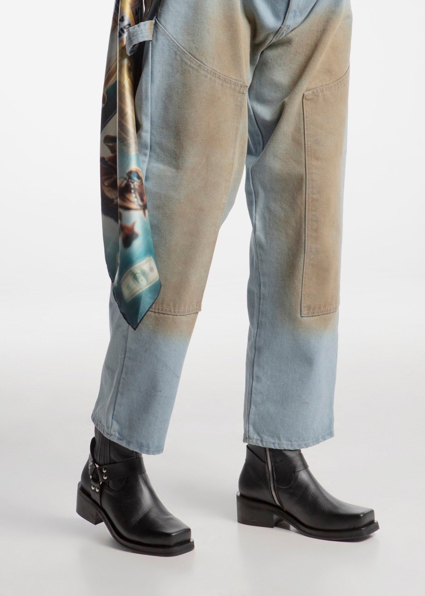 Botín de trompa de puerco fabricado en piel color negro con arnes y elástico tablilado