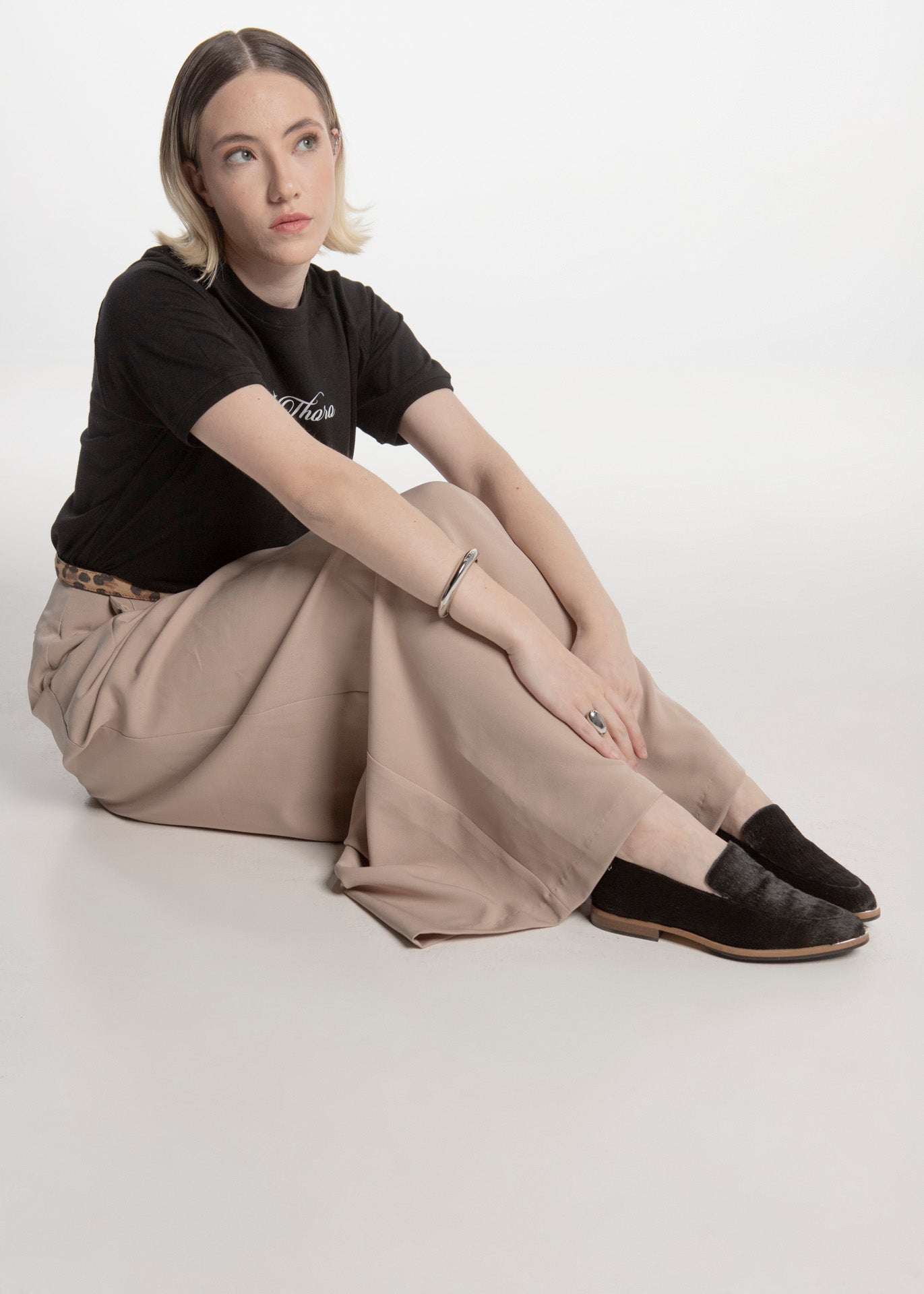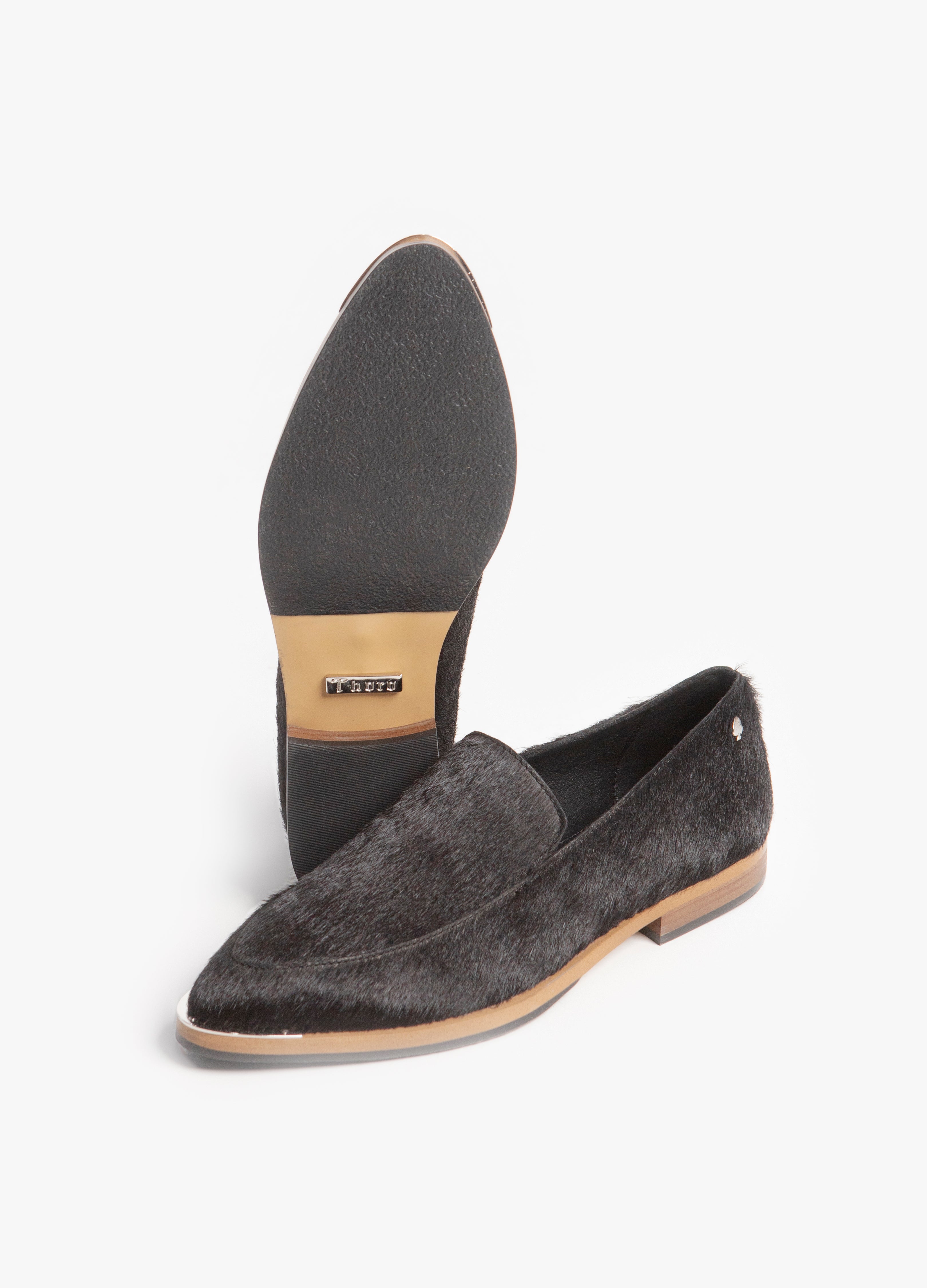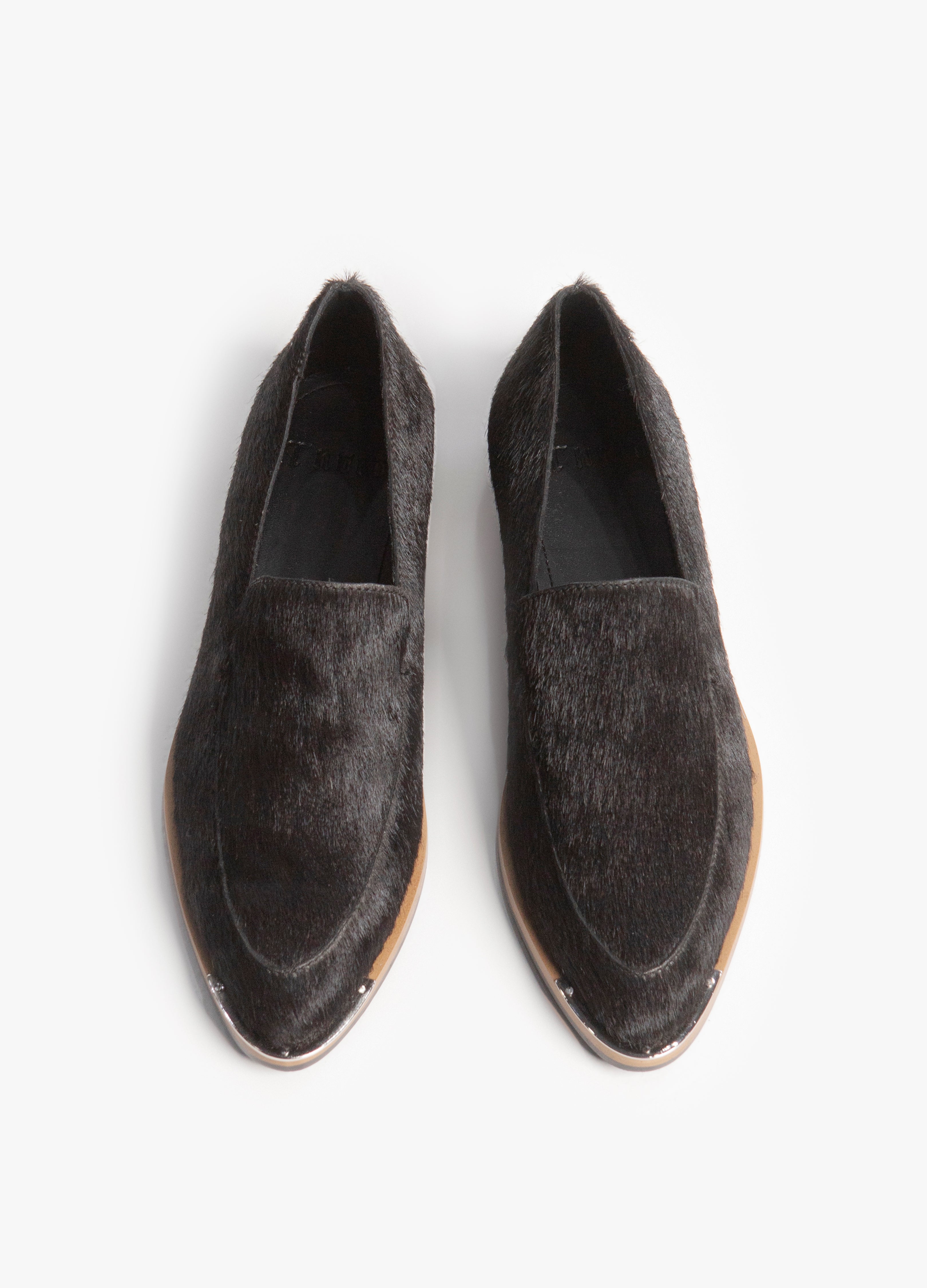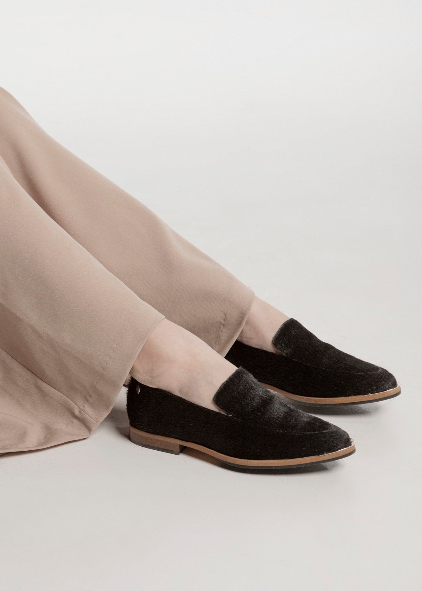 El Bella Salvaje es un Flat elegante que fusiona la comodidad con un toque exótico y lujoso. Está confeccionado con piel de pelaje 100% natural en un tono Negro, que le da una textura inigualable y muy distintiva. Su diseño de punta afilada es sofisticado y se complementa con una suela delgada y elegante, ideal para quienes buscan una silueta estilizada