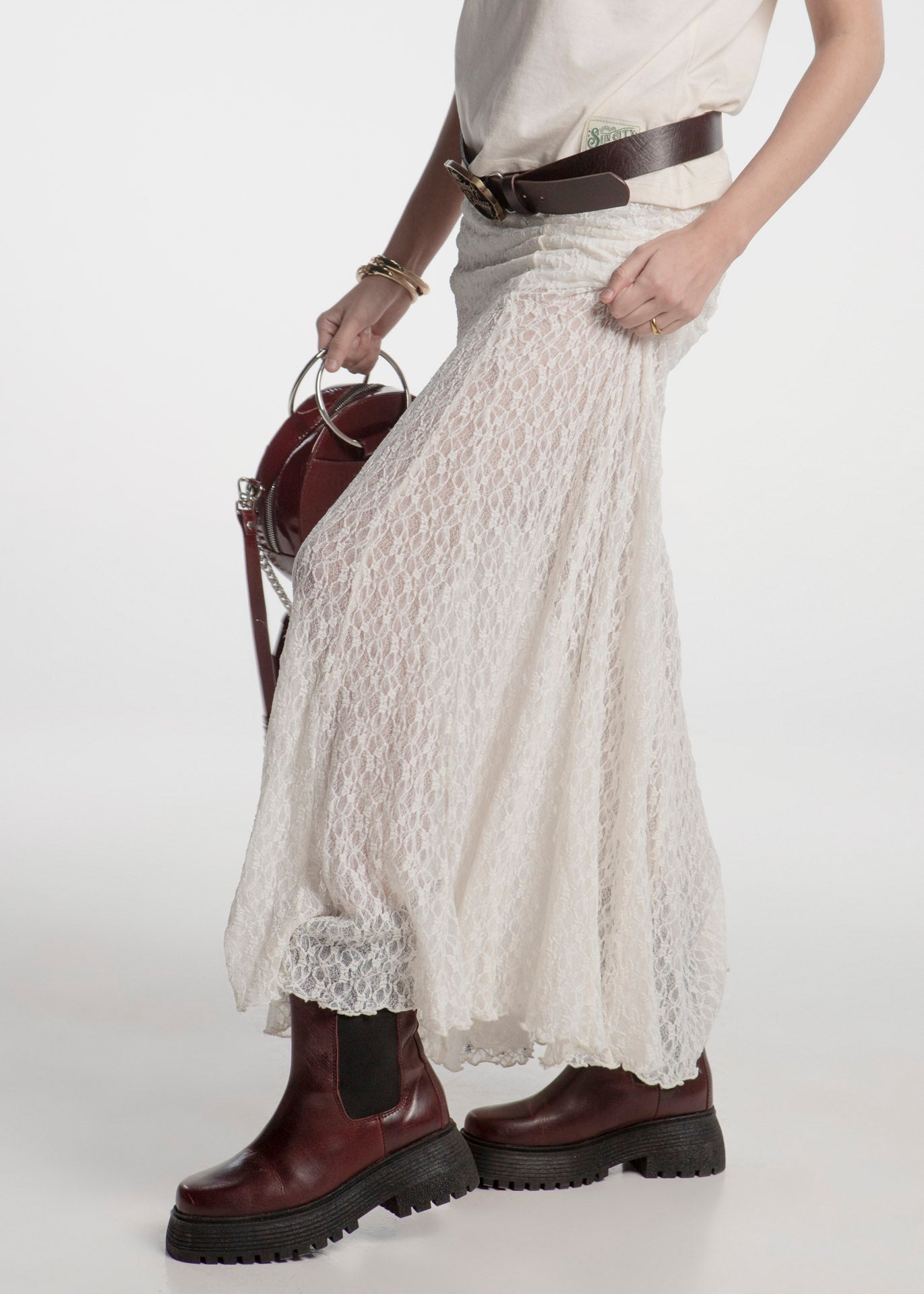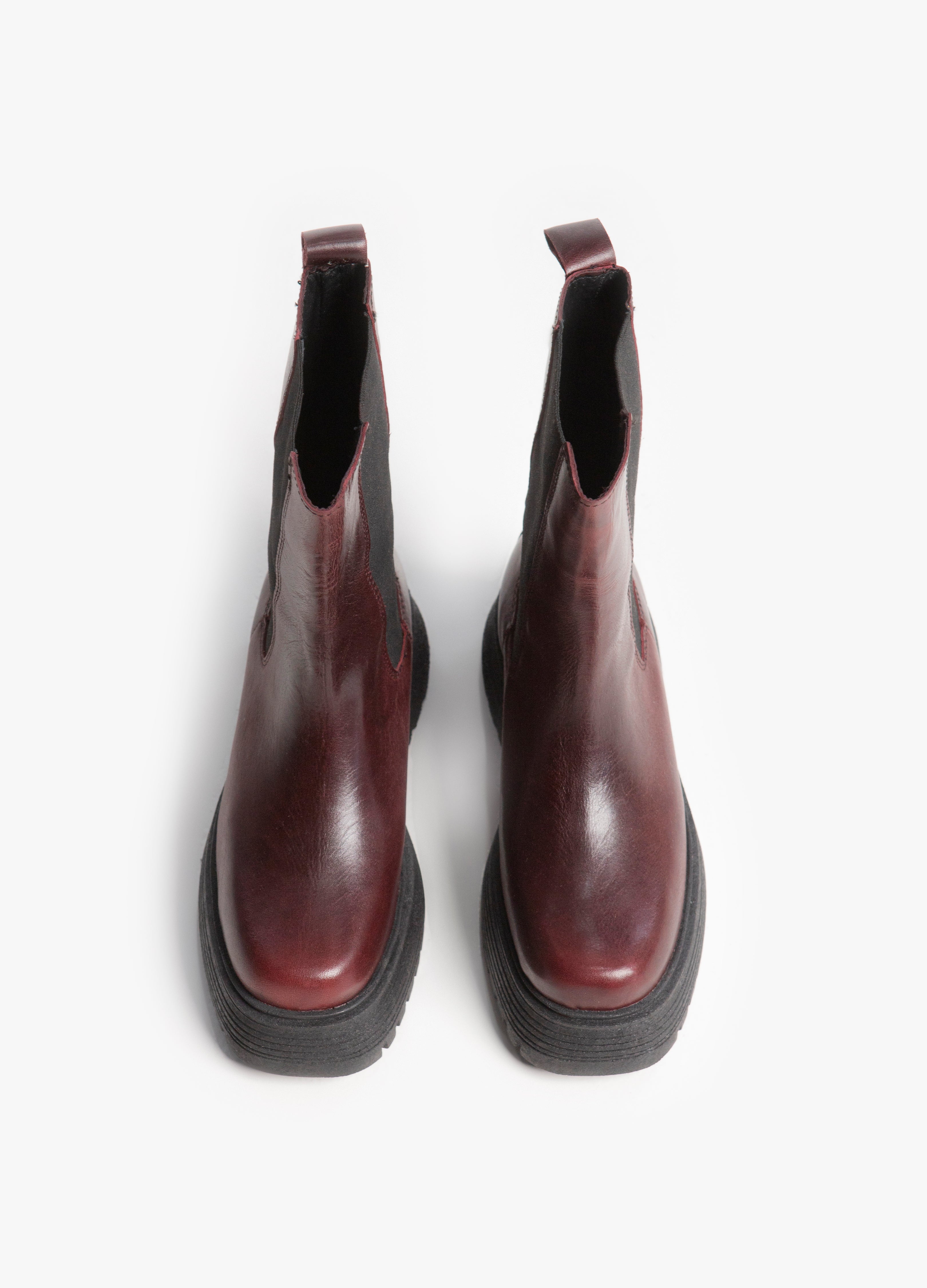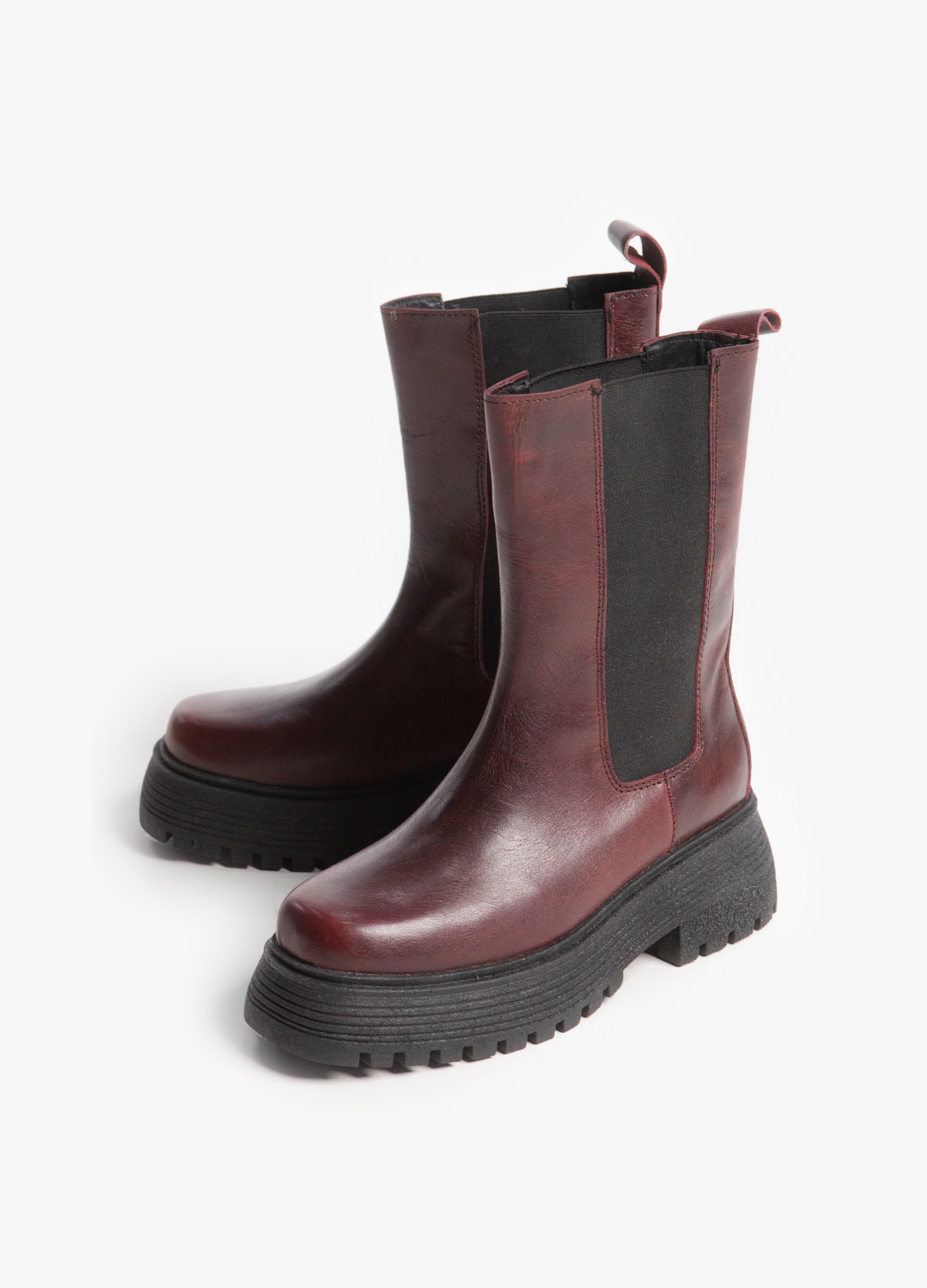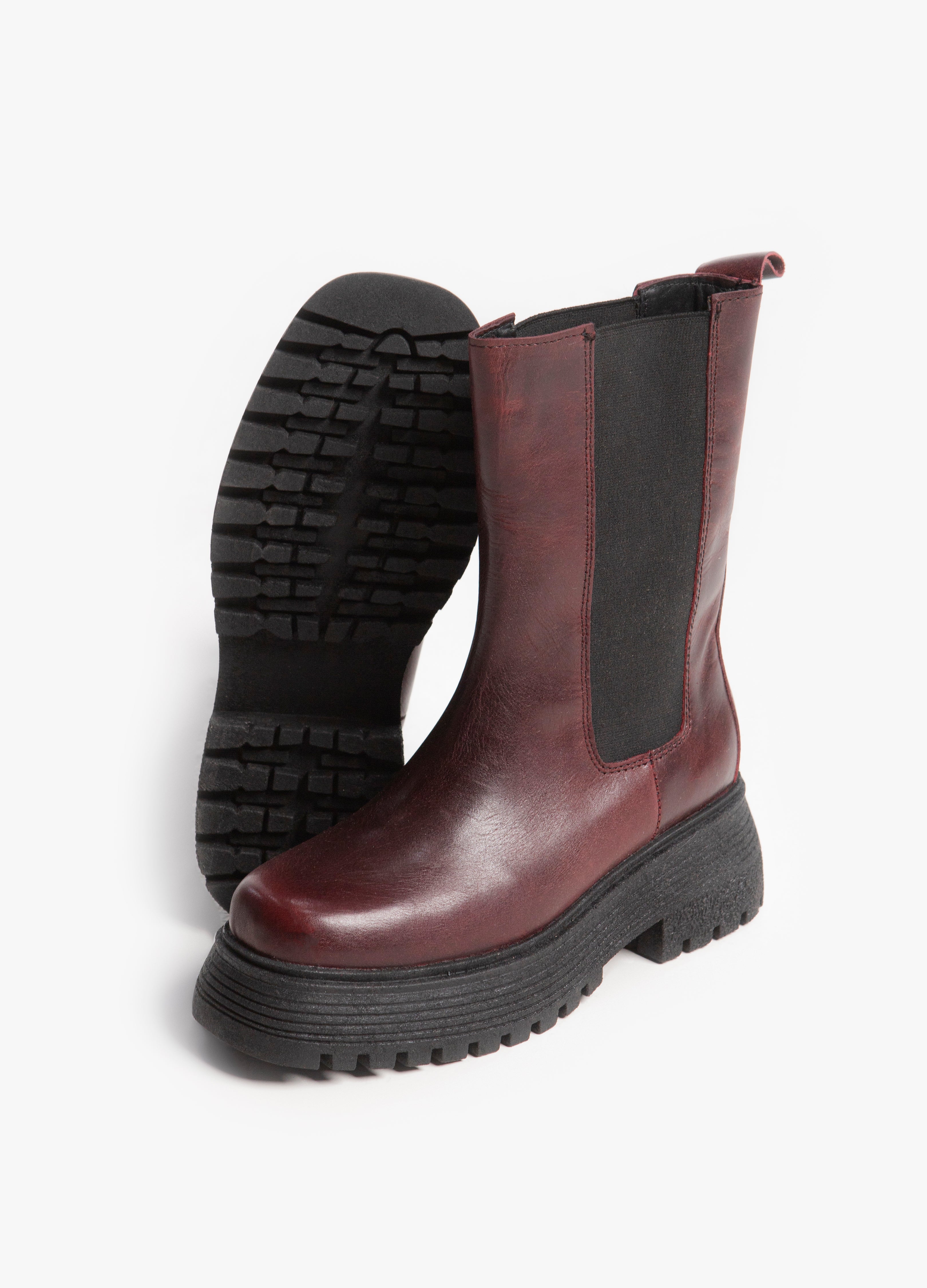 El botín MOB es una pieza que transmite una presencia innegable con su diseño robusto. Está confeccionado en piel color vino (burgundy) de caña media, con un acabado pulido que contrasta con su estilo utilitario. El diseño clásico Chelsea se complementa con una suela track negra, gruesa y con tracción profunda, que le da una base sólida y cómoda.