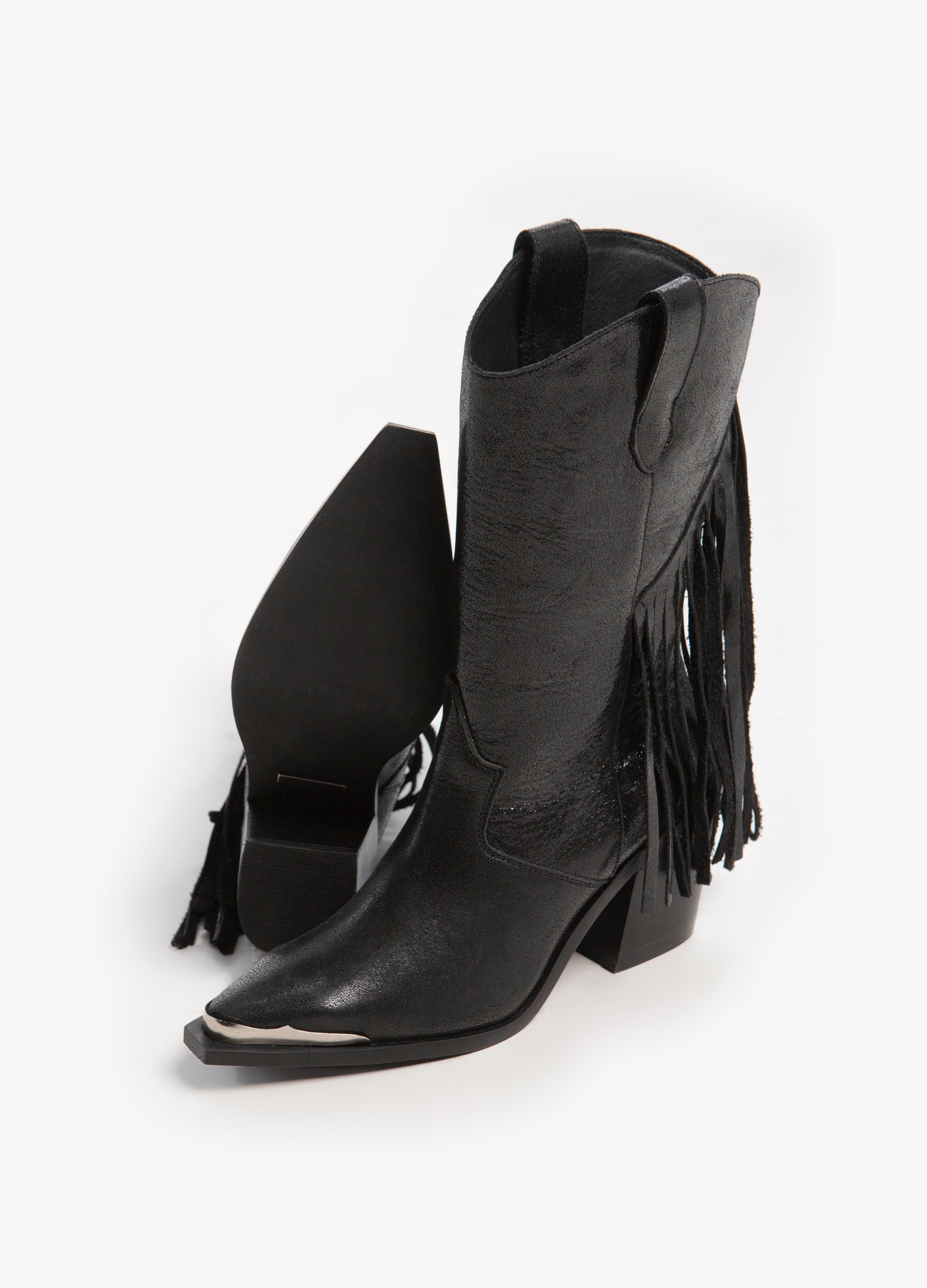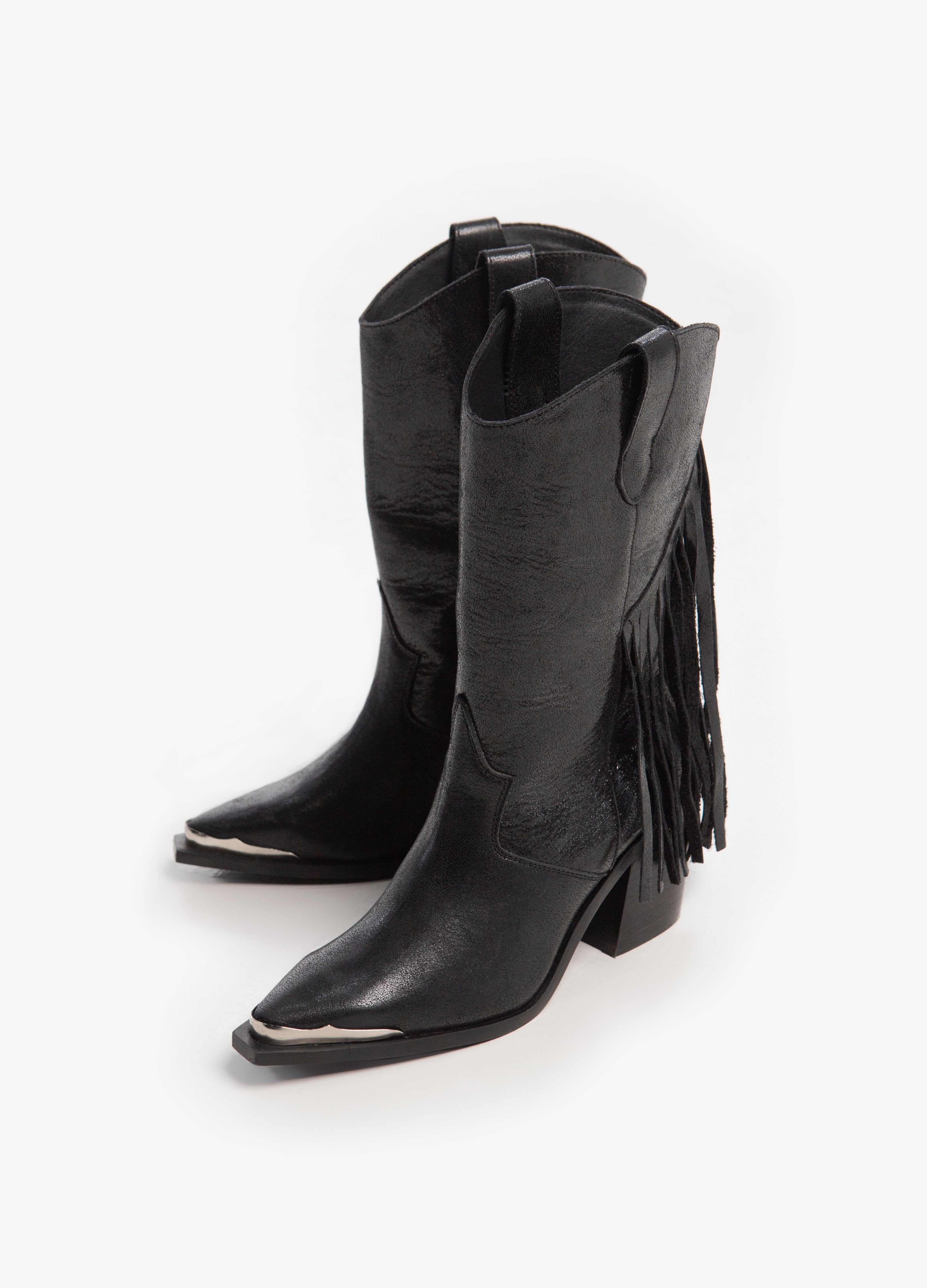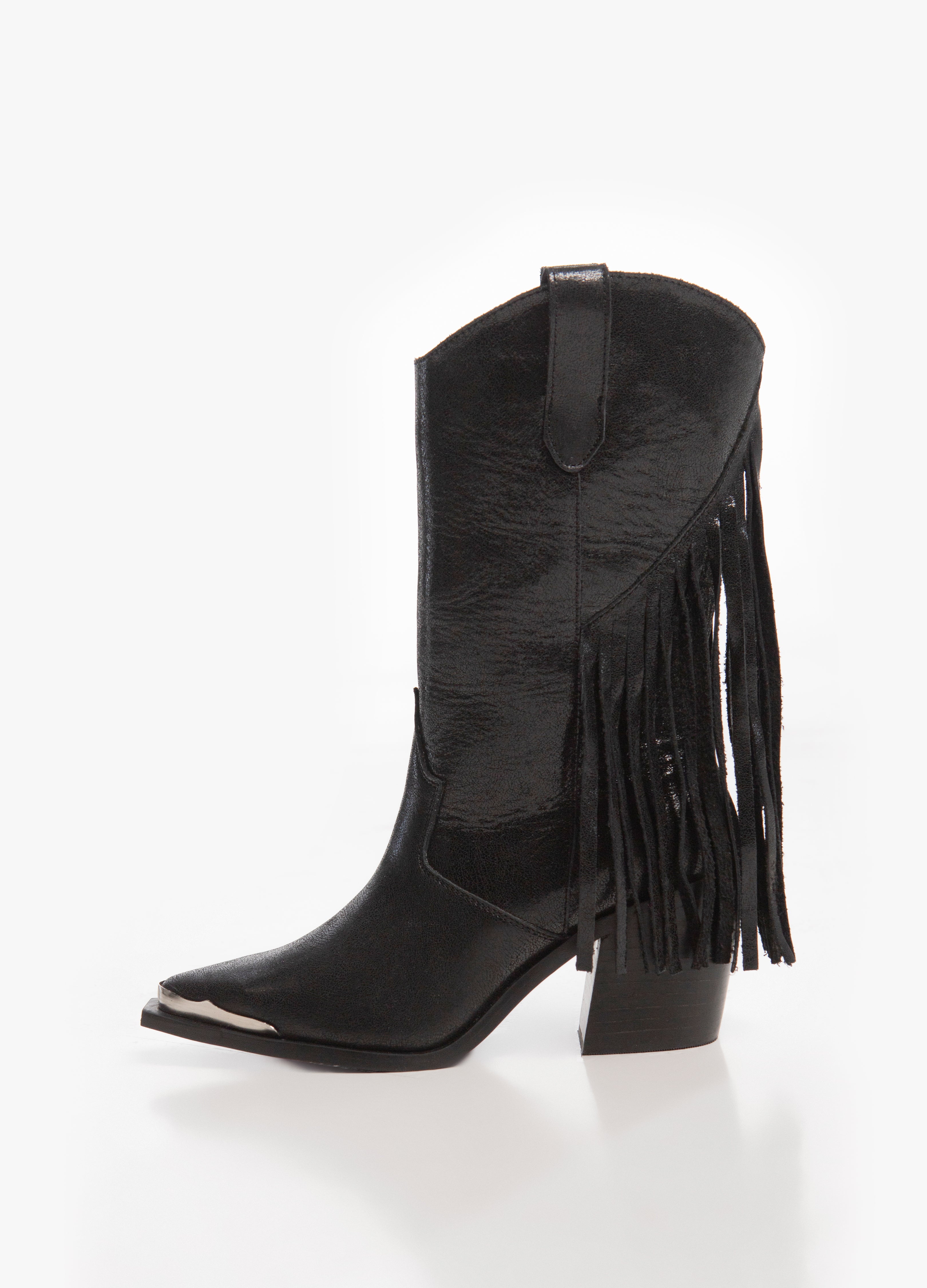 Bota vaquera (de tubo alto) fabricada en piel de res acabado glaseado color negro, tacón cubano, punta metálica y unas características barbas en la parte trasera.