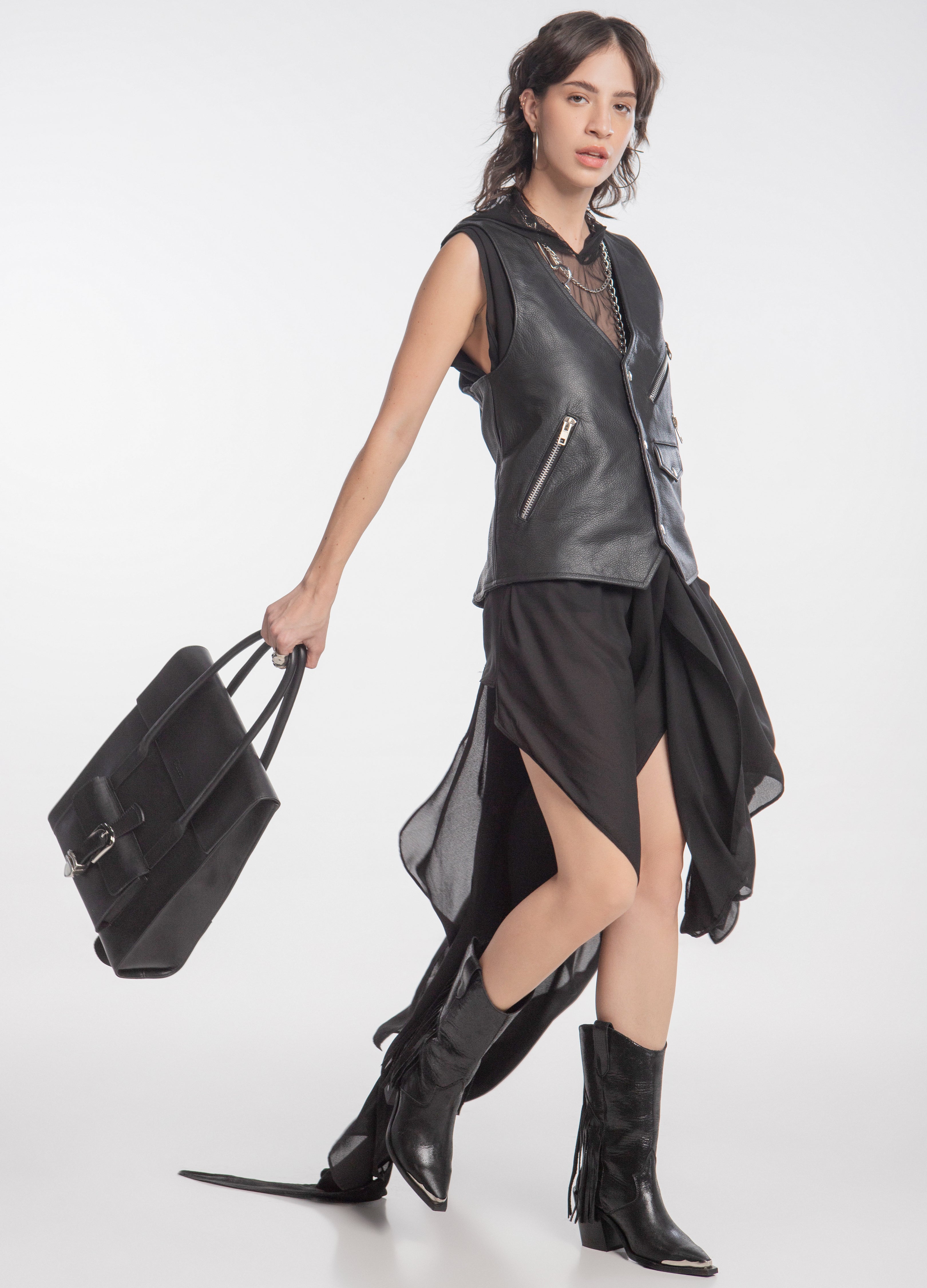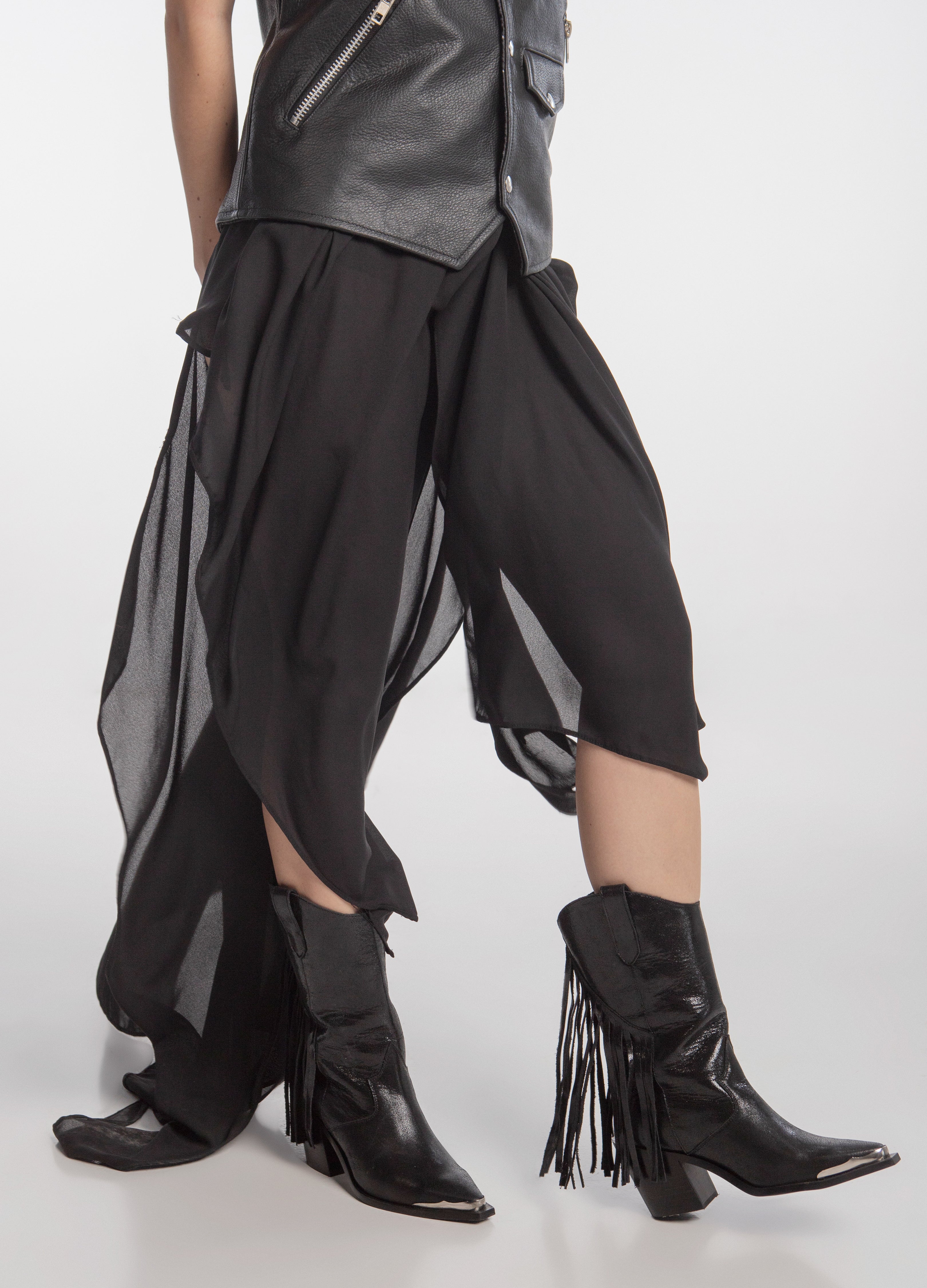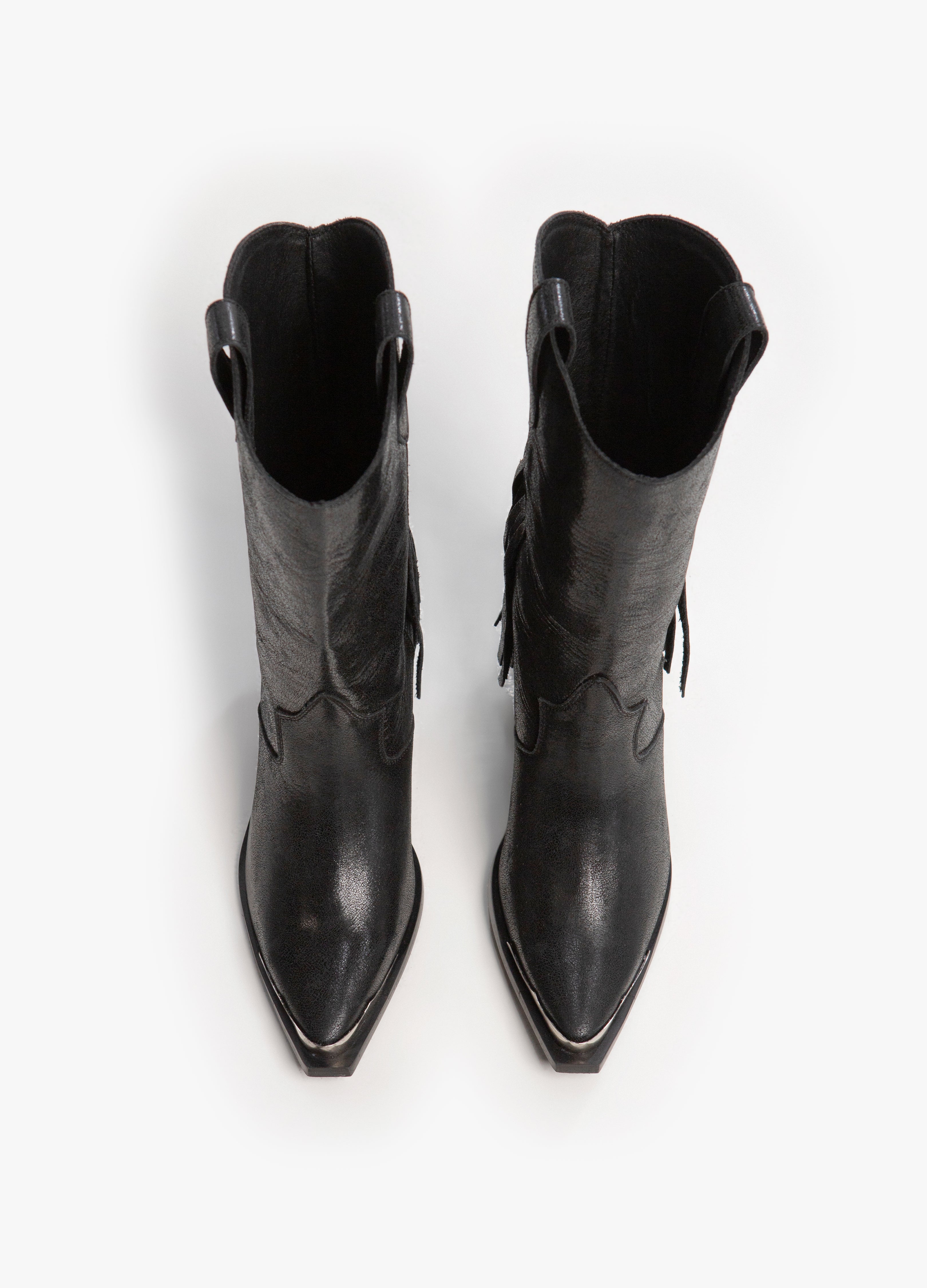 Bota vaquera (de tubo alto) fabricada en piel de res acabado glaseado color negro, tacón cubano, punta metálica y unas características barbas en la parte trasera.