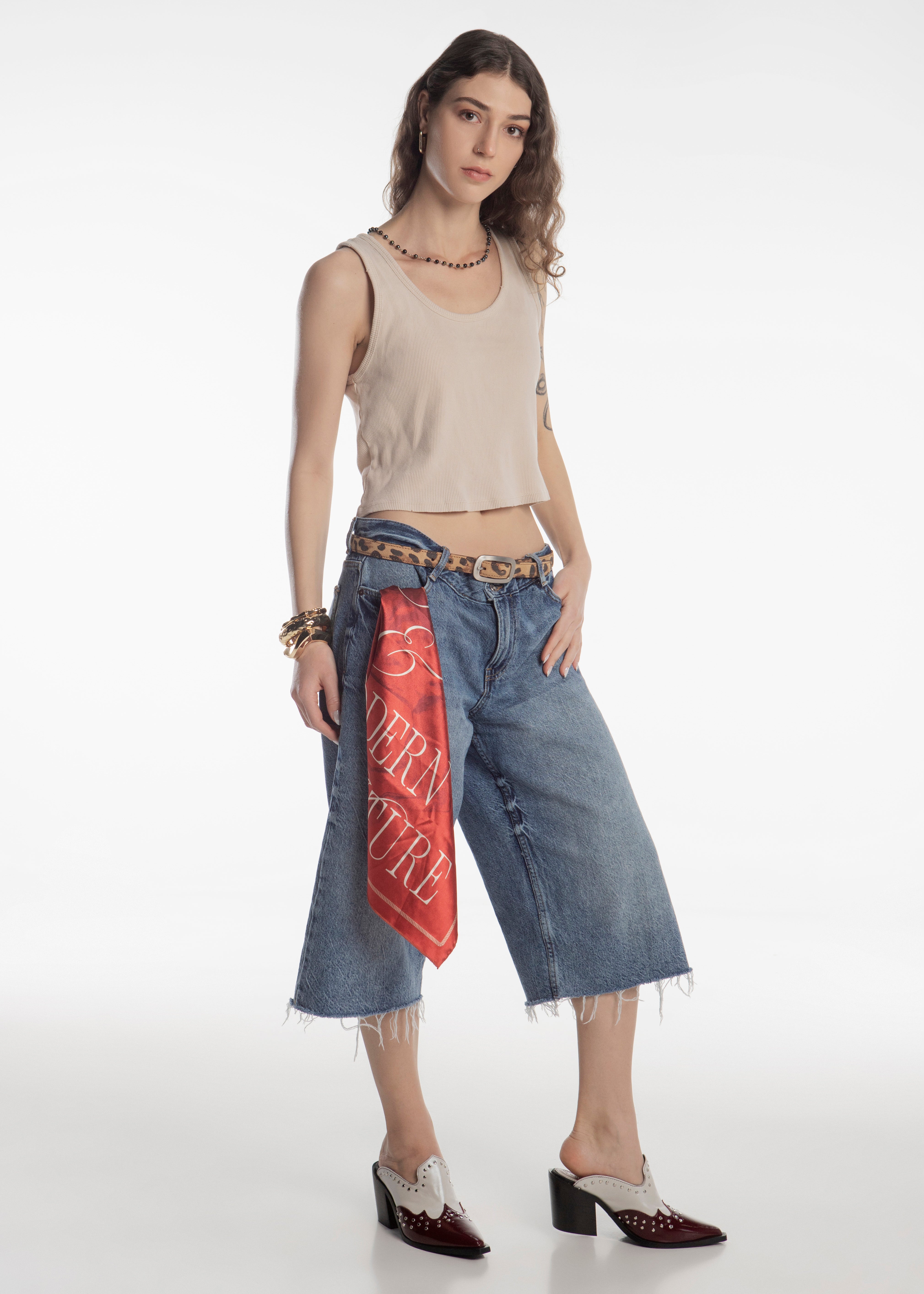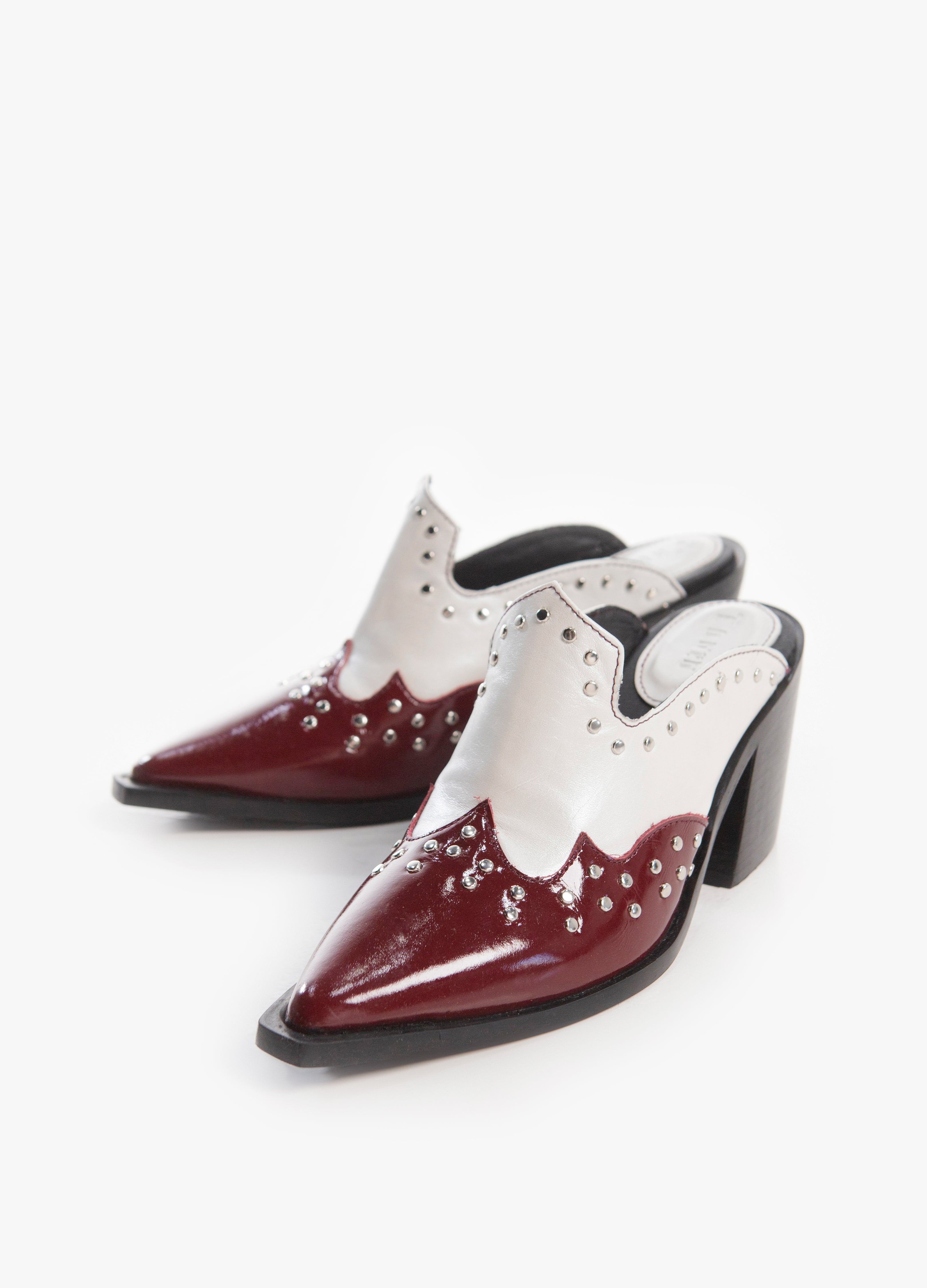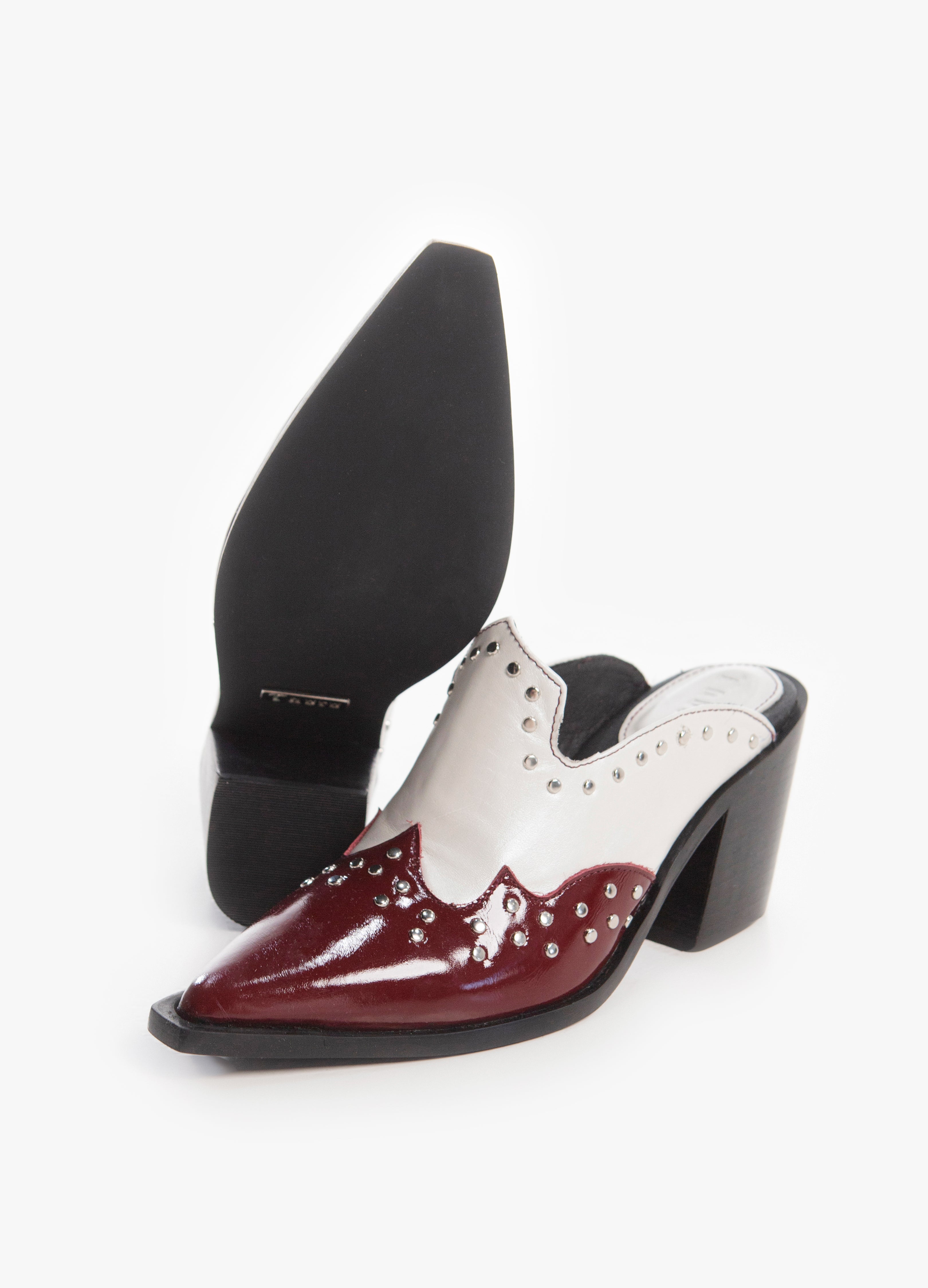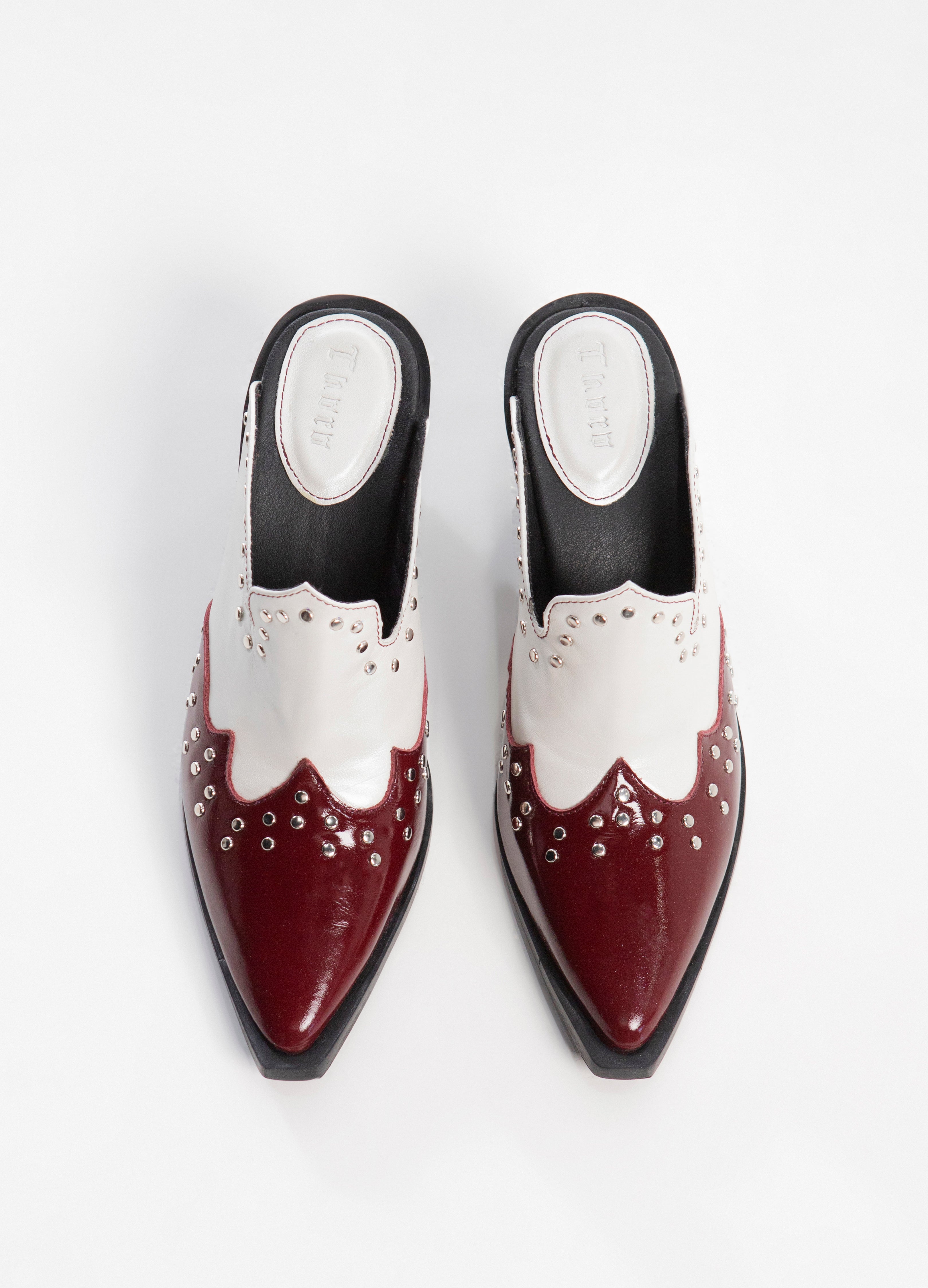 Suecos suajados con estilo de bota vaquera, a dos tonos de piel Vino y Hueso adornado con estoperoles en los filos