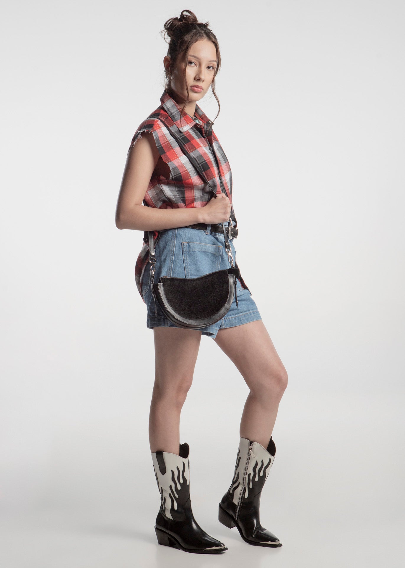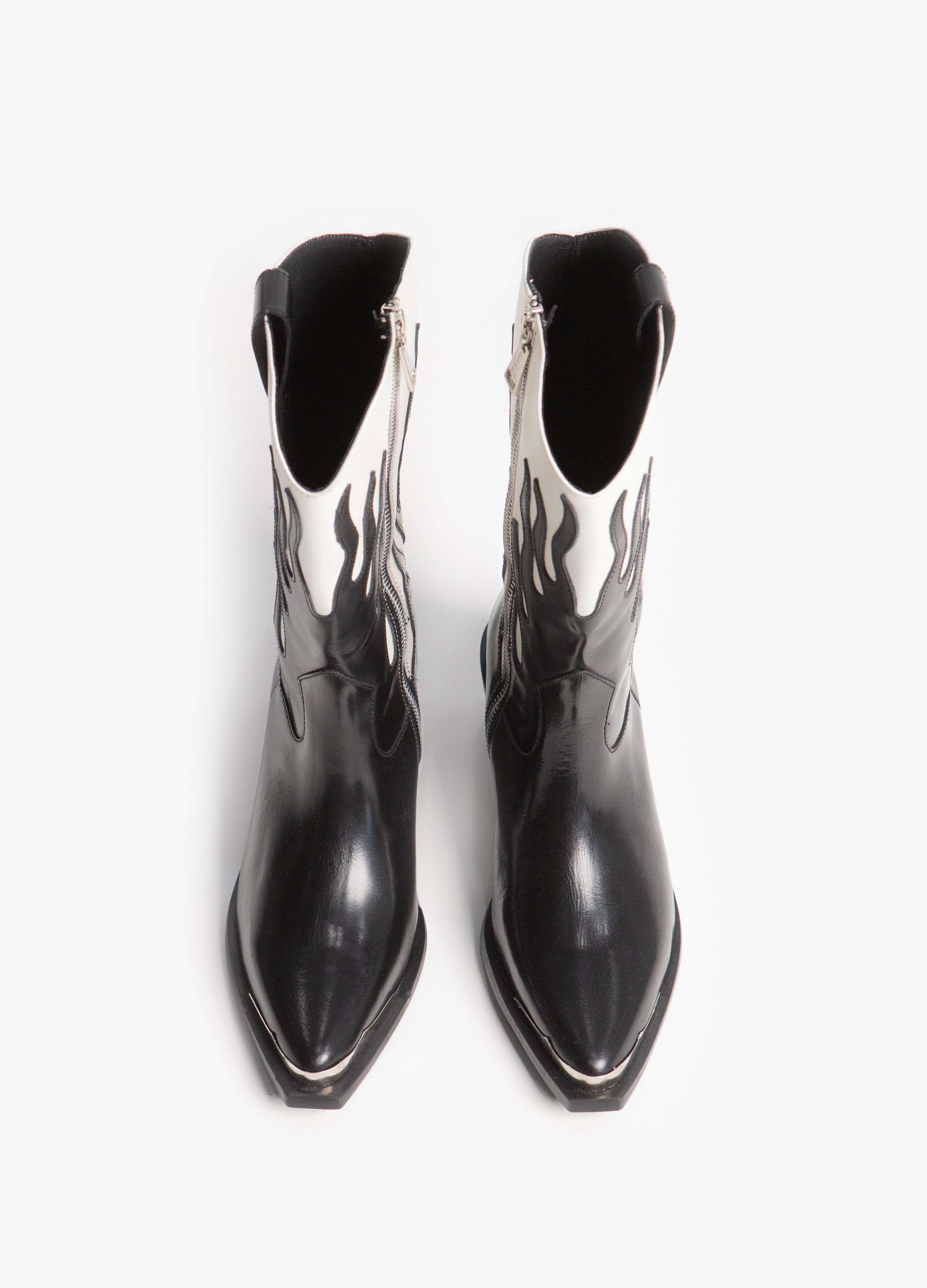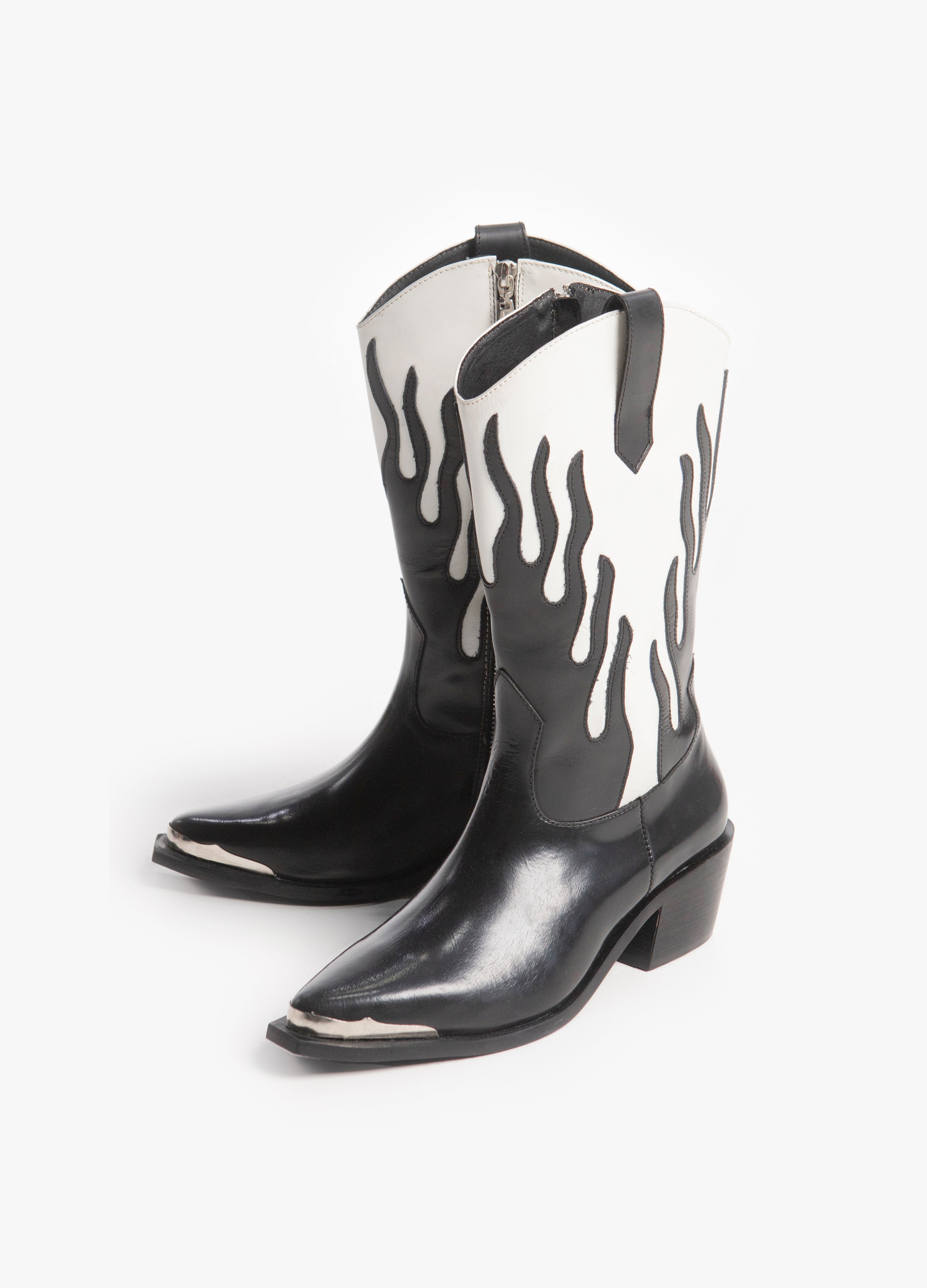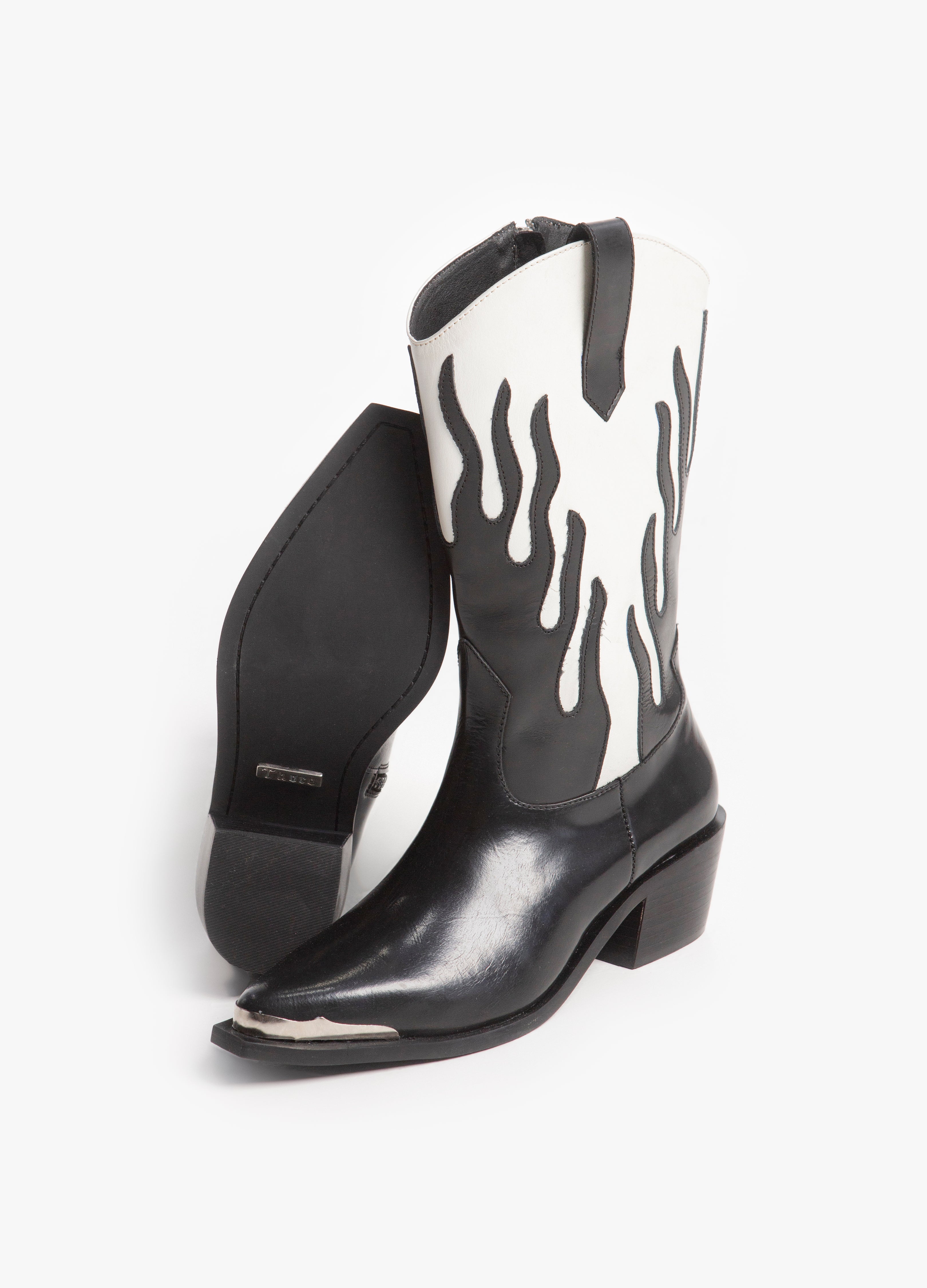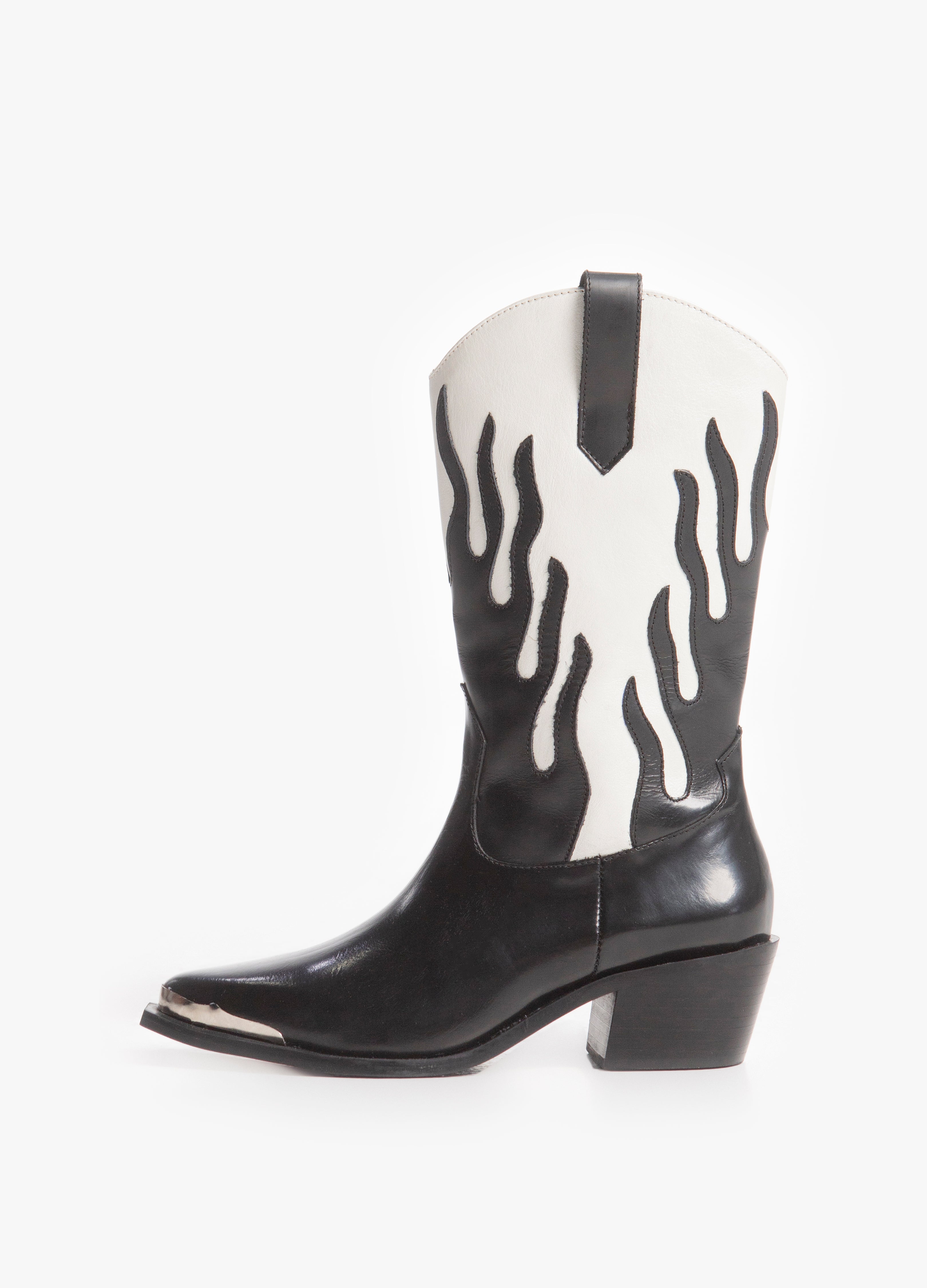 Bota vaquera de tubo alto en piel a combinación negro y hueso, con diseño de llamas en acabado brillante y tubo mate. Cierre lateral plateado, tacón cubano y punta metálica.