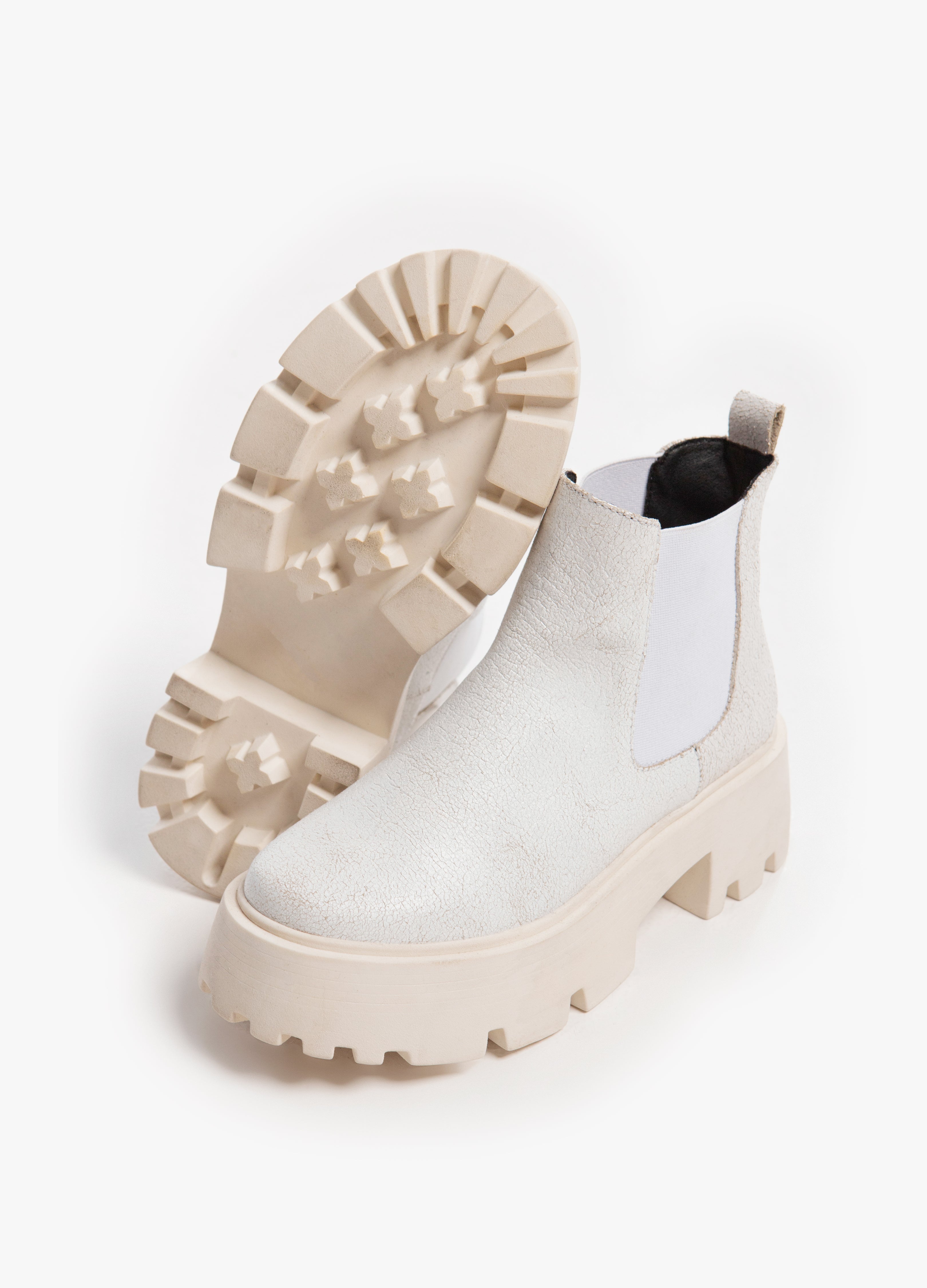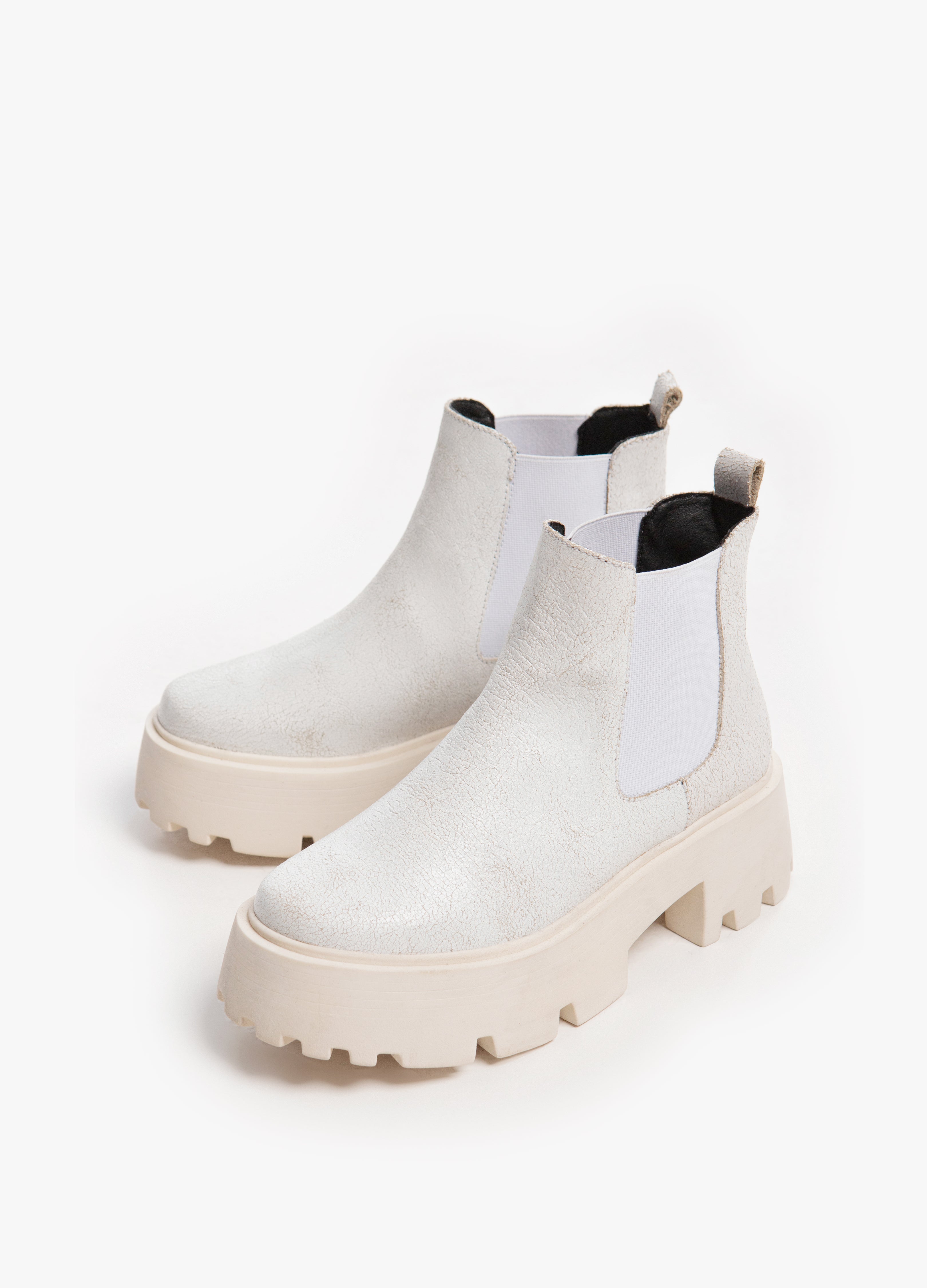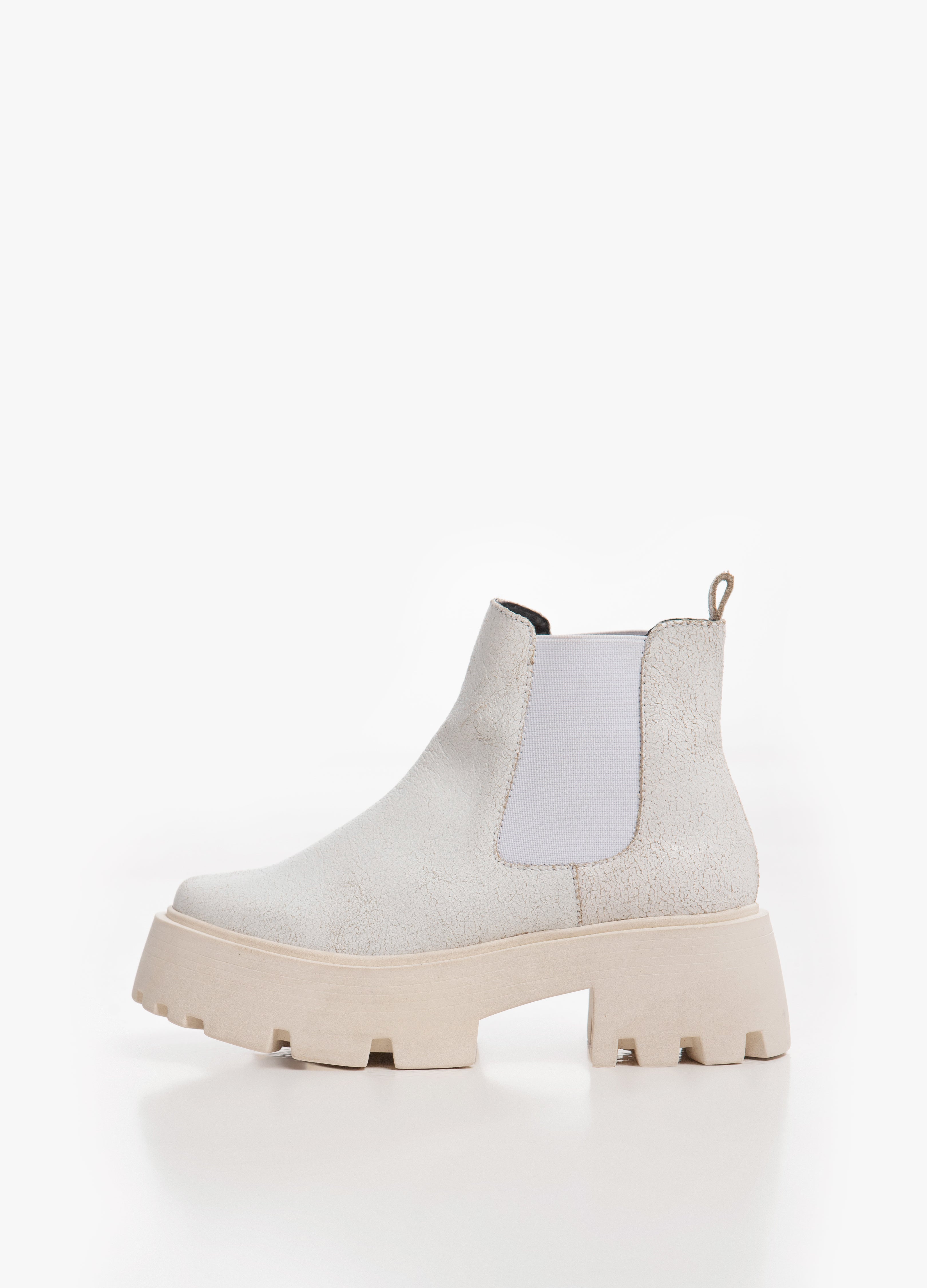 Botas (botines) chelsea fabricadas en piel de res acabado craquelado color blanco con suela gruesa y elasticos laterales.