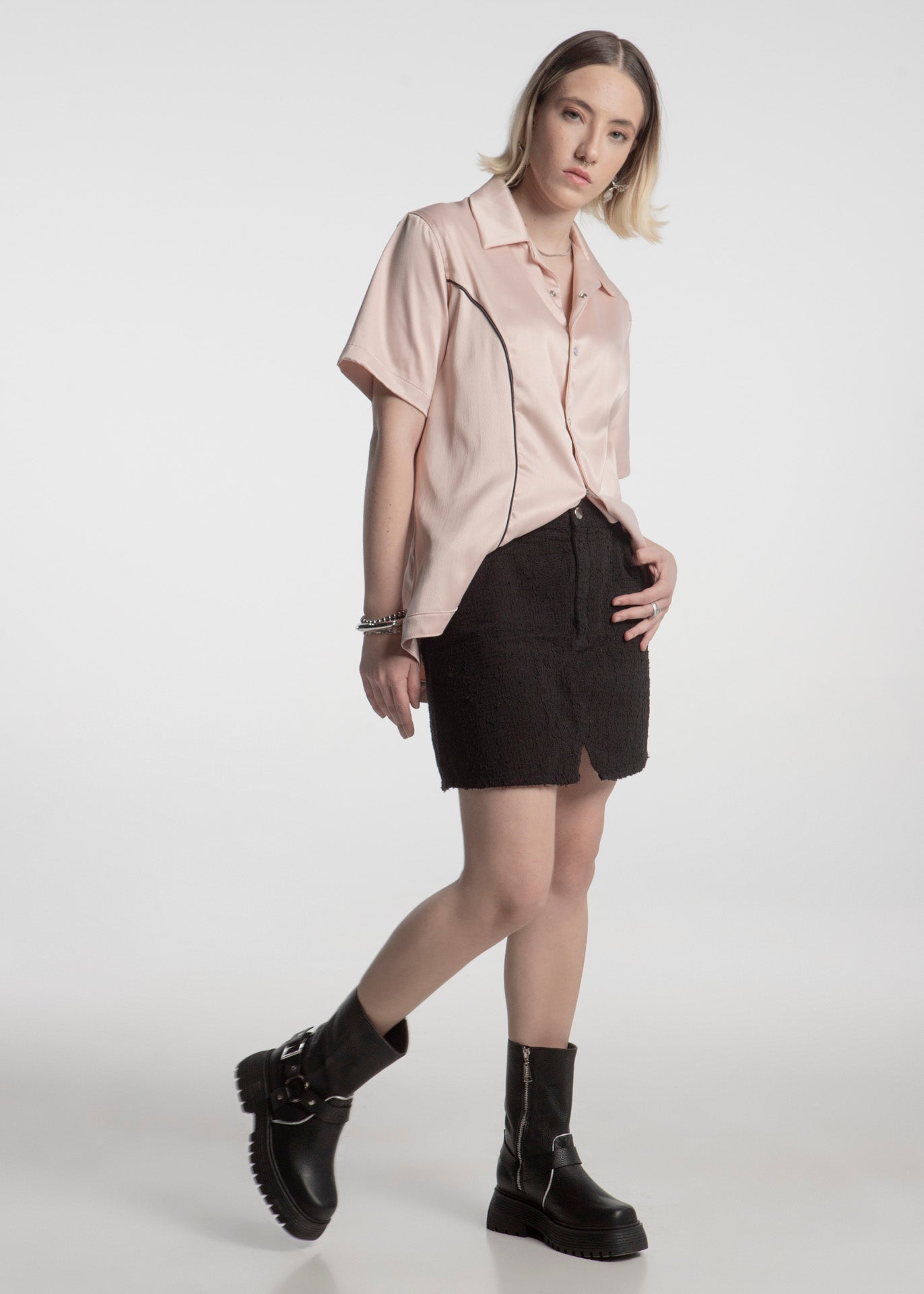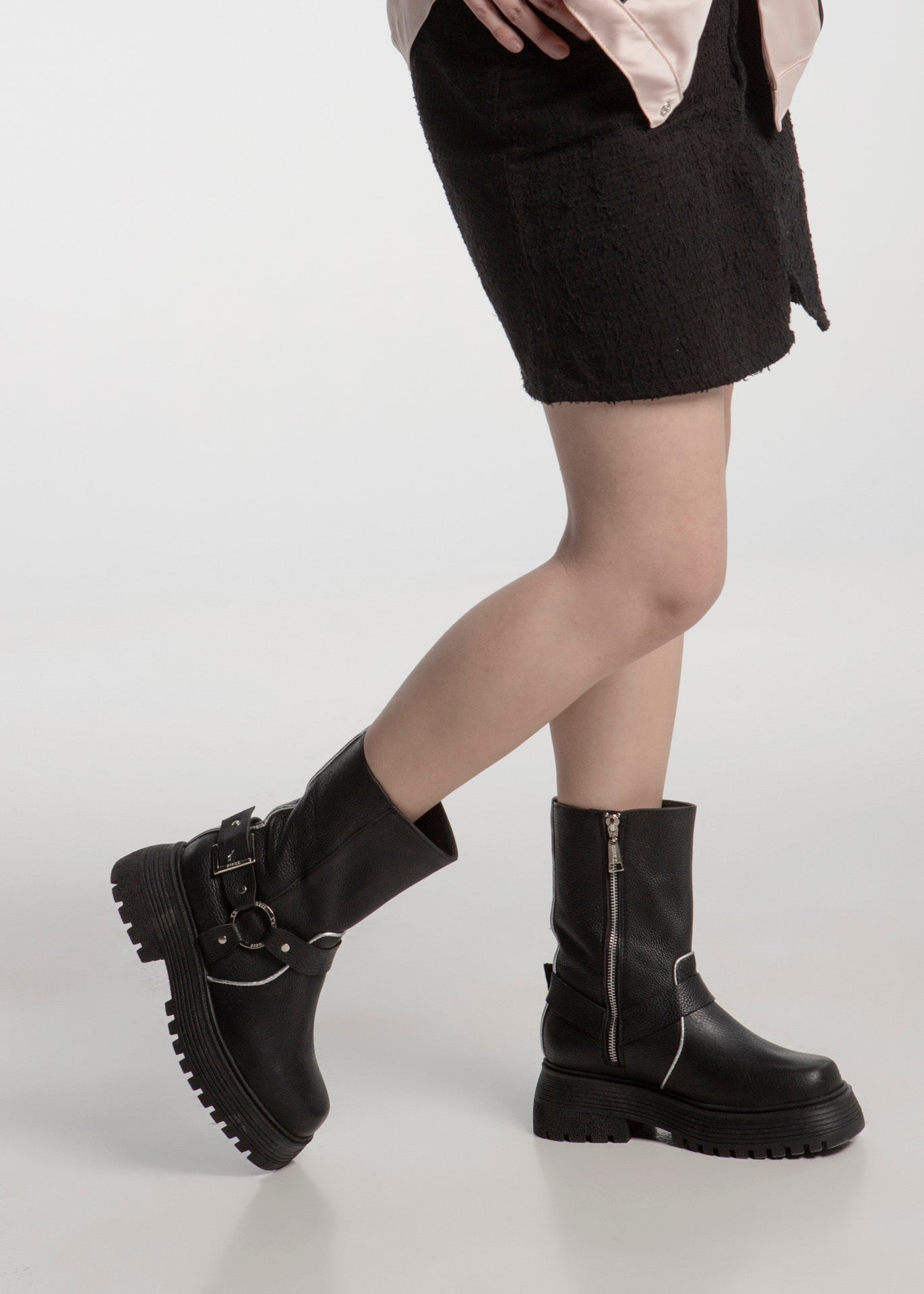Bota tipo Chelsea de suela gruesa fabricado en piel de res color negro con ribete plateado y arnés lateral