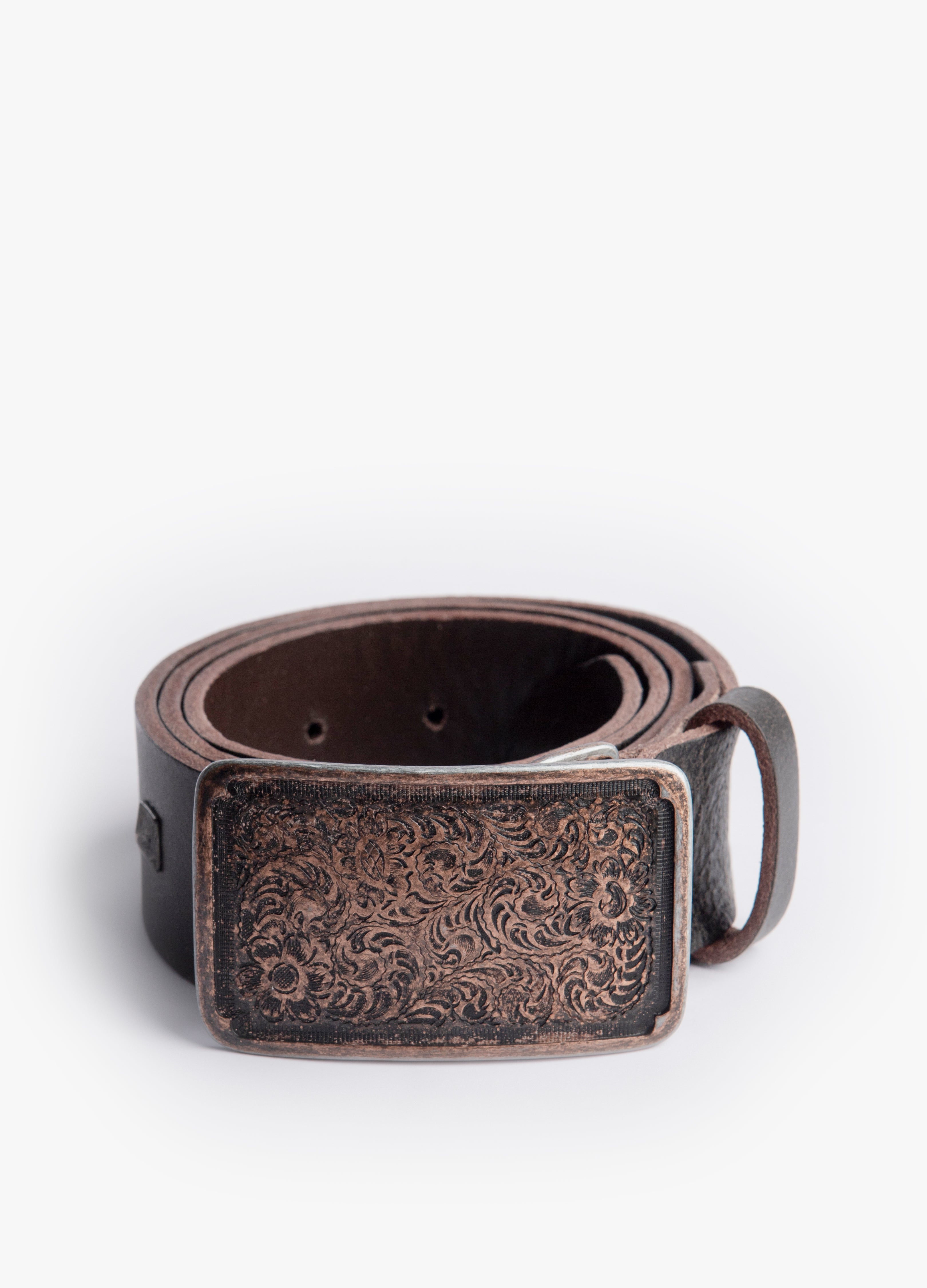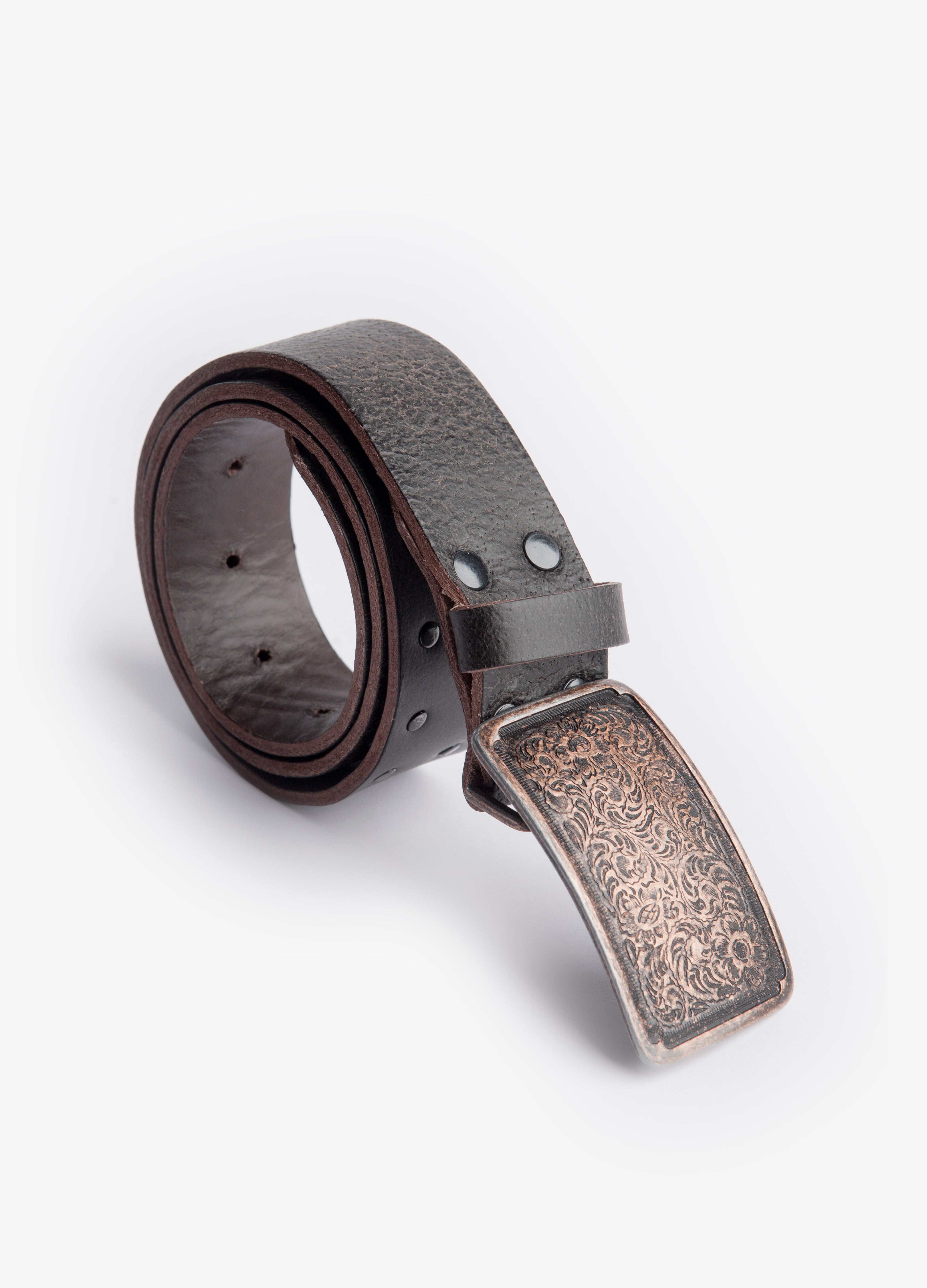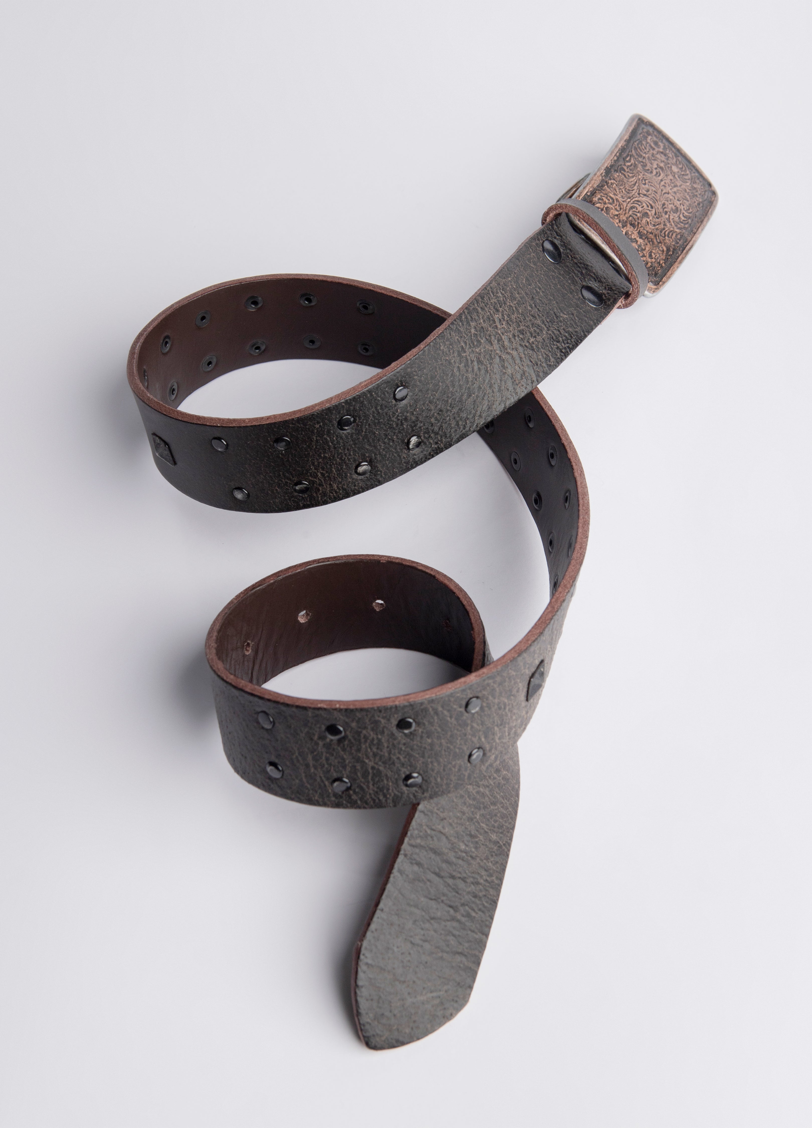 Incluye una hebilla metálica con acabado oxidado y un diseño de garigol.