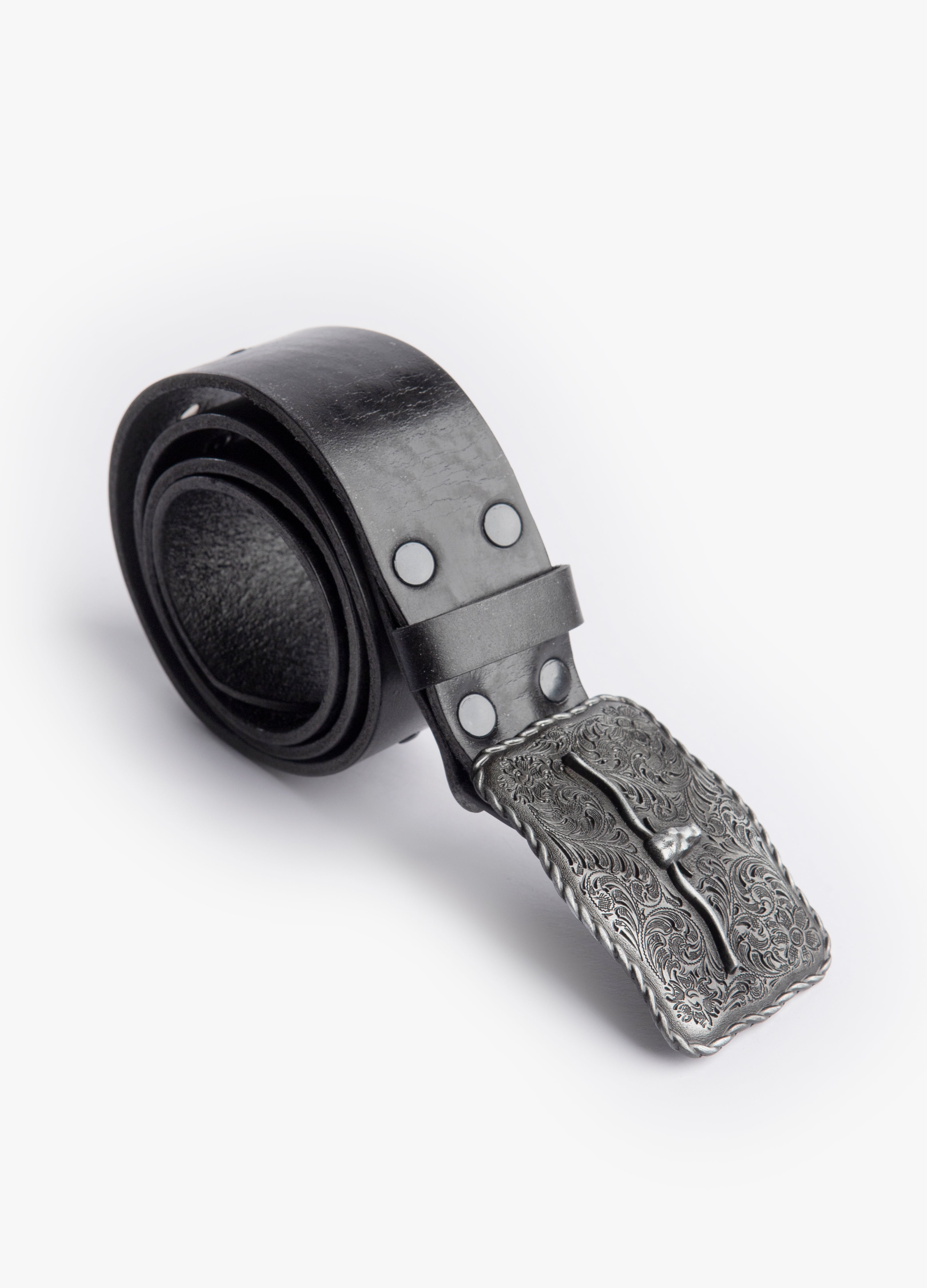 Hebilla: Hebilla rectangular de aleación metálica con acabado envejecido, toro en alto relieve y grabado ornamental en bajo relieve.