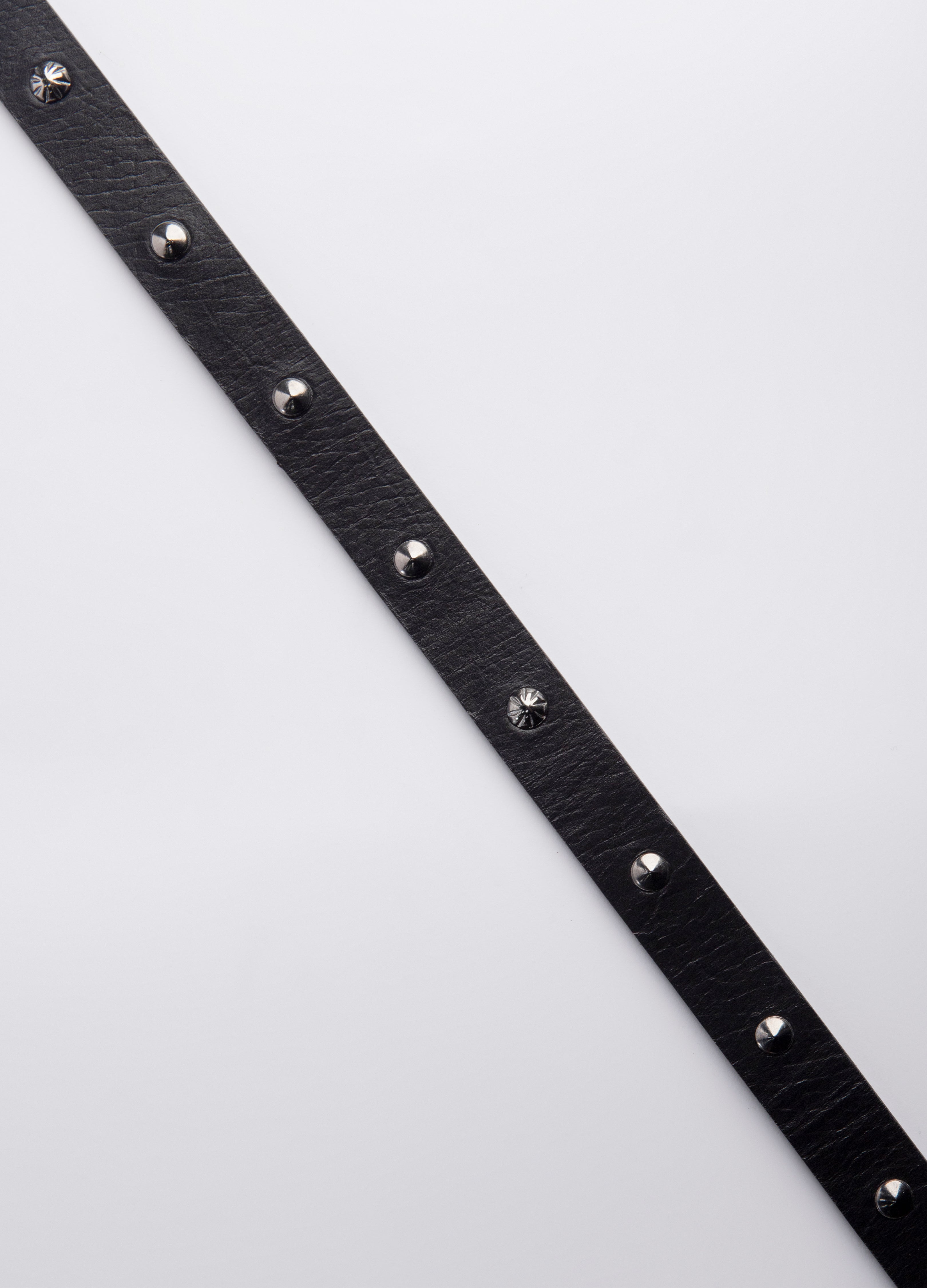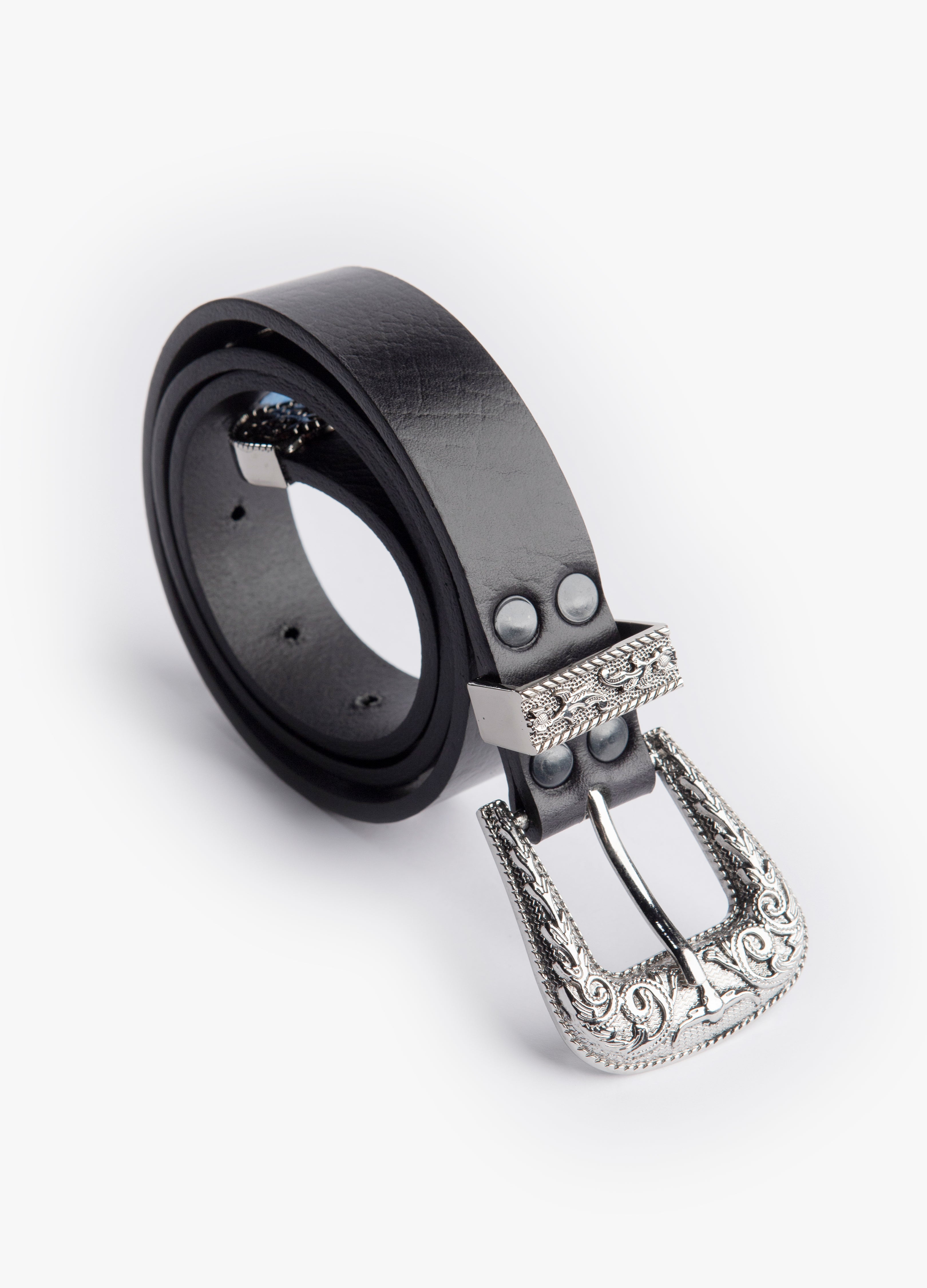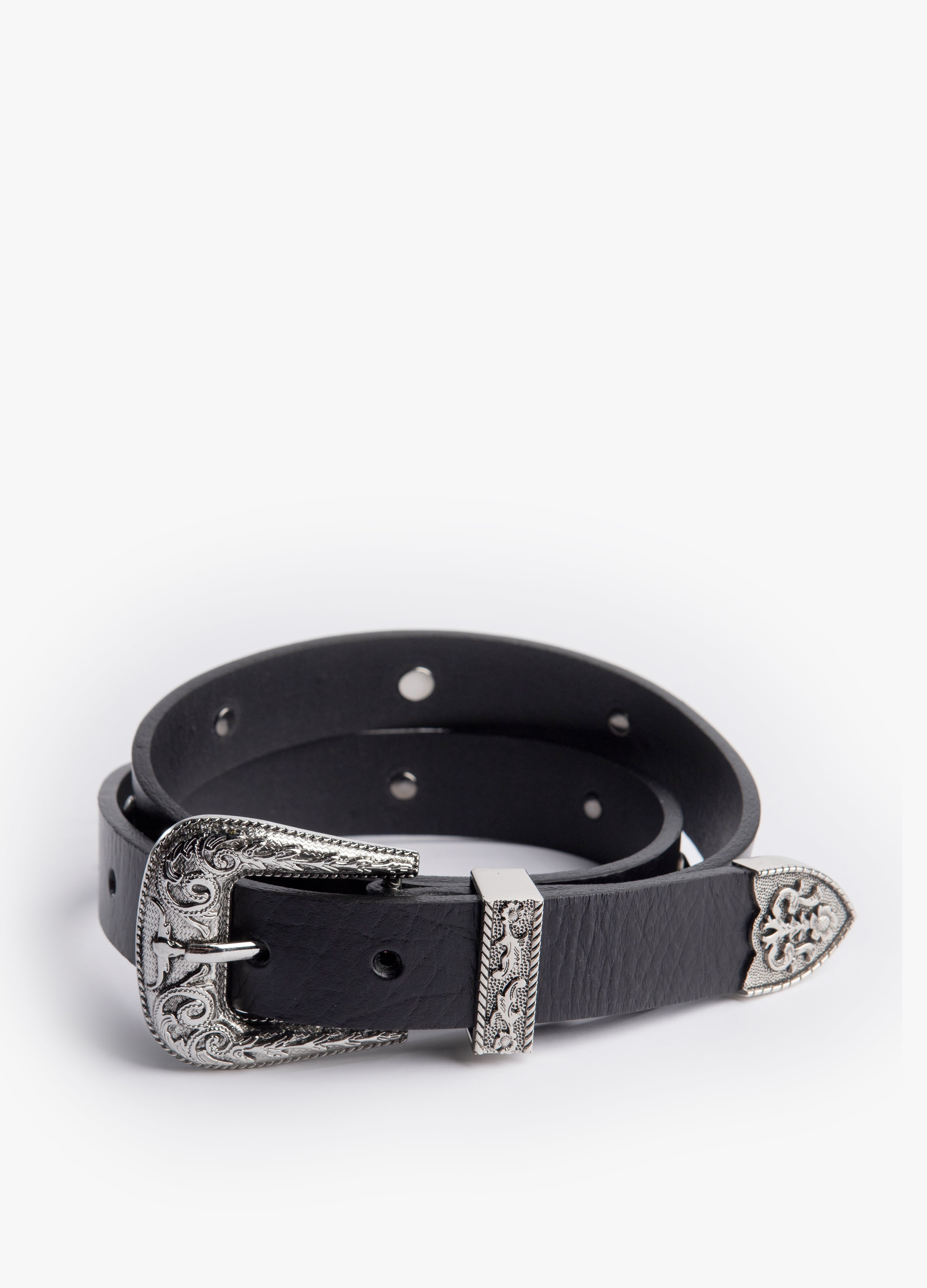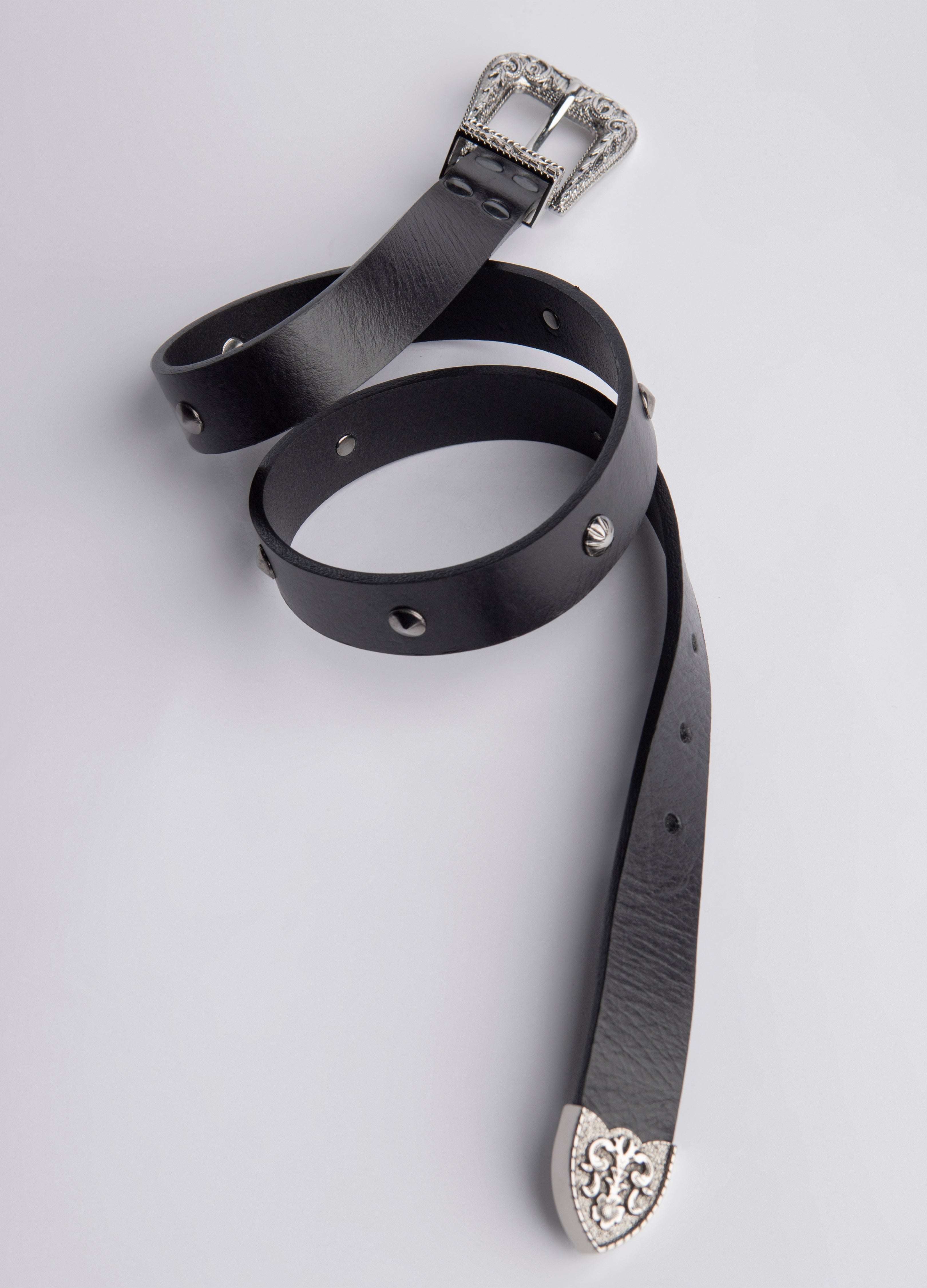 Cinturón fabricado en piel 100% vacuno de color negro, con detalles metálicos en el cuerpo y una hebilla metálica grabada con estilo cowboy.