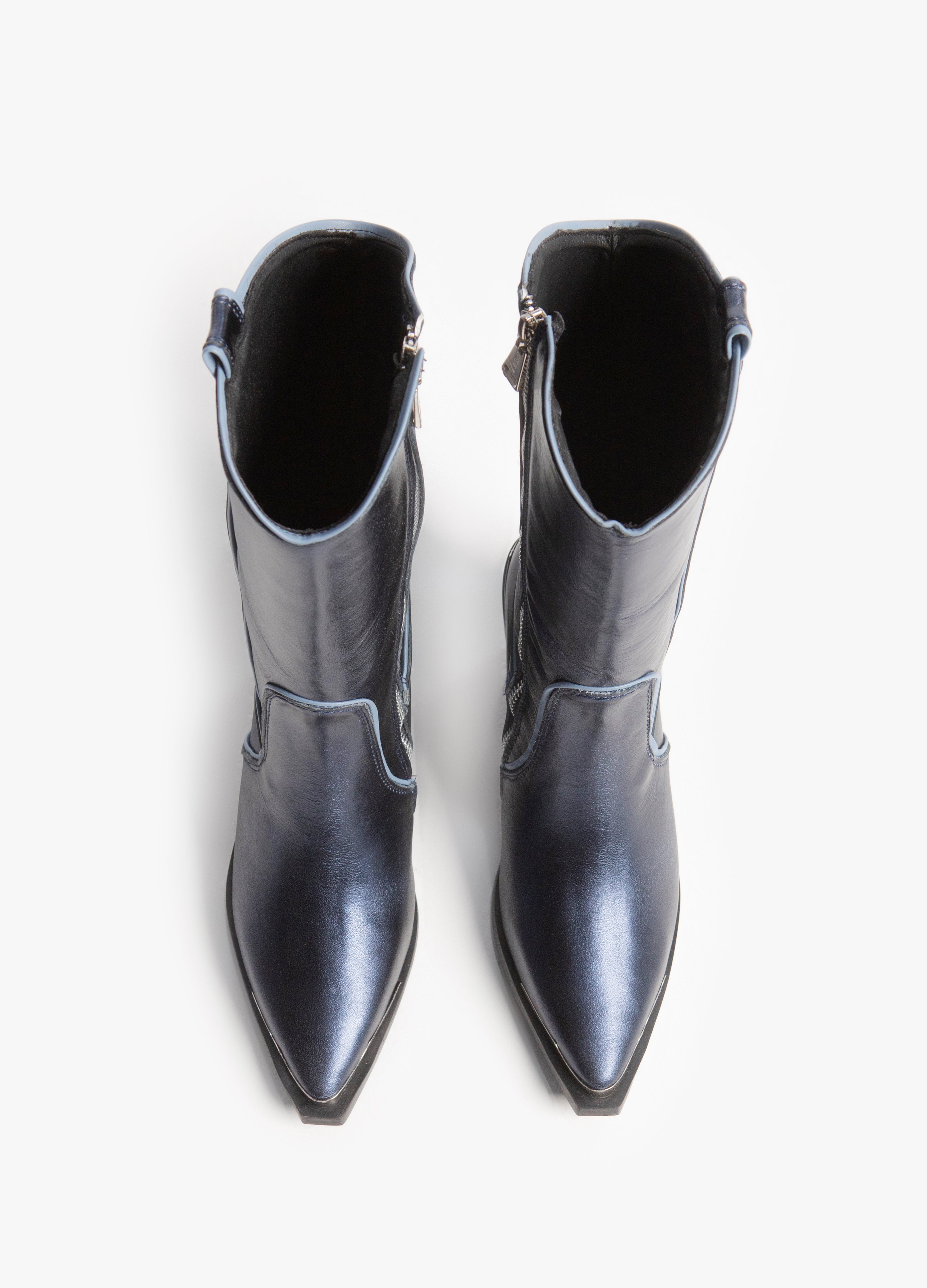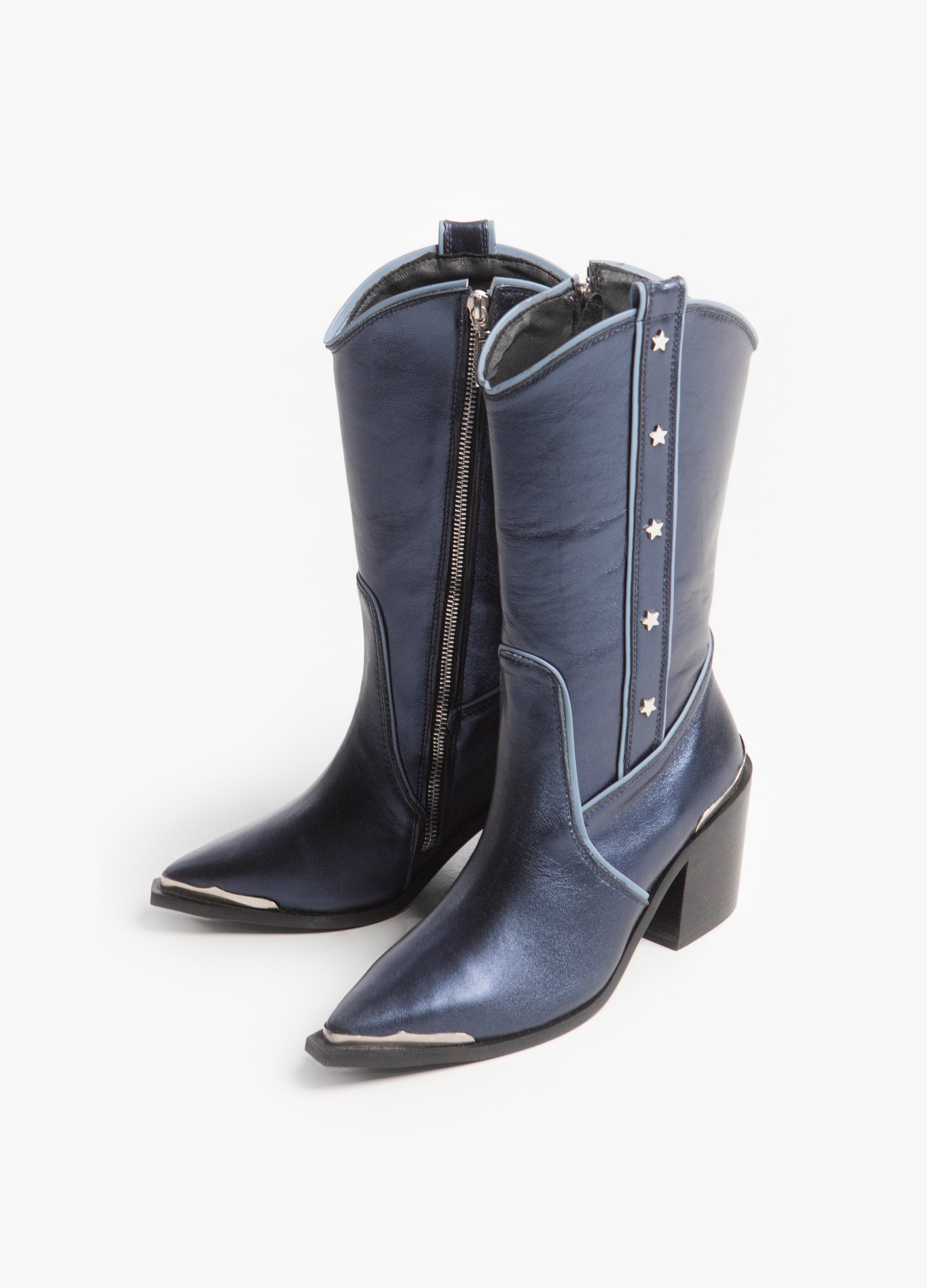 Bota vaquera (de tubo alto) fabricada en piel de res color azul acabado metálico con cierre lateral plateado, tacón cubano y punta metálica. Adornada con ribetes celestes y estrellas en el tubo.