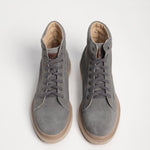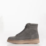 Botas en piel de res gris con acabado gamuza y suela ultraligera.