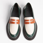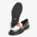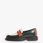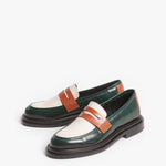 El Loafer Mirage destaca por su piel de res de alta calidad y colores vividos. Combina verde oscuro, blanco hueso, y coñac, creando un contraste llamativo. Su diseño, con correa penny, ofrece una estética elegante y distintiva.
