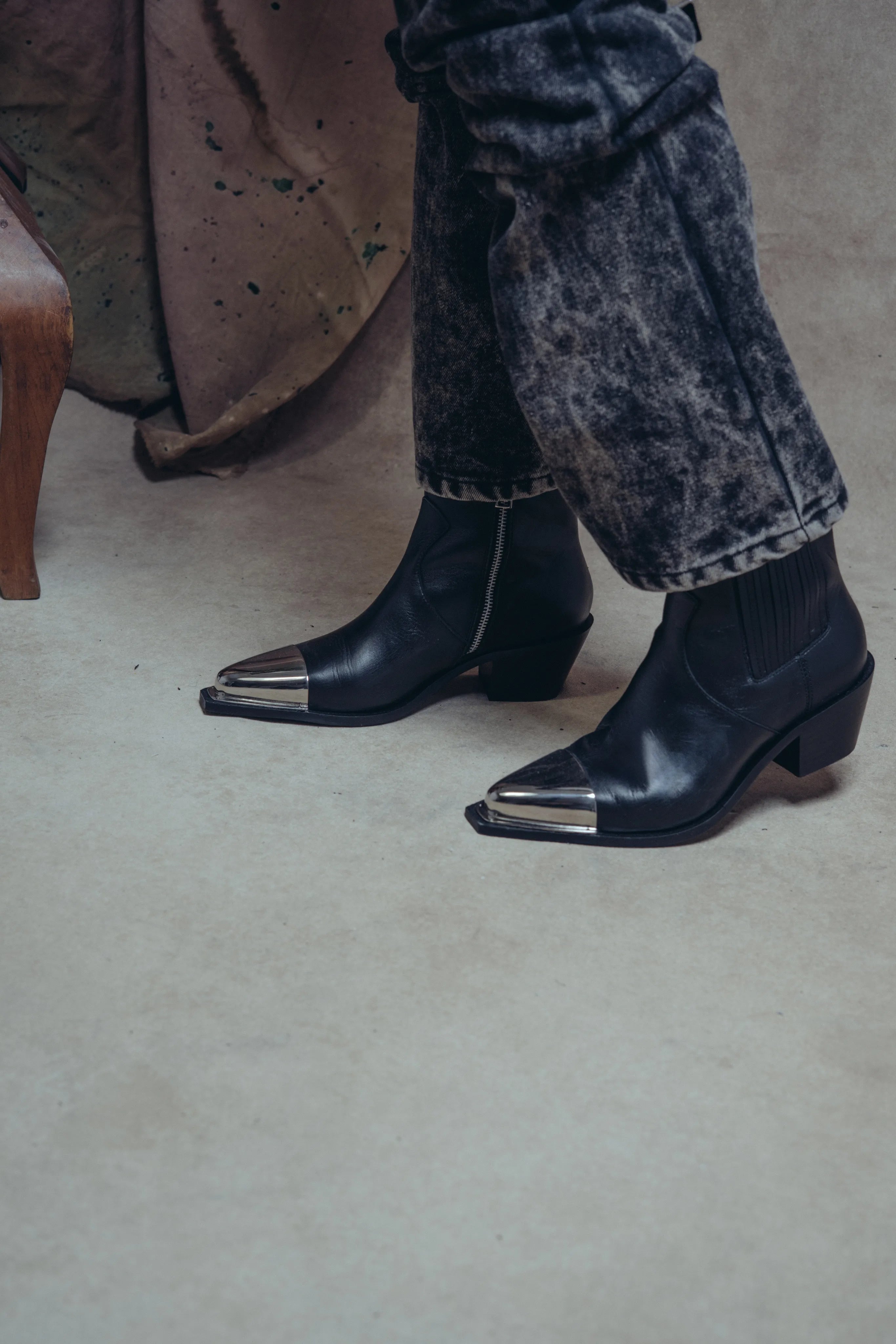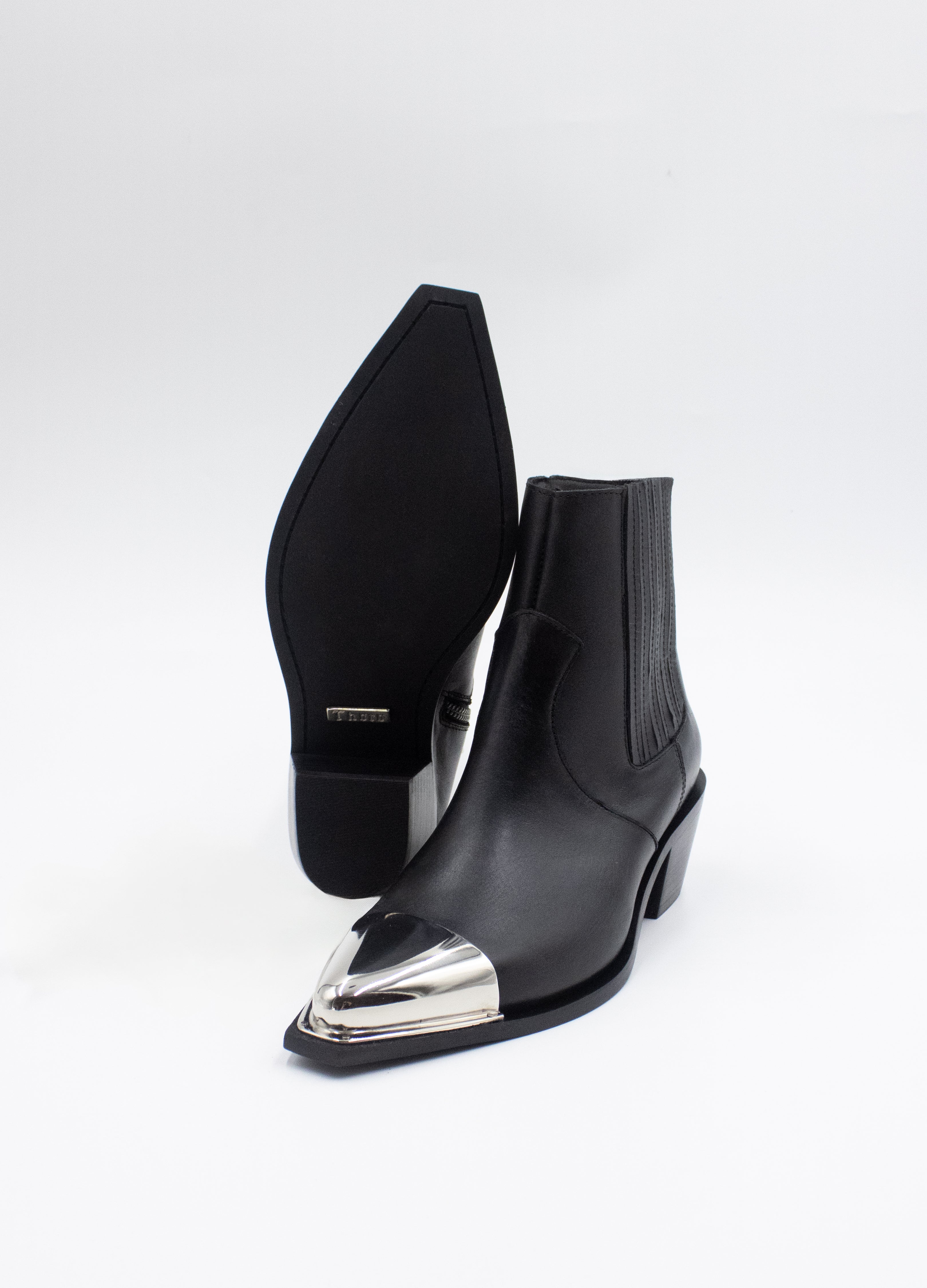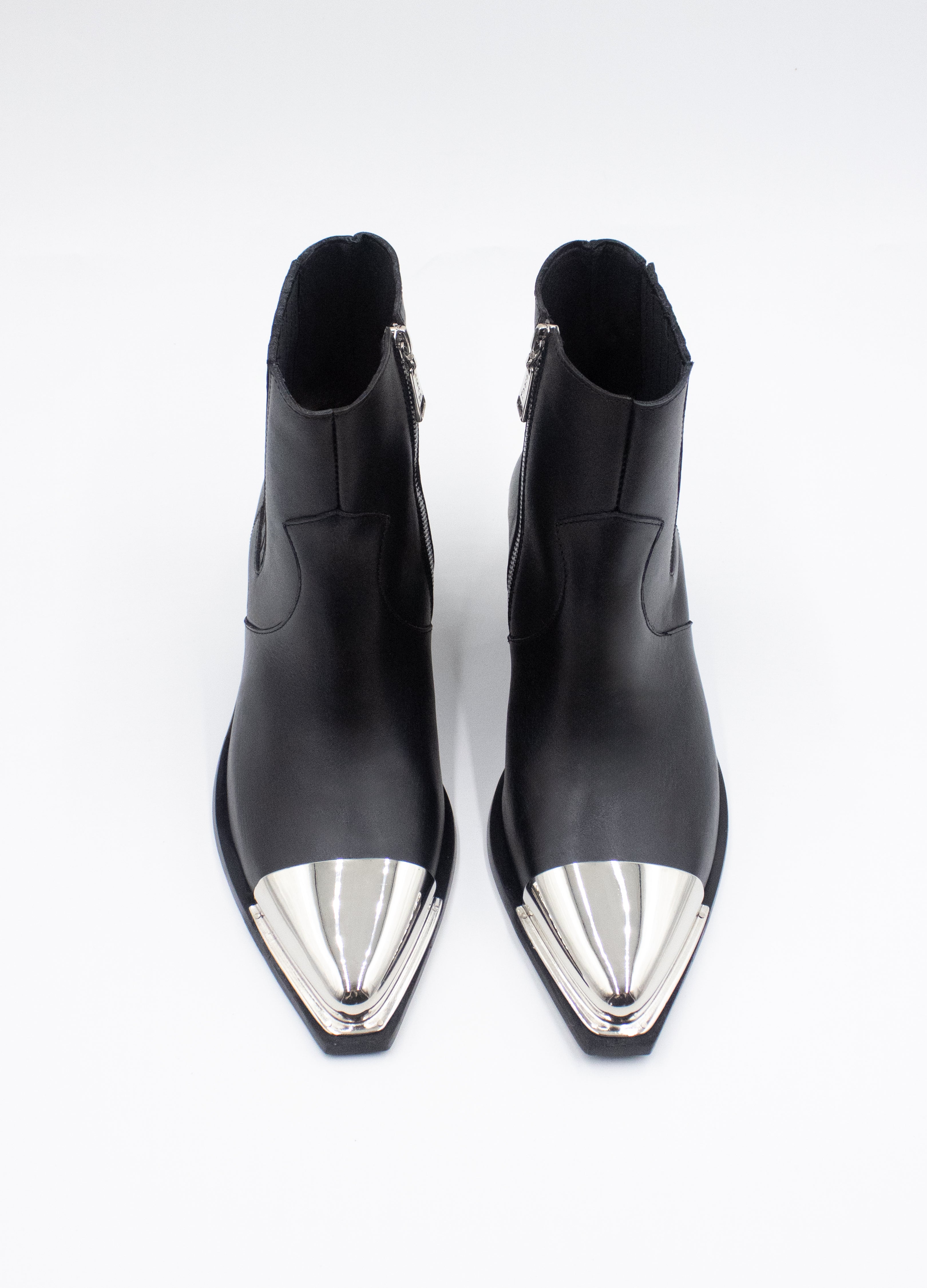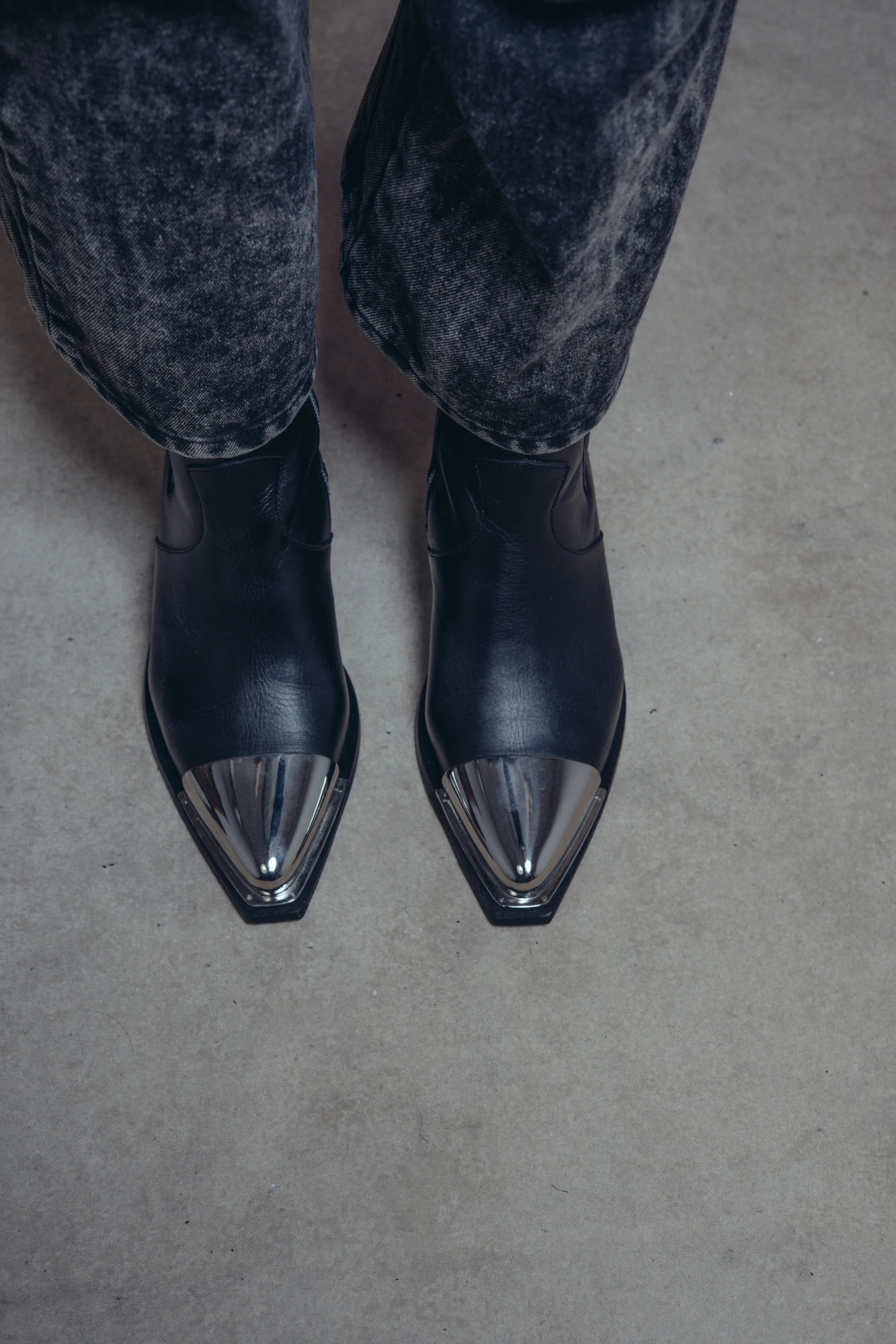 Está confeccionado en piel negra lisa con una punta afilada reforzada con una puntera metálica plateada. Posee un cierre lateral que facilita su uso, y se complementa con un tacón cubano.