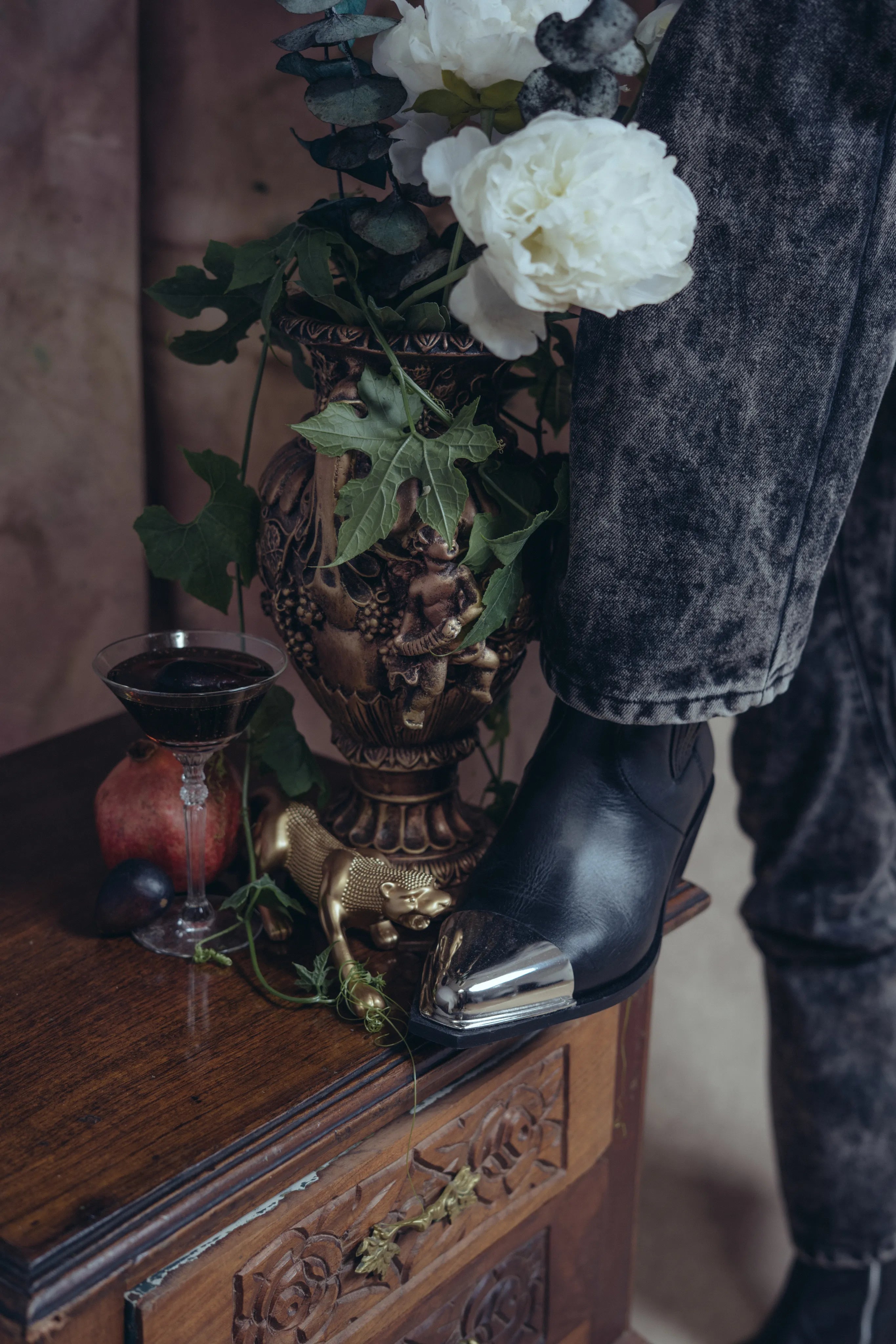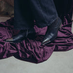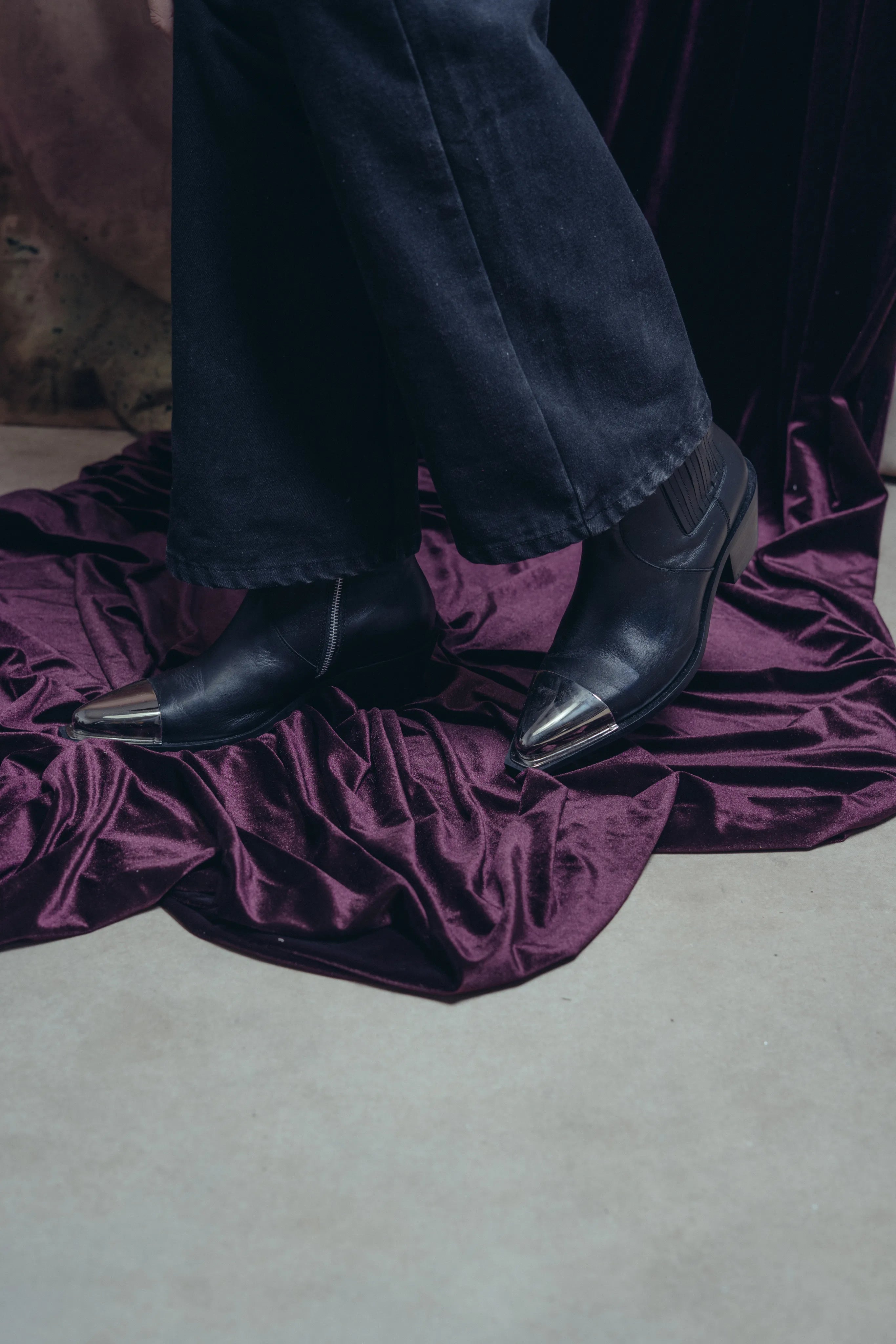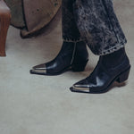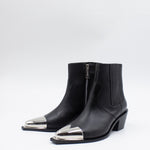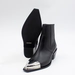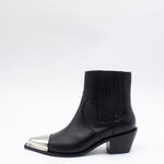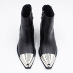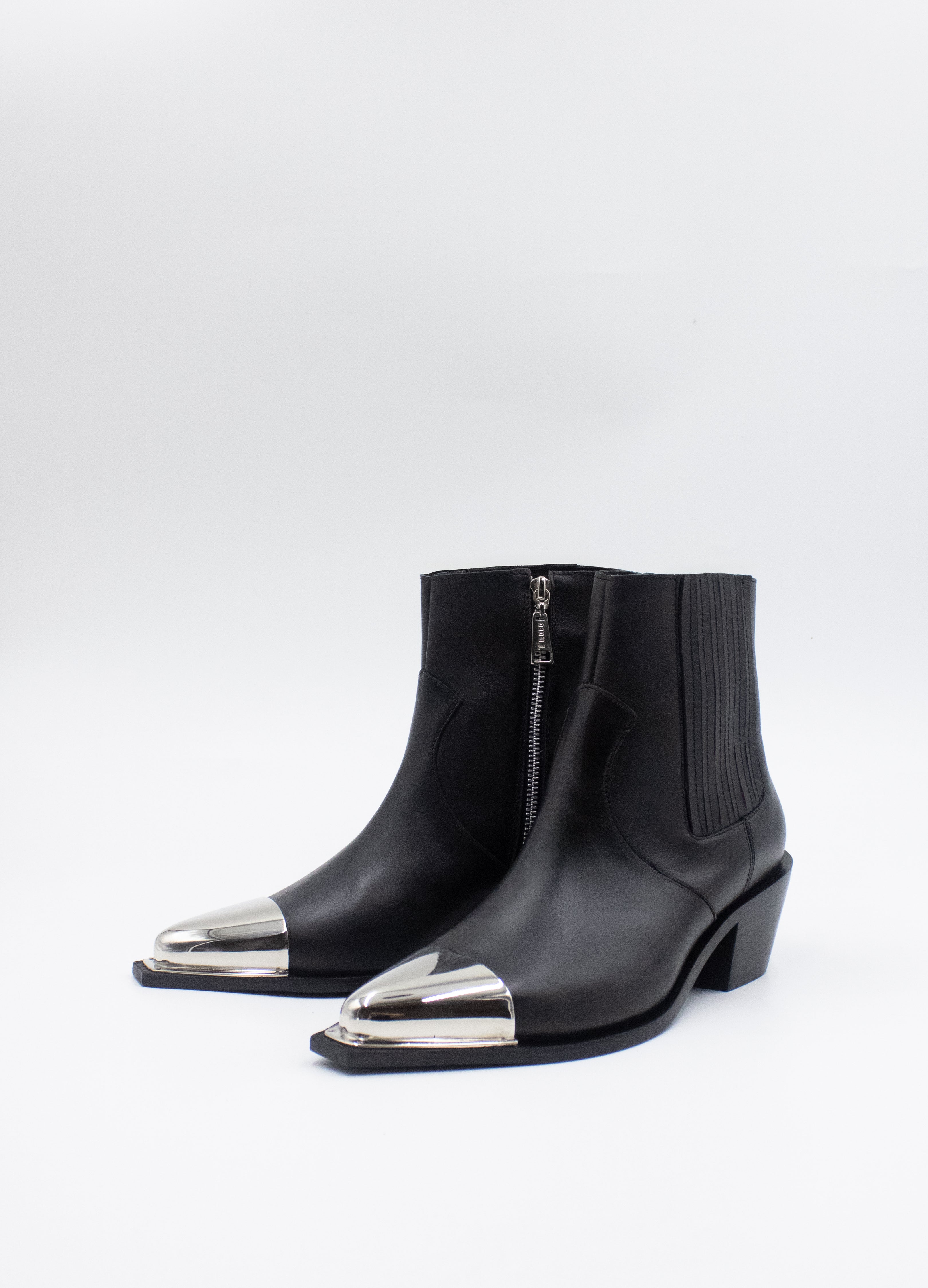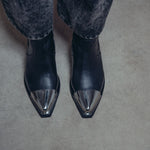 Está confeccionado en piel negra lisa con una punta afilada reforzada con una puntera metálica plateada. Posee un cierre lateral que facilita su uso, y se complementa con un tacón cubano.