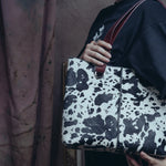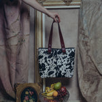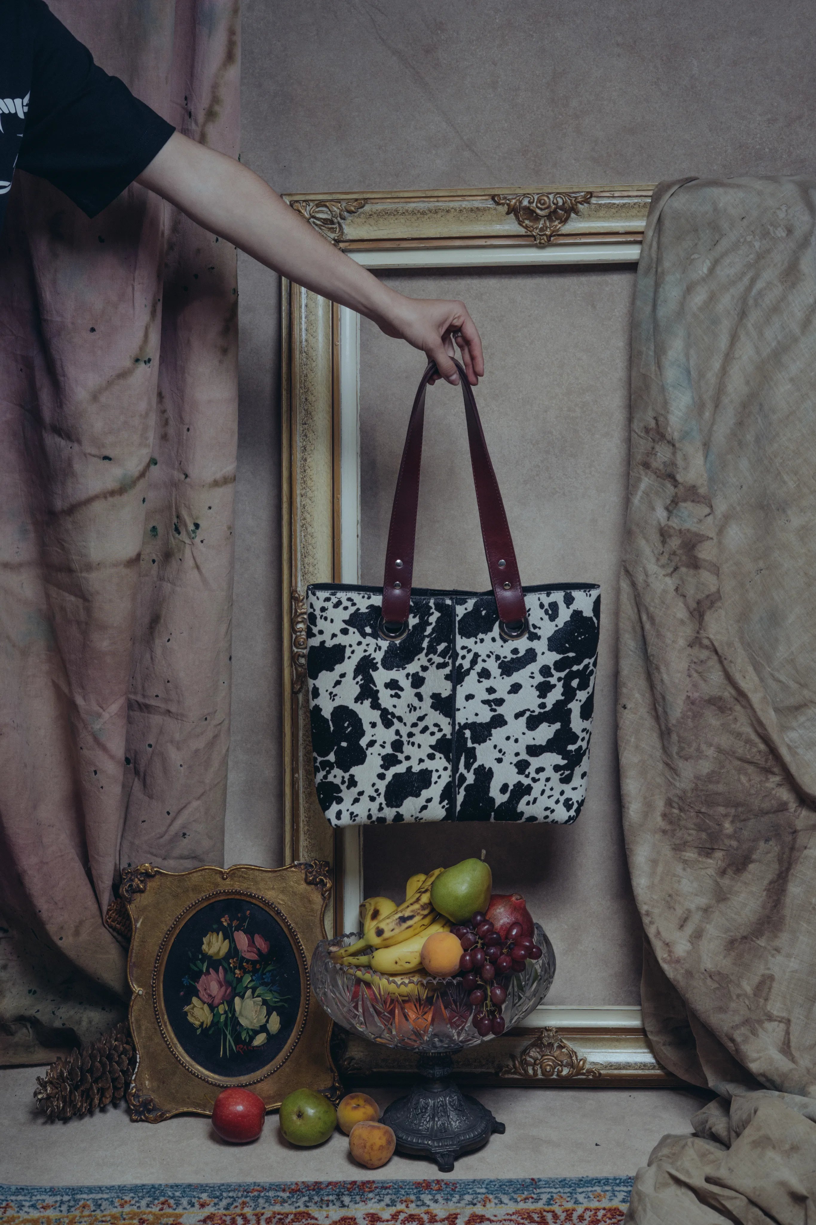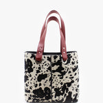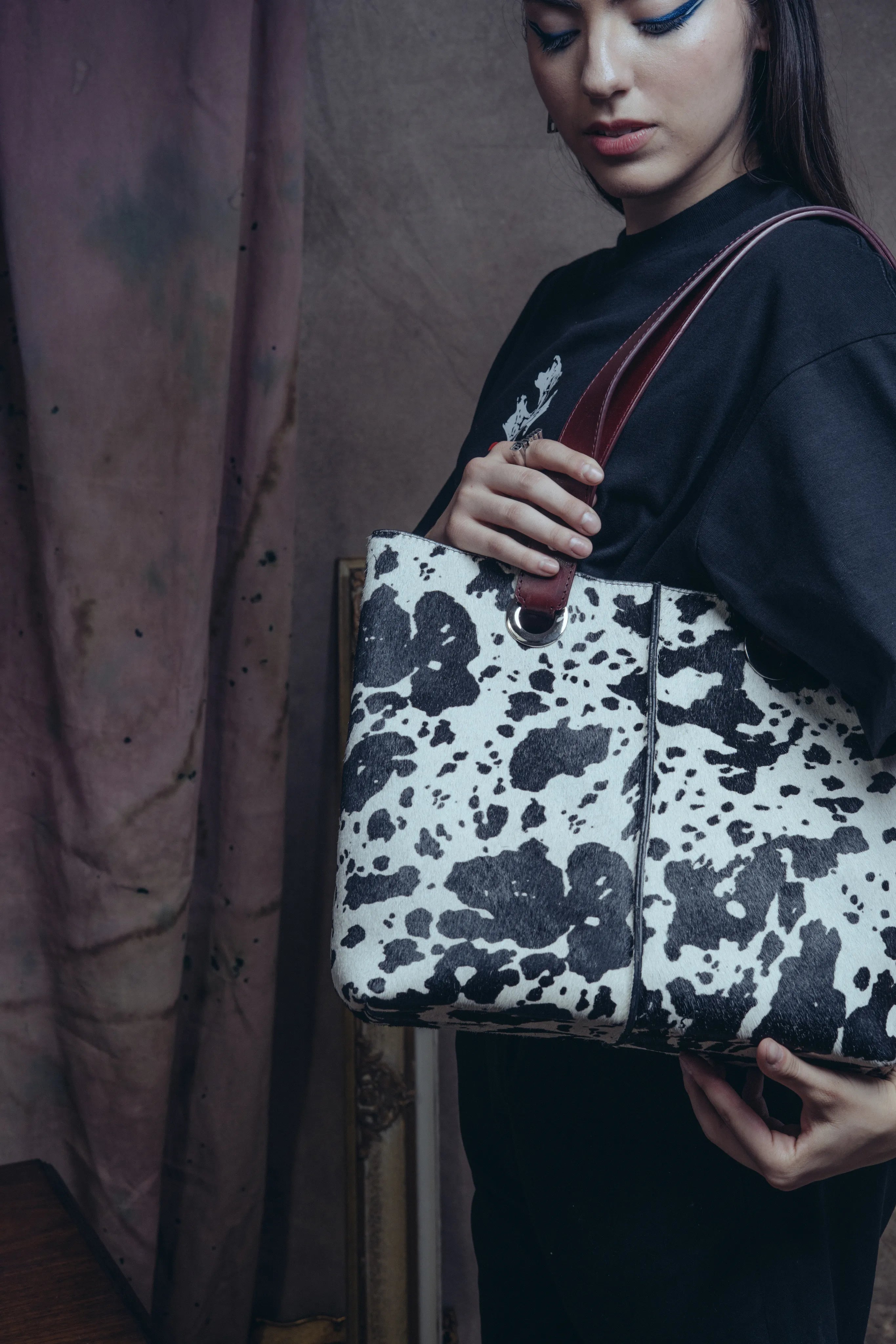 Está confeccionado en piel natural con animal print de vaca en negro y crema, contrastando con las asas y detalles en piel de color vino. Su silueta de tote bag es estructurada y compacta.