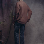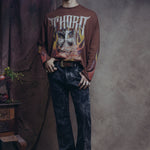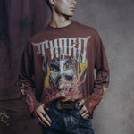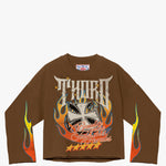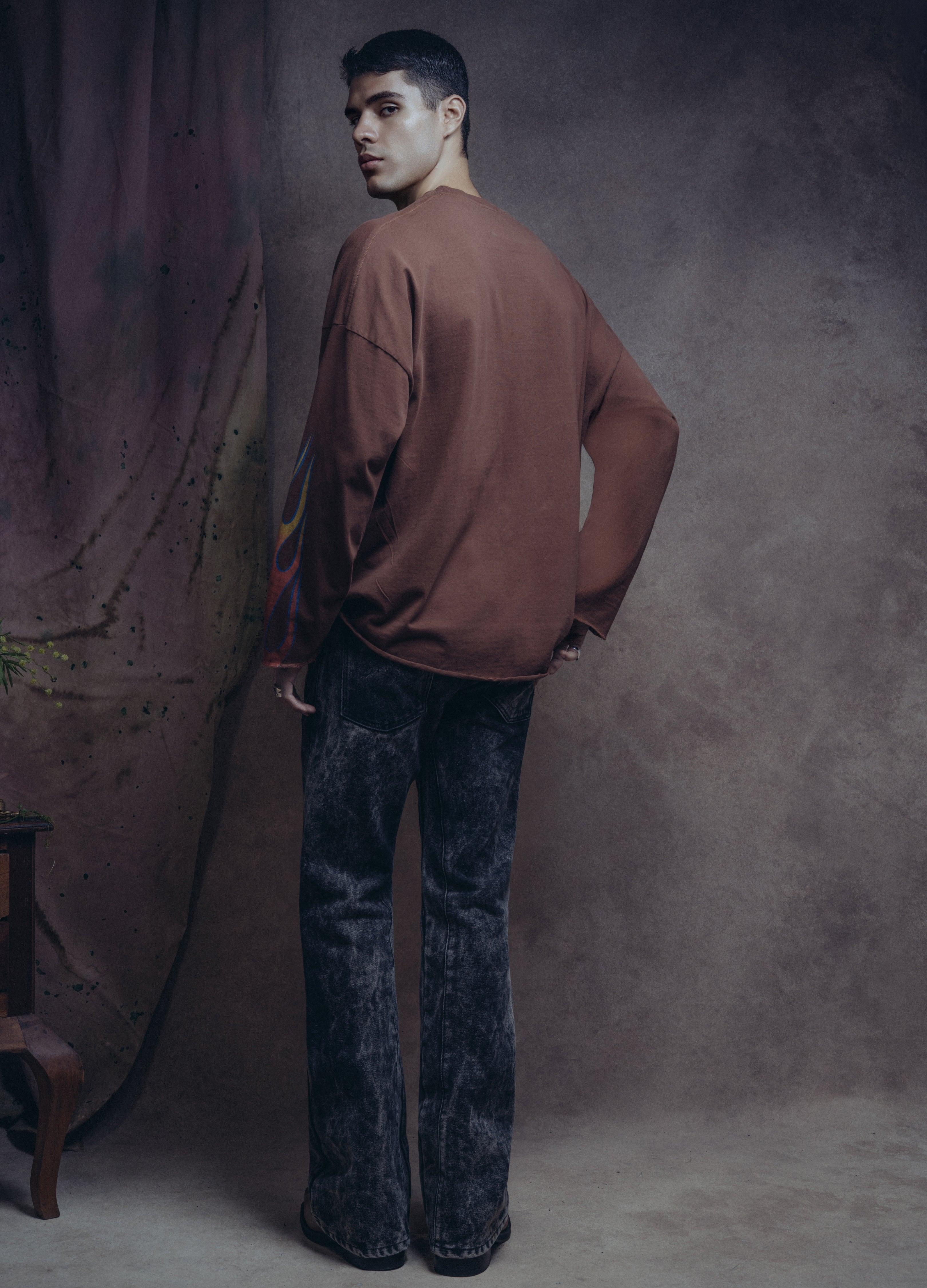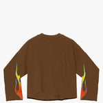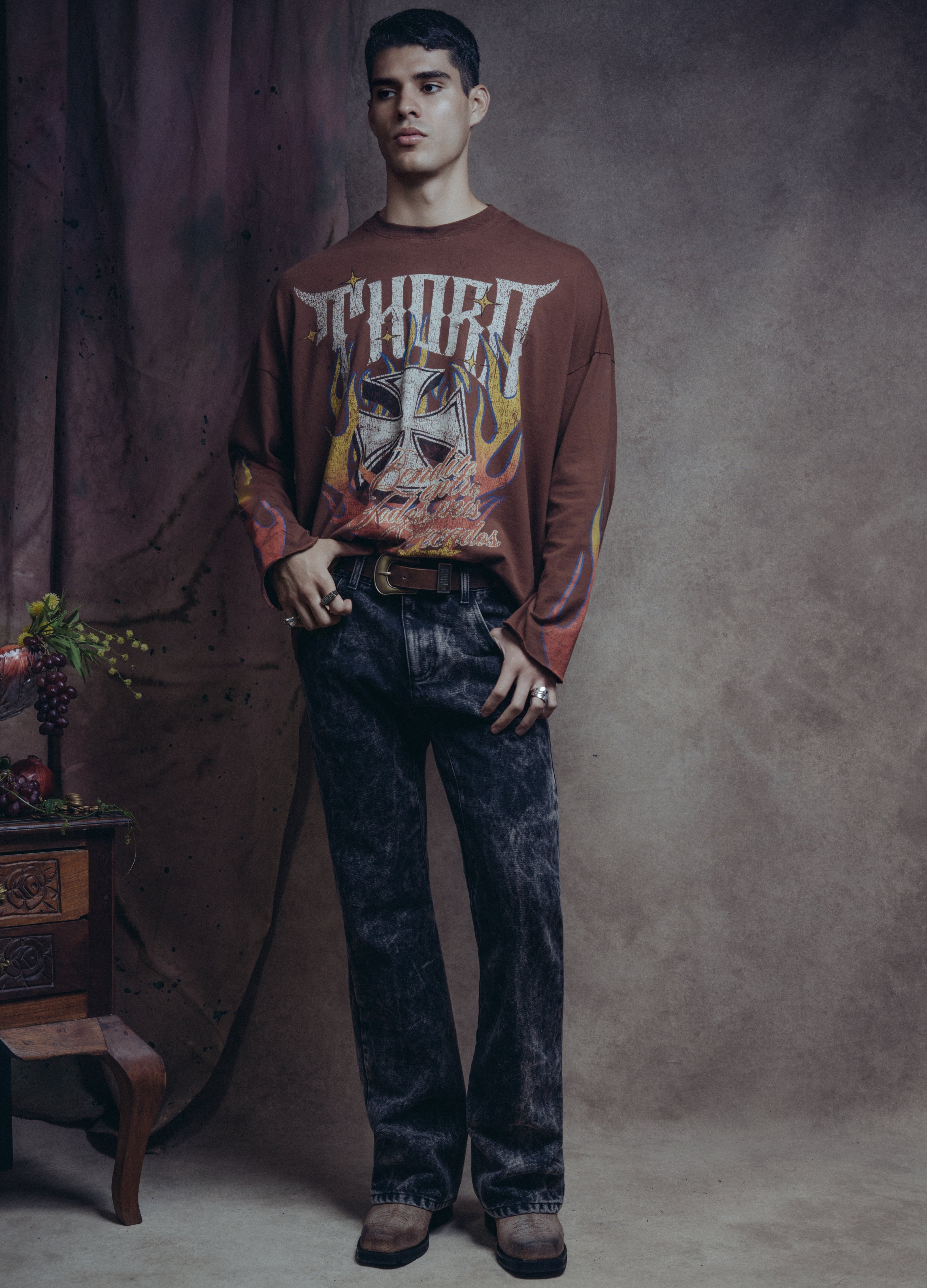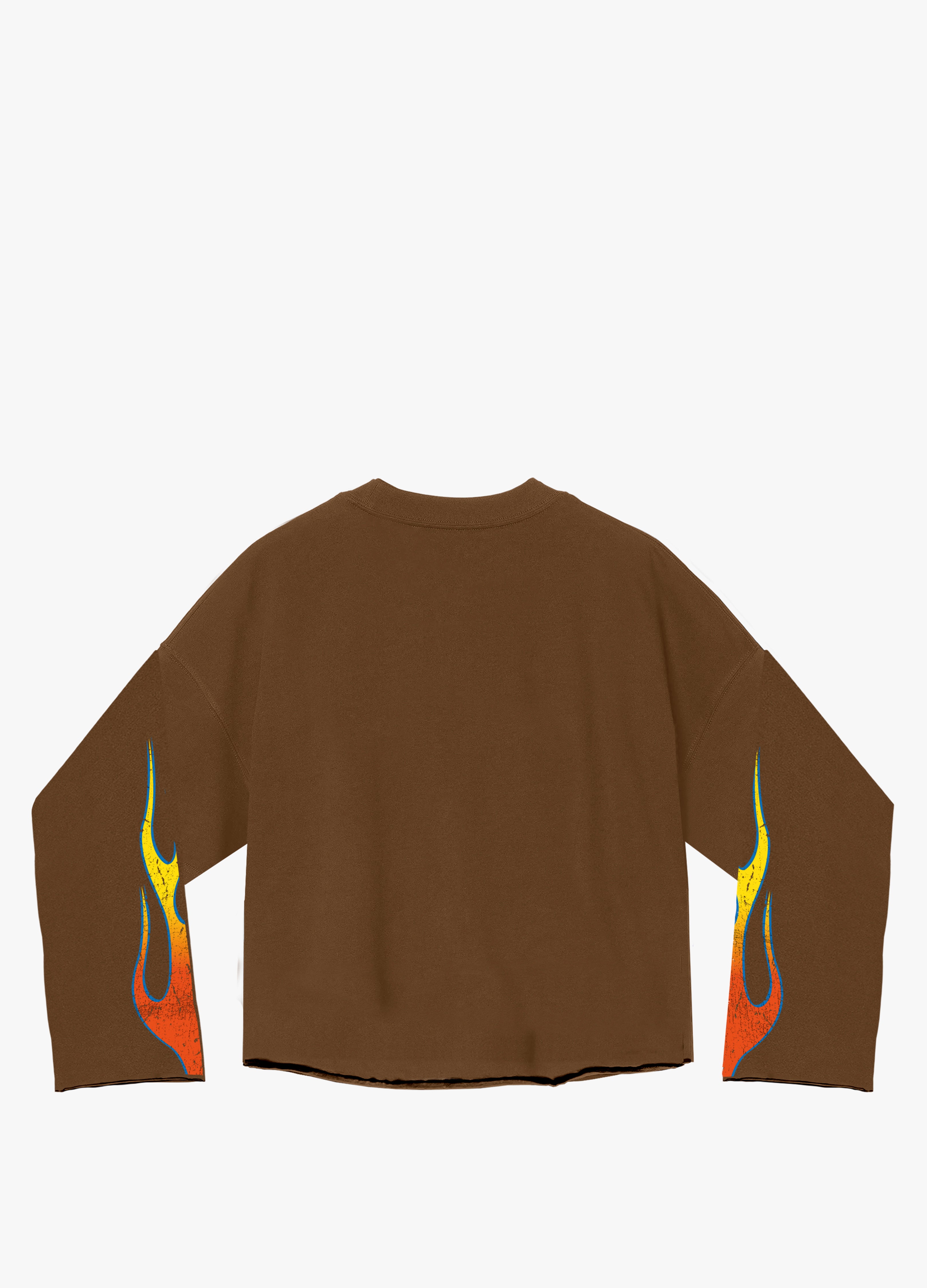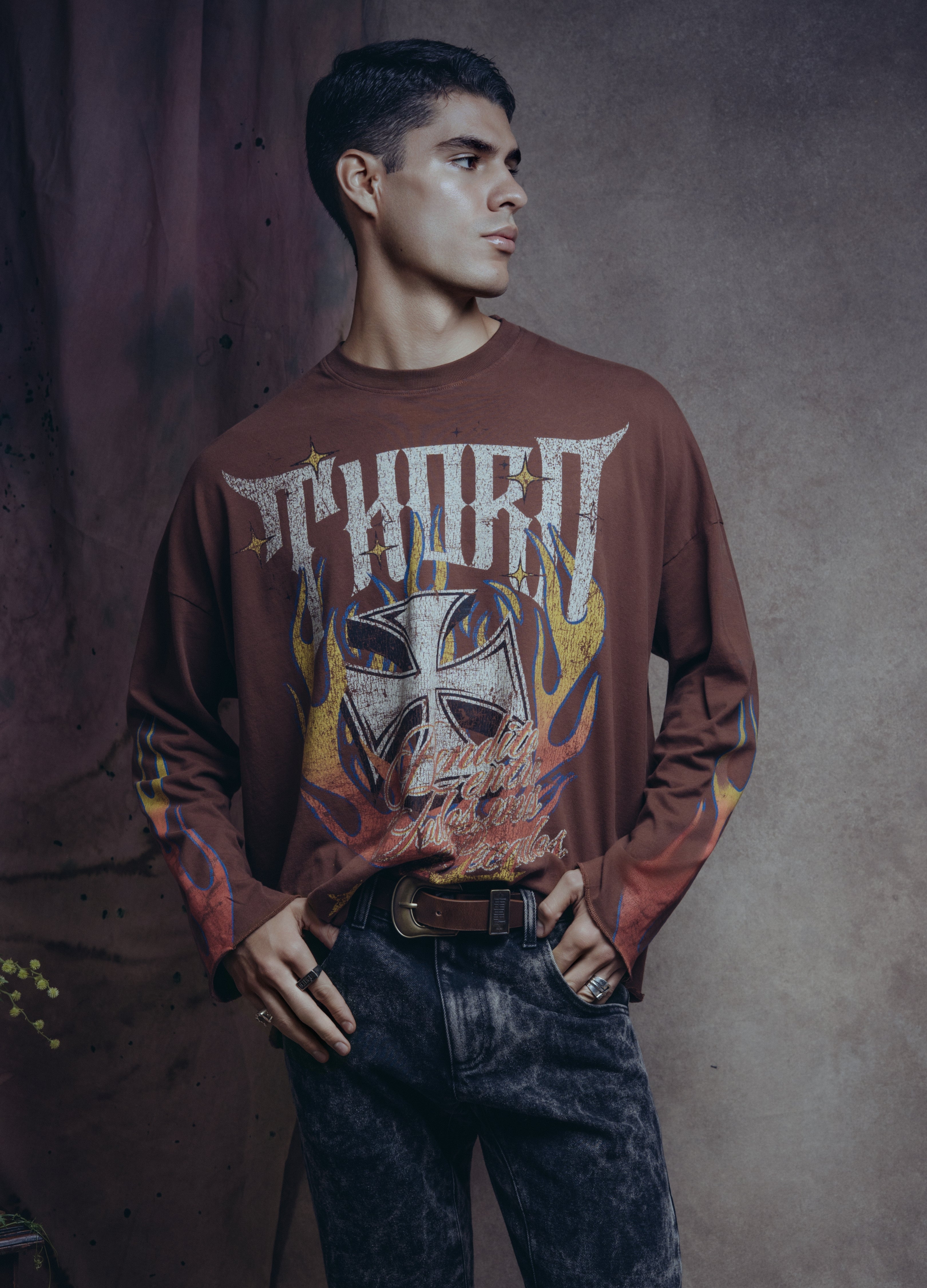 Confeccionada en tela color café de manga larga, presenta un gran gráfico frontal con una Cruz de Malta rodeada de flamas y el texto "Bendito Seas Mis Pecados". Las mangas llevan prints de flamas.
