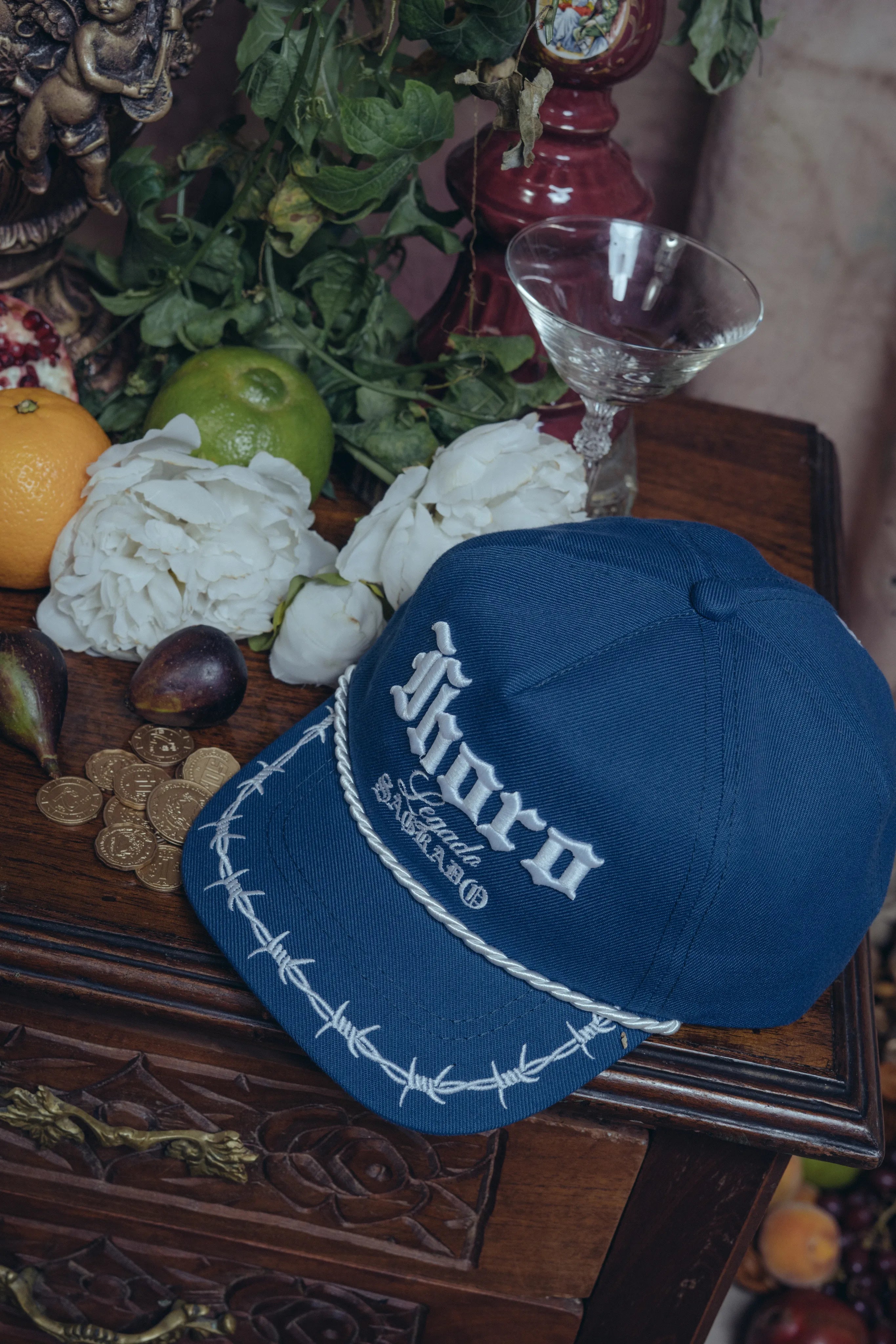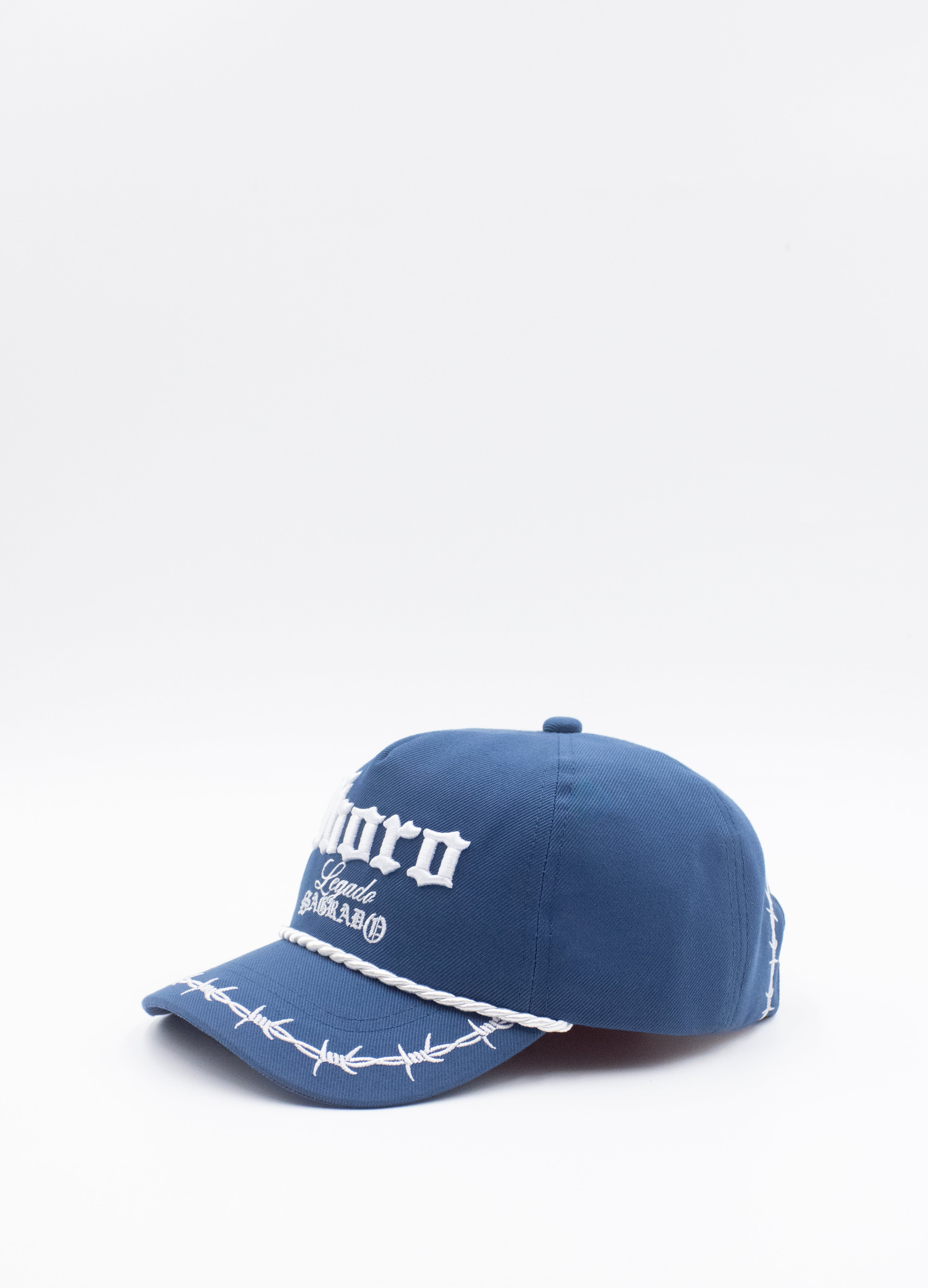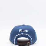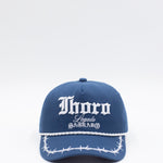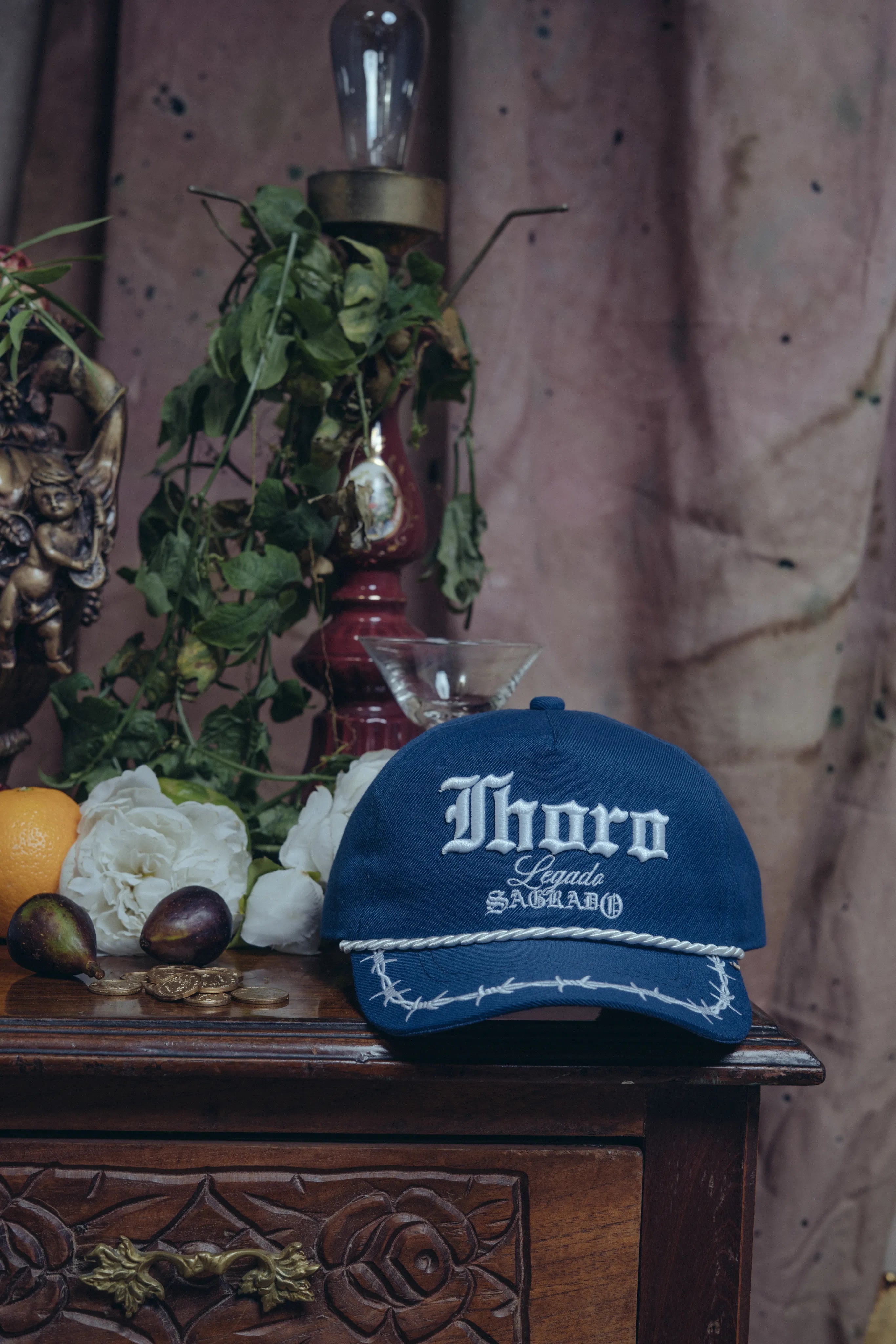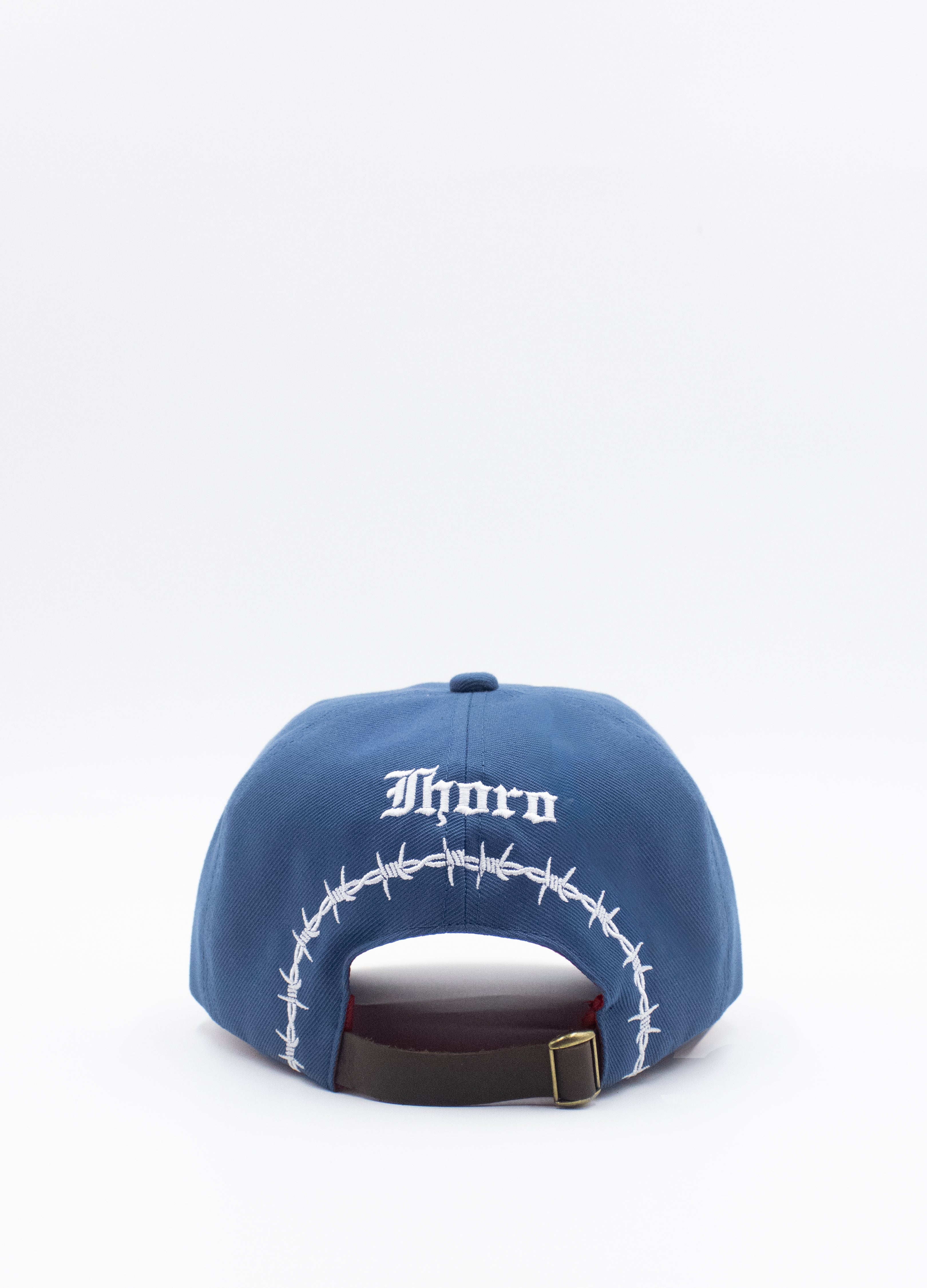 Confeccionada en loneta azul marino, destaca por el bordado en caligrafía gótica blanca con el logo THORO. Su detalle más distintivo son las espinas bordadas en la visera y parte trasera agregando un el cordón blanco en la parte frontal.