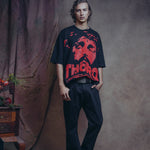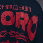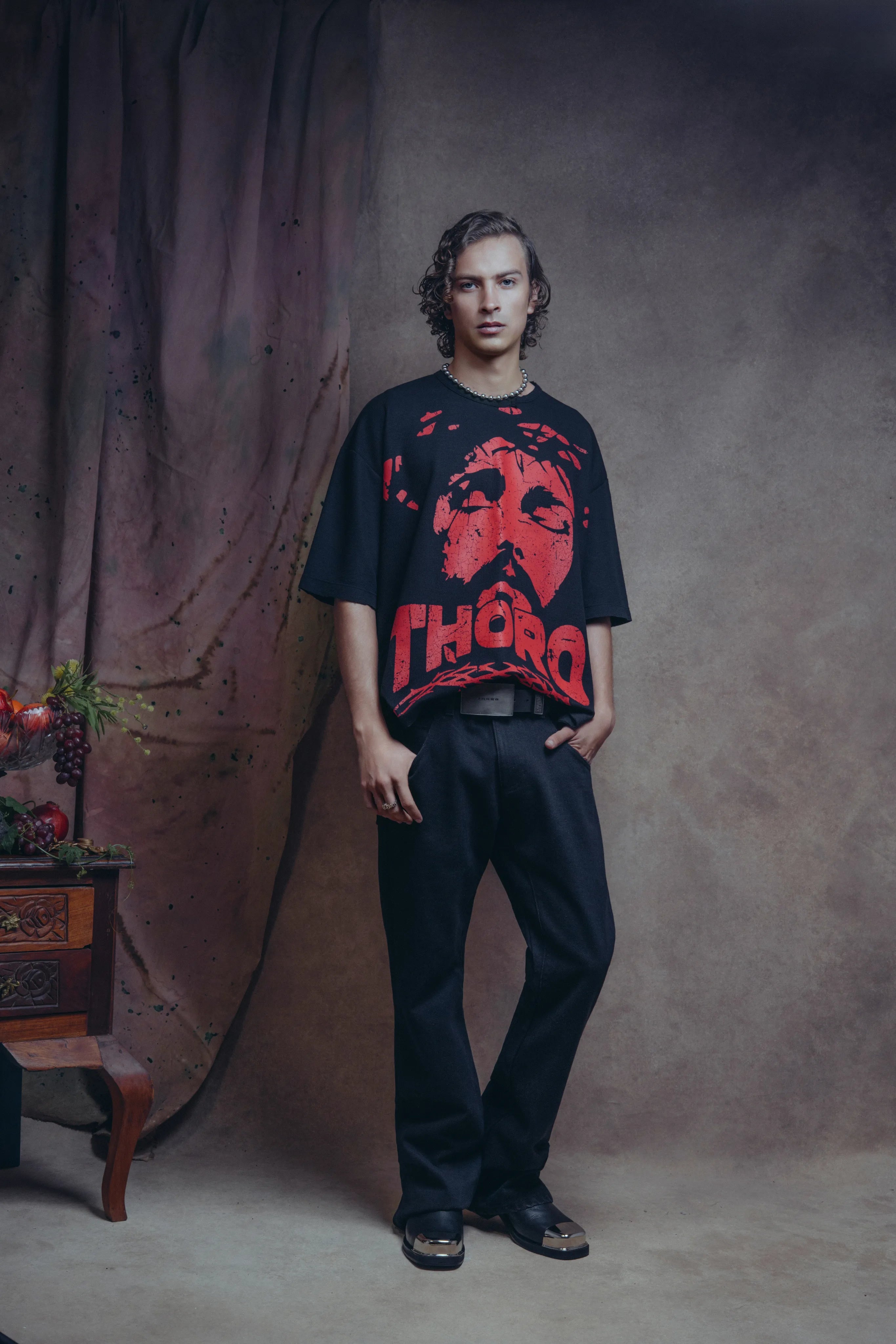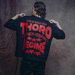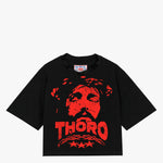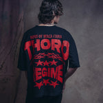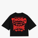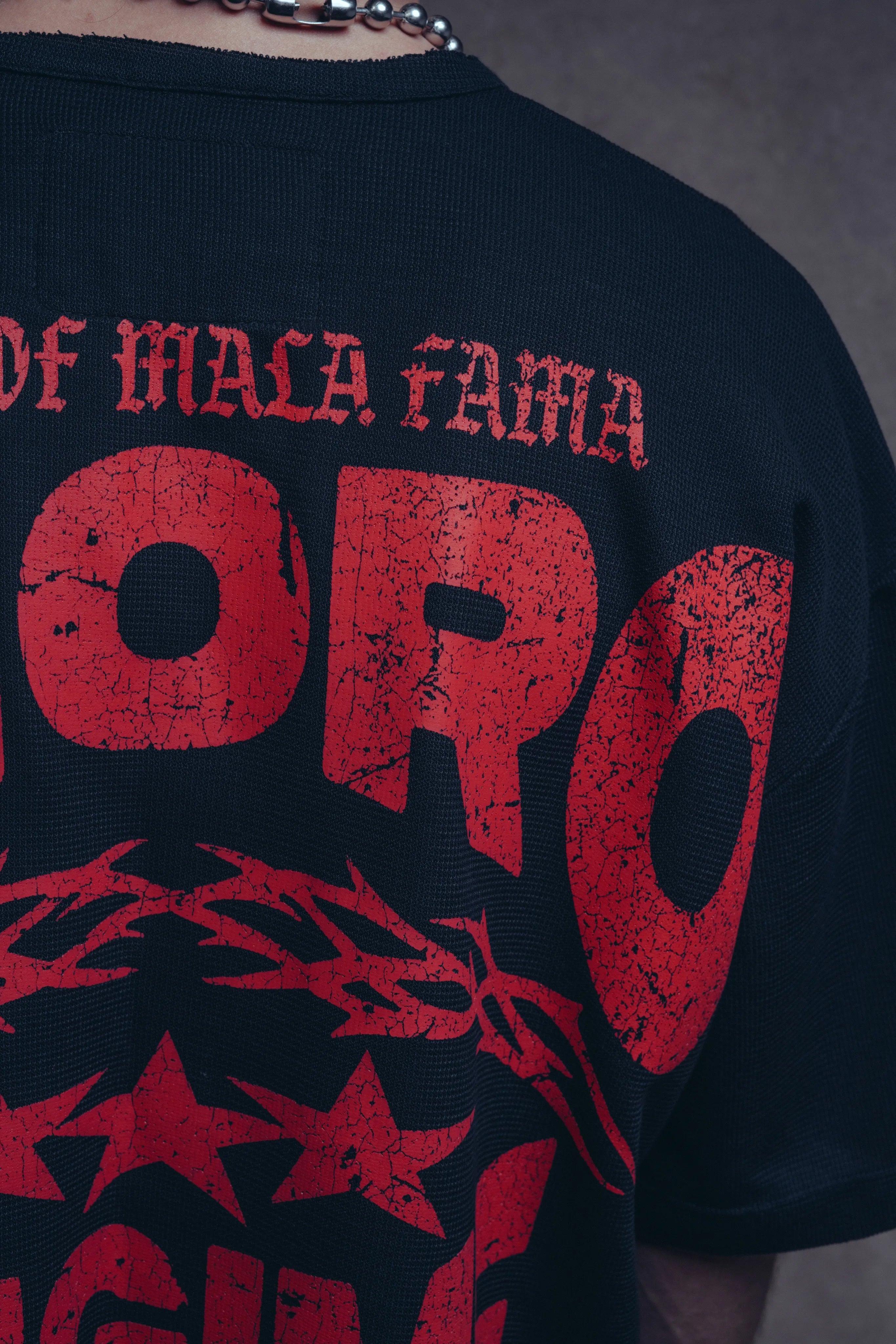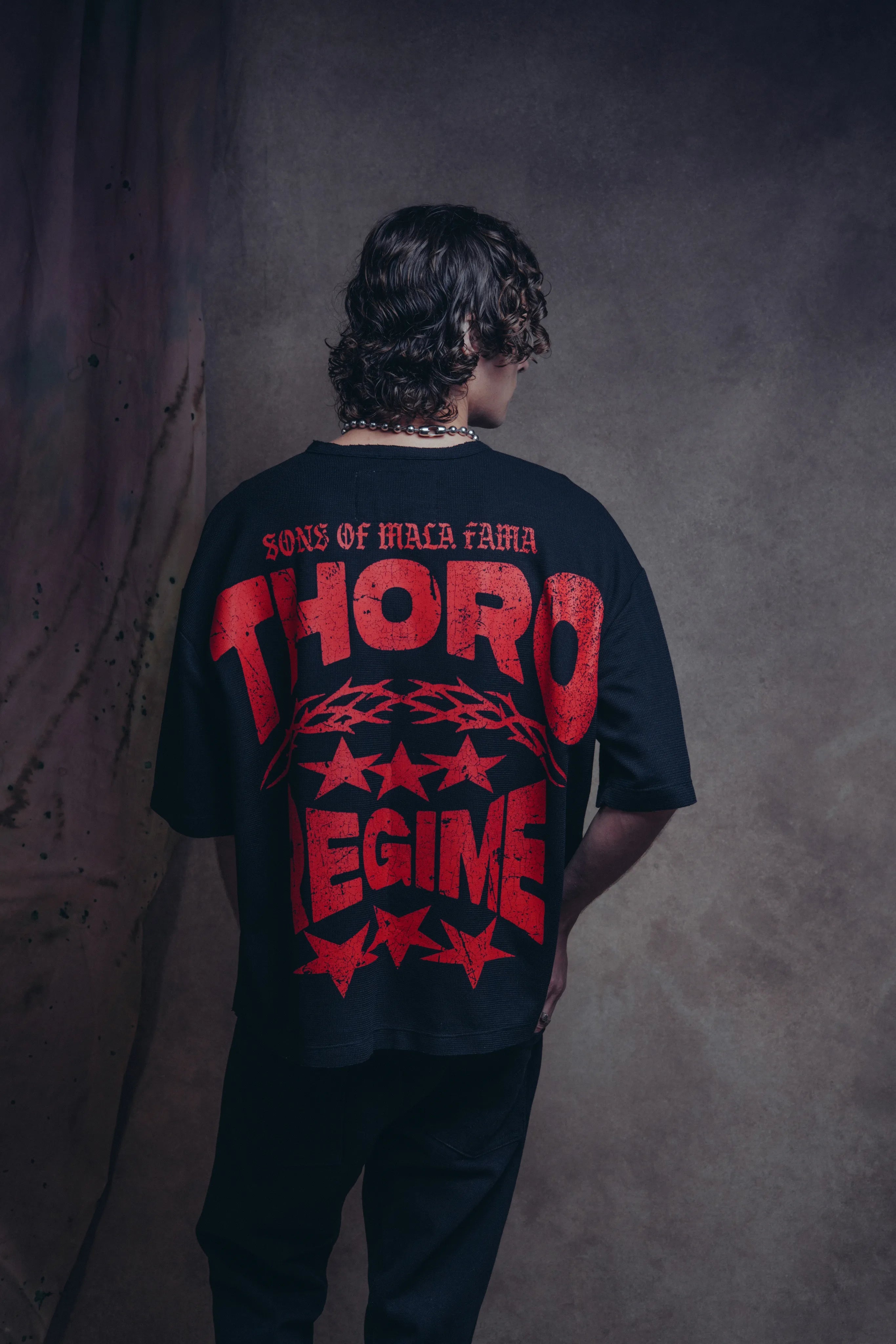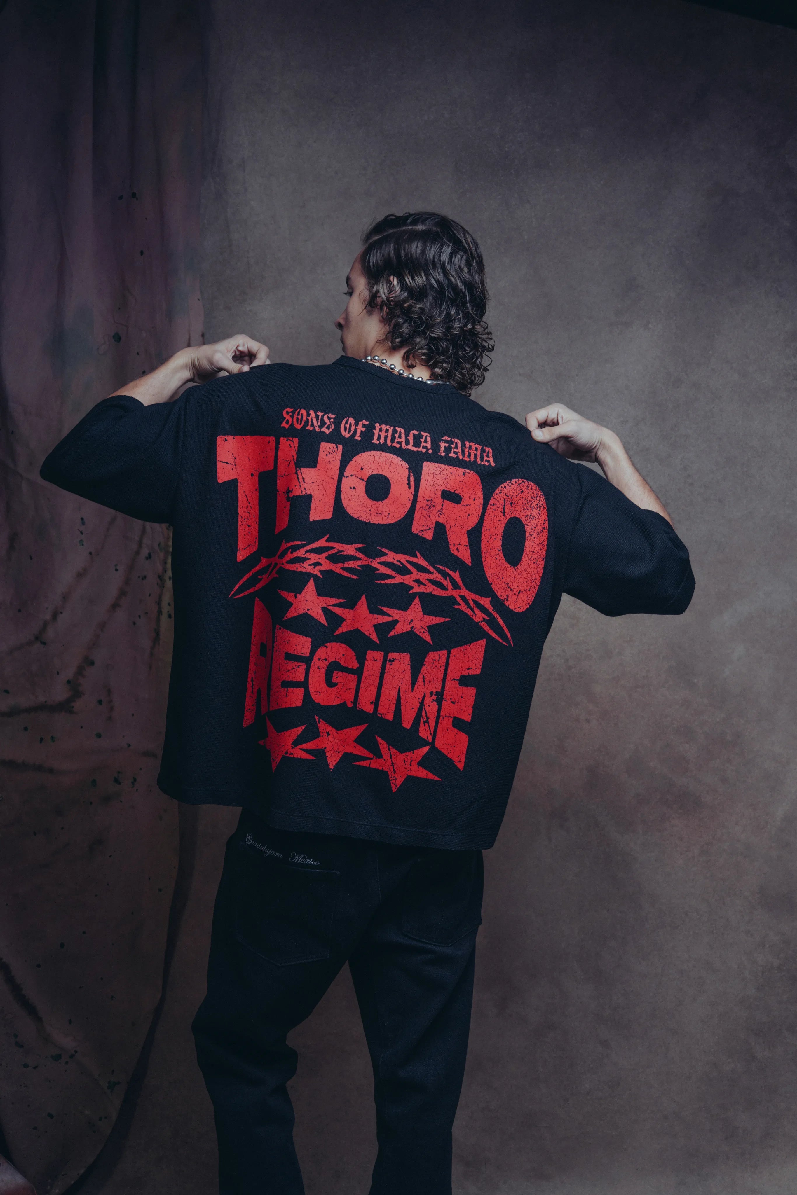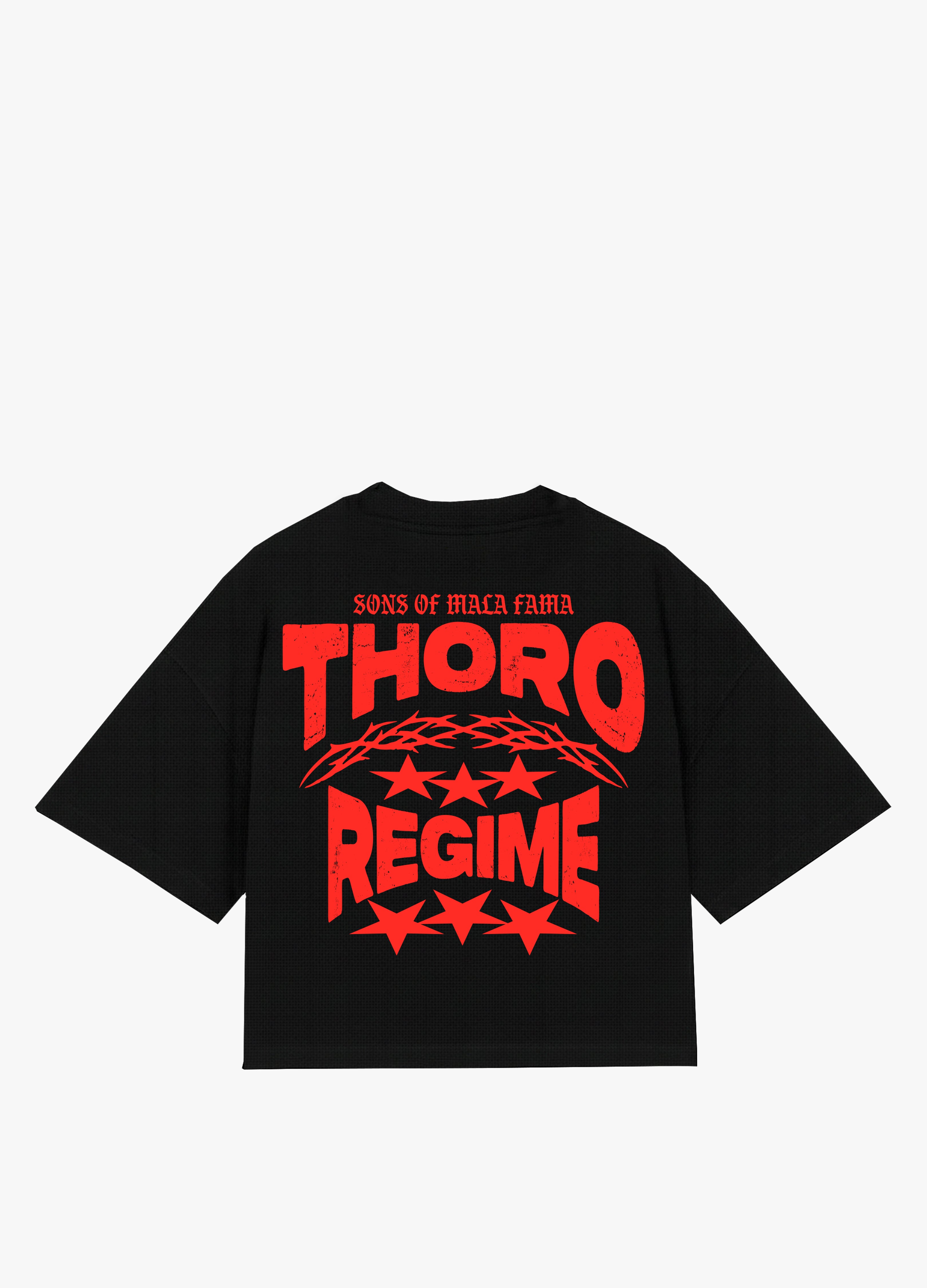 Confeccionada en tela negra de corte cropped, el frente presenta un gráfico vintage de un rostro en corona de espinas en color rojo. El print trasero lleva el gran texto "THORO REGIME" enmarcado con espinas y estrellas, junto al texto "Sons of Mala Fama".