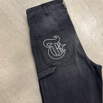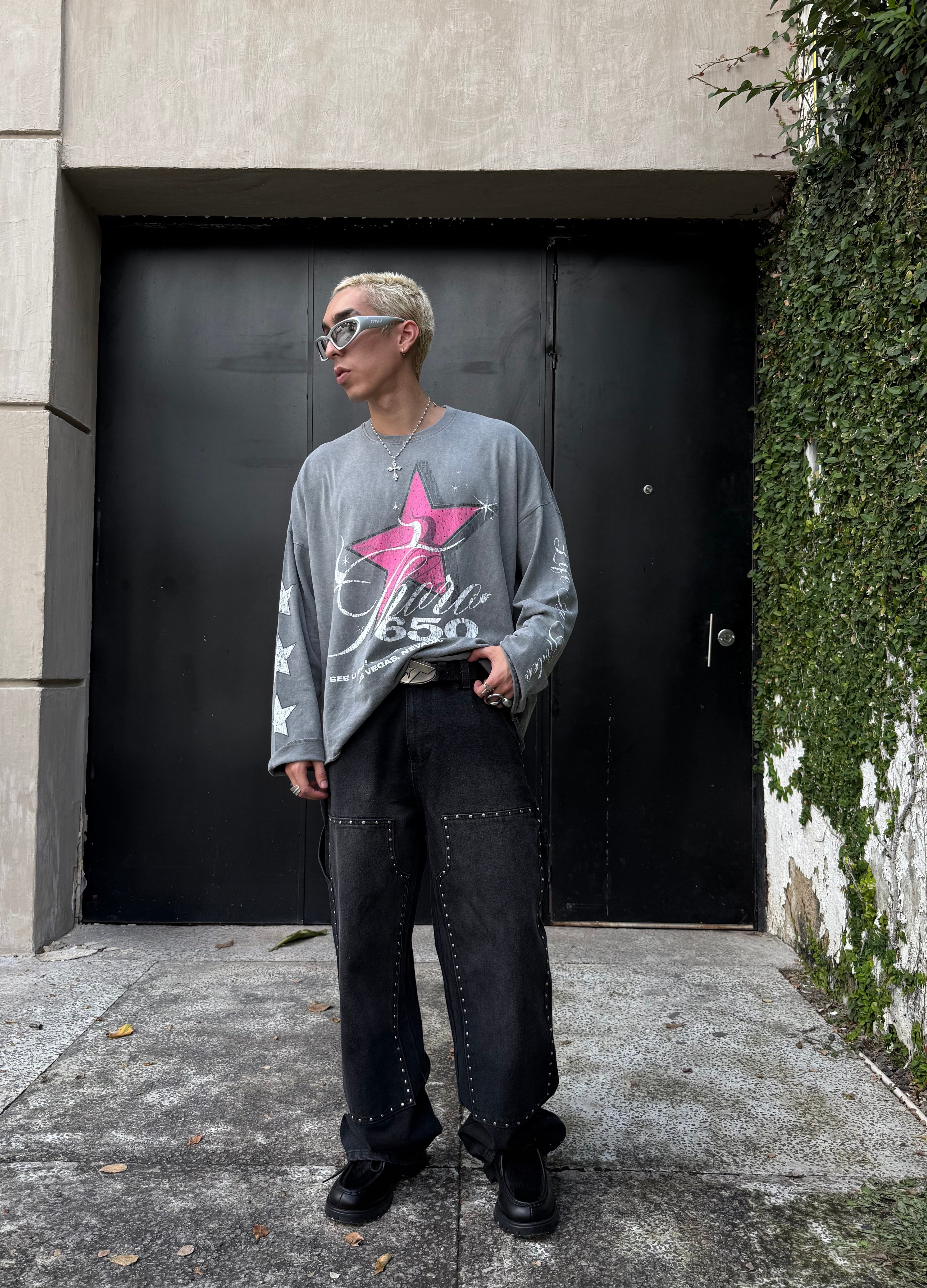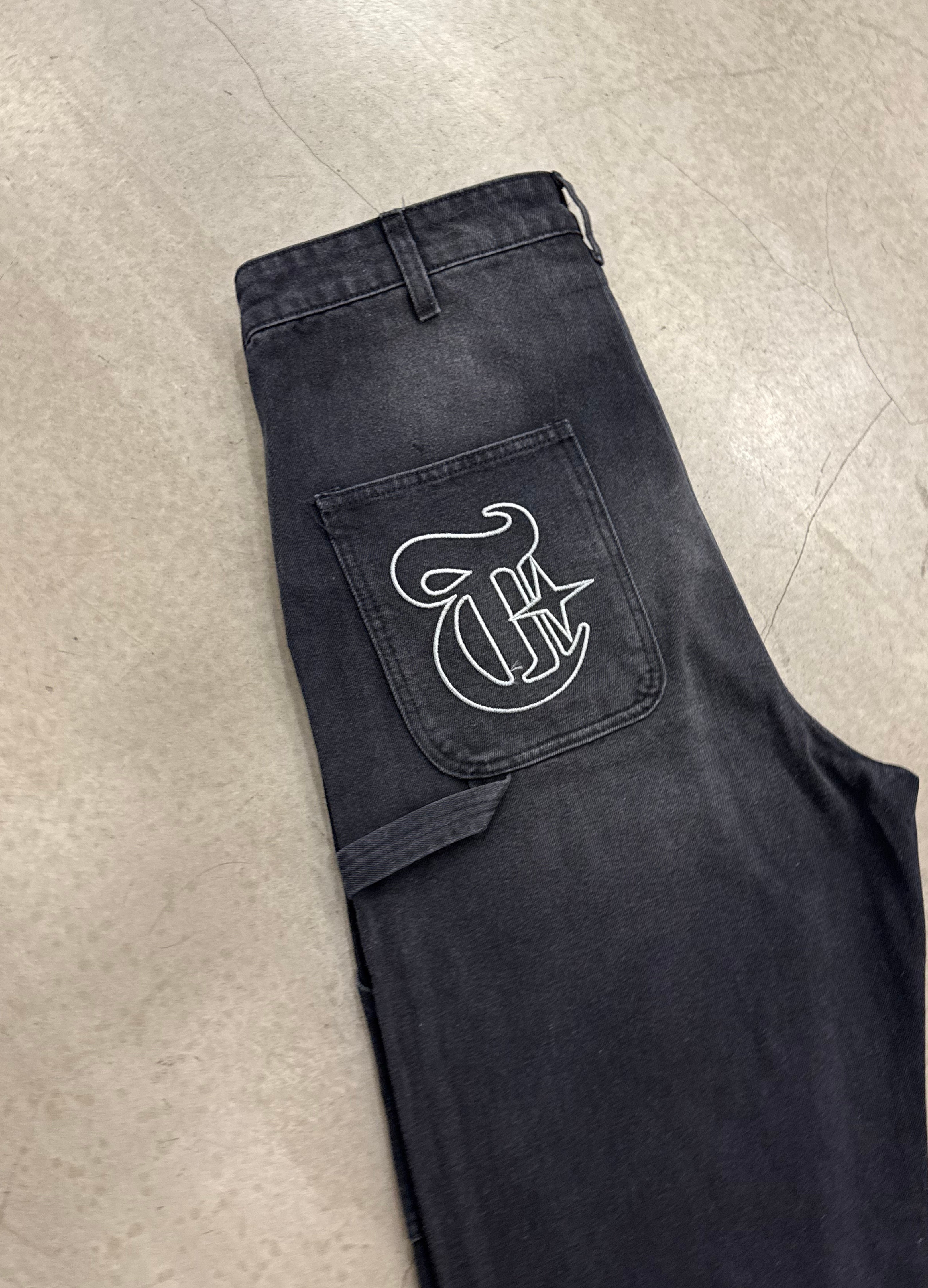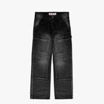 El Pantalón Carpintero Rockstar es una pieza central de la Colección Sin Fronteras, fusionando la estética worker con un estilo de rock puro. Está confeccionado en denim negro con un lavado marcado, destacando por los cientos de estoperoles metálicos que bordean los paneles delanteros y las costuras laterales. Su corte holgado y cómodo se mantiene fiel al diseño carpintero.