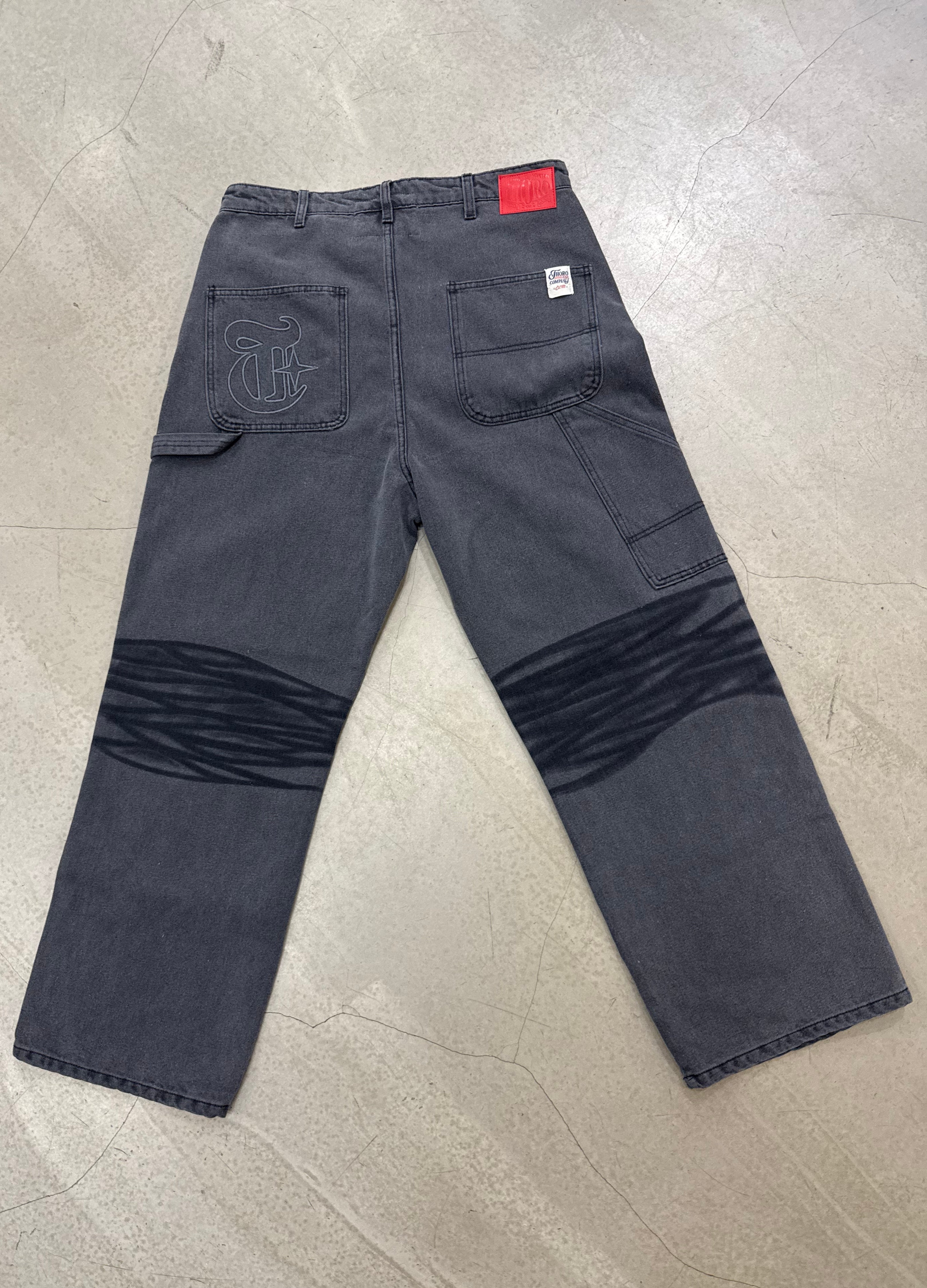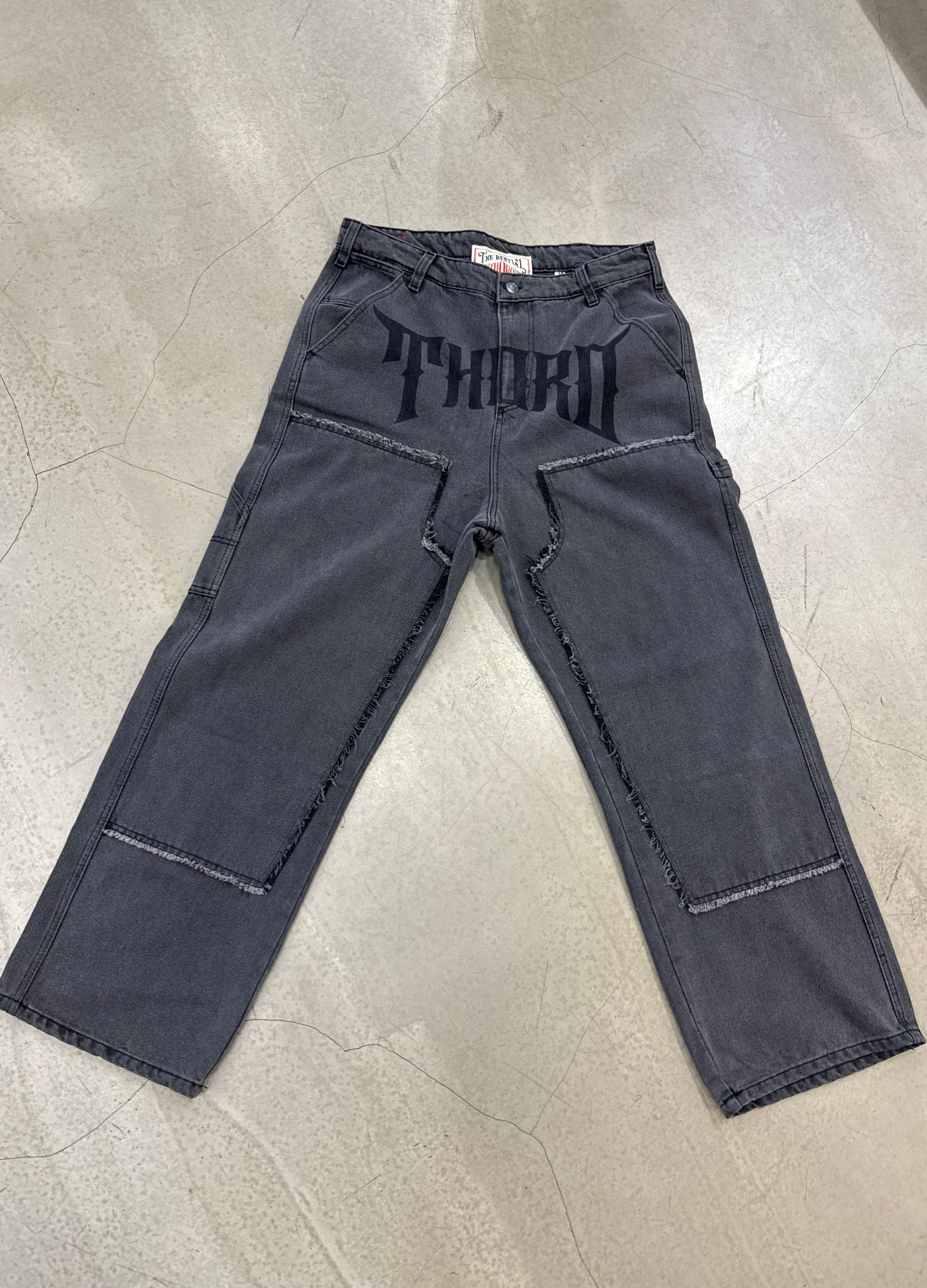 El Pantalón Carpintero Thoro combina la estética worker con el branding de la marca. Está confeccionado en denim negro con un acabado lavado a la piedra que le da un look desgastado y de gran carácter. Su diseño carpintero presenta paneles frontales, bajos y costuras sin rematar, además del gran logo THORO estampado en el centro.