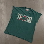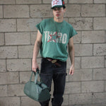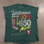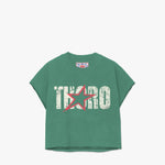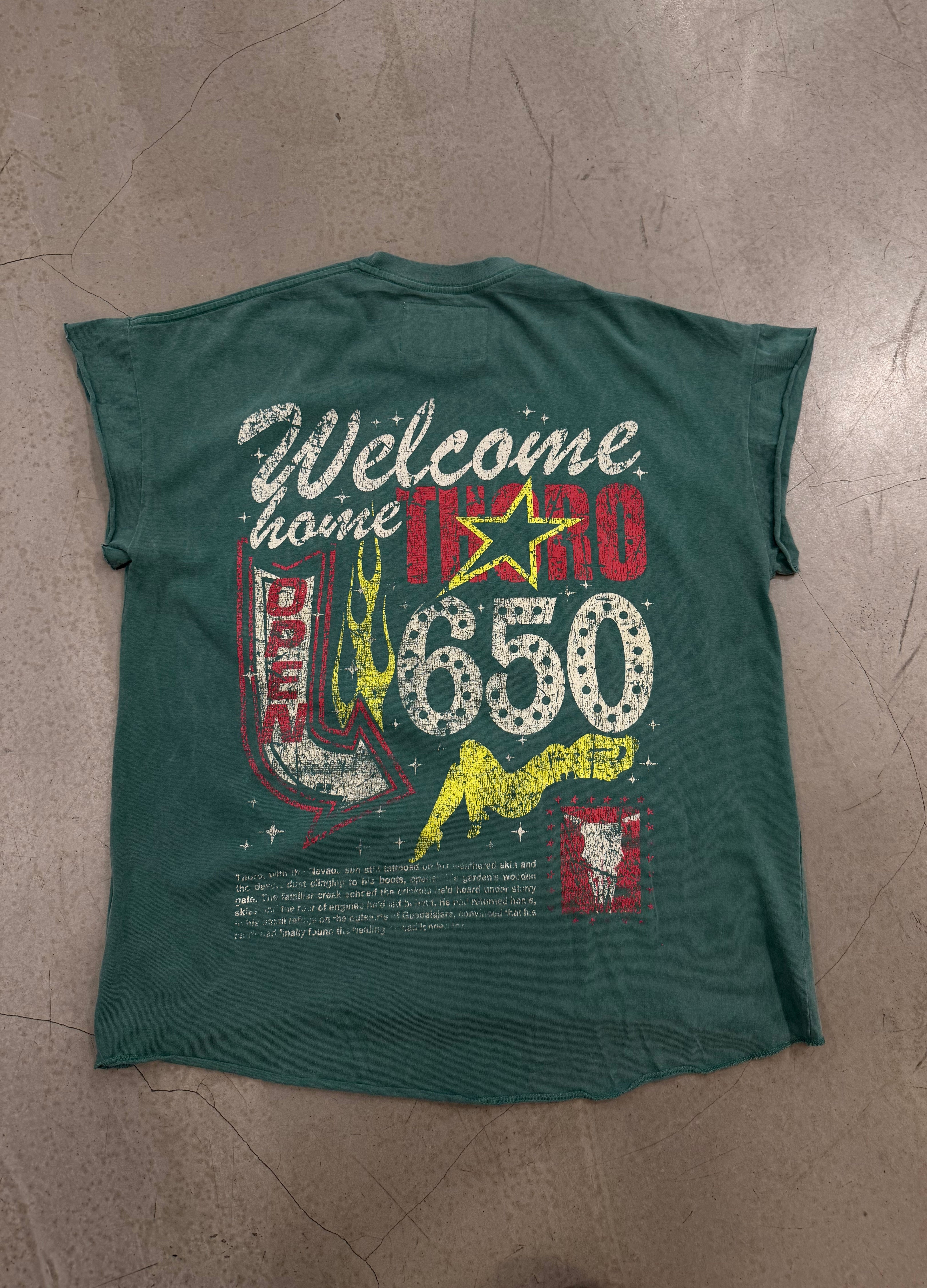 La camiseta Welcome Home es una prenda confeccionada en un tejido color verde con un efecto desgastado, el frente lleva el logo THORO y una estrella central. El reverso destaca con un gran print de estilo letrero de neón que dice "WELCOME HOME" y el número "650".