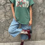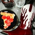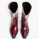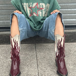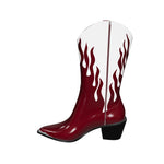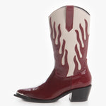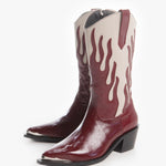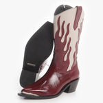 Bota vaquera de tubo alto en piel a combinación roja y hueso, con diseño de llamas en acabado brillante y tubo mate. Cierre lateral plateado, tacón cubano y punta metálica.