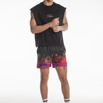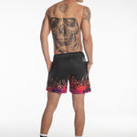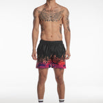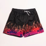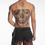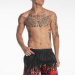 Traje de baño color negro con jareta parar ajustar el elástico interna y malla interior con diseño llamas en forma de caballos y la palabra Thoro.