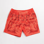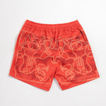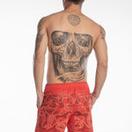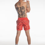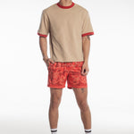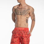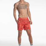 Traje de baño color rojo con jareta parar ajustar el elástico interna y malla interior con diseño de lazo con motivos vaqueros.