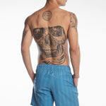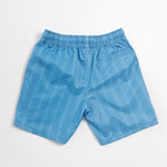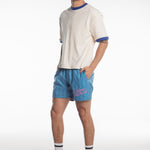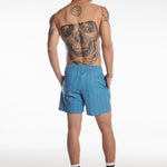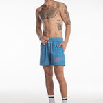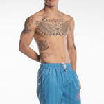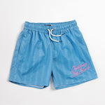 Traje de baño color azul cielo con jareta parar ajustar el elástico exterior y malla interior con diseño líneas claras formadas por la palabra Thoro y un bordado rosa en la pierna izquierda con la leyenda "Outlaws Need No Luck"